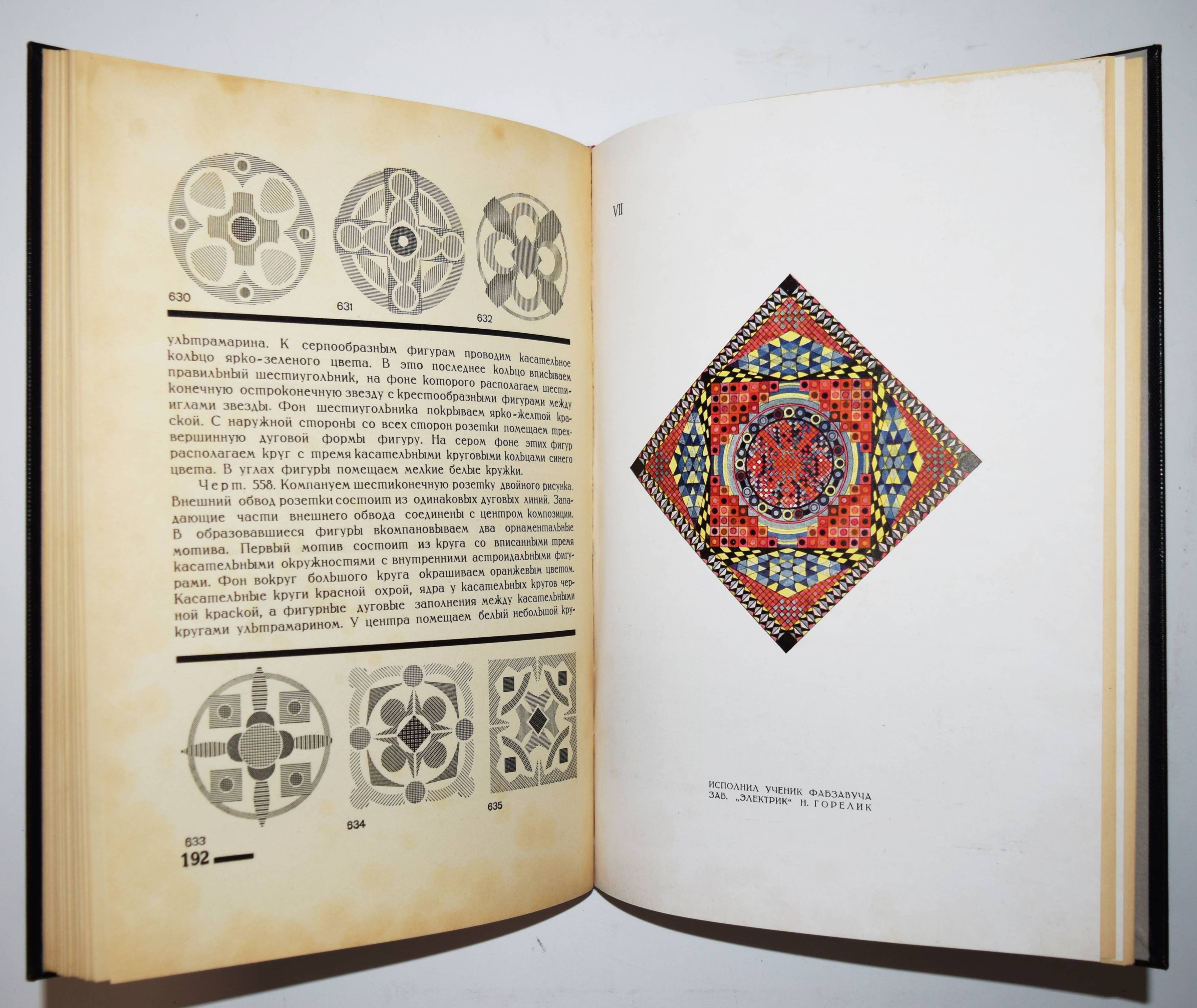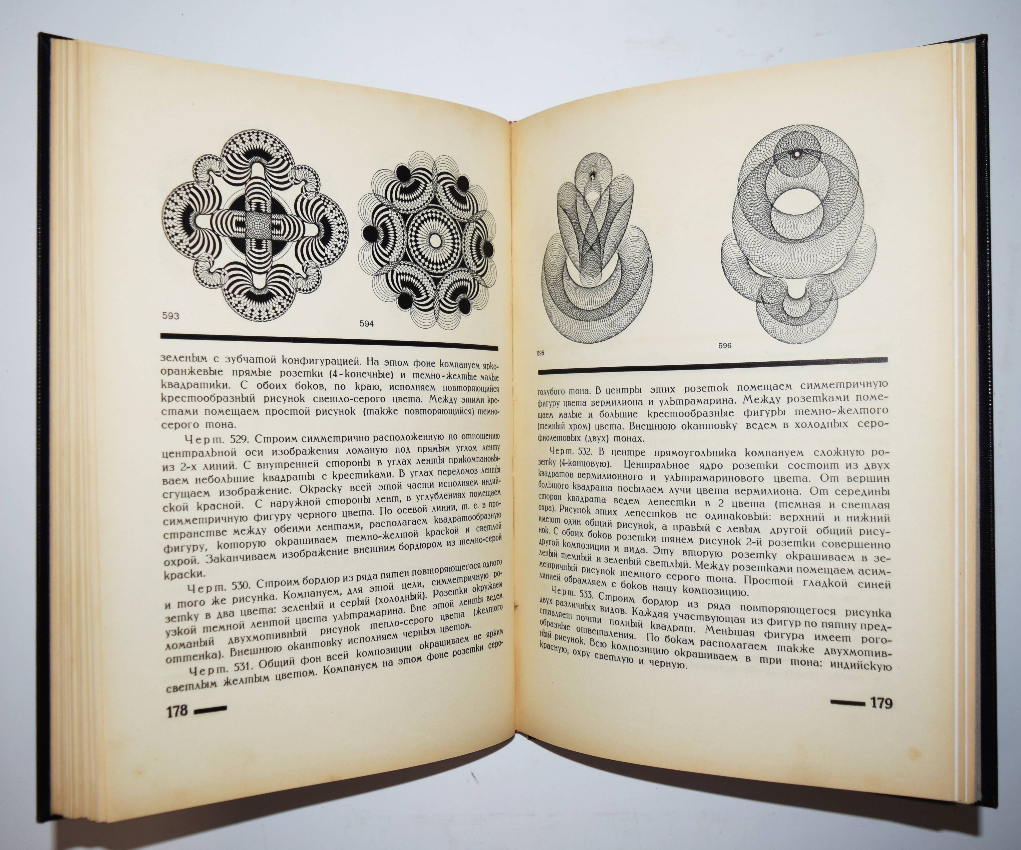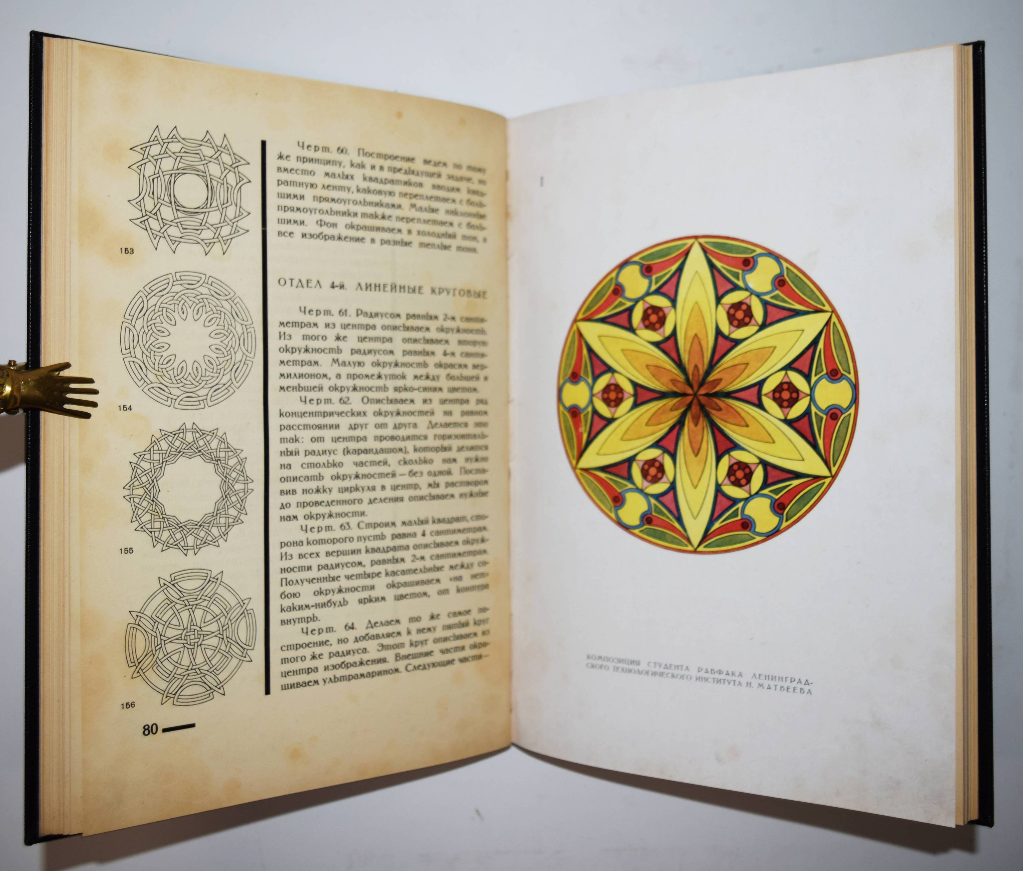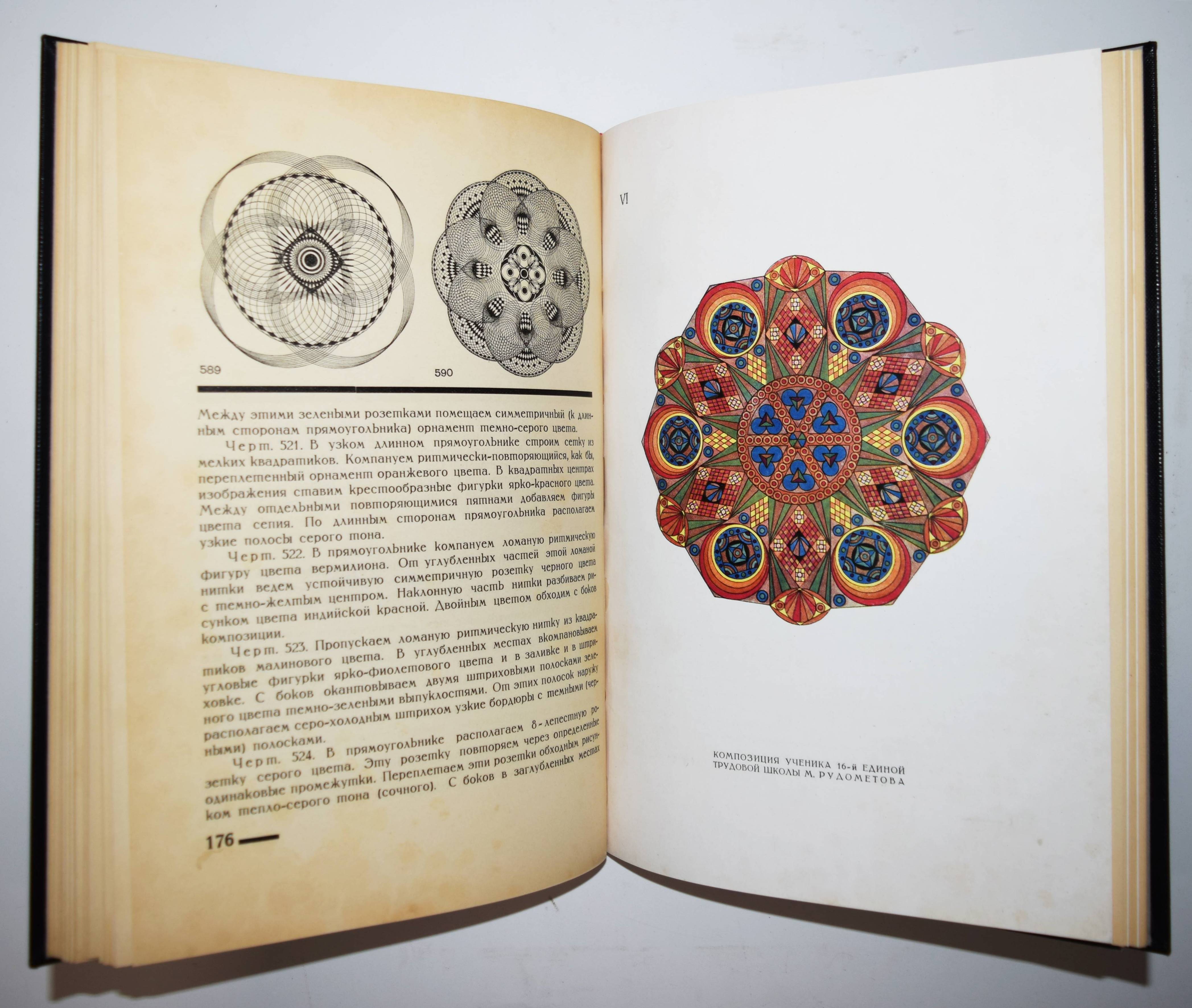 Chernikhov (Tschernychow, Tchernikhov), Iakov (Georgievich). Ornament. Kompozitsionno-klassicheskie postroeniia. (Compositional-Classical Constructions, Konstruktion klassischer Komposition). Leningrad, Eigenverlag 1930/1931. 4° (30 x 22,5 cm.). 221 S., [3] Bl. mit 8 Farbtafeln und 772 weiteren Abbildungen im Text. Moderner schwarzer Leinenband mit silbergeprägtem Rückentitel in Pappschuber mit montiertem Orig.-Umschlag (hinterer Umschlagdeckel liegt bei). Compton, Russian Avant-Garde Books 1917-34, S. 142. Hellyer 73. Rowell/Wye 857 (verz. nur 7 Farbtafeln). – Sehr seltene erste Ausgabe von Chernikhovs berühmtem Lehrbuch zur avantgardistischen Formenlehre. Nur in 3100 Exemplaren erschienen. – „A practical textbook aimed at students, with illustrations of correct and incorrect ways to draw, color, etc., and it seems remarkable today for its myriad of geometric conceits generated without the help of a computer“ (Compton). – Sehr gutes Exemplar.