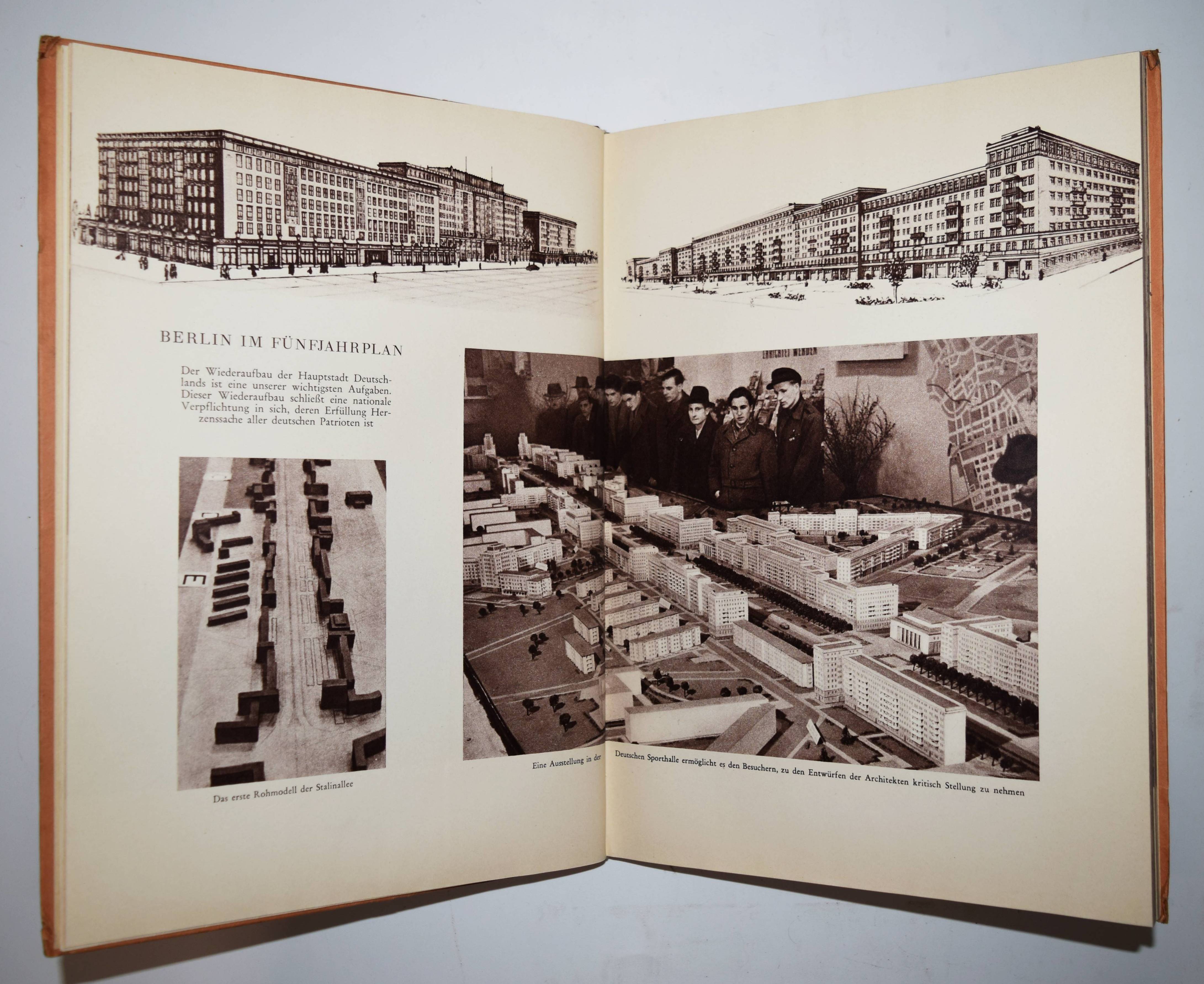 Puhlmann, Gerhard, (Max Ittenbach) u. a. Die Stalinallee. Nationales Aufbauprogramm 1952. Berlin, Verlag der Nation 1952. 4°. [102] Bl. mit 286 Abbildungen, 3 Fotomontagen und Illustrationen. Orig.-Halbleinenband. Parr/Badger I, 182. – Erste Ausgabe des seltenen Propaganda-Fotobuchs über die Berliner Prachtstraße. – Das Werk „sollte einen Beitrag dazu leisten, die Überlegenheit des Sozialismus darzustellen und zeigen, wie der sozialistische Staat für die Arbeiterklasse sorgt, indem großzügig anspruchsvolle Wohnungen gebaut werden. Das Entstehen der Straße sollte ursprünglich nur filmdokumentarisch begleitet werden. Da Gerhard Puhlmann aber den Architekten Professor Hermann Henselmann persönlich kannte, verantwortlich für die Wohnbebauung am Strausberger Platz und den ersten Abschnitt der Stalinallee, sicherte er sich den Auftrag für die fotografische Begleitung des gesamten Bauvorhabens und konnte so die ganze Bandbreite seines Könnens auf brillante Weise unter Beweis stellen. Die hohe Qualität von Puhlmanns Arbeit an diesem Projekt wurde geehrt mit dem Nationalpreis 1. Klasse, verbunden mit einem Geldpreis von 100.000 Mark. 1953 betrug das durchschnittliche Monatseinkommen in der DDR laut Rententabelle 324 Mark“ (Zu einer Neuausgabe im Berlin Story Verlag 2022). – „Propaganda-Fotobücher gibt es in allen Formen, Größen und Ideologien. Manchmal erzählen sie Halbwahrheiten, manchmal lügen sie unverhohlen, manchmal sind sie so sachlich wie Unternehmensberichte. Gerhard Puhlmanns fotografische Dokumentation des viel gepriesenen Wiederaufbauprojekts der DDR gehört zwar eindeutig zur letzteren Kategorie, den harmlosesten Propagandabüchern, lobt aber dennoch eindeutig die Vorzüge des Vorhabens. Die Stalinallee, die 1961 (als Stalins Name in Ungnade fiel) in Frankfurter Allee und Karl-Marx-Allee umbenannt wurde, war das wichtigste städtebauliche Projekt, das in Ost-Berlin durchgeführt wurde. Dieser riesige, 75 bis 80 Meter breite Ost-West-Boulevard endete am Alexanderplatz, dem Zentrum des sowjetisch besetzten Berlins. Entworfen von einem Team unter der Leitung des ostdeutschen Architekten Heinrich Henselmann, war es ein äußerst ehrgeiziges Projekt, dessen erste Phase in Puhlmanns Buch liebevoll dokumentiert wurde“ (M. Parr). – Sehr gutes sauberes Exemplar.