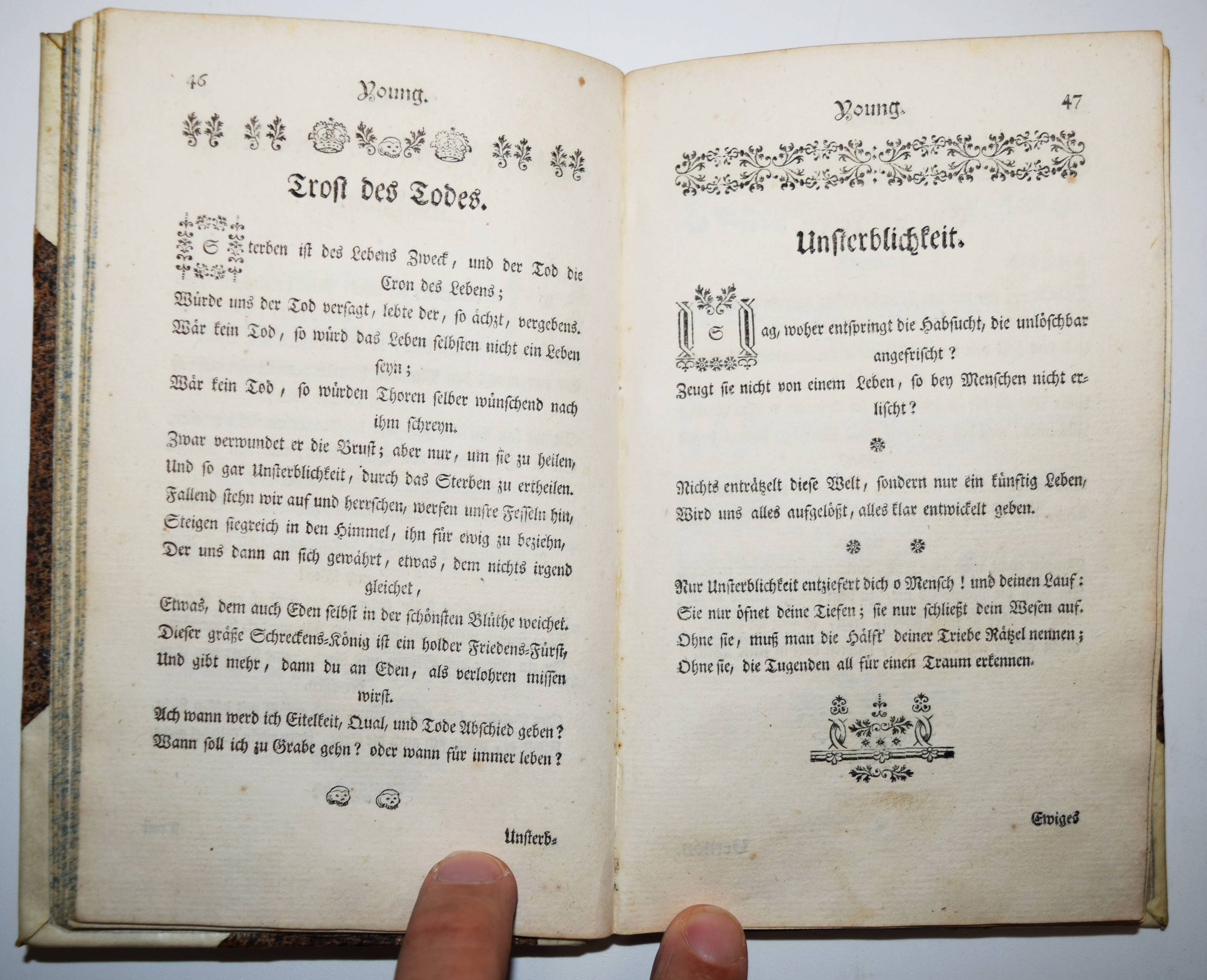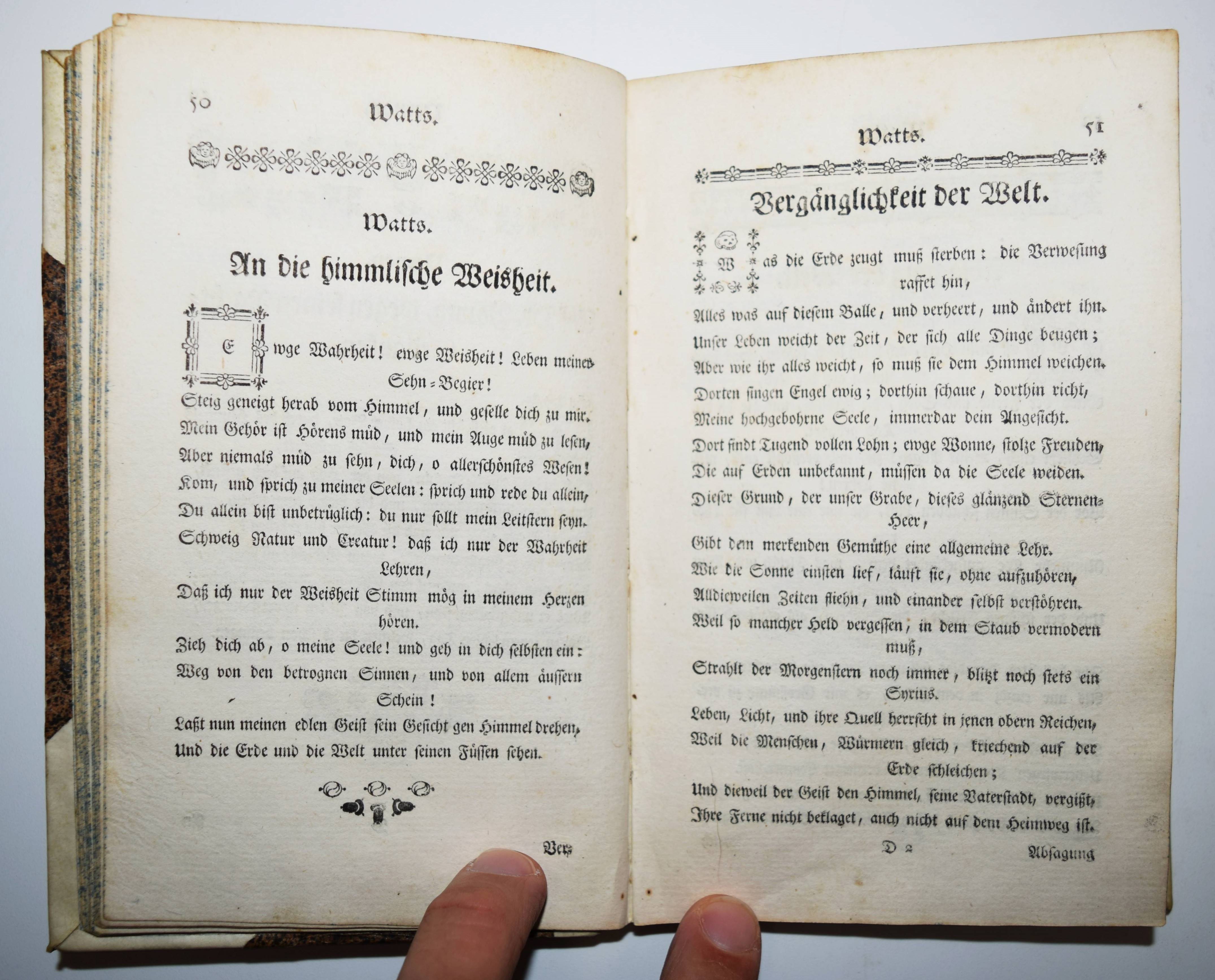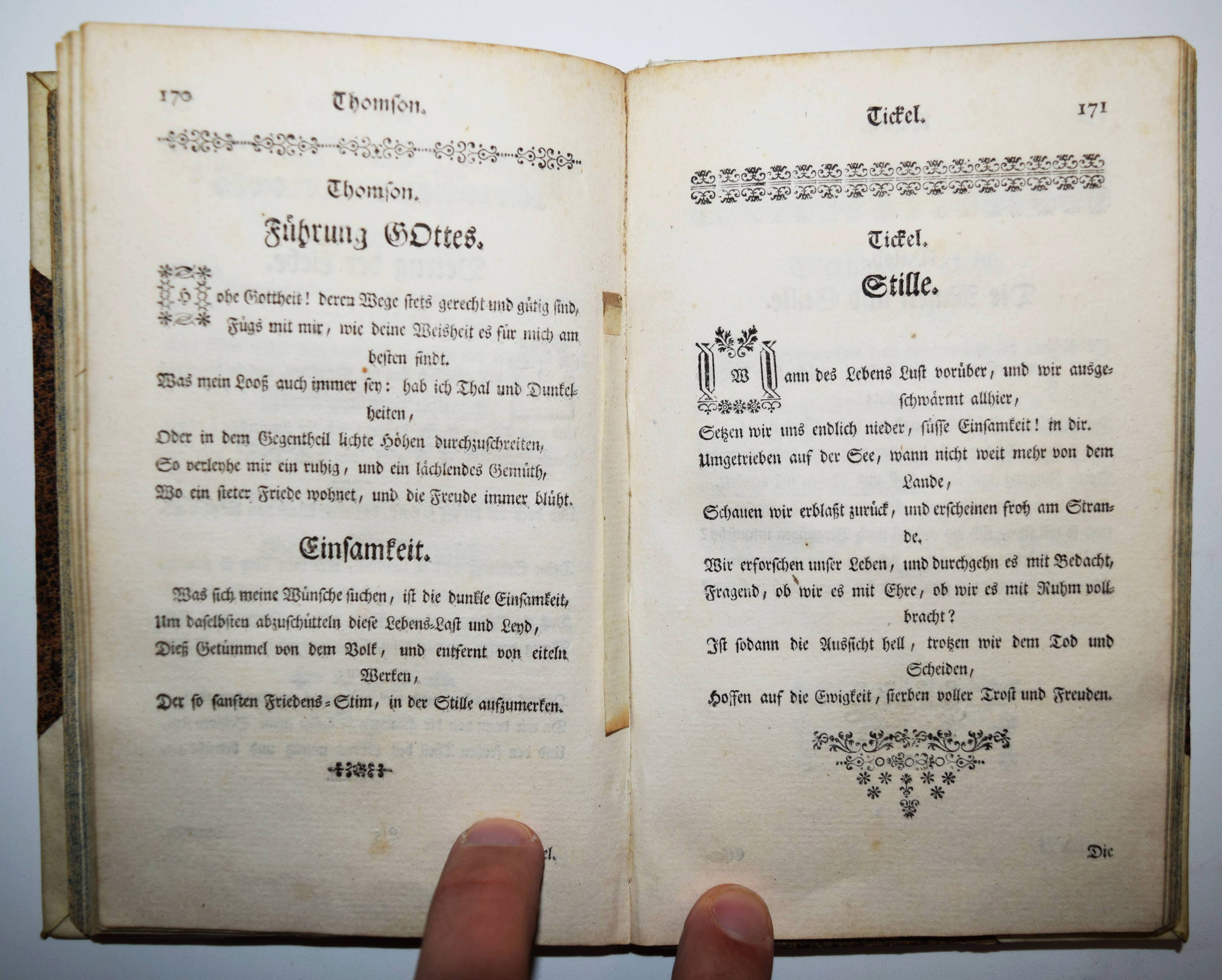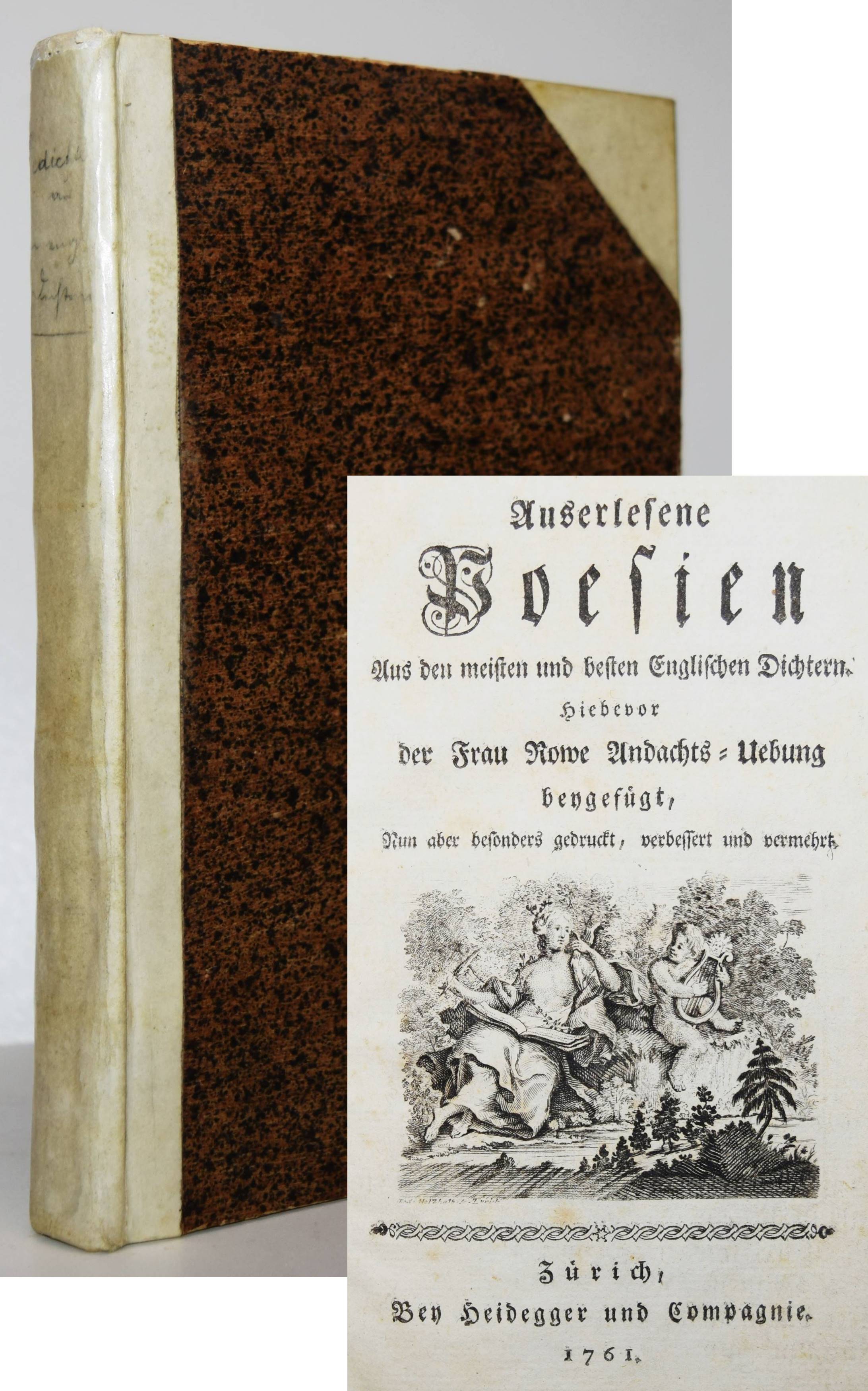 (Burckard, Johann Jakob, Übersetzung). Auserlesene Poesien Aus den meisten und besten englischen Dichtern. Hiebevor der Frau Rowe Andachts-Uebung beygefügt. Nun aber besonders gedruckt, verbessert und vemehrt. Zürich, Heidegger und Compagnie 1761. 8°. 215 S. mit gestoch. Titelvignette. Halbpergamentband der Zeit. Holzmann/Bohatta III, 9211. VD18 11106344. – Erste Ausgabe der englischen Anthologie. Mit Dichtungen von Addison, Baxter, Blackmore, Carter, Cowley, Dryden, Gay, Green, Johnson, Milton, Pope, Rowe, Swift, Tollet, Watts, Young u.v.a. – Nur vereinzelt leicht braunfleckig, sonst sehr gut erhalten.