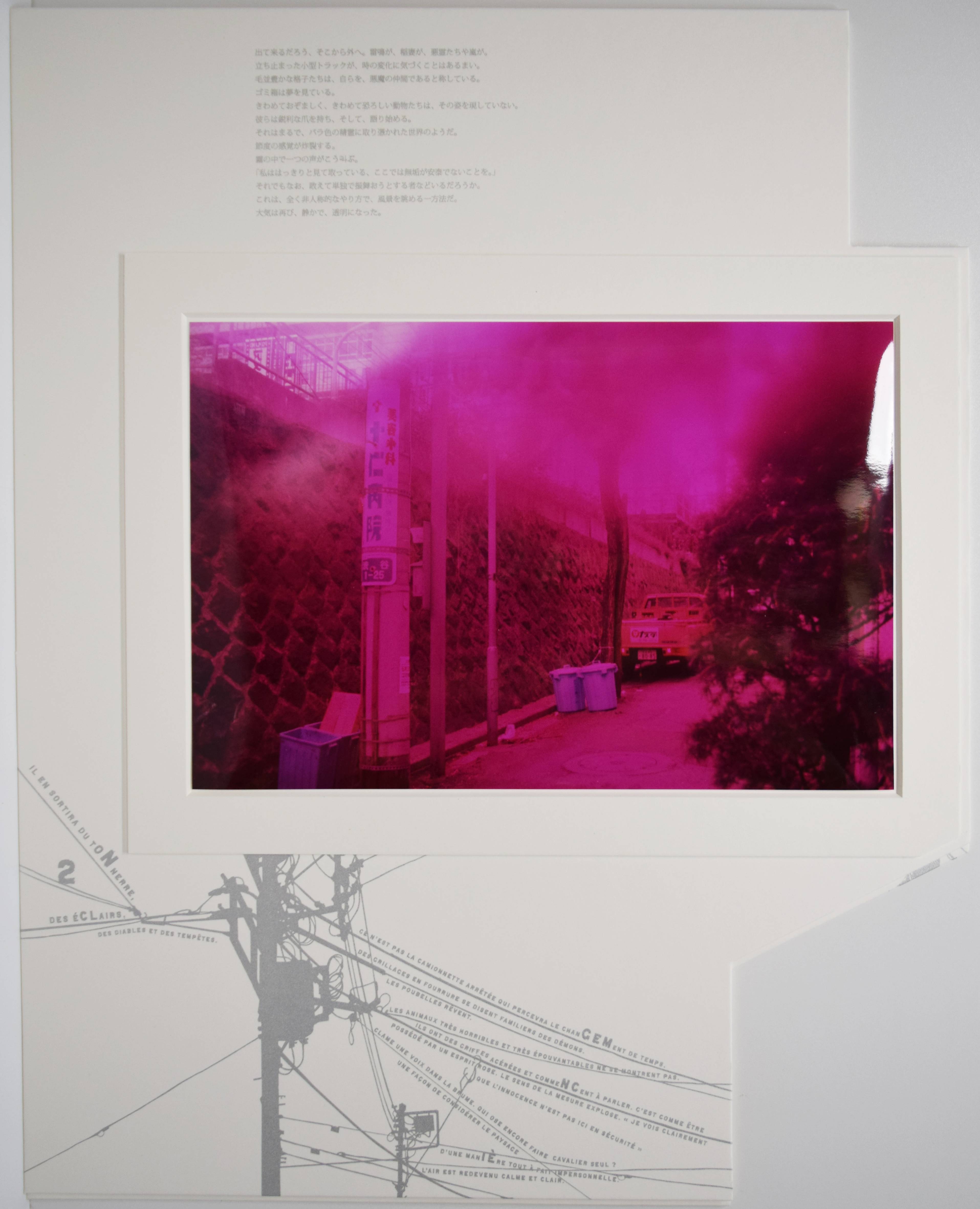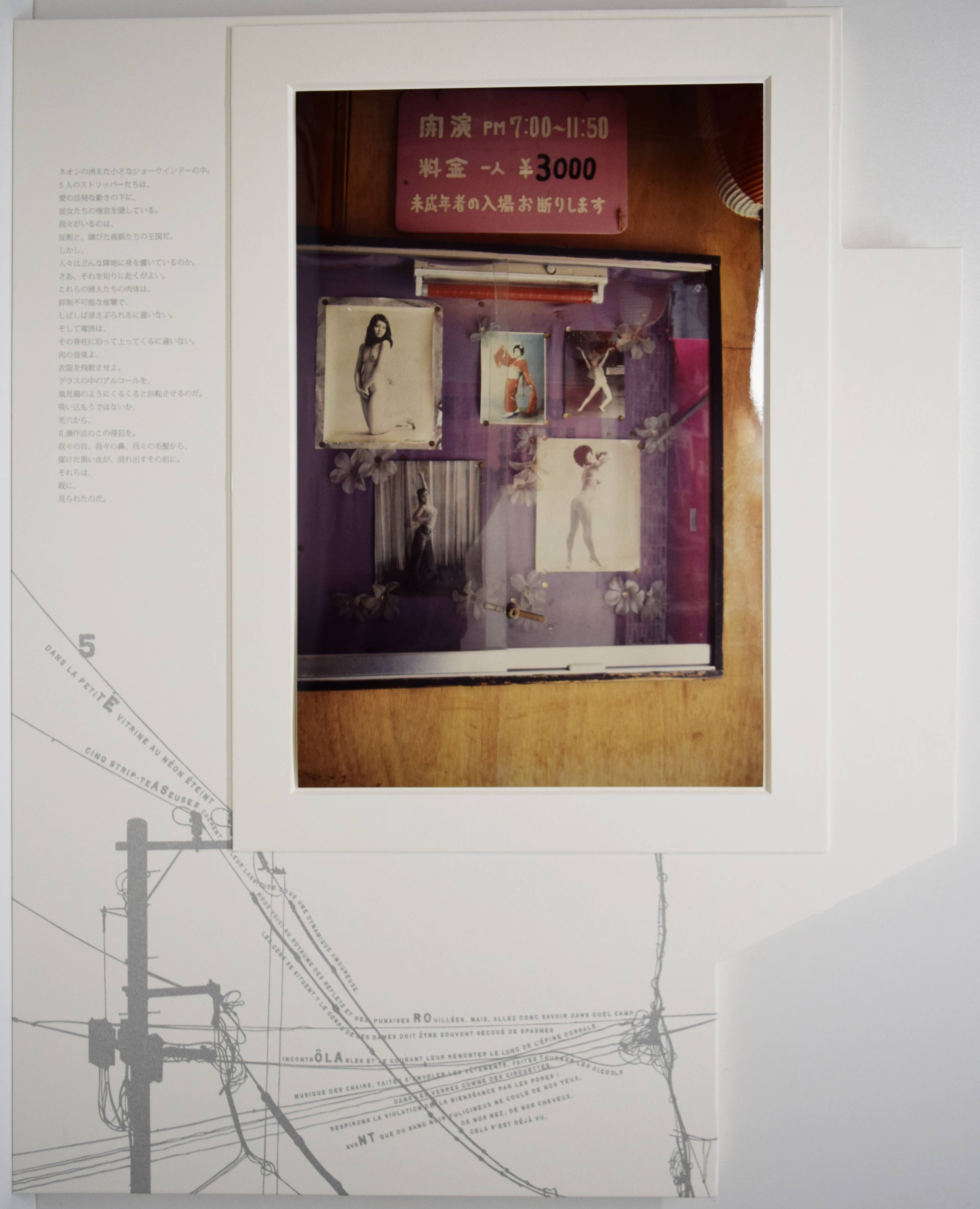 Moriyama, Daido and Michel Bulteau. Solitude de l’oeil. Poèmes (and) photographies. Paris, Toluca Editions Mai 2007. Imperial-Folio (52 x 42 cm.). Illustr. Titel und 6 illustr. Karton-Blätter mit mont. Farbphotographien (chromogenic prints, 19,5 x 21,5 cm.). Achteckige Orig.-Kunststoff-Buchkassette (51,7 x 42,5 x 5,2 cm.) in Leinenkassette. No. 10 von 40 Exemplaren; im Druckvermerk von D. Moriyama und M. Bulteau signiert. Texte in Französisch und Japanisch. – „Édition limitée à 40 exemplaire chaque exemplaire est illustré de 6 tirages C-print signés. – Conception graphique: Olivier Andreotti.“ – „Daido Moriyamas Vision liegt im Herzen der Dunkelheit, sowohl im eigentlichen als auch im übertragenen Sinne. Die Welt, die er aufzeichnet, ist schwarz, vom Licht eher betäubt als beleuchtet, bedrohlich, chaotisch, unverständlich, zwanghaft erotisch, besessen exzentrisch, konsumfixiert, verwüstet von Unfällen, nie im Gleichgewicht, manchmal zugrunde gerichtet, bisweilen leer – eine Welt, die sich ihrer eigenen Instabilität nicht bewusst ist, eine Welt, die Prozac braucht. Seine fotografischen Methoden, geprägt von Unschärfen und Kratzern, ausgeblichenen Farben und Staub, verschmelzen mit seinen Motiven zu Dolkumenten, die kurz vor dem Verfall stehen. Manchmal spielt Moriyama mit den Grenzen der Wahrnehmung und mit den Grenzen der Fotografie; beides lässt er hoffnungslos eng gesteckt erscheinen. Eine unerbittliche, sogar grimmige Vision, individuell und authentisch, die bis an ihre eigenen Grenzen geht“ (V. Goldberg in Koetzle, Fotografen A-Z). – Sehr gutes Exemplar.