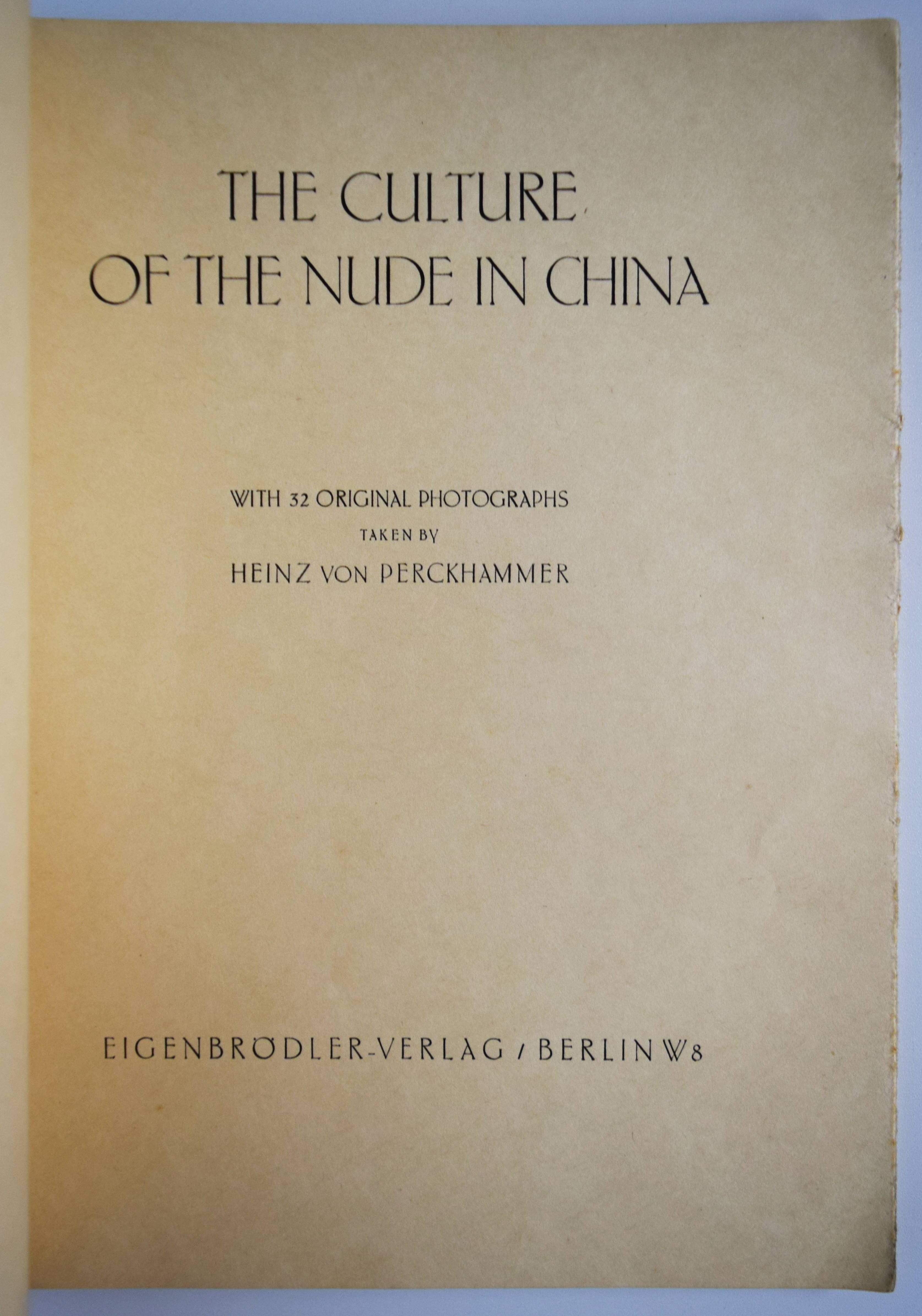 Perckhammer, Heinz (Heinrich Josef Anton Alois) v. The culture of the nude in China. With 32 original photographs. Berlin, Eigenbrödler-Verlag (1928). 4°. 7, (1) S. und 31 Tafeln in Kupfertiefdruck. Orig.-Kartonumschlag mit illustr. Schutzumschlag. Bertolotti 122 f. Heidtmann 11188. Heiting/Jaeger I, 208 f. Nicht bei Koetzle. – Seltene englische Ausgabe. Mit einem Vorwort Perckhammers. Exemplar mit dem meist fehlenden Schutzumschlag, der die Abbildung 32 zeigt. Druck auf kräftigem, chamoisfarbenem Papier. – H. v. Perckhammers (1895–1965) umfangreiches Werk ist bislang kaum erschlossen. 1914 gelangte er als Matrose schiffbrüchig in den Fernen Osten, sein Schiff wurde versenkt. Mit einem kleinen Rest der Besatzung war er von 1917 bis 1919 in einem chinesischen Lager interniert. In dieser Zeit begann seine fotografische Laufbahn, bis 1928 blieb er in China. Nach seiner Rückkehr eröffnete er am Kurfürstendamm sein „Photo-Art-Studio“, belieferte die Presse mit Aufnahmen aus Gesellschaft, Motorsport und zahlreichen Aktbildern und veröffentlichte einige Bildbände. Neben einigen Beiträgen in Fotobüchern über China erschien noch „China und die Chinesen“ in der Reihe „Schaubücher“ des Züricher Orell Füssli Verlags. – Schutzumschlag angestaubt und etwas berieben, nur vereinzelt im unteren Blattrand leicht fingerfleckig, schönes Exemplar.
