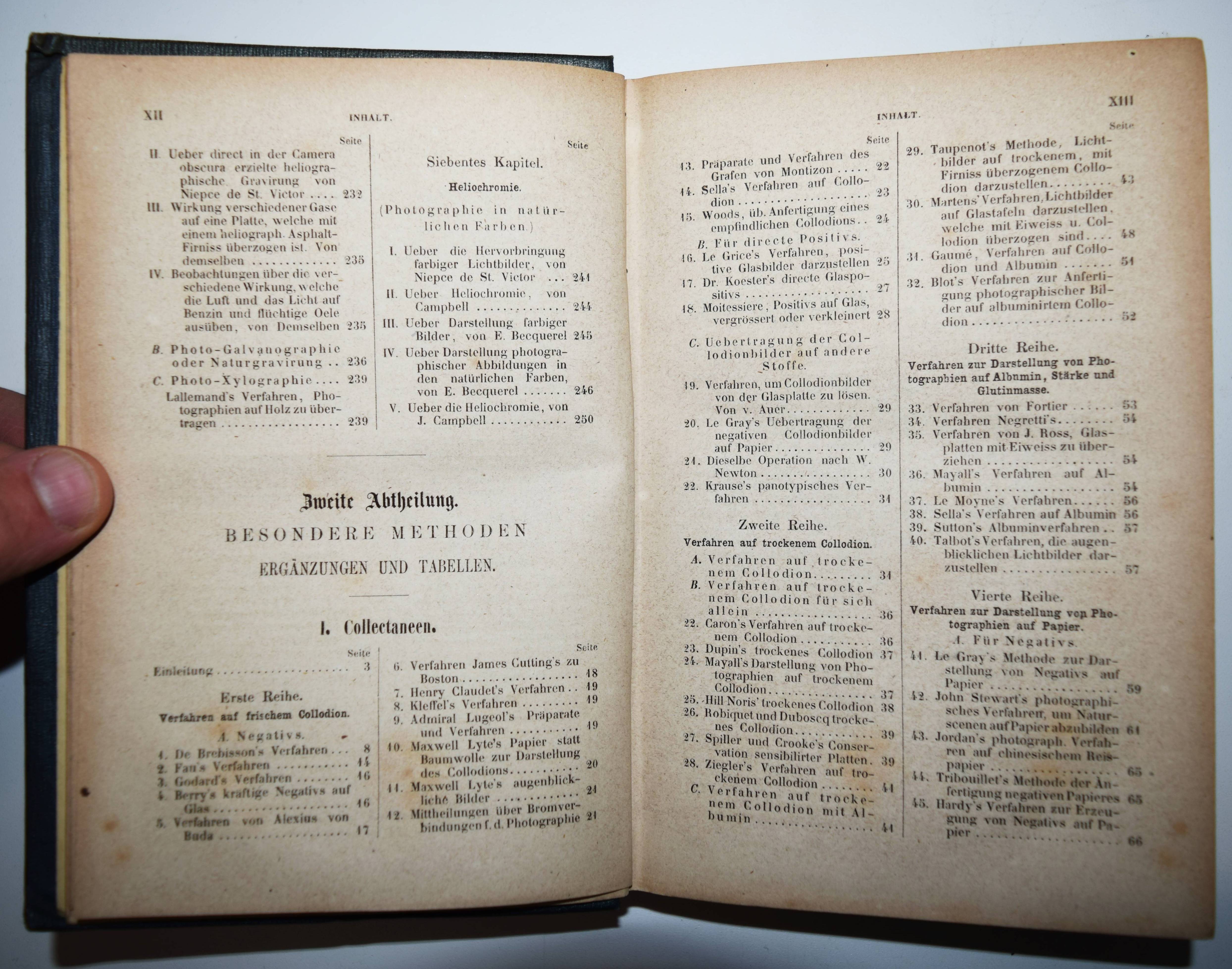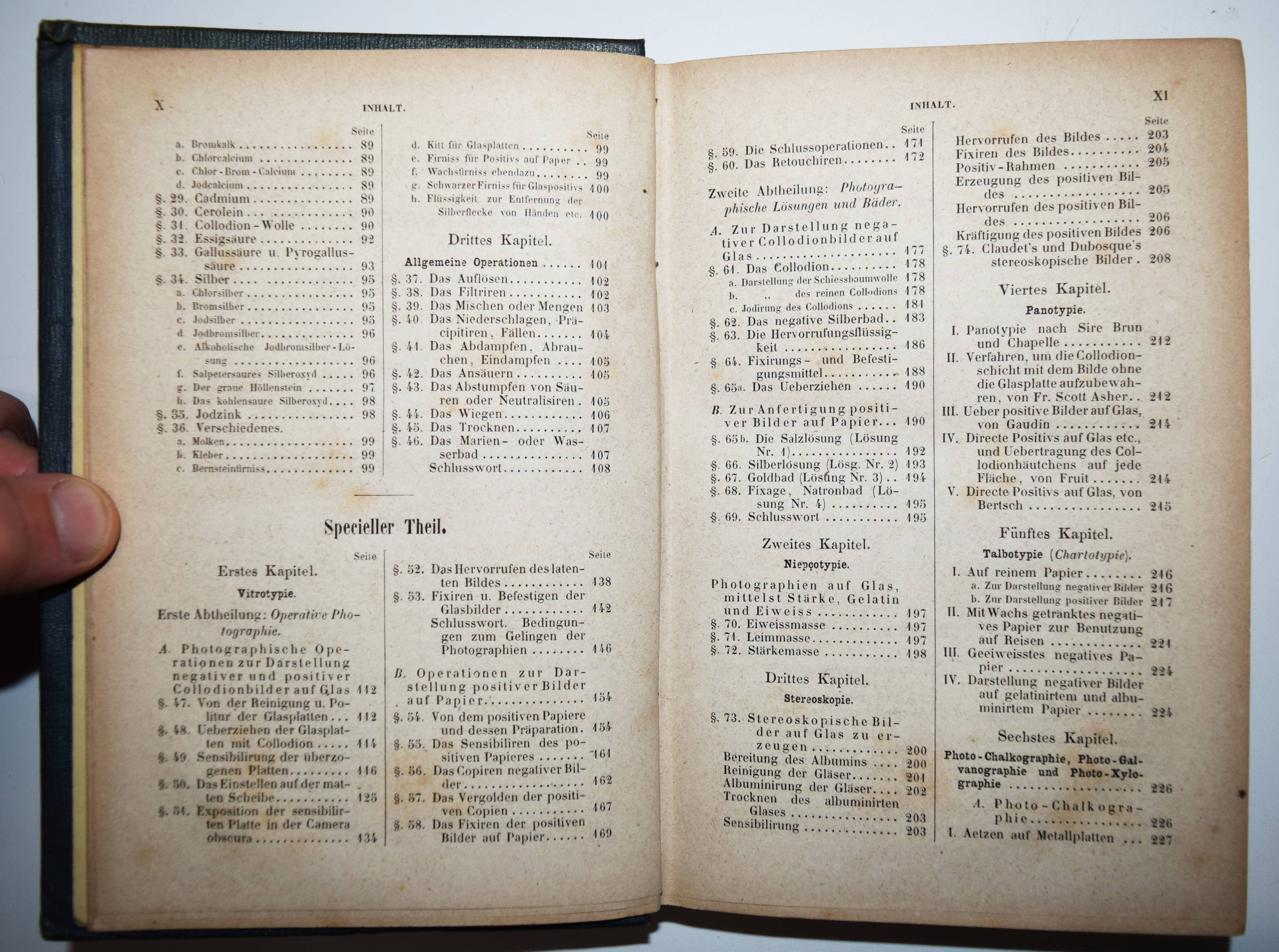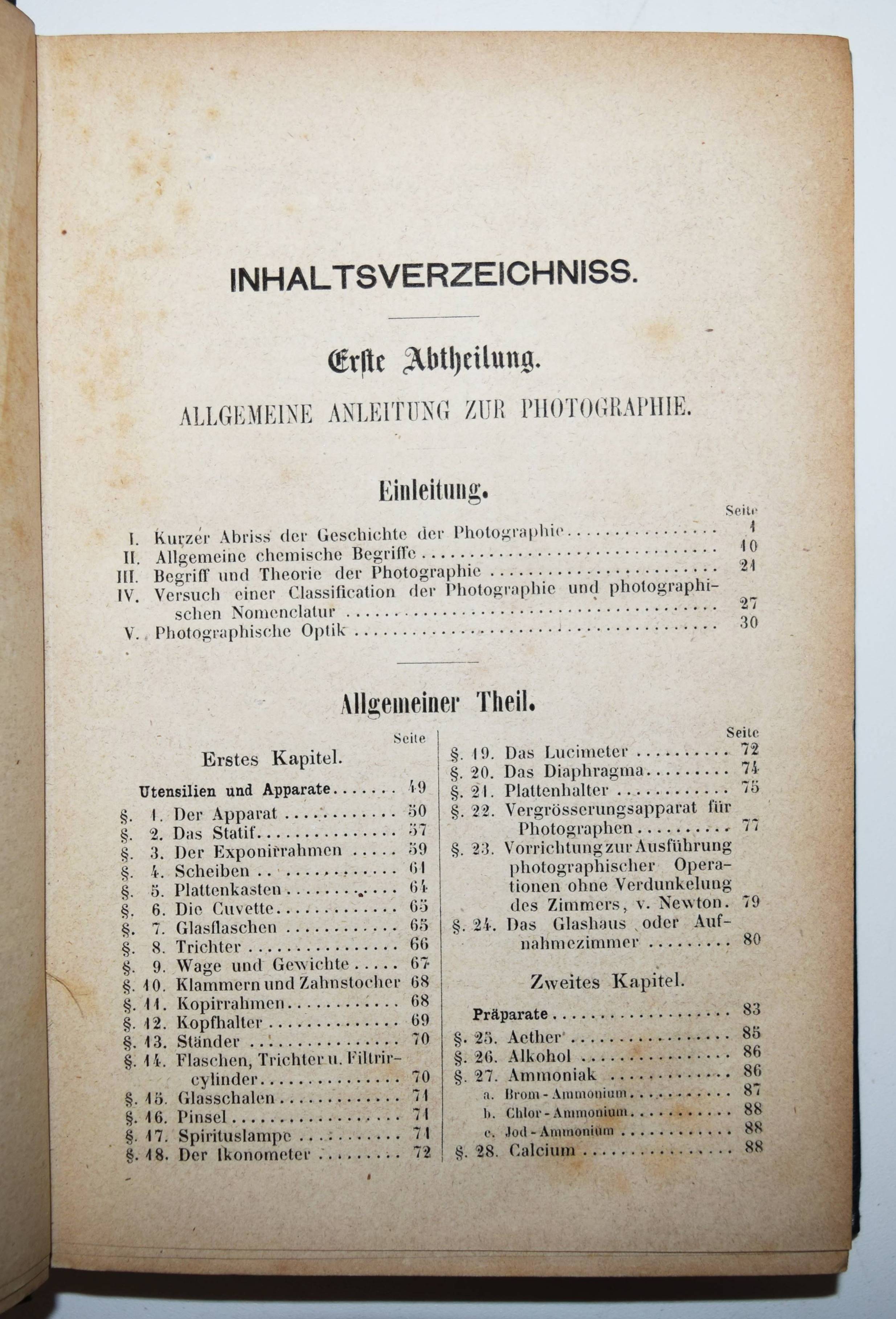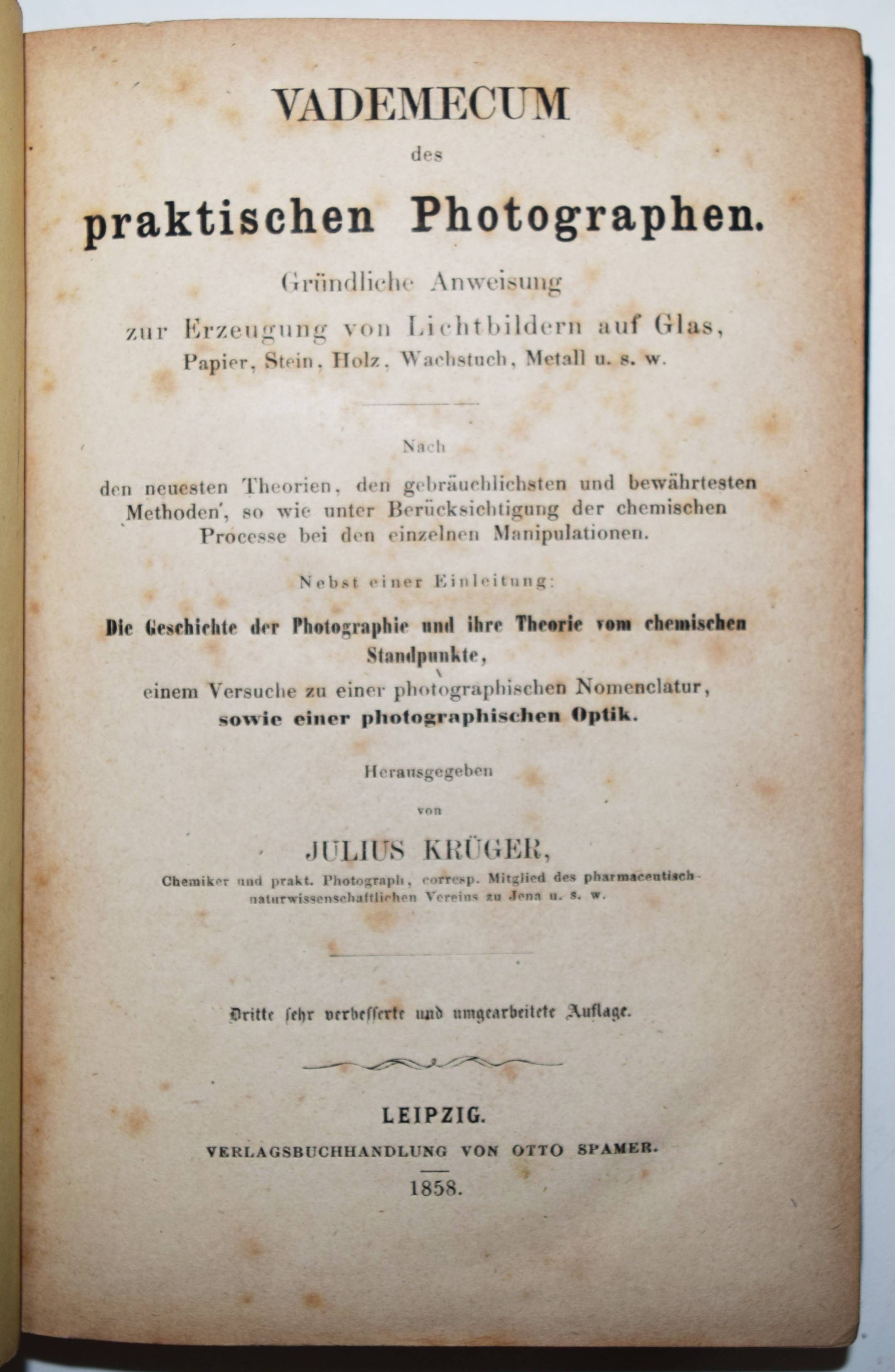 Krüger, Julius. Vademecum des praktischen Photographen. Gründliche Anweisung zur Erzeugung von Lichtbildern auf Glas, Papier, Stein, Holz, Wachstuch, Metall u. s. w. Nach den neuesten Theorien, den gebräuchlichsten und bewährtesten Methoden, so wie mit besonderer Berücksichtigung der chemischen Processe bei den einzelnen Manipulationen. Nebst einer Einleitung: Die Geschichte der Photographie und ihre Theorie vom chemischen Standpunkte, einem Versuche zu einer photographischen Nomenclatur, sowie einer photographischen Optik. 3. sehr verbesserte und umgearbeitete Auflage. 2 Teile in 1 Band. Leipzig, Otto Spamer 1858. 8°. XVI, [1] Bl., 252 S.; 150, XL S. Orig.-Leinenband mit goldgepr. Rücken- und Deckeltitel, Romantikervergoldung und goldgepr. Deckelvignette. Heidtmann 3486. Roosens/Salu 6660. – Die letzte und beste Ausgabe unter diesem Titel; als 4. Auflage erschien 1864 eine Neubearbeitung von Heinrich Heinlein mit dem Titel „Photographikon“. Die erste Ausgabe erschien 1856. – Das umfassende Handbuch richtet sich am professionelle Fotografen und Amateure und sollte: „1) jeden Anfänger, selbt den Laien, in den Stand setzen …, Photographien anzufertigen; 2) alle störenden Erscheinungen, die dem praktischen Photographen vorkommen können, und leider mit und ohne eigene Schuld oft vorkommen, erklärt und vermeiden lehrt; 3) alle bisherigen Erfahrungen, die wissenswerth und deren Kenntniss zum Theil höchst nöthig ist, klar und fasslich, gedrängt und übersichtlich zusammenstellt.“ (J. Krüger in seiner Vorrede zur ersten Auflage). – „Besonders der seit 1858 in Stralsund tätige Fotograf Julius Krüger verdient nicht nur durch ein von ihm verfasstes Lehrbuch besondere Beachtung, sondern auch durch seine Förderung des neuen Mediums. Die Aufnahme als Mitglied des „provisorischen Comitées zur Gründung eines Deutschen Photographenvereins“ unterstreicht seinen guten Ruf. Ebenso scheint er der erste Fotograf in Stralsund und auf Rügen gewesen zu sein, der sich mit Landschaftsaufnahmen auseinandersetzte und diese zum Kauf anbot. Eine von ihm angewandte Technik, wie man Küstenorte von See aus in hoher Qualität fotografiert, findet auch in Pizzighellis „Handbuch der Photographie“ Erwähnung, in dem seine Vorgehensweise beim Ablichten des Küstenortes Sassnitz auf Rügen im Jahr 1867 beschrieben wird“ (Frank Biederstaedt, Die Geschichte der gewerblichen Fotografie in Vorpommern von den Anfängen bis ca. 1885. Greifswald 2023). – Rücken etwas aufgehellt, stellenweise teils stärker braunfleckig und gebräunt, gutes Exemplar im dekorativen Originaleinband.