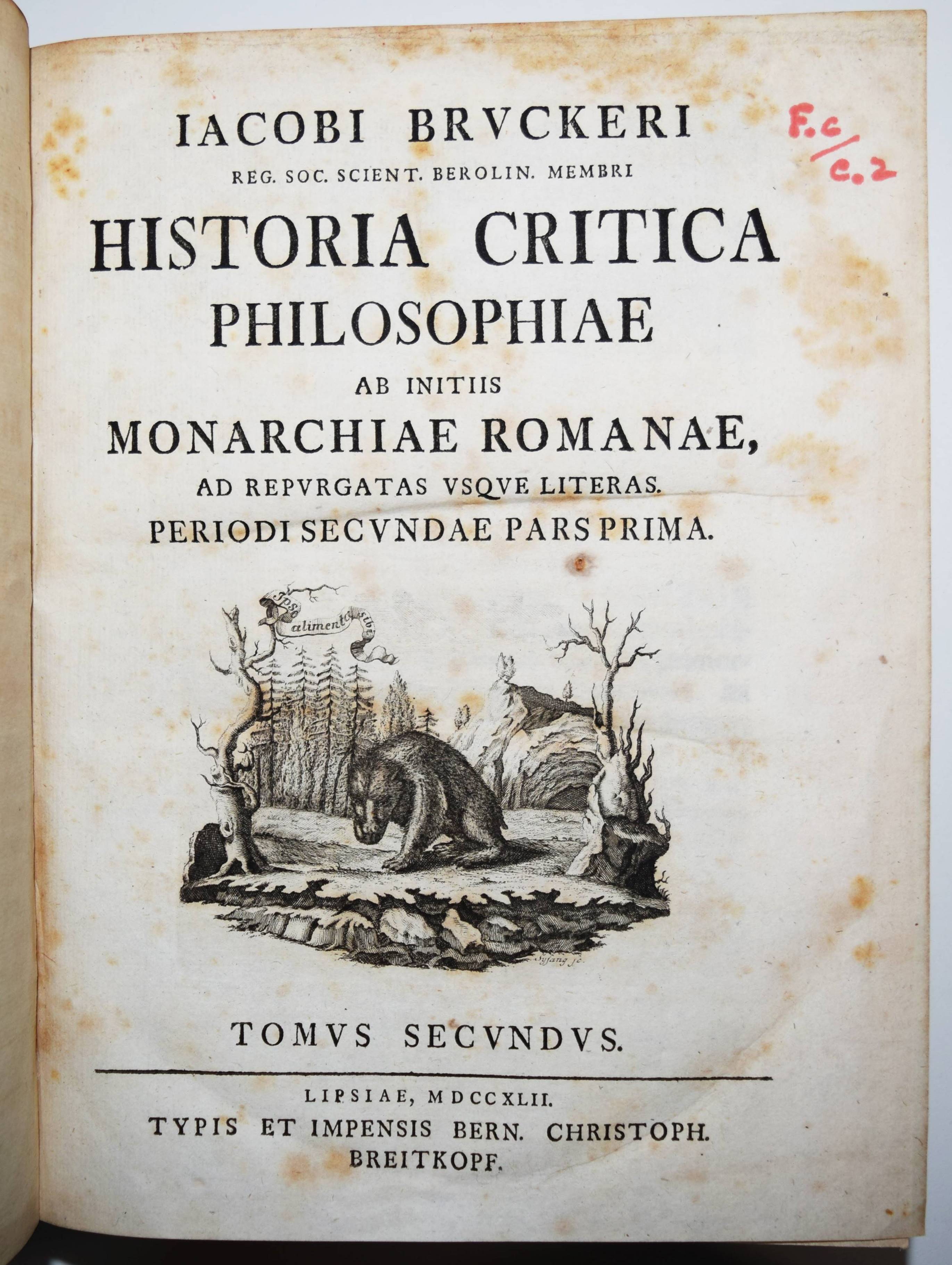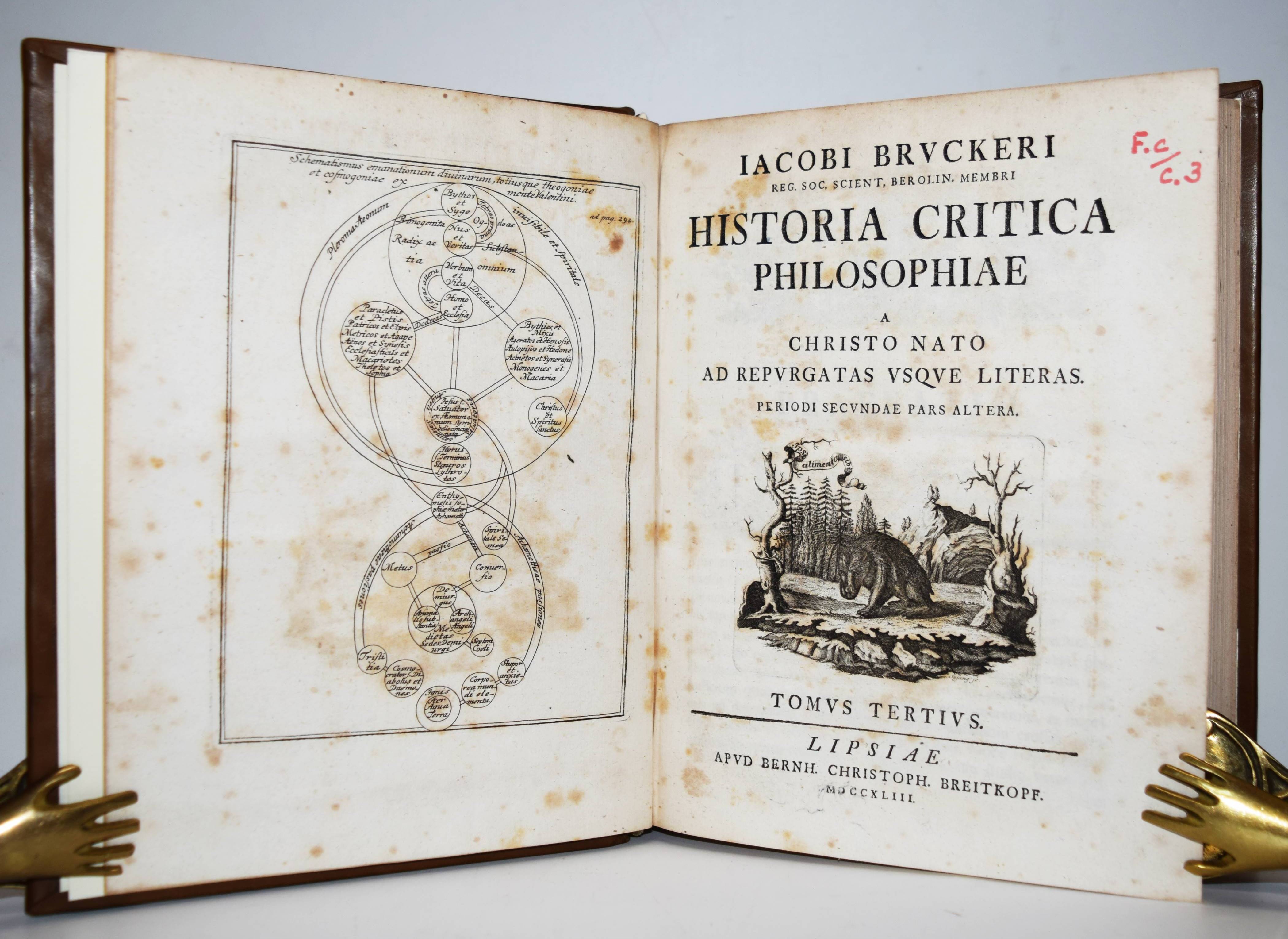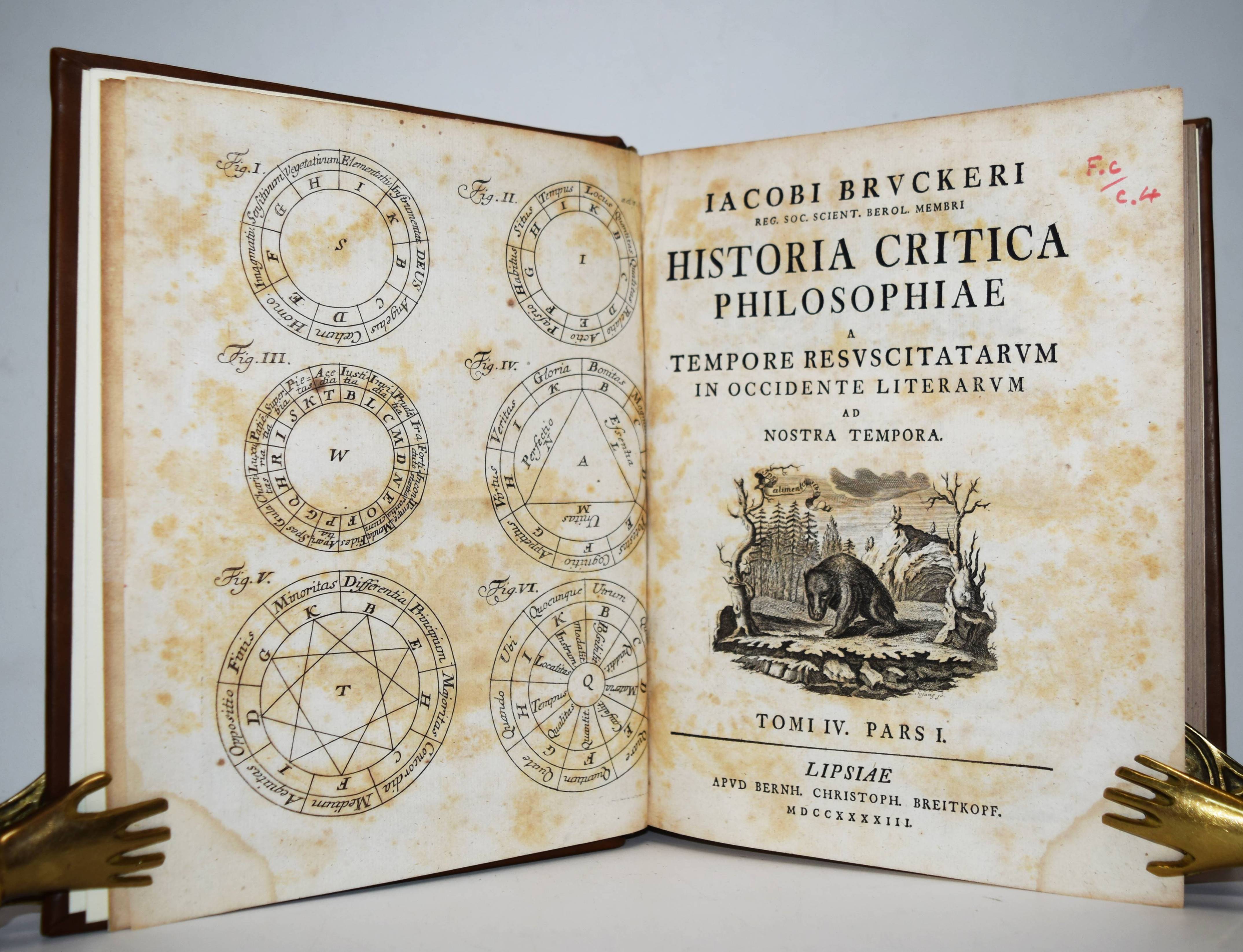 Brucker, (Johann) Jakob. Historia critica philosophiae. 4 in 5 Bänden. Leipzig, Bernhardf Christoph Breitkopf 1742-1744. Gr.-8° (24 x 18,5 cm.). [7] Bl., 1357, (35) S.; [4] Bl., 1092, (31) S.; [3] Bl., 916, (28) S.; [3] Bl., 789, (27) S.; [4] Bl., 939, (29) S. mit 5 gestoch. Titelvignetten, 1 gestoch. Portrait in Band I und 4 Kupfertafeln. Moderne Kalbslederbände mit goldgepr. Rückentitel und Rücken- und Deckelvergoldung. ADB III, 397. Brunet I, 1284. Graesse I, 550. NDB II, 647. VD18 80305083, 80305091, 90044789 u. 80305121. – Erste Ausgabe. 1757 erschien noch ein Nachtragsband bei Weidmann in Leipzig. Eine zweite Auflage erschien 1766-1767 in 6 Bänden. – I. A mundi incunabulis ad nostram usque aetatem deducta. – II. Ab initiis monarchiae romanae, ad repurgatas usque literas periodi secundae pars prima. – III. A Christo nato ad repurgatas usque literas. Periodi secundae pars altera. – IV, 1 und 2. Tempore resuscitatarum in occidente litteratum ad nostra tempora. – „Der eigentliche Begründer der Geschichte der Philosophie in der Neuzeit“ (G. F. v. Hertling in ADB). – J. J. Brucker (1696-1770) „studierte in Jena bei Johann Franz Buddeus Theologie und wurde von seinem Freund Carl Friedrich Buddeus zu seiner Geschichte der Philosophie angeregt. Als Lateinschuldirektor und Geistlicher in Kaufbeuren schrieb er das umfassende Werk, in dem Neuplatonismus und Scholastik abgelehnt, Sokrates, Aristoteles, Melanchthon und Buddeus hoch und die christliche Religion als die allervortrefflichste Philosophie gewertet werden, um dem Leser Gedanken der klügsten Menschen zu vermitteln, ihn zur Kritik und durch Tugendregeln zur Willensverbesserung zu leiten und so dem Reiche Gottes zu dienen. Wie als Gelehrter, so wirkte dieser erste deutsche Philosophiehistoriker auch als dem Pietismus nahestehender, toleranter Geistlicher und Jugenderzieher vorbildlich, seit 1744 bis zu seinem Tode in Augsburg“ (G. Kahl-Fuhrtmann in NDB). – Britisches Wappen-Exlibris von 1783 in allen Bänden, stellenweise etwas braunfleckig und mit Feuchtigkeitsspuren, sehr gutes dekorativ gebundenes Exemplar mit allen Kupfertafeln.
