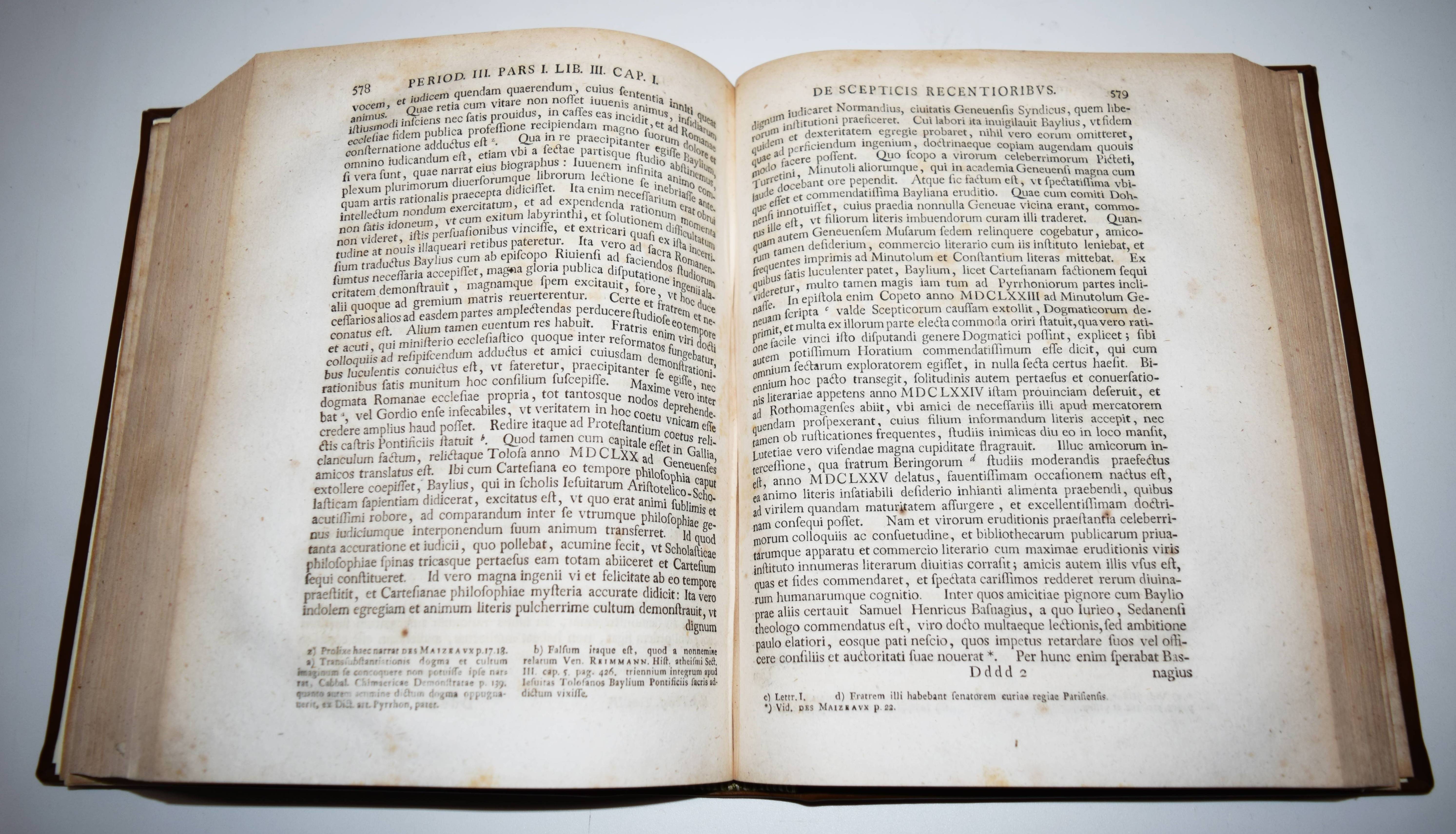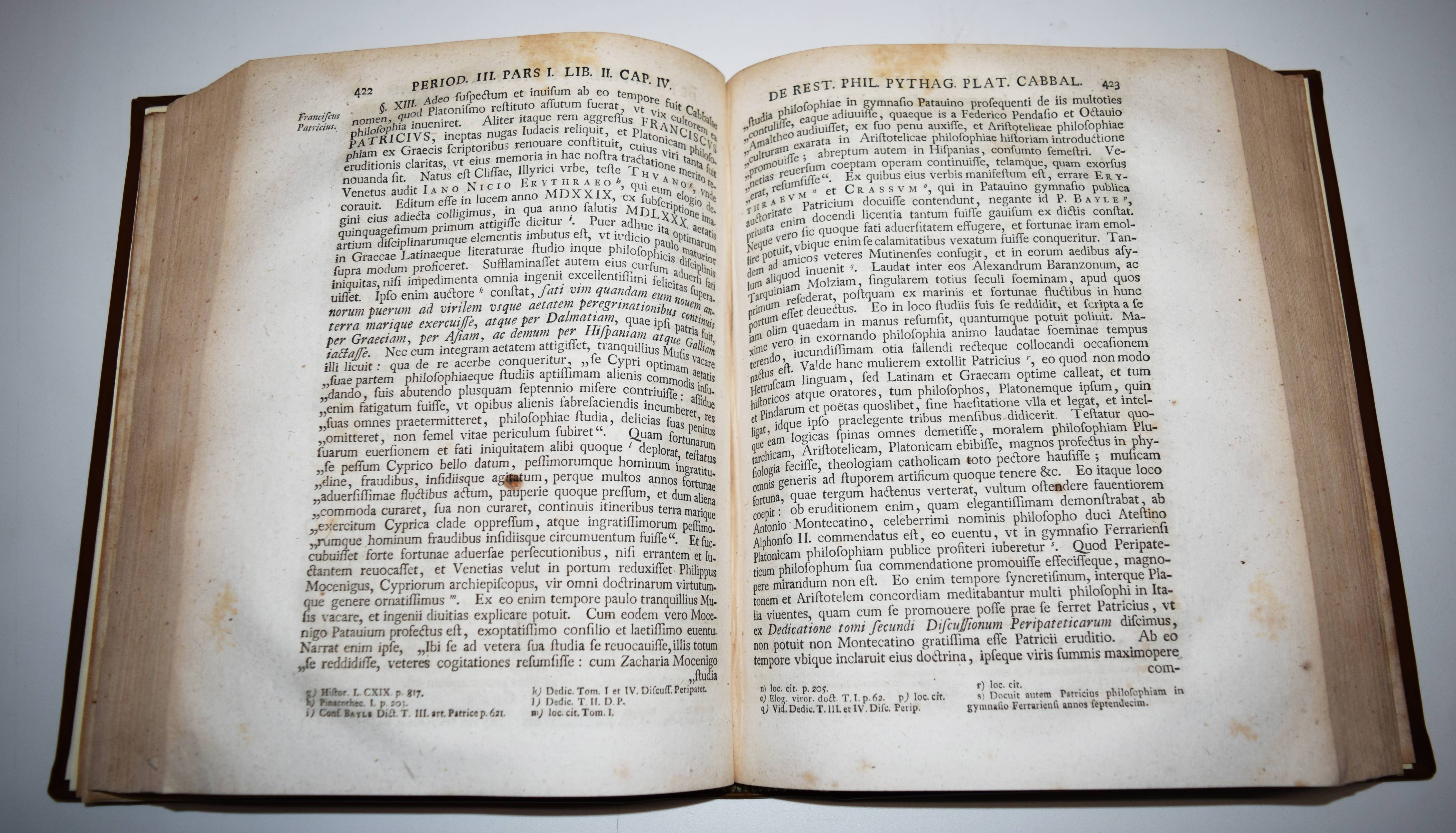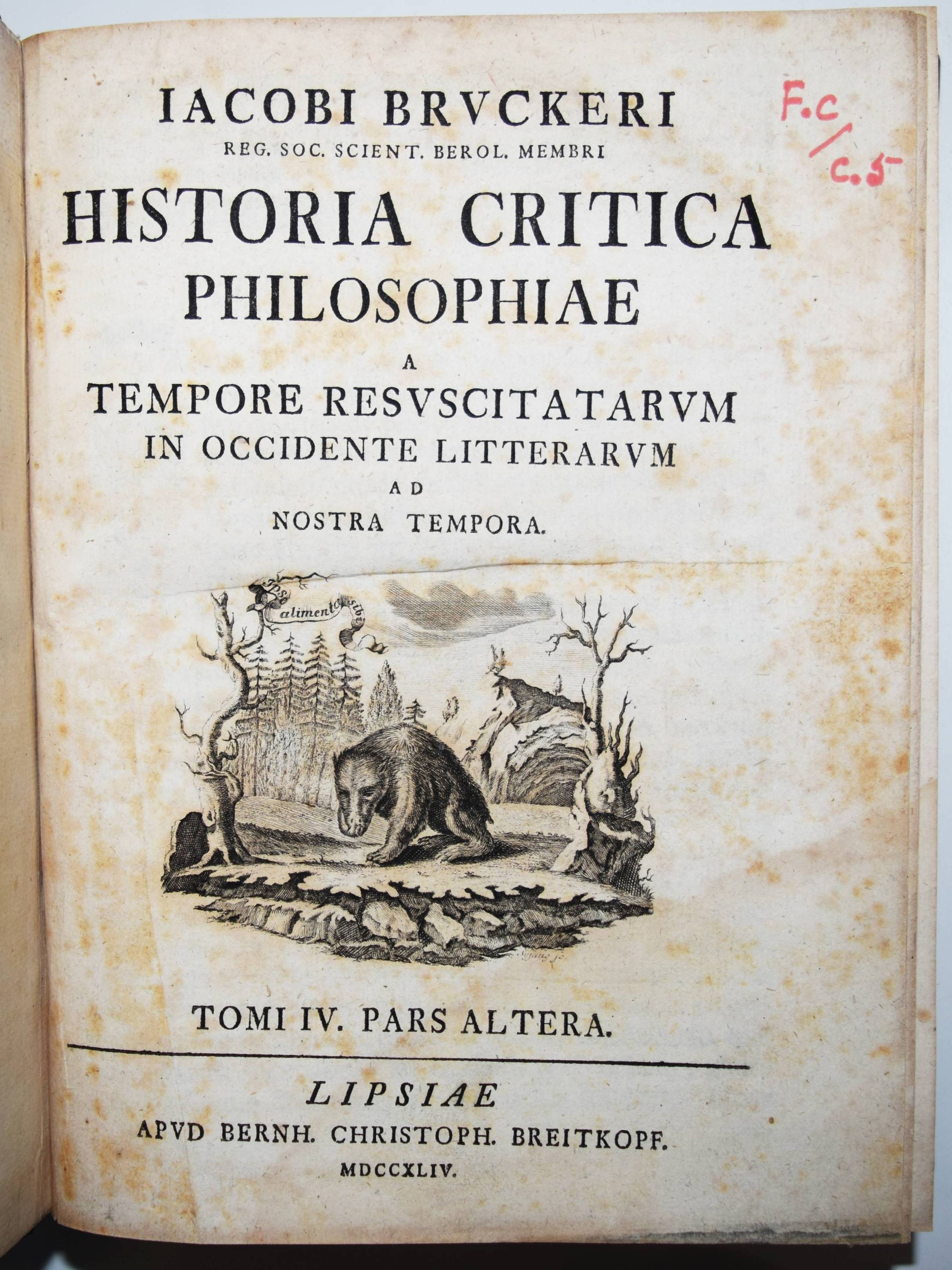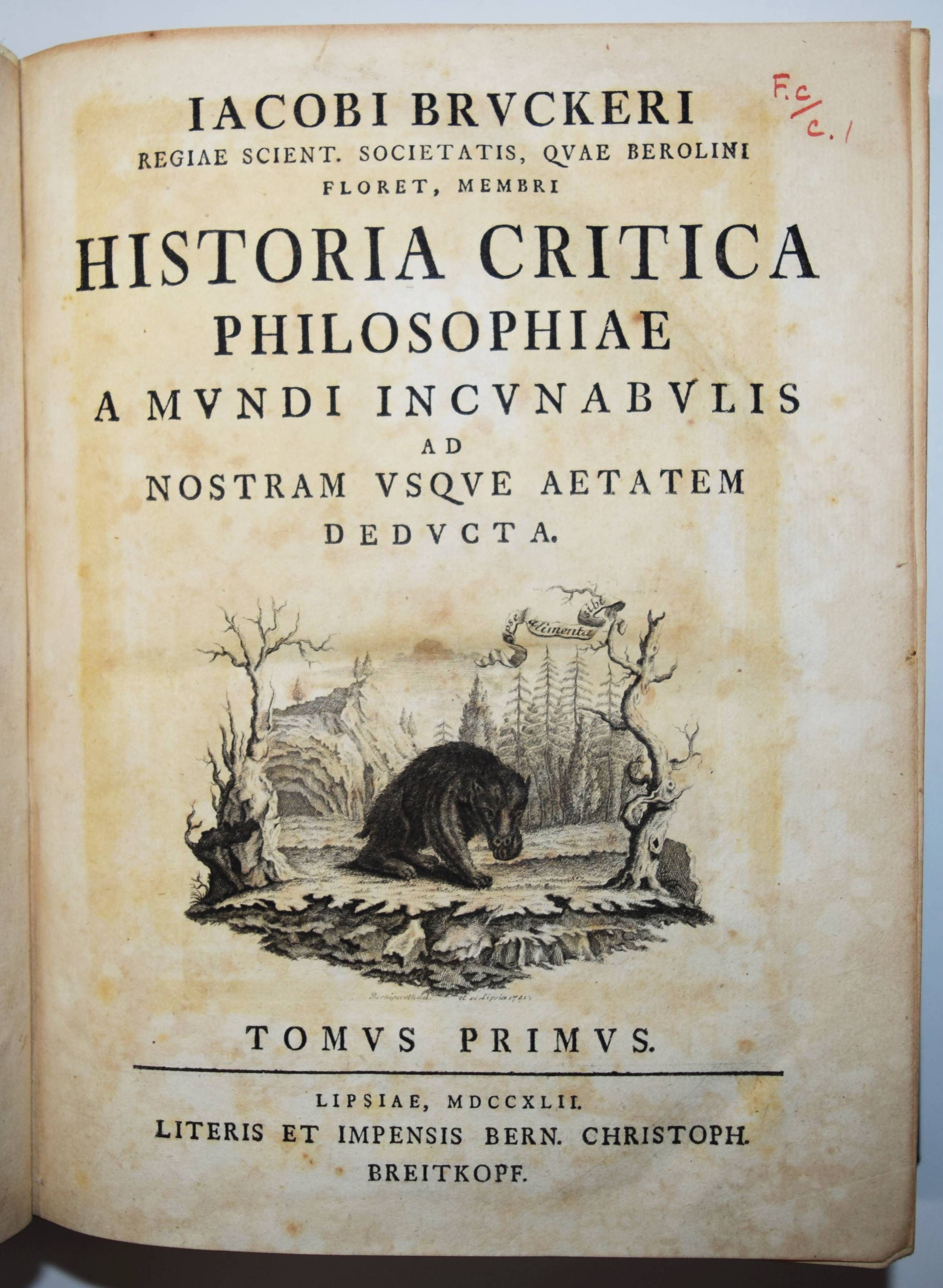 Brucker, (Johann) Jakob. Historia critica philosophiae. 4 in 5 Bänden. Leipzig, Bernhardf Christoph Breitkopf 1742-1744. Gr.-8° (24 x 18,5 cm.). [7] Bl., 1357, (35) S.; [4] Bl., 1092, (31) S.; [3] Bl., 916, (28) S.; [3] Bl., 789, (27) S.; [4] Bl., 939, (29) S. mit 5 gestoch. Titelvignetten, 1 gestoch. Portrait in Band I und 4 Kupfertafeln. Moderne Kalbslederbände mit goldgepr. Rückentitel und Rücken- und Deckelvergoldung. ADB III, 397. Brunet I, 1284. Graesse I, 550. NDB II, 647. VD18 80305083, 80305091, 90044789 u. 80305121. – Erste Ausgabe. 1757 erschien noch ein Nachtragsband bei Weidmann in Leipzig. Eine zweite Auflage erschien 1766-1767 in 6 Bänden. – I. A mundi incunabulis ad nostram usque aetatem deducta. – II. Ab initiis monarchiae romanae, ad repurgatas usque literas periodi secundae pars prima. – III. A Christo nato ad repurgatas usque literas. Periodi secundae pars altera. – IV, 1 und 2. Tempore resuscitatarum in occidente litteratum ad nostra tempora. – „Der eigentliche Begründer der Geschichte der Philosophie in der Neuzeit“ (G. F. v. Hertling in ADB). – J. J. Brucker (1696-1770) „studierte in Jena bei Johann Franz Buddeus Theologie und wurde von seinem Freund Carl Friedrich Buddeus zu seiner Geschichte der Philosophie angeregt. Als Lateinschuldirektor und Geistlicher in Kaufbeuren schrieb er das umfassende Werk, in dem Neuplatonismus und Scholastik abgelehnt, Sokrates, Aristoteles, Melanchthon und Buddeus hoch und die christliche Religion als die allervortrefflichste Philosophie gewertet werden, um dem Leser Gedanken der klügsten Menschen zu vermitteln, ihn zur Kritik und durch Tugendregeln zur Willensverbesserung zu leiten und so dem Reiche Gottes zu dienen. Wie als Gelehrter, so wirkte dieser erste deutsche Philosophiehistoriker auch als dem Pietismus nahestehender, toleranter Geistlicher und Jugenderzieher vorbildlich, seit 1744 bis zu seinem Tode in Augsburg“ (G. Kahl-Fuhrtmann in NDB). – Britisches Wappen-Exlibris von 1783 in allen Bänden, stellenweise etwas braunfleckig und mit Feuchtigkeitsspuren, sehr gutes dekorativ gebundenes Exemplar mit allen Kupfertafeln.