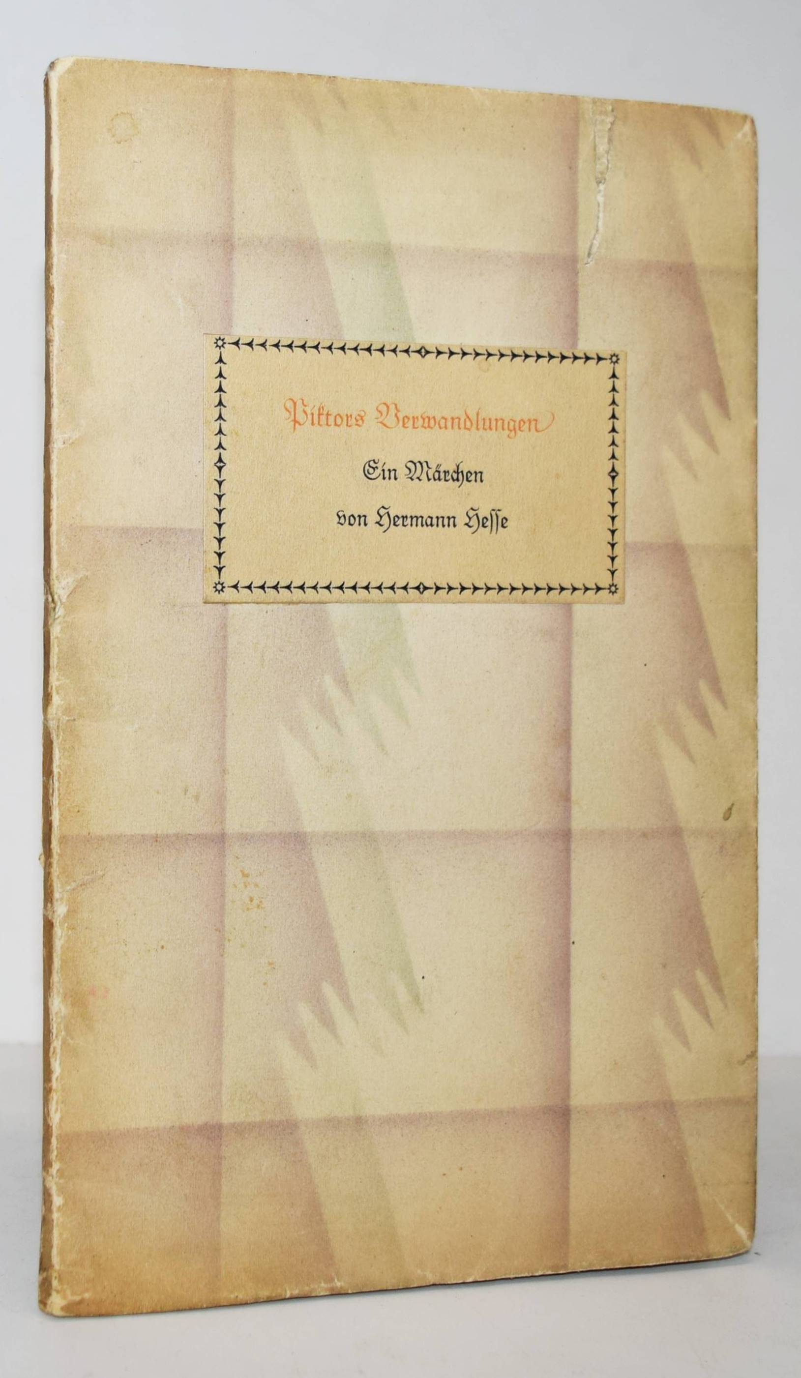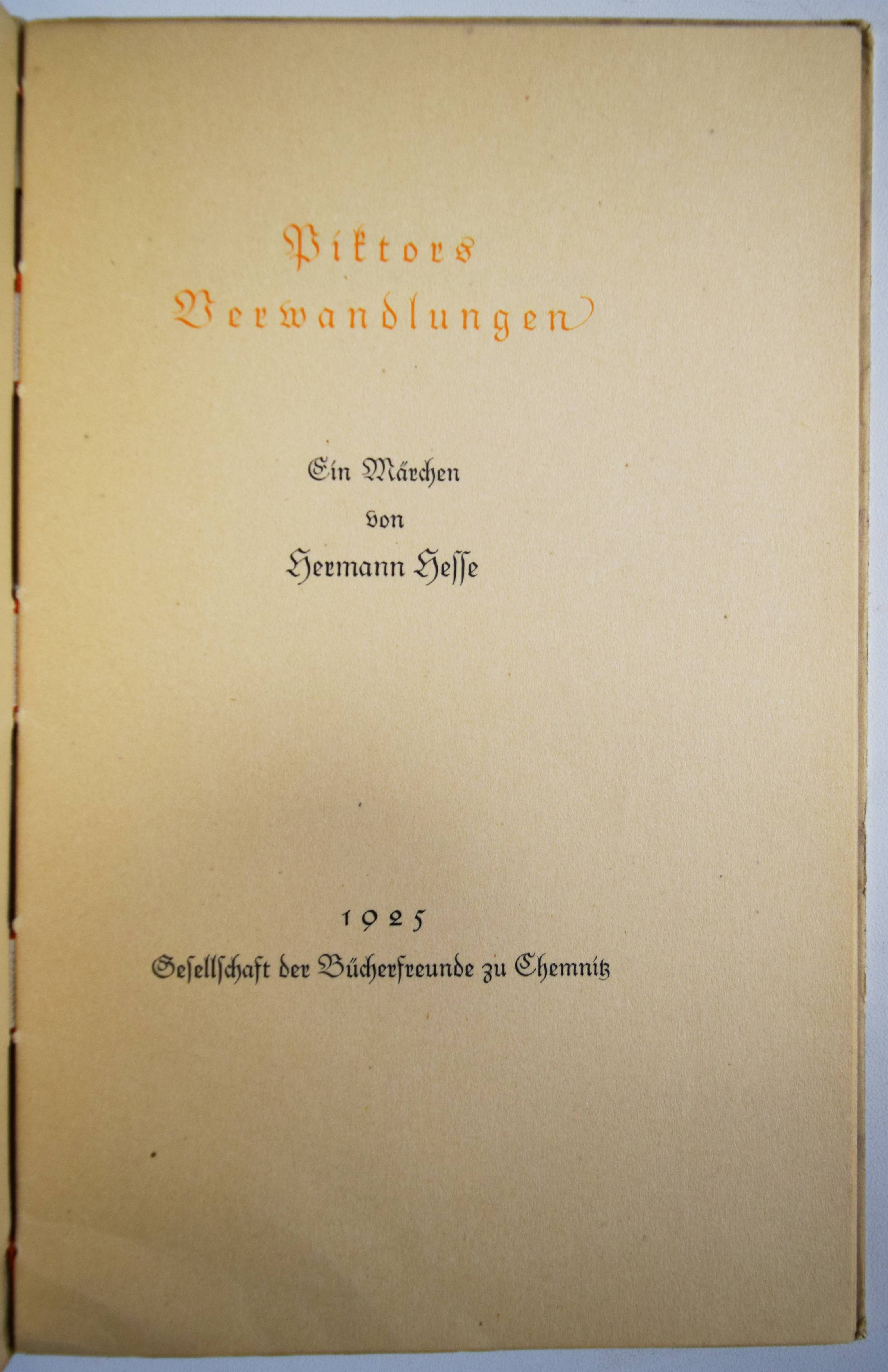 Hesse, Hermann. Piktors Verwandlungen. Ein Märchen. Chemnitz Gesellschaft der Bücherfreunde (1925). 8°. 16 S., [2] Bl Orig.-Kartonumschlag mit Deckelschild. (21. Veröffentlichung, achte der ordentlichen Veröffentlichungen und dritte Jahresgabe der Gesellschaft der Bücherfreunde zu Chemnitz). Deutsche Bibliophilie in drei Jahrzehnten S. 163. Mileck III, 20. Waibler E 151. W.-G.² 143. – Erste Ausgabe. Eines von 650 Exemplaren (Gesamtauflage) gedruckt in Orange und Schwarz in der Frühlingsschrift von Rudolf Koch. 1923 als bisher unveröffentlichtes Märchen angekündigt. – Diese erste gedruckte Ausgabe des in der Inflationszeit entstandenen Märchens, „eines der bezauberndsten Resultate seiner Auseinandersetzung mit diesem Genre” (Ziolkowski), enthält keine Bilder. – Rücken und Einriß am Vorderdeckel restauriert, das Blatt mit der Nummerierung ist hier nicht bedruckt, gutes Exemplar.