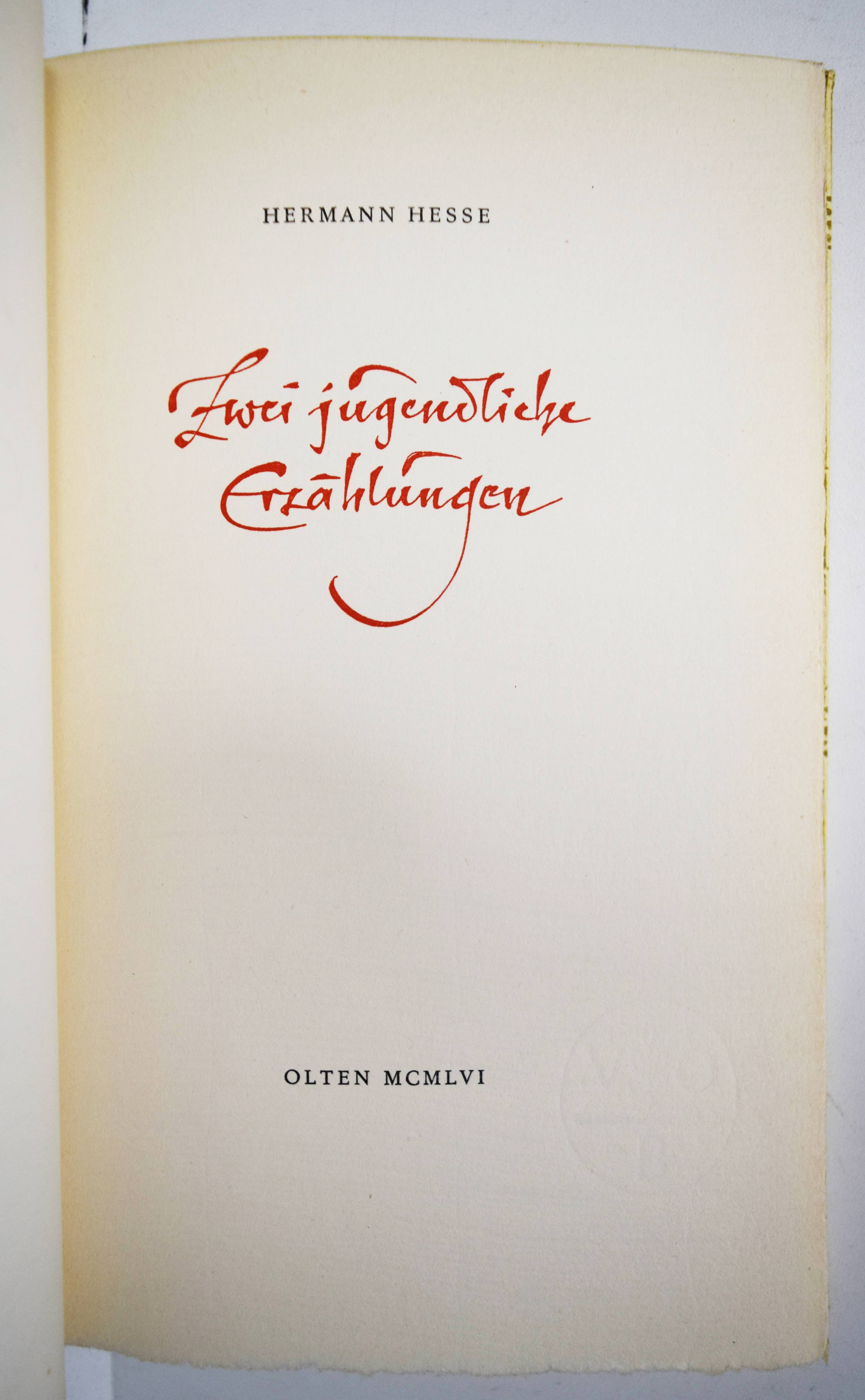 Hesse, Hermann. Zwei jugendliche Erzählungen. Olten, Vereinigung Oltner Bücherfreunde (1956). 8°. 56 S. Orig.-Pappband mit Überzugspapier in Batikmodelldruck von Emil Kretz, Basel. (Publikation der Vereinigung Oltner Bücherfreunde, Band 70). Mileck II, 121. Waibler E 54. W.-G.² 469. – Erste Ausgabe. – Eines von 574 num. Exemplaren (Gesamtauflage 750 Exemplare). – Sehr gutes Exemplar.