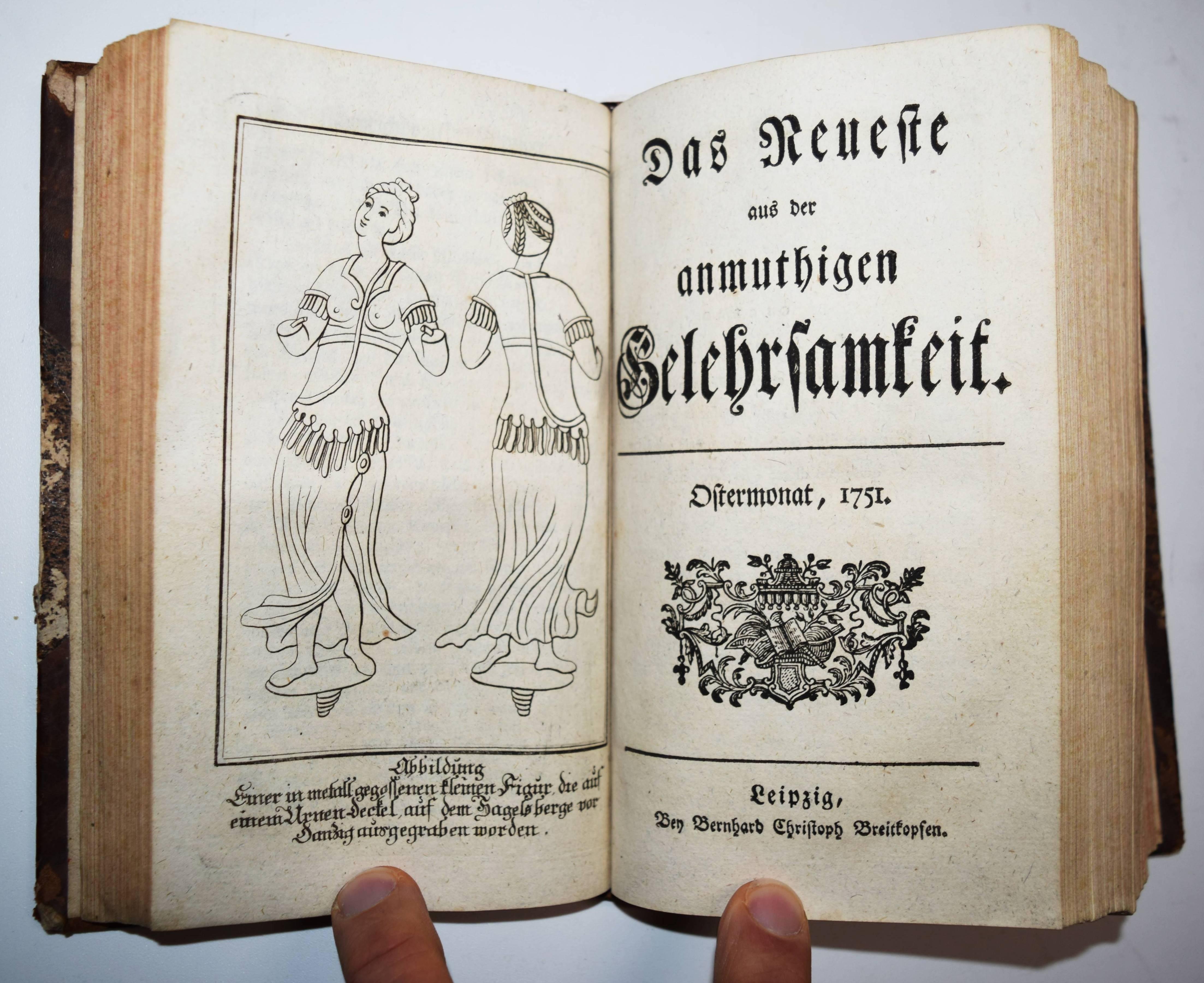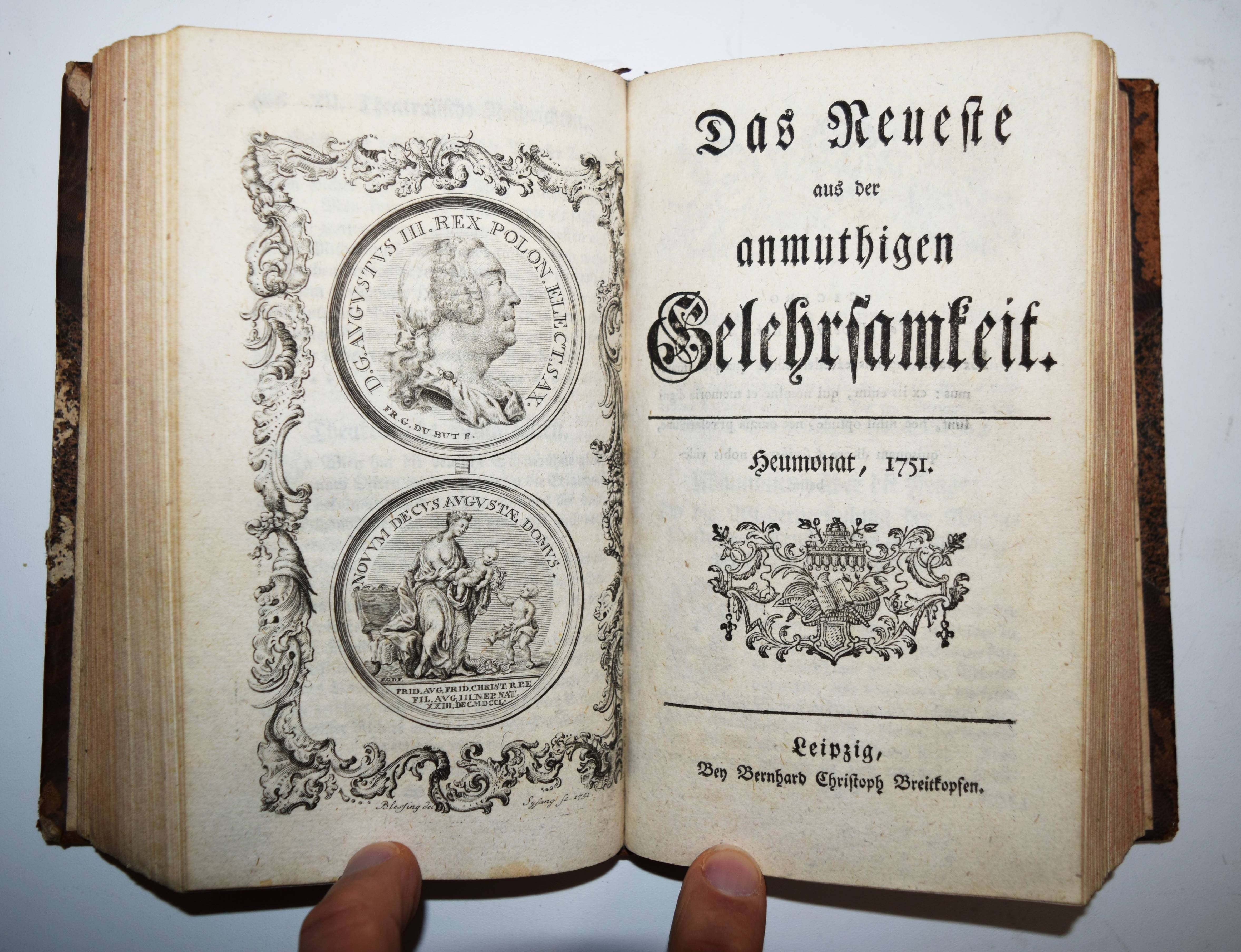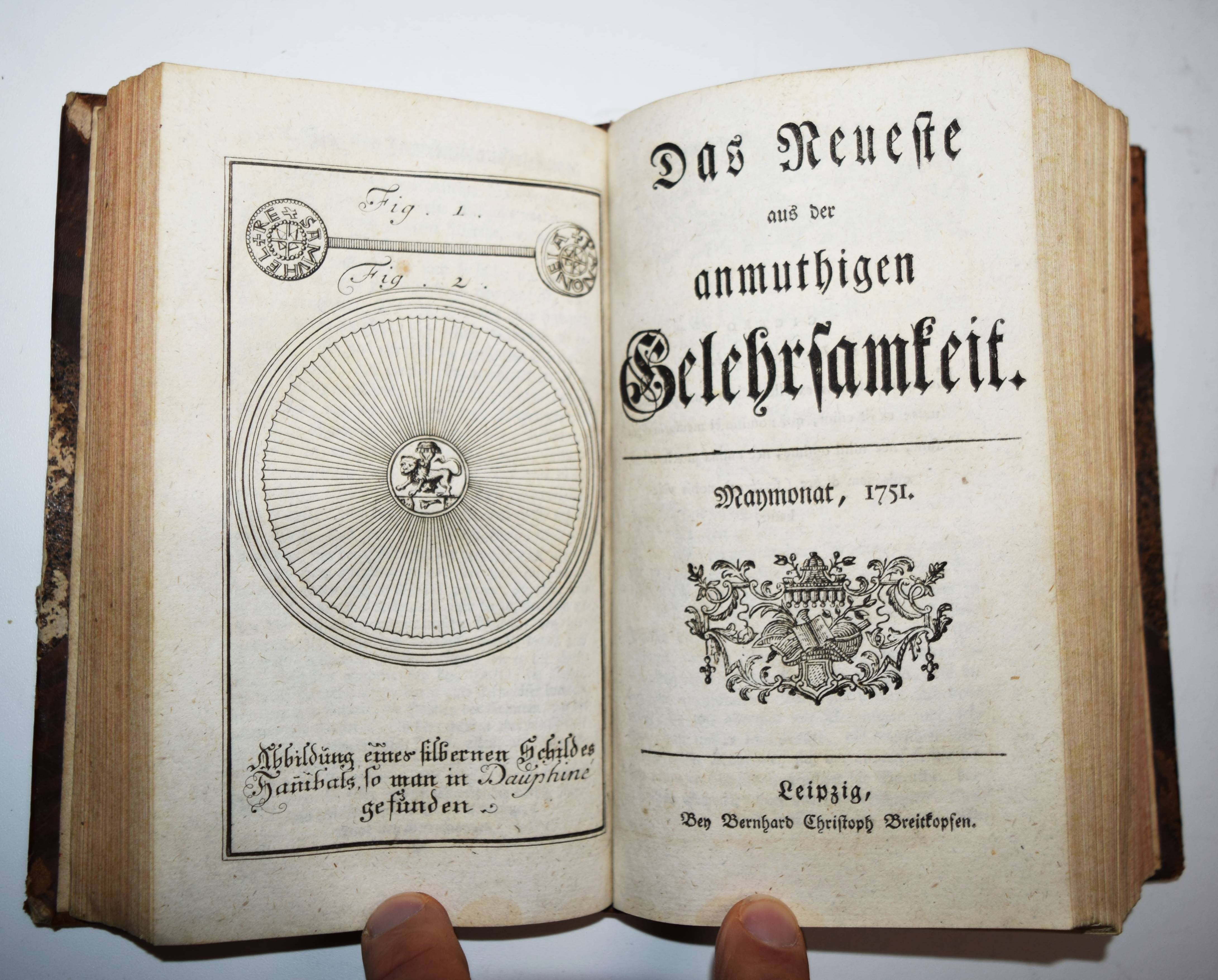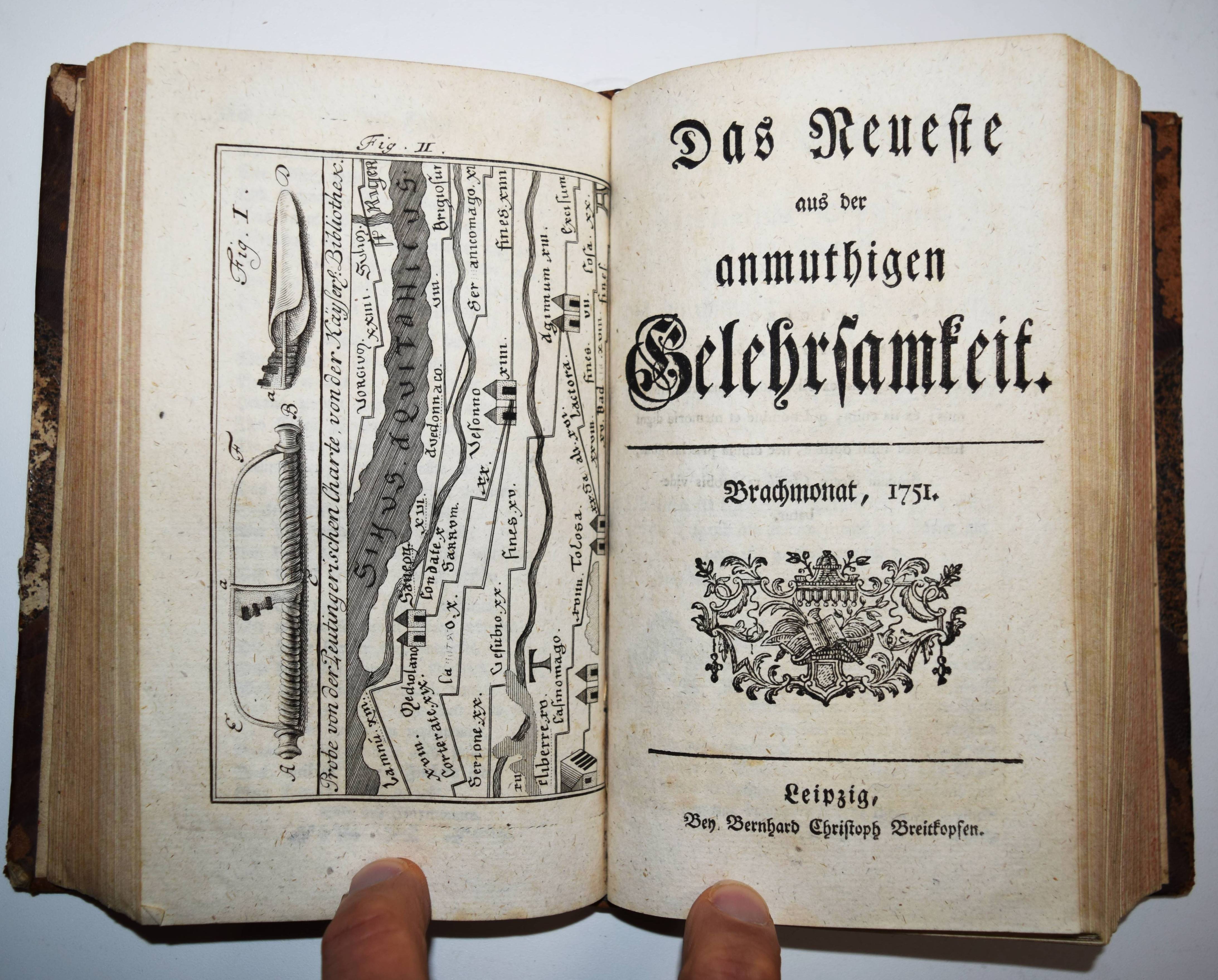(Gottsched, Johann Christoph). Das Neueste aus der Anmuthigen Gelehrsamkeit. Jänner 1751 (bis) Christmonat 1751. 12 Hefte in 1 Band. Leipzig, Bernhard Christoph Breitkopf 1751. 8°. 912 S., [8] Bl. mit 12 (1 gefalt., 1 doppelblattgr.) Kupfertafeln. Halblederband der Zeit. Diesch 630. Kirchner, Grundlagen 1030. Seebaß/Edelmann I, 332. – Vollständiger erster Jahrgang der kritischen Barock-Zeitschrift; herausgeben von J. G. Gottsched (1700-1766), der auch die meisten Artikel selbst verfasste. Die Zeitschrift erschien bis 1762. – „Die in der Mitte des 18. Jhdts. erschienenen literarischen Journale spiegeln die großen Spannungen und den sich vorbereitenden politischen und kulturellen Umbruch wieder. Die Auseinandersetzungen zwischen Gottsched und den Schweizern Bodmer und Breitinger auf dem Gebiete der dichterischen Ästhetik waren mehr als ein Professorenstreit, hier standen sich zwei Welten gegenüber, und eine neue Epoche kündigt sich an“ (Kirchner, Das deutsche Zeitungswesen S. 149). – Die Kupfertafeln zeigen „Ein Stück des abnehmenden Monds“, das „Leichengerüste des franz. Marschalls Graf Moritzens von Sachsen“, „Abbildung eines silbernen Schildes Hanibals, so man in Dauphiné gefunden“, Münzen und anderes. – Rücken und Deckel stellenweise mit Abriebstellen, sonst sehr gut erhalten.