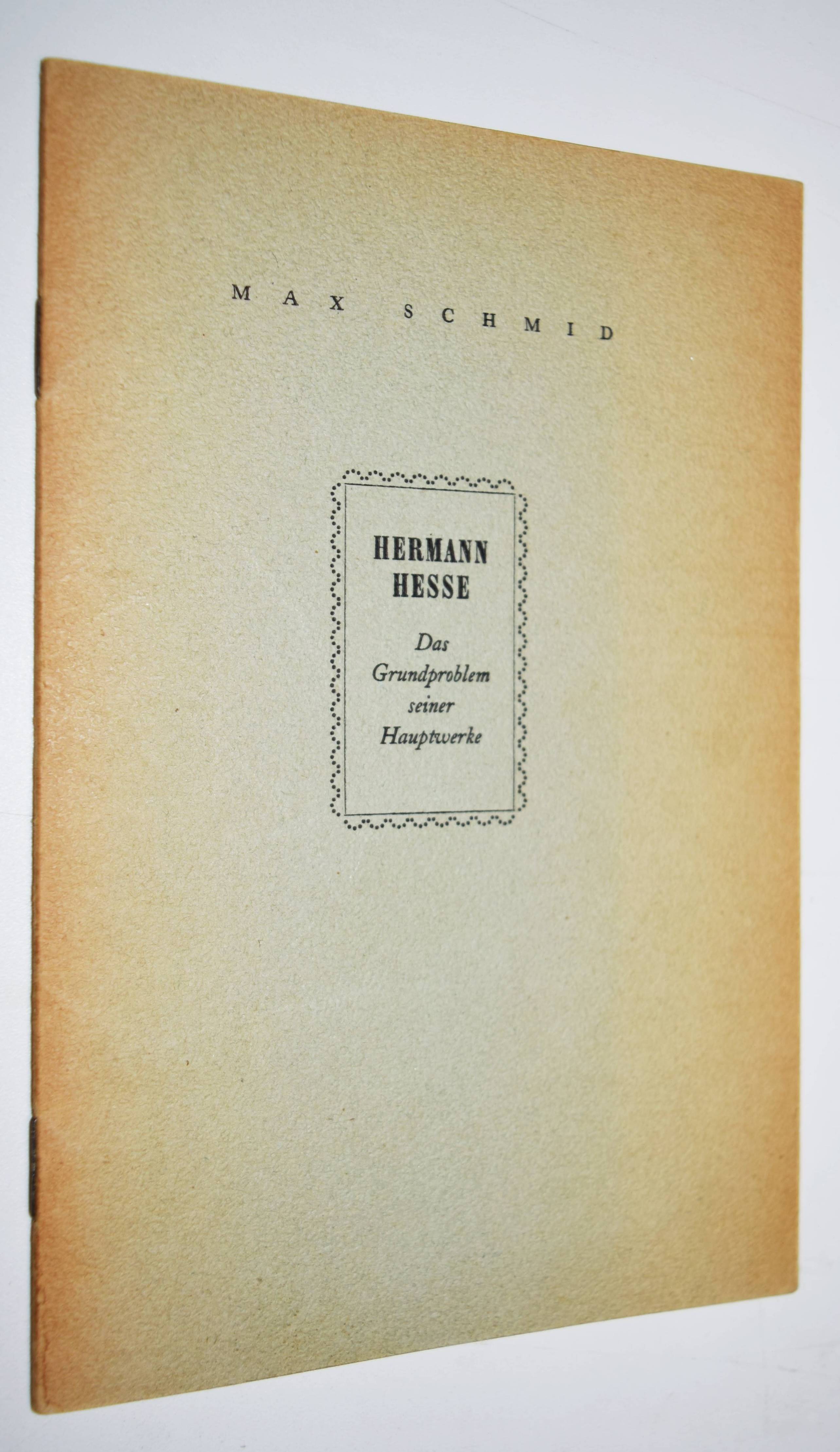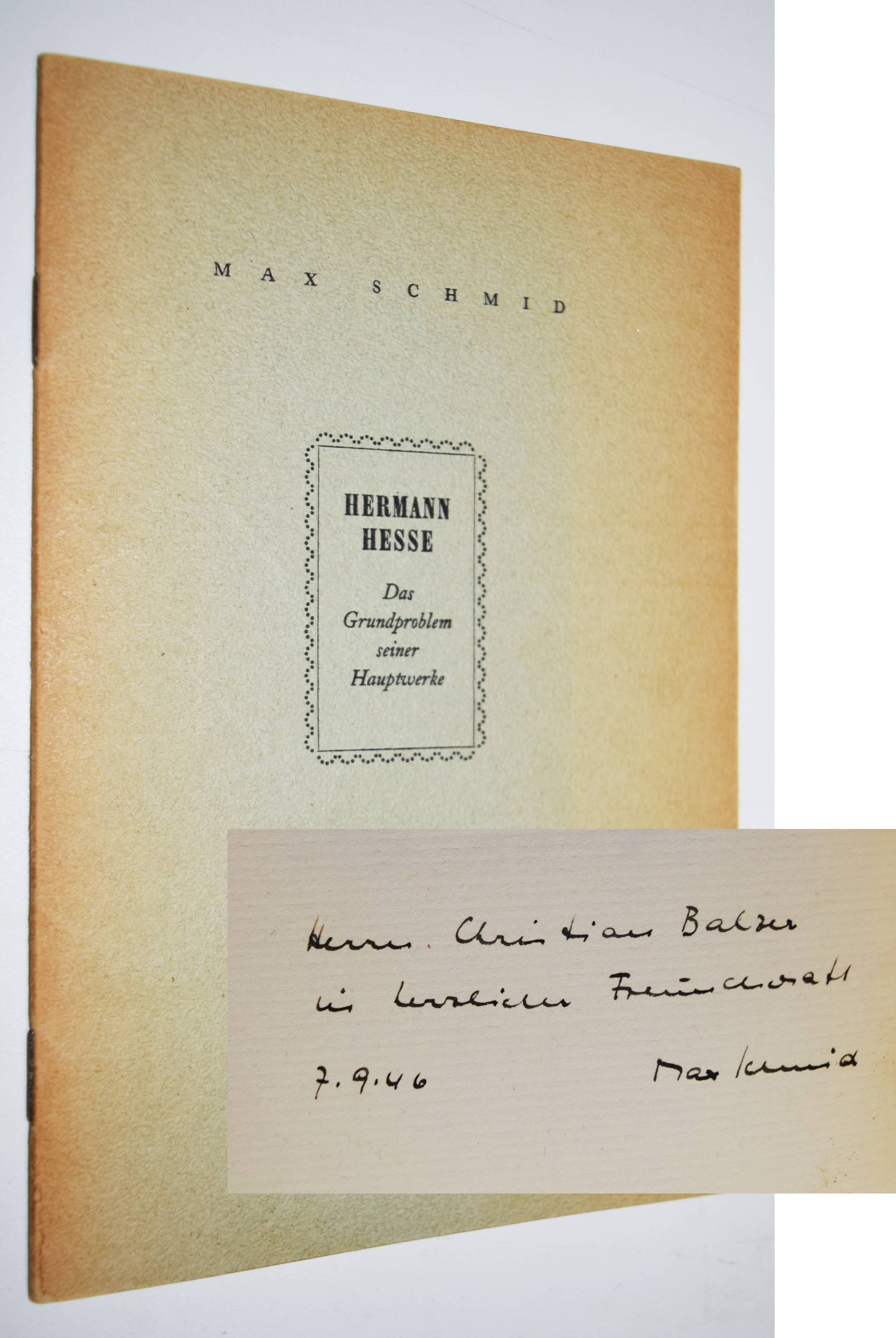 Hesse – Schmid, Max. Hermann Hesse. Das Grundproblem seiner Hauptwerke. (Zürich, Selbstverlag 1946). Kl.-8°. 15, (1) S. mit 1 Portrait. Orig.-Kartonumschlag. Mit eigenhändiger Widmung von Max Schmid. – Seltene Arbeit, die zuerst in der Neuen Züricher Zeitung (Nr. 1412) erschienen ist. – Altersbedingt etwas gebräunt.