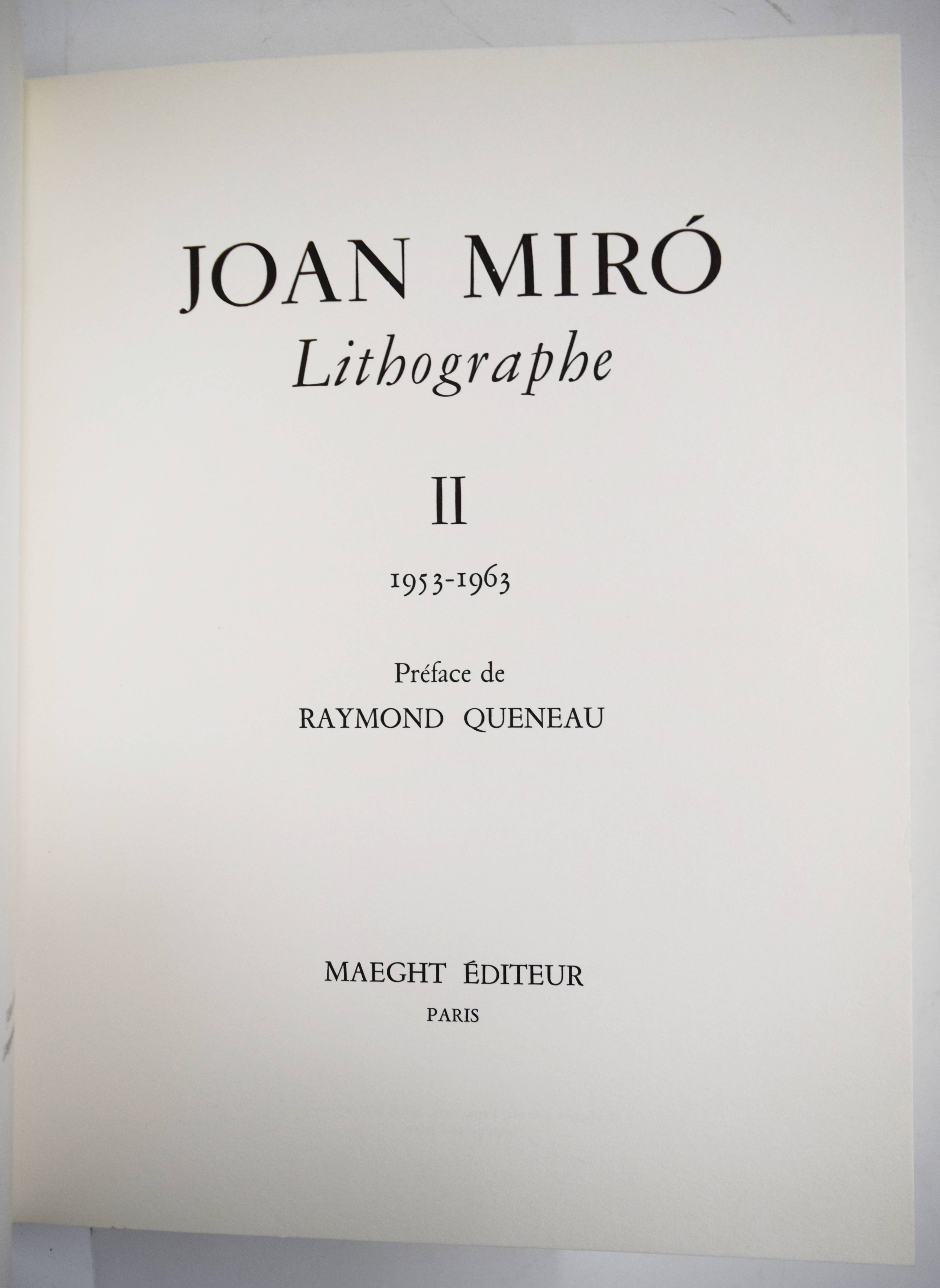 Miro – Queneau, Raymond (Préface). Joan Miró, Lithographe II 1953-1963. Paris, Maeght Éditeur (1975). 4°. 253, (1) S. mit 11 (5 doppelblattgr.) Orig.-Farblithographien und 321 farb. Abbildungen. Orig.-Leinenband. Ohne den Schutzumschlag mit der 12. Lithographie. – Gutes Exemplar.