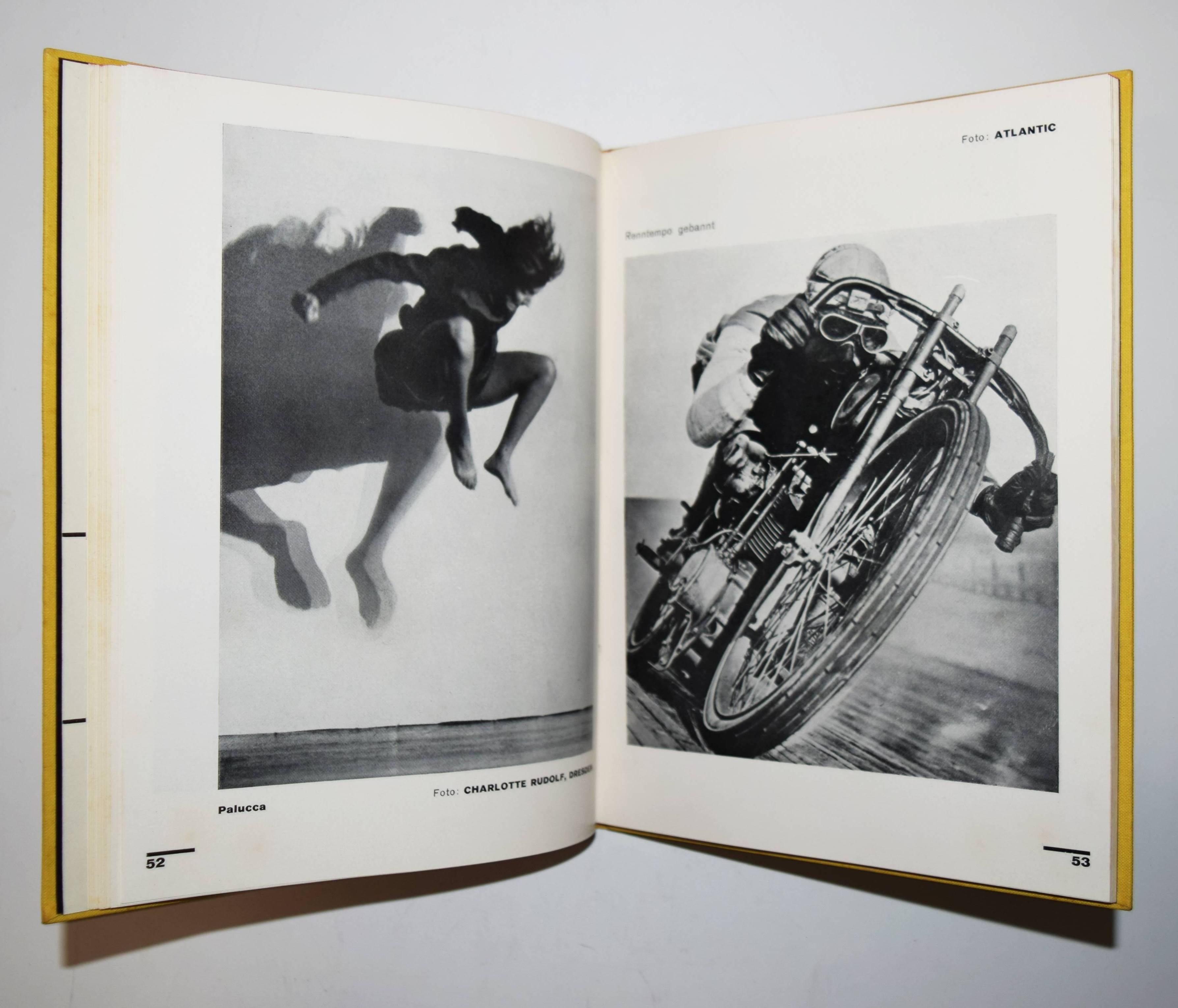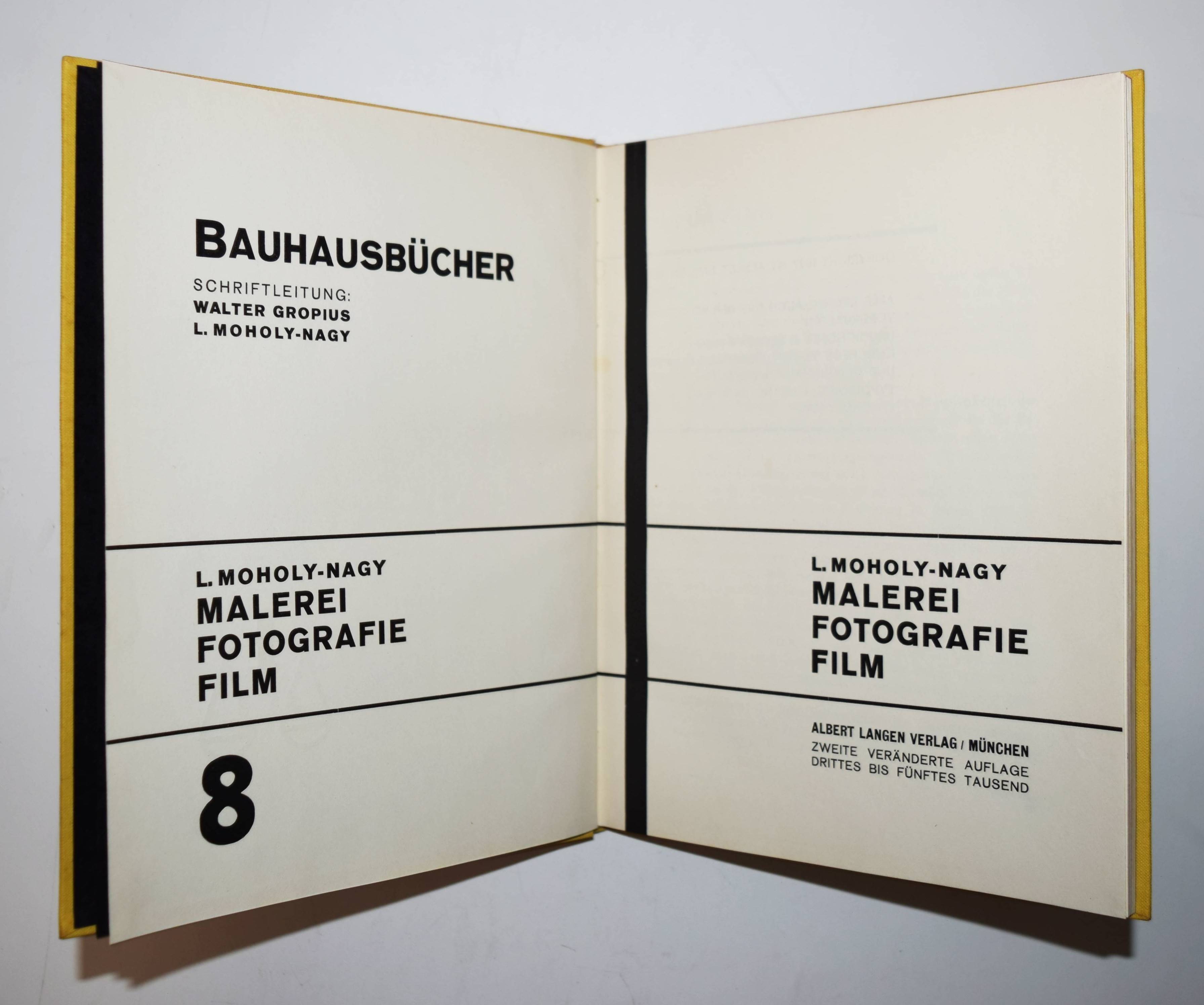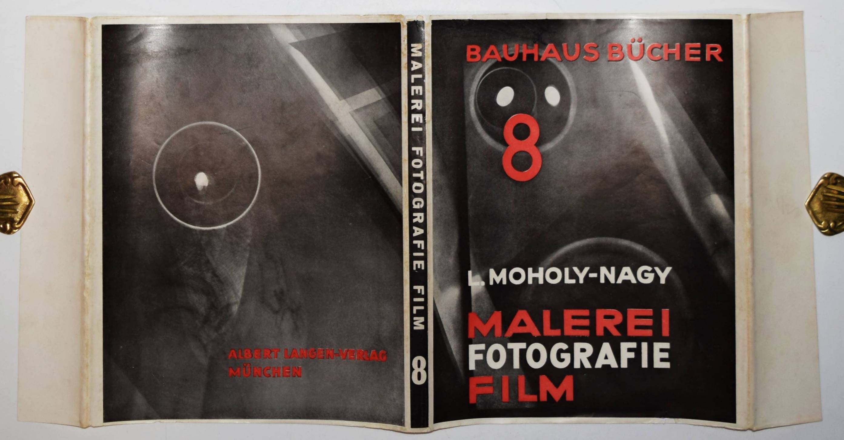 Moholy-Nagy, László. Malerei, Photographie, Film. 2. veränderte Auflage (3.-5. Tausend). München, Albert Langen (1927). Gr.-8°. 140 S. mit zahlr. Abbildungen nach Aufnahmen von A. Stieglitz, F. M. Duncan, C. Rudolf, A. Renger-Patzsch, L. Moholy-Nagy, Man Ray H. Höch u. a. Orig.-Leinenband mit illustr. Schutzumschlag. (Bauhausbücher, Band 8). Auer 121. Bolliger VI, 54. Fleischmann 22. Heidtmann 5011. Heiting/Jaeger I, 164-173 (ausf., mit mehreren Abb.). Koetzle 307 f. Parr/Badger I, 92/93. The Open Book 60 f. Roth, The Book of 101 Books 44 f. Wingler 575. – Bahnbrechendes Werk, in dem Moholy-Nagy erstmals 1925 die Themen Geschichte und Technik der Fotografie und besonders die moderne Bildgestaltung behandelt. Das Bildmaterial, darunter zahlreichen Fotogramme und Fotomontagen, stammt von Moholy-Nagy, Hannah Höch, Albert Renger-Patzsch, P. Citroen, Man Ray und anderen. Mit zahlreichen Anwendungsbeispielen aus Buchillustration, Werbung und Propaganda. – Das Werk ist „Kunstwerk und Pamphlet, Erfahrungsbericht und Vision. Das Buch propagiert die ‚neue visuelle Literatur‘ und ist gleichzeitig ihr erster Versuch … Moholys Entscheidung für die zweite Auflage ist verständlich, hatte er doch Text- und Bildteil gestrafft, neueste Fotos von ihm selbst eingefügt und Überholtes gestrichen. Sein Buch sollte aktuell sein … Der Aufwand für Bauhausbuch 8, dem dicksten und teuersten der 1. Serie, war erheblich … 1927, als es schon die Neuauflage gab, war die erste noch nicht einmal vergriffen“ (U. Brüning in Heiting/Jaeger). – „Moholy’s futurist enthusiasm for the fusion of art and technology and „the new culture of light,“ which would replace hand work (including painting) with eye and mind work (optics: photography and film) is still infectious, and the English translation of Malerei, Photographie, Film has never gone out of print. When Moholy-Nagy emigrated to the United States in 1937, he had tremendous influence on photographic education and practice in this country“ (A. Roth). – „Moholys Fotografie war … kein ‚Fach‘-Medium, sondern ein allgemeines Mittel des reformierten künstlerischen Ausdrucks. … Moholys künstlerisches Credo stellte auch die Fotografie absolut in den Rahmen seiner pädagogischen Absicht des ‚Neuen Sehens‘.“ (A. Haus in Koetzle). – Schutzumschlag am Vorderdeckel im oberen Rand unauffällig restauriert, sehr schönes sauberes Exemplar.