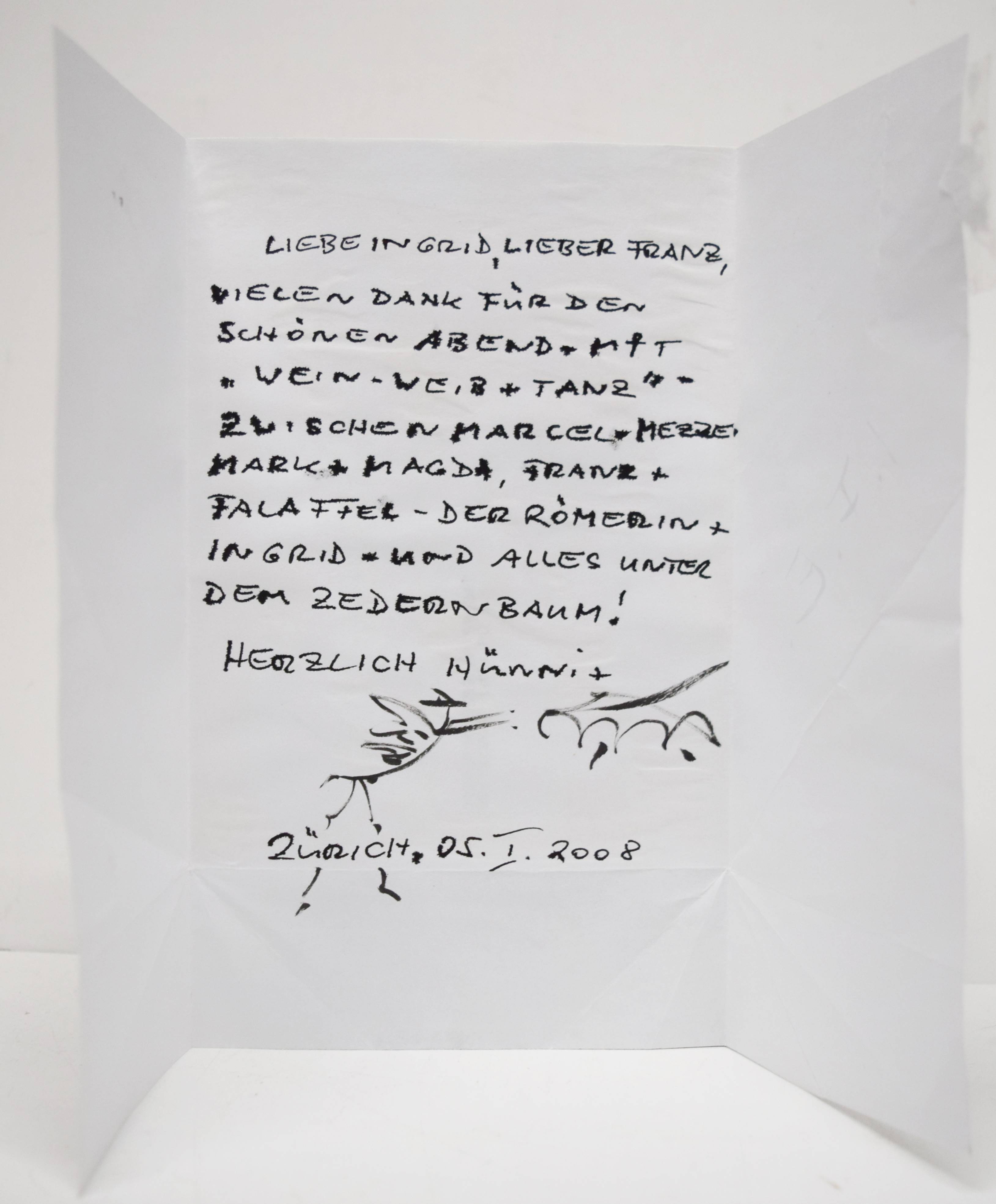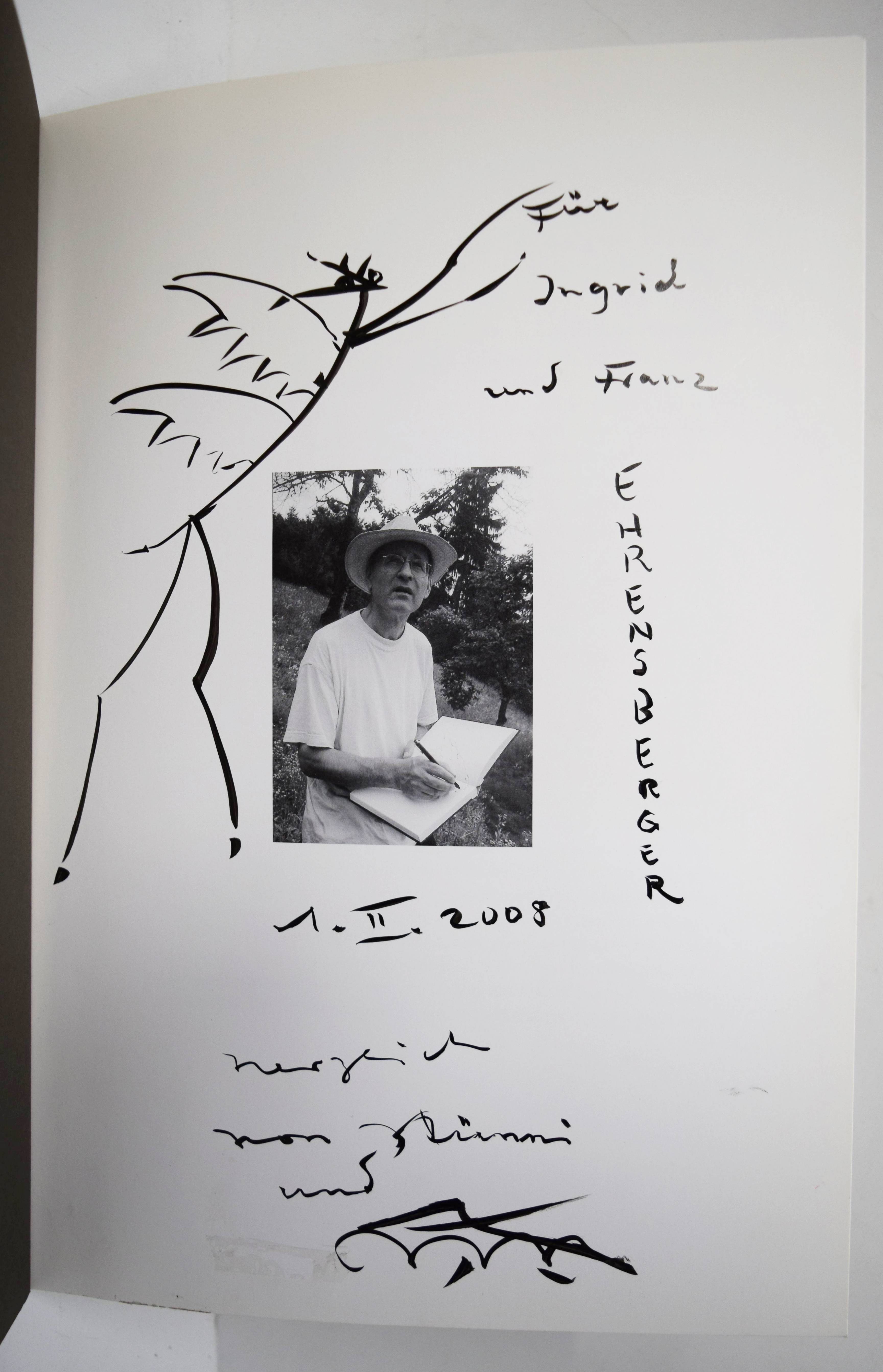 Naegeli, Harald. Vom Sprayen zur Utopie der Urwolke. [Katalog zur Ausstellung: 21. September bis 29. Oktober 2000]. Basel, Galerie Carzaniga + Ueker (2000). 4°. [16] Bl. mit Portrait und 21 Abbildungen. Illustr. Orig.-Kartonumschlag. Mit eigenhändiger Zeichnung und Widmung, sowie eigenhändigem Brief mit kleiner Zeichnung und Farbfotografie (Graffiti) von H. Naegeli für die Züricher Galleristen Ingrd und Franz Ehrenberger, dat. 1. Februar 2008. – „Wenn Sie Ihren Ohren trauen, werden Sie sich plötzlich ganz leicht fühlen. Sie können über dem Boden schweben und sich mit grosser Leichtigkeit in alle Himmelsrichtungen wenden. Es wird Ihnen gelingen, im Ballongefährt Ihrer Imagination hinaufzugleiten und die Stadt unter sich verschwinden zu hören. Im Silberflüstern der hohen Luftschichten treffen Sie auf den Murmelstrom Ihres Innenohres und Sie werden auf weiten Atembögen von Raum- und Zeitwellen dahinfahren. Nun sind Sie in Resonanz mit dem inneren Aggregatszustand der Urwolkenbilder von Harald Naegeli. Verweilen Sie solange es Ihnen beliebt! Ein Jahr in der Urwolke entspricht einem kostbaren Augenblick Ihres Alltags!» (Andres Bosshard, 2021). – Der Züricher Zeichner und Grafiker Harald Naegeli (geb. 1939) gilt als einer der wichtigsten Wegbereiter europäischer Graffiti- und Streetart-Kultur.