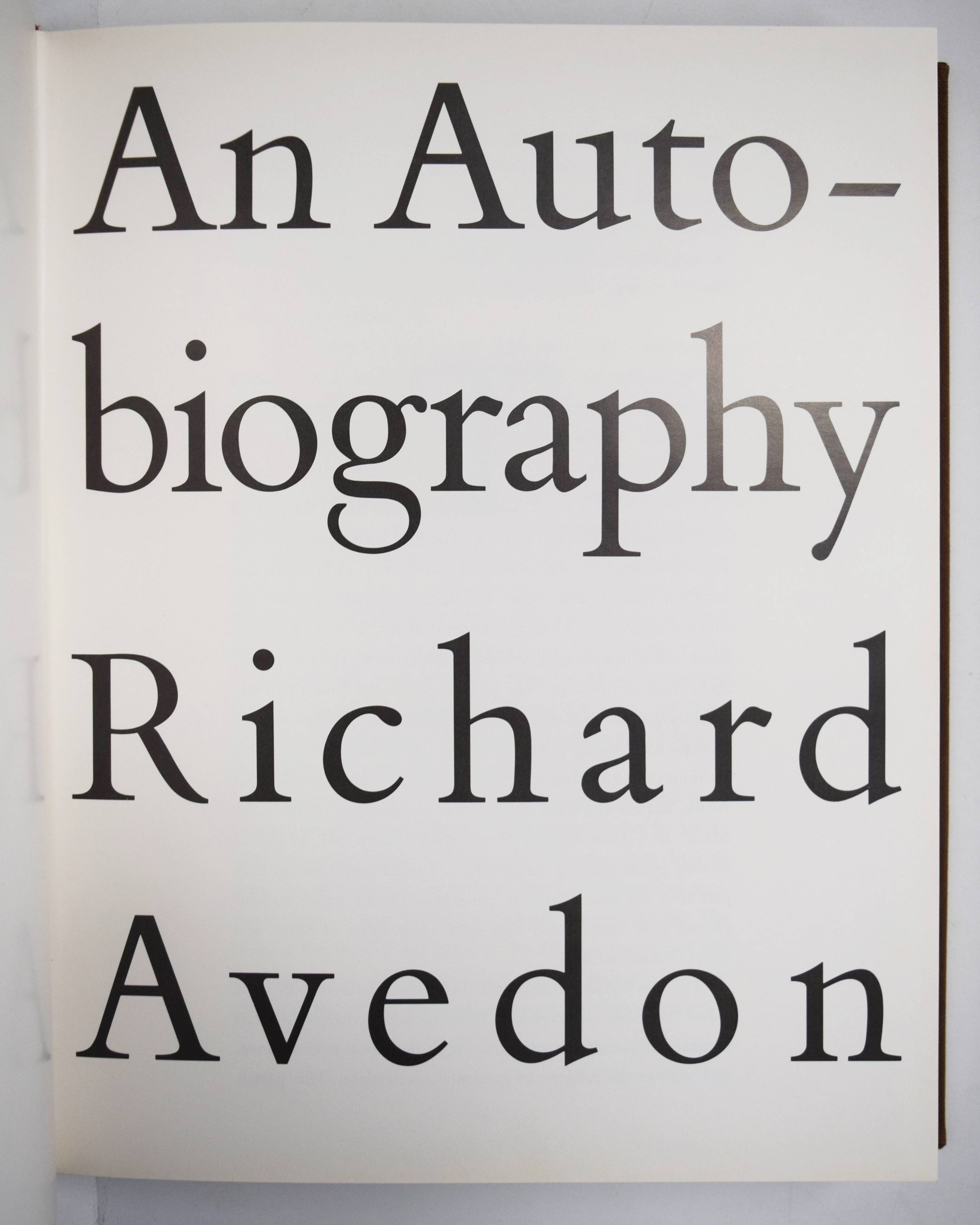 Avedon, Richard. An autobiography. (Bookdesign: Mary Shanahan). New York, Random House (1993). Folio (36,5 x 29 cm.). [432] S. mit 284 teils doppelblattgr. Duotone-Tafeln. Brauner Orig.-Leinenband mit rotem Rücken- und Deckeltitel und Portrait auf dem Rückendeckel. Koetzle, Fotografen A-Z 18 f. – Erste Ausgabe der wichtigen Monographie. – Mit eigenhändiger Widmung von R. Avedon für den berühmten französisch-schweizerischen Regisseur und Drehbuch-Autor Jean-Luc Godard (1930-2022), „For Jean-Luc Godard ‚Jesus, the days that we have seen. Come, Come …‘ Justice Shallow Henry IV, from Richard Avedon 1993“. – „Photographie, das ist die Wahrheit. Und der Film ist die Wahrheit 24 Mal in der Sekunde“ (J.-L. Godard aus Der kleine Soldat, Le petit soldat 1960). – „Während eines Großteils seines Lebens hat Richard Avedon in unterschiedlichen Genres der amerikanischen Fotografie den Ton angegegeben, sie aber gleichzeitig auch provoziert und ihre Grenzen ausgelotet. Als Porträt-, Mode- und Werbefotograf hat Avedon eine Reihe fotografischer Stile praktisch erfunden“ (Jane Livingston in Koetzle). – Tadellos.