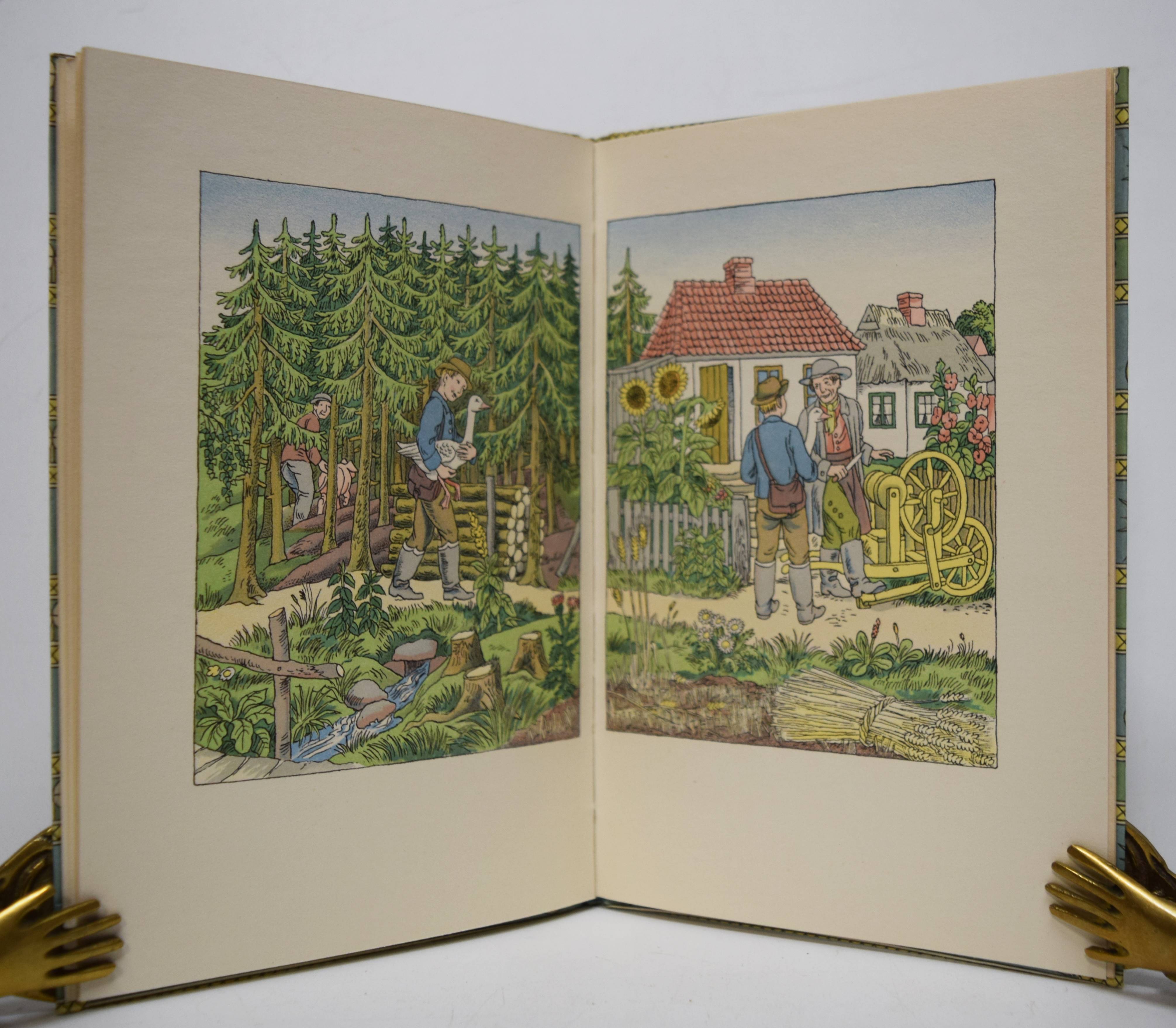 Grimm, (Jacob und Wilhelm). Hans im Glück. Märchen. Leipzig, Insel-Verlag o. J. (1938). 8°. [22] Bl. mit farbig illustr. Titel und 18 Farbtafeln von Wili Harwerth. Farbig illustr. Orig.-Pappband mit Rücken- und Deckelschild. (Insel-Bücherei Nr. 530). Jenne 530 (1A),1. Klotz, Bilderbücher 2081/16. – Erste Ausgabe. – Text geschrieben von Martin Hermersdorf in der Offenbacher Schulschrift von Rudolf Koch. – Sehr gutes sauberes Exemplar.