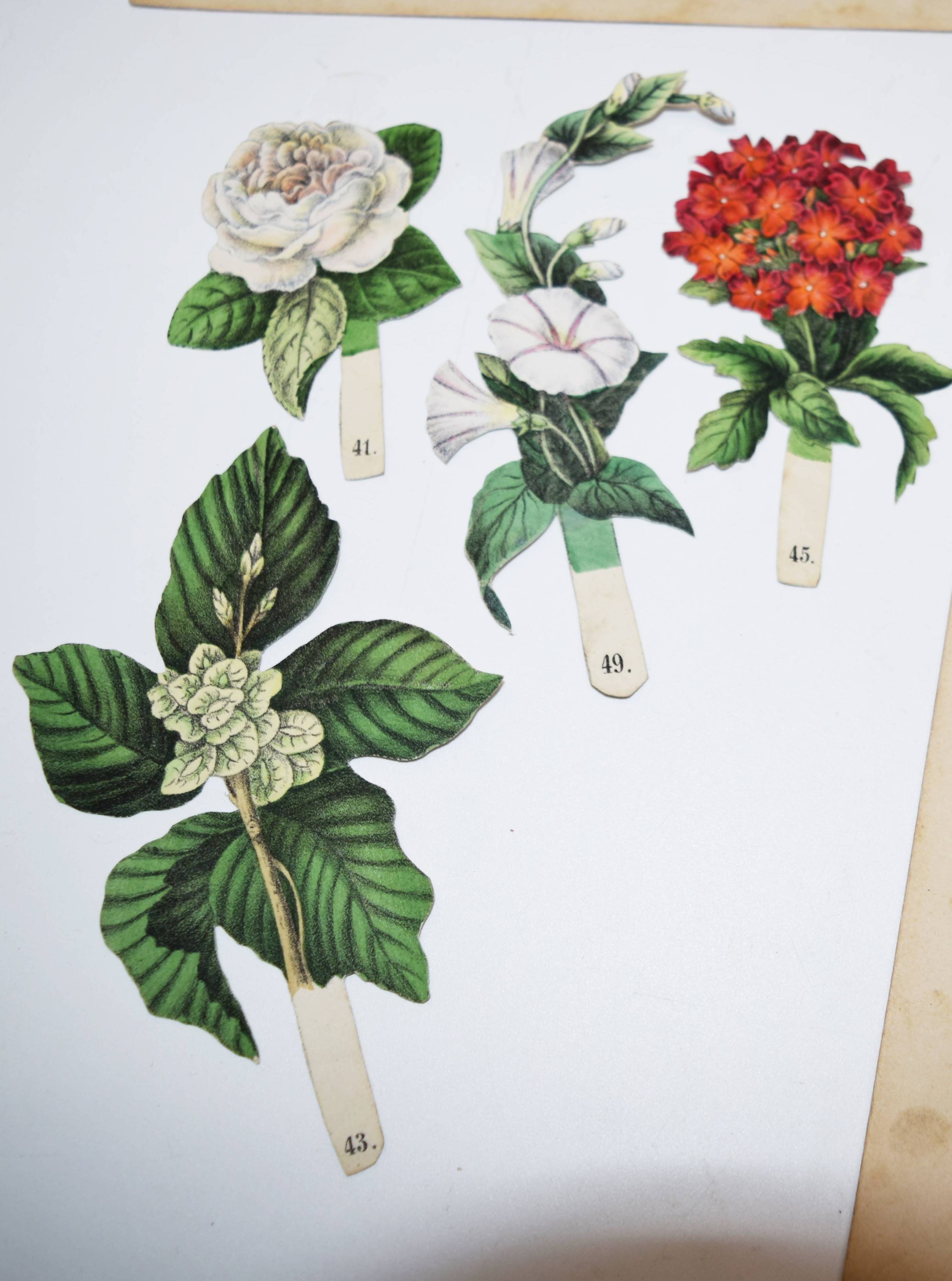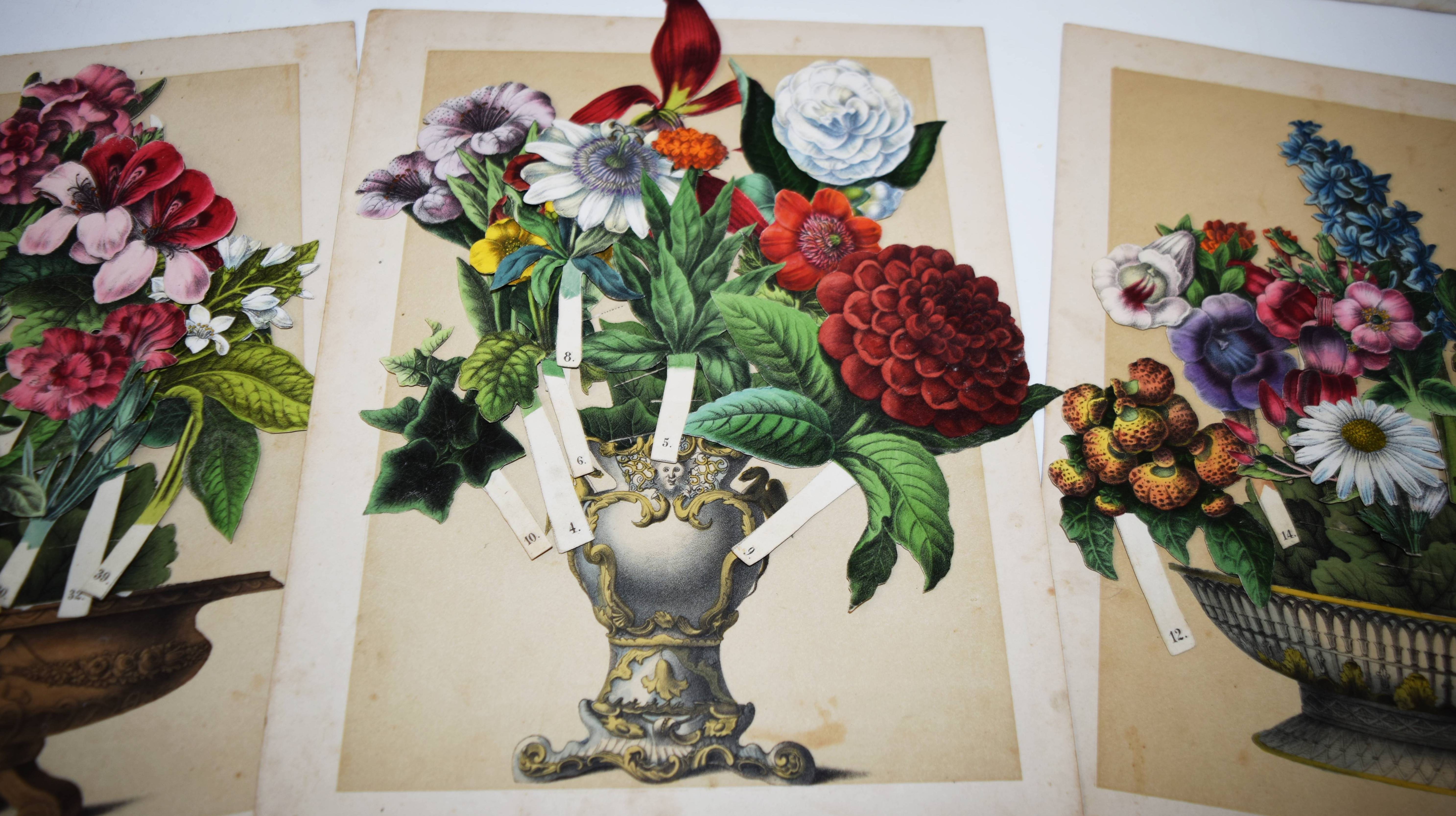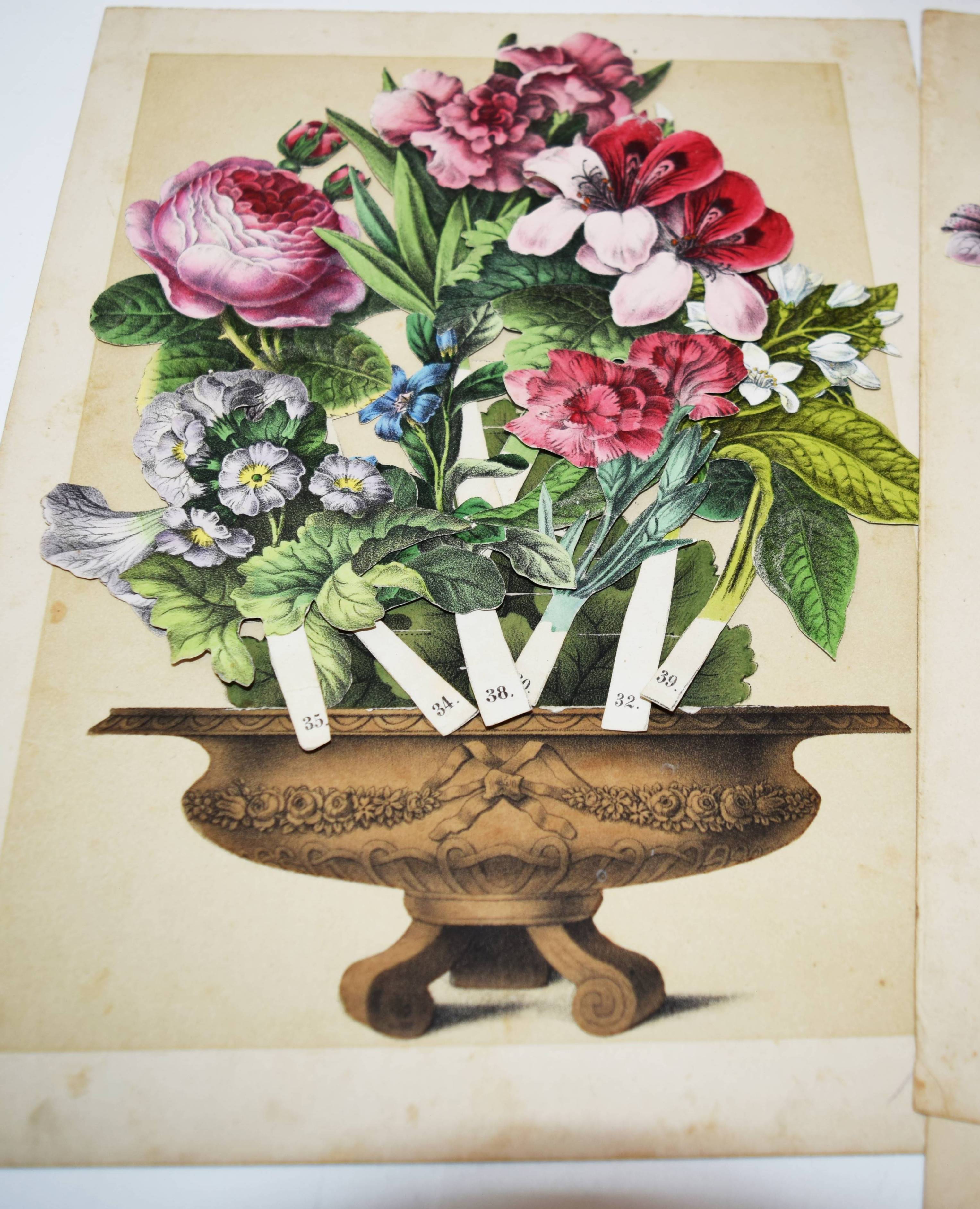 Geissler, P(eter) C(arl), (Hrsg.). Das Reich der Blumenkönigin. L’empire de la reine des fleurs. The Realm of the Queen of Flowers. Sinnige Unterhaltung durch Zusammenstellung der schönsten Zierpflanzen zu Bouquets und Kränzen in tausendfacher Veränderung. Nürnberg, P(eter) C(arl) Geissler o. J. (1860). Gr.-4° (34 x 26,5 cm.). 8 S. (Textheft), 4 farblithogr. Einsteck-Tafeln und 50 farblithogr. Einsteck-Blumen von Peter Carl Geissler. Orig.-Halbleinen-Flügelmappe mit farblithogr. Deckelbild. Hobrecker, Braunschweig 6168 (4. Aufl., um 1880). Osborne Collection I, 420. Nicht bei LKJ IV, 215, Rammensee und Wegehaupt I-IV. – Erste Ausgabe. – Seltenes Spiel-Bilderbuch mit Text in Französisch, Deutsch und Englisch. Bis zur Jahrhundertwende erschienen mindestens 9 Auflagen bei verschiedenen Verlagen, von denen jedoch nur noch wenige Exemplare in gutem Zustand und vollständig mit allen Elementen und dem Text erhalten geblieben sind. – „Die einzelnen Blumen werden auf einen der 4 Cartons in die darin angebrachten Einschnitte gesteckt, und dadurch die anmutigsten Kränze und Bouquets geformt, entweder durch freie Wahl der Blumen, oder je nach der Jahreszeit, in welcher sie blühen, oder nach dem Sinn ihrer Bedeutung. Zu letzerem Zweck dient das im Text dem Namen jeder Blume beigesetzte Motto…“ (aus der Spielanleitung). – Der Nürnberger Aquarellmaler, Zeichner, Illustrator und Verleger P. C. Geissler (1802-1872) hat zahlreiche Kinderbücher ausgestattet. – Flügelmappe, Textheft und die Einstecktafeln angestaubt und fingerfleckig, bei zwei Blumen fehlt der Stil, sonst gut erhalten und vollständig mit allen Teilen.