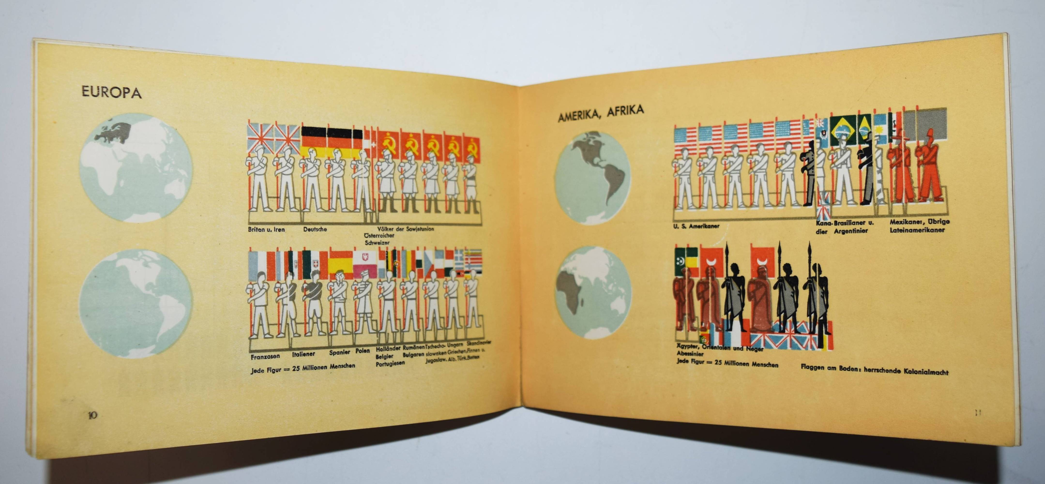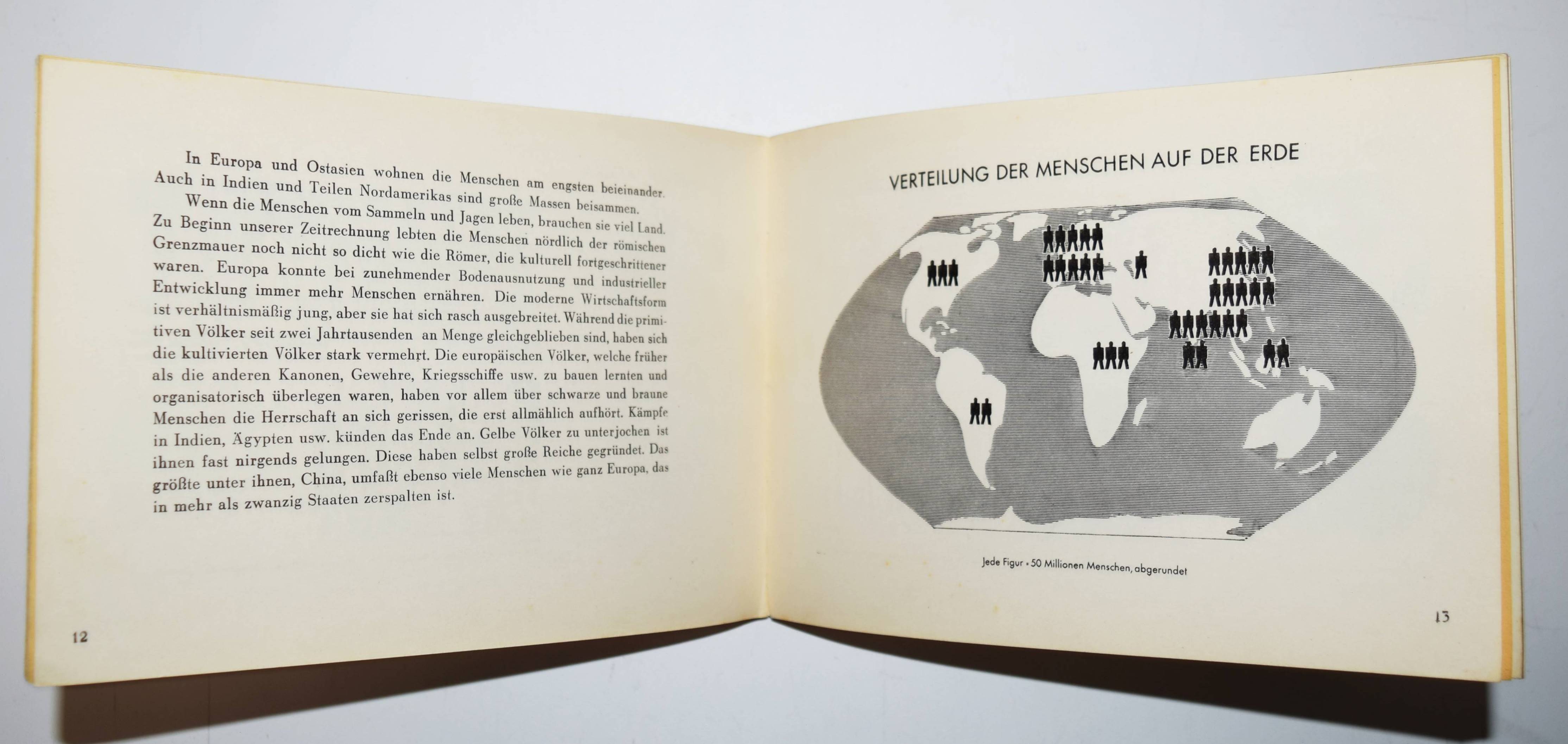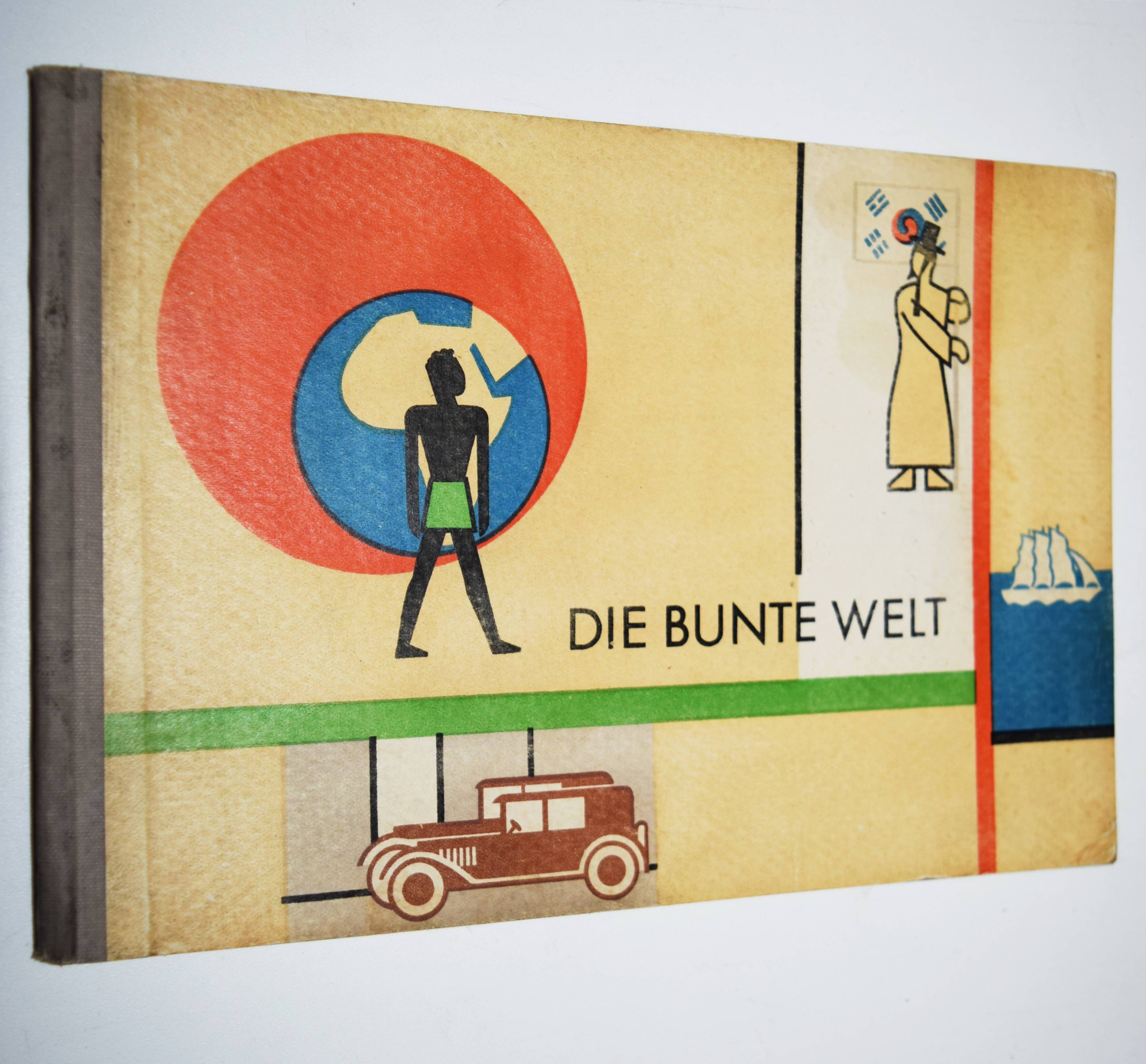 (Neurath, Otto, Hrsg.). Die bunte Welt. Mengenbilder für die Jugend. Wien, Arthur Wolf (1929). quer-8“. 47, (1) S. mit 36 (15 farbigen) Tafeln von Gerd Arntz. Farbig illustr. Orig.-Halbleinenband. (Veröffentlichungen des Gesellschafts- und Wirtschaftsmuseums, Wien). Bilderwelt 556. LKJ II, 151. Heller 1165. Neurath-Bibliothek 181 B. – Erste und einzige Ausgabe. – „Das seit 1924 in Wien bestehende Gesellschafts- und Wirtschaftsmuseum (begründet durch Otto Neurath) gilt heute als Pionierleistung sozialpädagogischer (und damit eminent politischer) Museumsarbeit. Seit 1926 wurden Kontakte zu dem jungen Graphiker Gerd Arntz aufgenommnen, der schließlich von 1929 bis 1934 als ‚grafischer Leiter‘ des Museums wirkte. Die von Neurath und Arntz entwickelte ‚Wiener Methode‘ der bildlichen Darstellung statistischer Fakten war schulbildend, aus ihr hat sich später die Methode der ISOTYPE (International System of Typographic Education) entwickelt“ (F. C. Heller in Bilderwelt). – „Die bunte Welt war der erste Versuch, das neue Verfahren in einem Jugendbuch vorzustellen. Der Text und vor allem die Tafeln vermitteln einen gezielten und umfassend wirkenden Einblick in demographische, wirtschaftliche und soziale Verhältnisse auf der Erde, aber auch in politische und historische Tatbestände. So werden u. a. gezeigt: Pflanzenregionen der Erde, die Staaten der Welt, Bodennutzung, Automobilbestand, Regierungsformen, Gewerkschaften, Reallöhne, Reiche und Arme, Säuglingssterblichkeit, Altersaufbau, aber auch: Die Kämpfenden des Weltkrieg 1914-18, Schicksal der Soldaten 1914–18. – Mit solchen Themenbehandlungen, die sich aller patriotischen, glorifizierenden, historisch konservativen Tendenzen enthalten und die quasi „nüchternen Zahlen“ sprechen lassen, stellt sich das Buch bewusst abseits der in den späten 1920er-Jahren immer noch und schon wieder manifestierenden Kriegs-Ideologien und bürgerlich-konservativen „Weltdarstellungen“ in Kinderbüchern und Schulliteratur. Damit zählt dieses Bilderbuch zu jenen wenigen Veröffentlichungen, die damals in Österreich den Typus eines modernen „Sachbuchs“; repräsentieren: Bücher, die tatsächlich und ohne scheinhafte „pädagogische Rücksicht“ die „Sachen“ und die „Sachlichkeit“ mitteilen und nicht eine heile „Welt für die Kinder“, fern von aller problemreichen Realität, vortäuschen. Gleichzeitig aber steht es auch in der jahrhundertealten Tradition der „Bildpädagogik“, die es auf eine moderne (nämlich die geänderten Bild-Erfahrungen der technischen Welt berücksichtigenden) Weise transformiert“ (F. C. Heller). – Deckel geringfügig angestaubt, sehr schönes sauberes Exemplar.