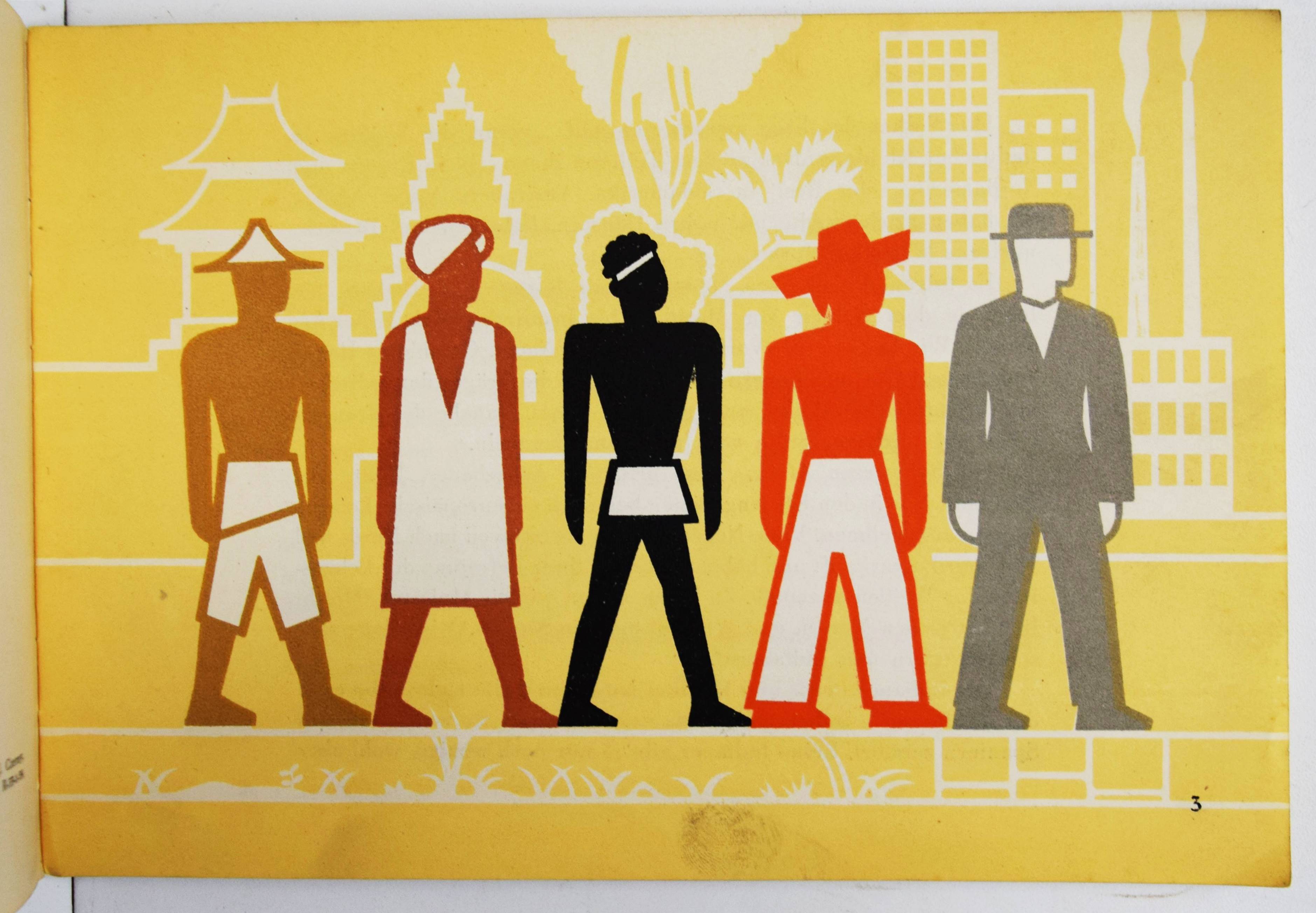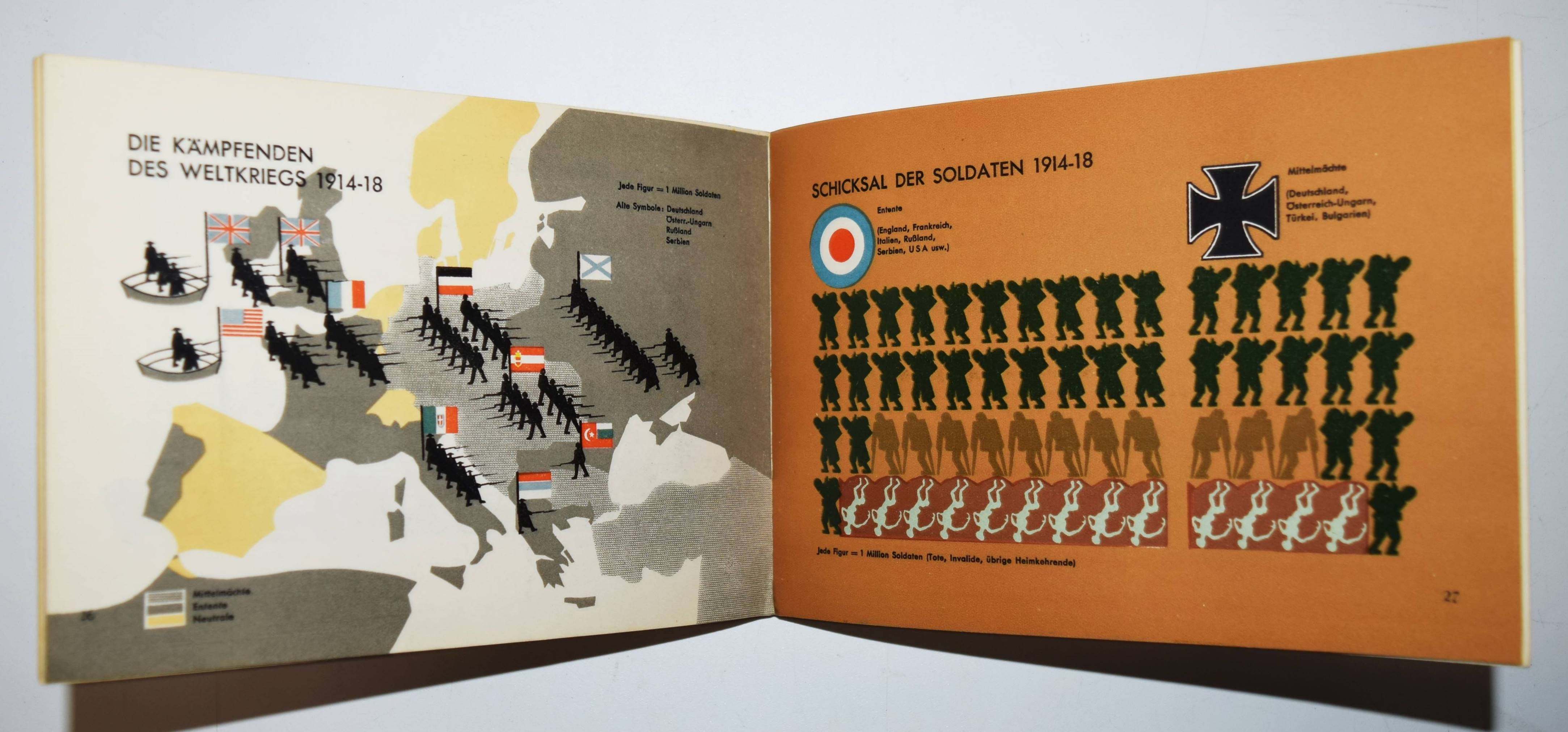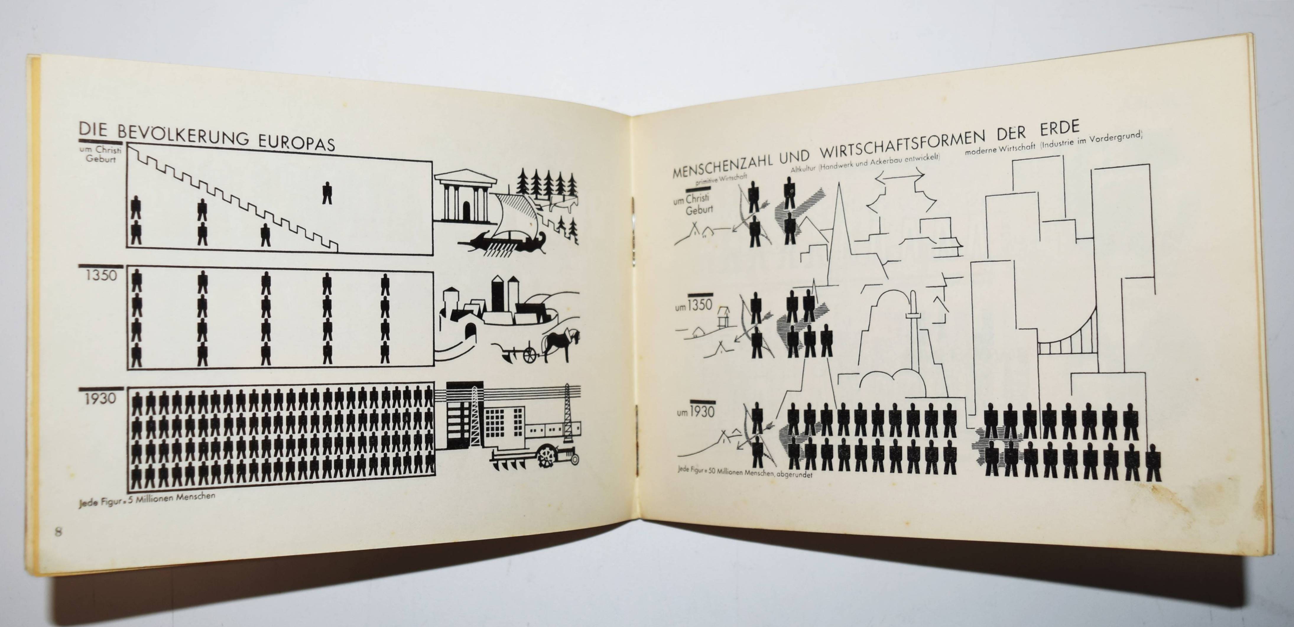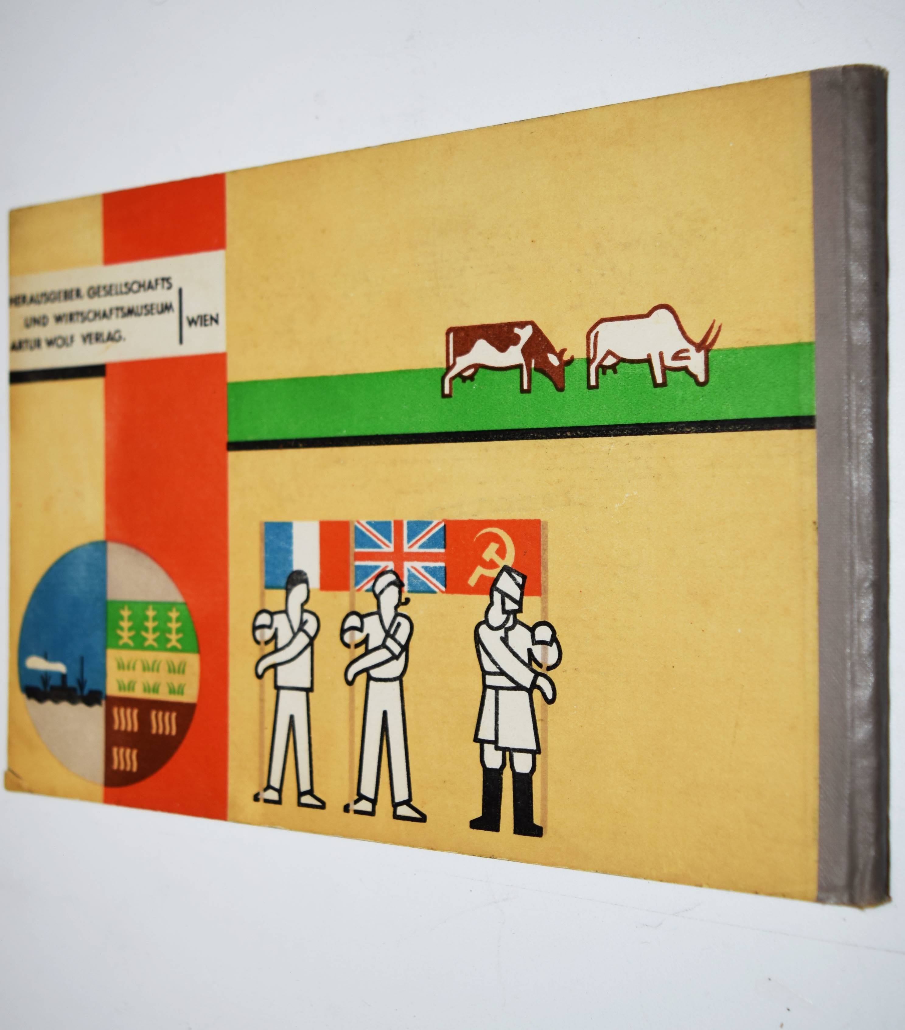 (Neurath, Otto, Hrsg.). Die bunte Welt. Mengenbilder für die Jugend. Wien, Arthur Wolf (1929). quer-8“. 47, (1) S. mit 36 (15 farbigen) Tafeln von Gerd Arntz. Farbig illustr. Orig.-Halbleinenband. (Veröffentlichungen des Gesellschafts- und Wirtschaftsmuseums, Wien). Bilderwelt 556. LKJ II, 151. Heller 1165. Neurath-Bibliothek 181 B. – Erste und einzige Ausgabe. – „Das seit 1924 in Wien bestehende Gesellschafts- und Wirtschaftsmuseum (begründet durch Otto Neurath) gilt heute als Pionierleistung sozialpädagogischer (und damit eminent politischer) Museumsarbeit. Seit 1926 wurden Kontakte zu dem jungen Graphiker Gerd Arntz aufgenommnen, der schließlich von 1929 bis 1934 als ‚grafischer Leiter‘ des Museums wirkte. Die von Neurath und Arntz entwickelte ‚Wiener Methode‘ der bildlichen Darstellung statistischer Fakten war schulbildend, aus ihr hat sich später die Methode der ISOTYPE (International System of Typographic Education) entwickelt“ (F. C. Heller in Bilderwelt). – „Die bunte Welt war der erste Versuch, das neue Verfahren in einem Jugendbuch vorzustellen. Der Text und vor allem die Tafeln vermitteln einen gezielten und umfassend wirkenden Einblick in demographische, wirtschaftliche und soziale Verhältnisse auf der Erde, aber auch in politische und historische Tatbestände. So werden u. a. gezeigt: Pflanzenregionen der Erde, die Staaten der Welt, Bodennutzung, Automobilbestand, Regierungsformen, Gewerkschaften, Reallöhne, Reiche und Arme, Säuglingssterblichkeit, Altersaufbau, aber auch: Die Kämpfenden des Weltkrieg 1914-18, Schicksal der Soldaten 1914–18. – Mit solchen Themenbehandlungen, die sich aller patriotischen, glorifizierenden, historisch konservativen Tendenzen enthalten und die quasi „nüchternen Zahlen“ sprechen lassen, stellt sich das Buch bewusst abseits der in den späten 1920er-Jahren immer noch und schon wieder manifestierenden Kriegs-Ideologien und bürgerlich-konservativen „Weltdarstellungen“ in Kinderbüchern und Schulliteratur. Damit zählt dieses Bilderbuch zu jenen wenigen Veröffentlichungen, die damals in Österreich den Typus eines modernen „Sachbuchs“; repräsentieren: Bücher, die tatsächlich und ohne scheinhafte „pädagogische Rücksicht“ die „Sachen“ und die „Sachlichkeit“ mitteilen und nicht eine heile „Welt für die Kinder“, fern von aller problemreichen Realität, vortäuschen. Gleichzeitig aber steht es auch in der jahrhundertealten Tradition der „Bildpädagogik“, die es auf eine moderne (nämlich die geänderten Bild-Erfahrungen der technischen Welt berücksichtigenden) Weise transformiert“ (F. C. Heller). – Deckel geringfügig angestaubt, sehr schönes sauberes Exemplar.