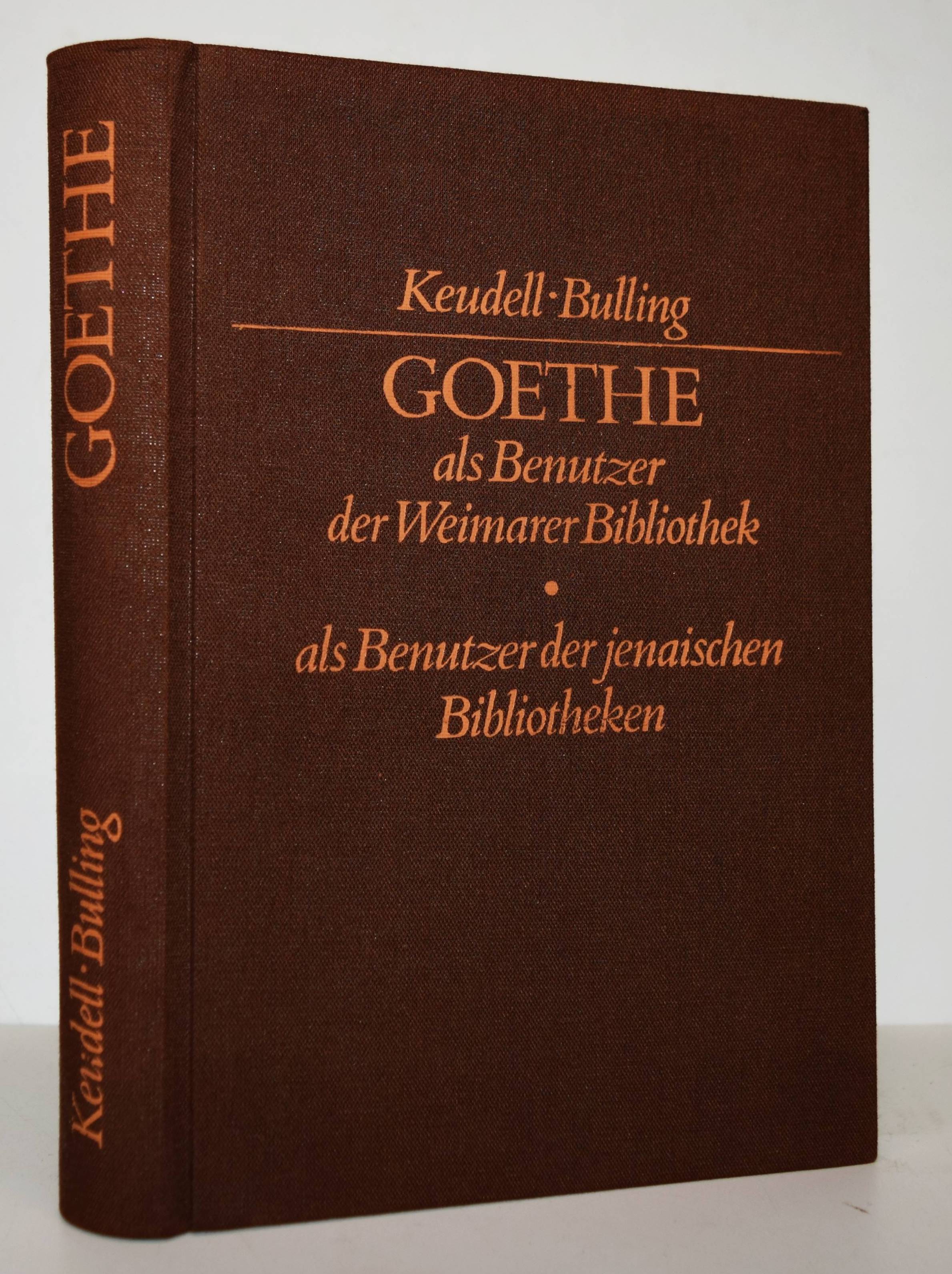 Goethe – Keudell, Elise von. Goethe als Benutzer der Weimarer Bibliothek. (Und): Bulling, Karl. Goethe als Erneurer und Benutzer der Jenaischen Bibliotheken. (Reprint der Orig.-Ausgaben, Weimar, Böhlau 1931 und 1932). 2 Werke in 1 Band. Leipzig, Zentralantiquariat der Deutschen Demokratischen Republik 1982. 8°. XIII, 391 S.; 67 S. mit 14 Faksimile-Abbildungen. Orig.-Leinenband. Stzempel auf dem Vorsatz, sehr gutes Exemplar.