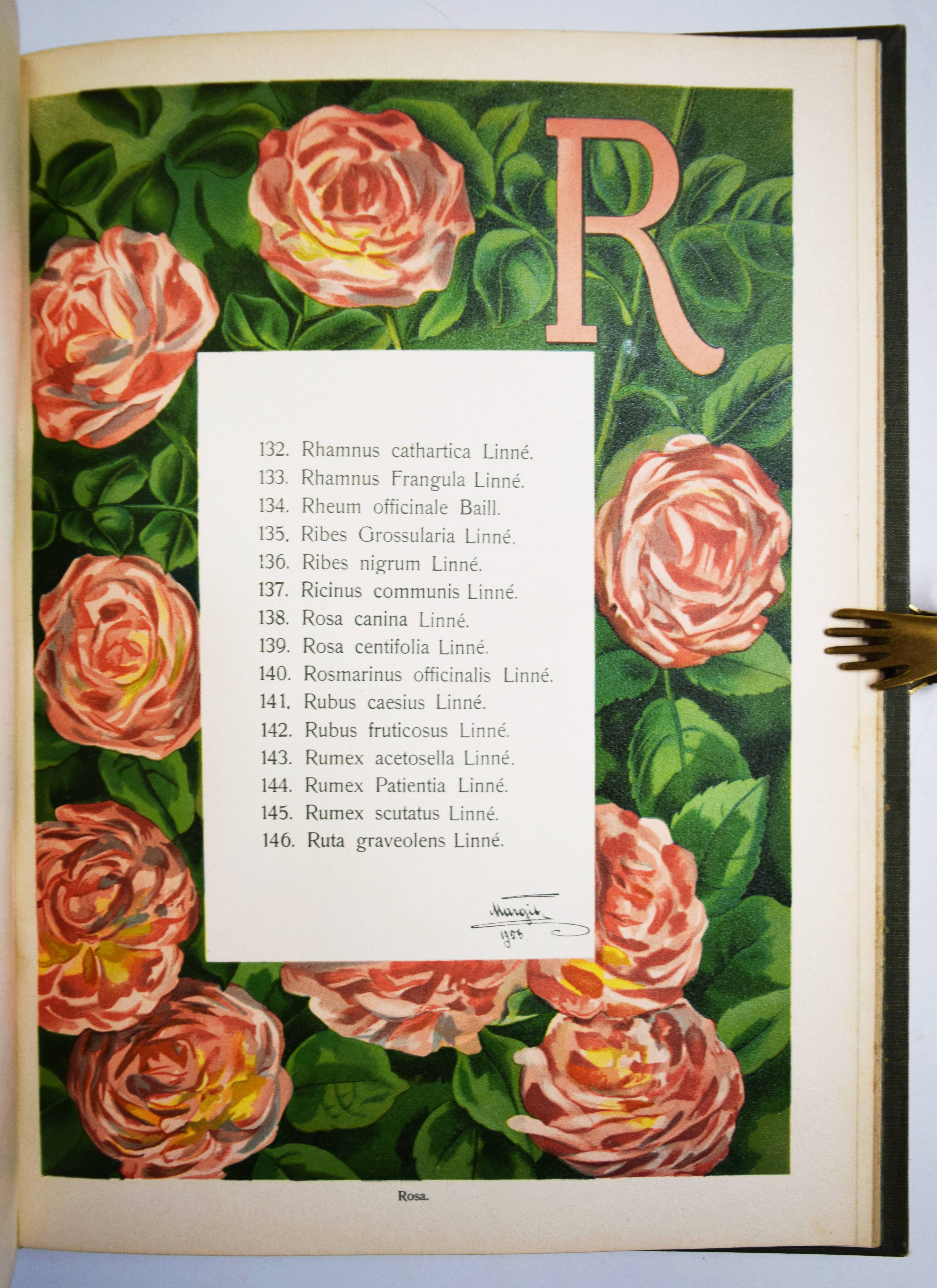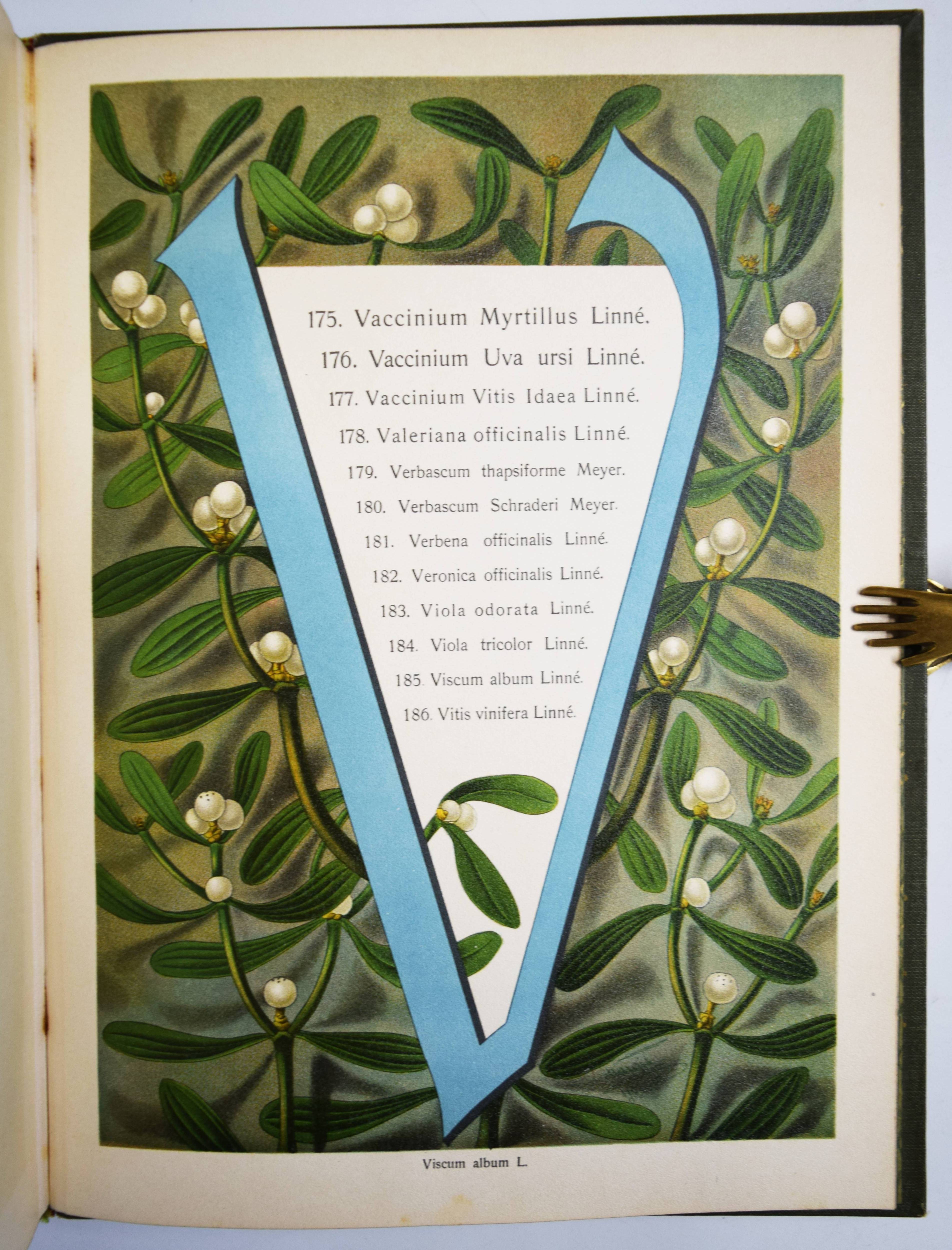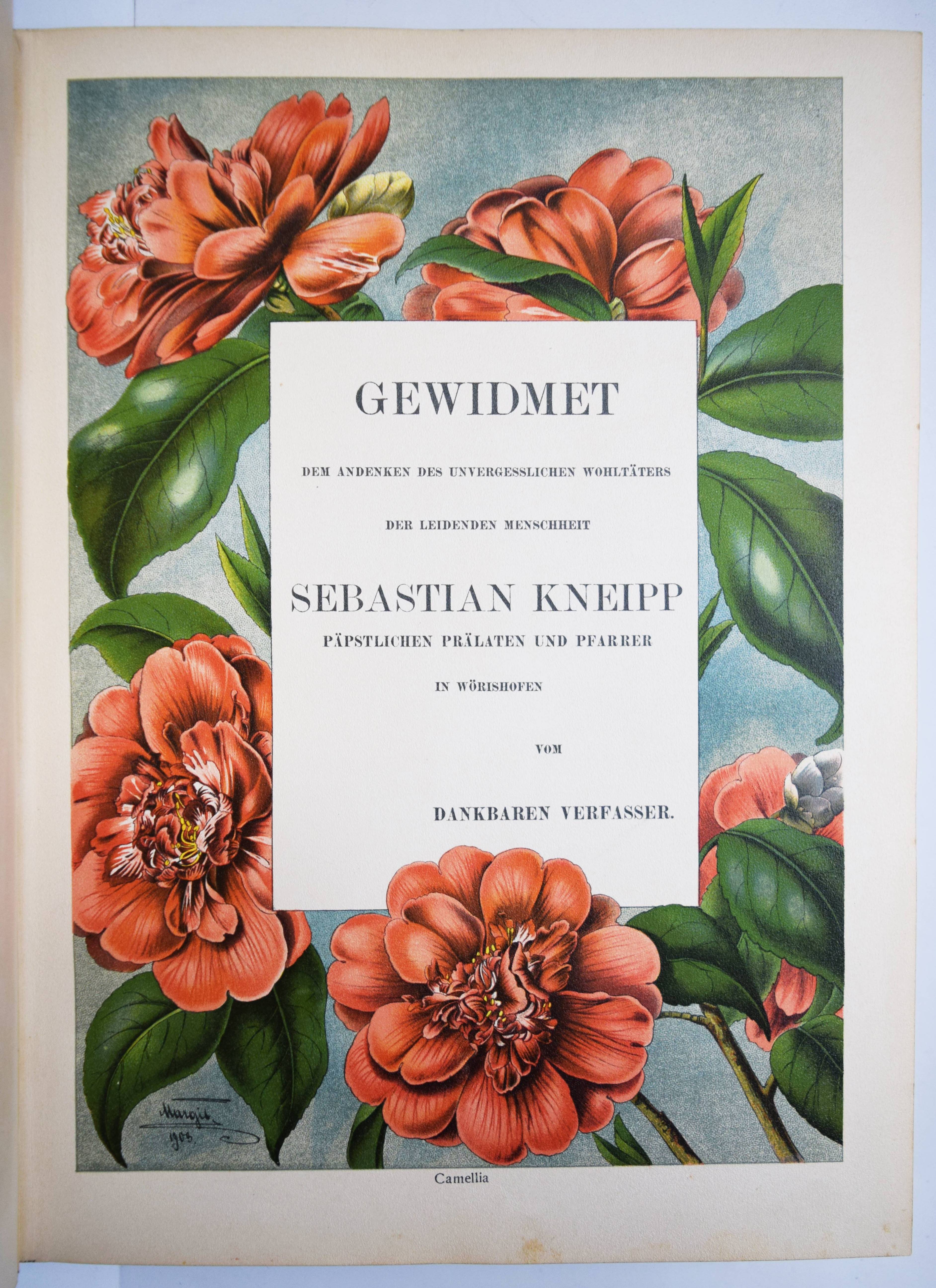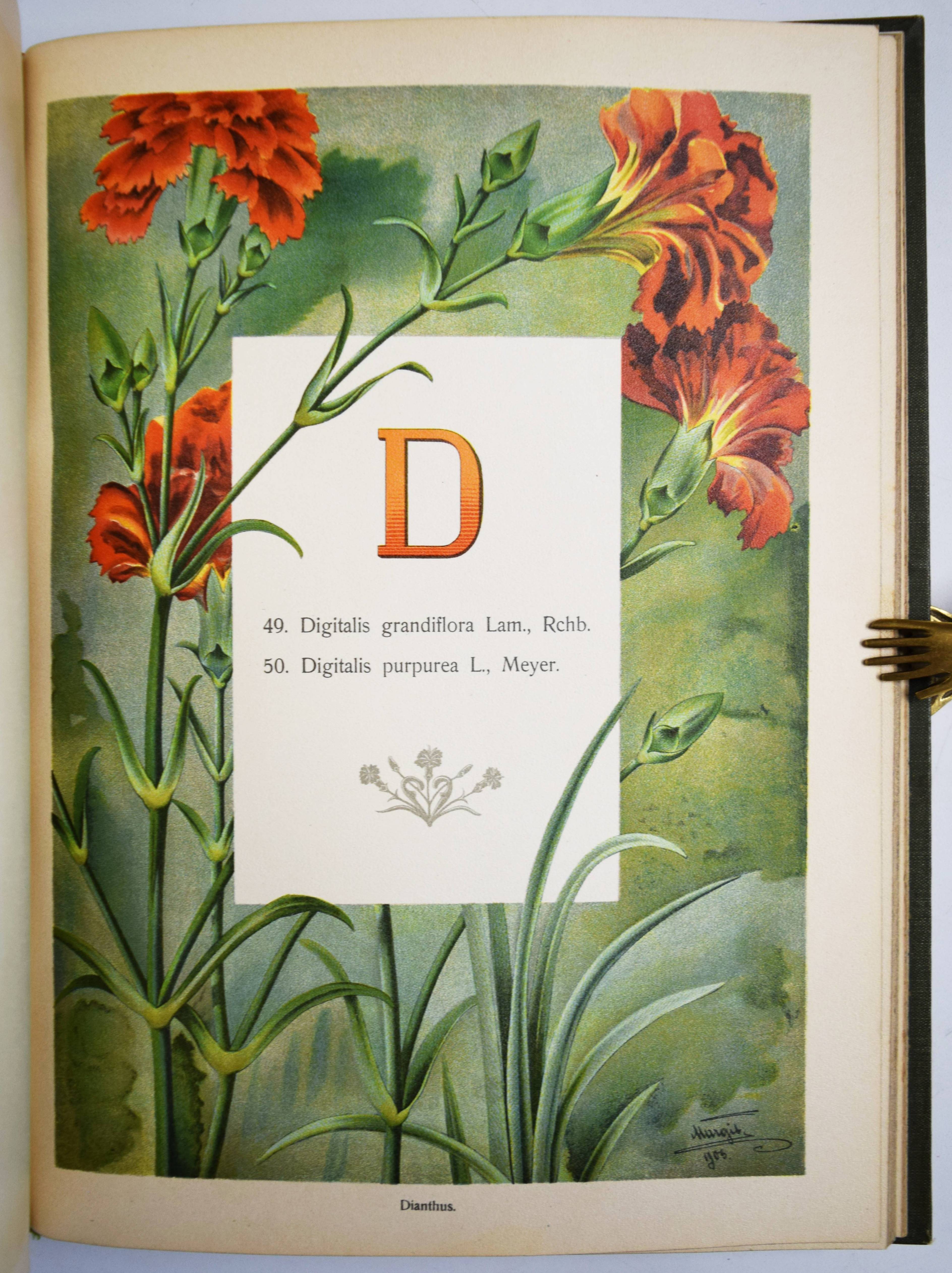 Joseph, Erzherzog von Österreich. Atlas der Heilpflanzen des Praelaten (Sebastian) Kneipp. Bildlich dargestellt durch Margarethe von Thurn und Taxis. Regensburg, W. Wunderlings Hofbuchhandlung (1904-1906). Gr.-4° (31 x 23,5 cm.). Chromolithogr. Titelblatt, chromolithogr. Widmungsblatt, [1] Bl. (Vorwort), 188 chromolithogr. Tafeln, 20 chromolithogr. Zwischentitel und 21 chromolithogr. Register-Blätter (zusammen 231 Chromolithographien). Farbig illustr. Orig.-Leinenband mit goldgepr. Rücken- und Deckeltiteln. Nissen 1008 n. – Erste Ausgabe mit prachtvollen Jugendstil-Pflanzendarstellungen. – Außer dem Vorwort vollständig chromolithographisch gedruckt. Die Fürstin, Tochter des Verfassers, die ihre Zeichnungen lässig mit „Margit“ signierte, schuf nicht nur die Pflanzen-Aquarelle, oft vor eindrucksvollen oder idyllischen Landschaften, sondern auch noch dekorative Zwischentitel und Registerblätter. – Rücken am Kapital und Fuß gering berieben, sehr schönes Exemplar.