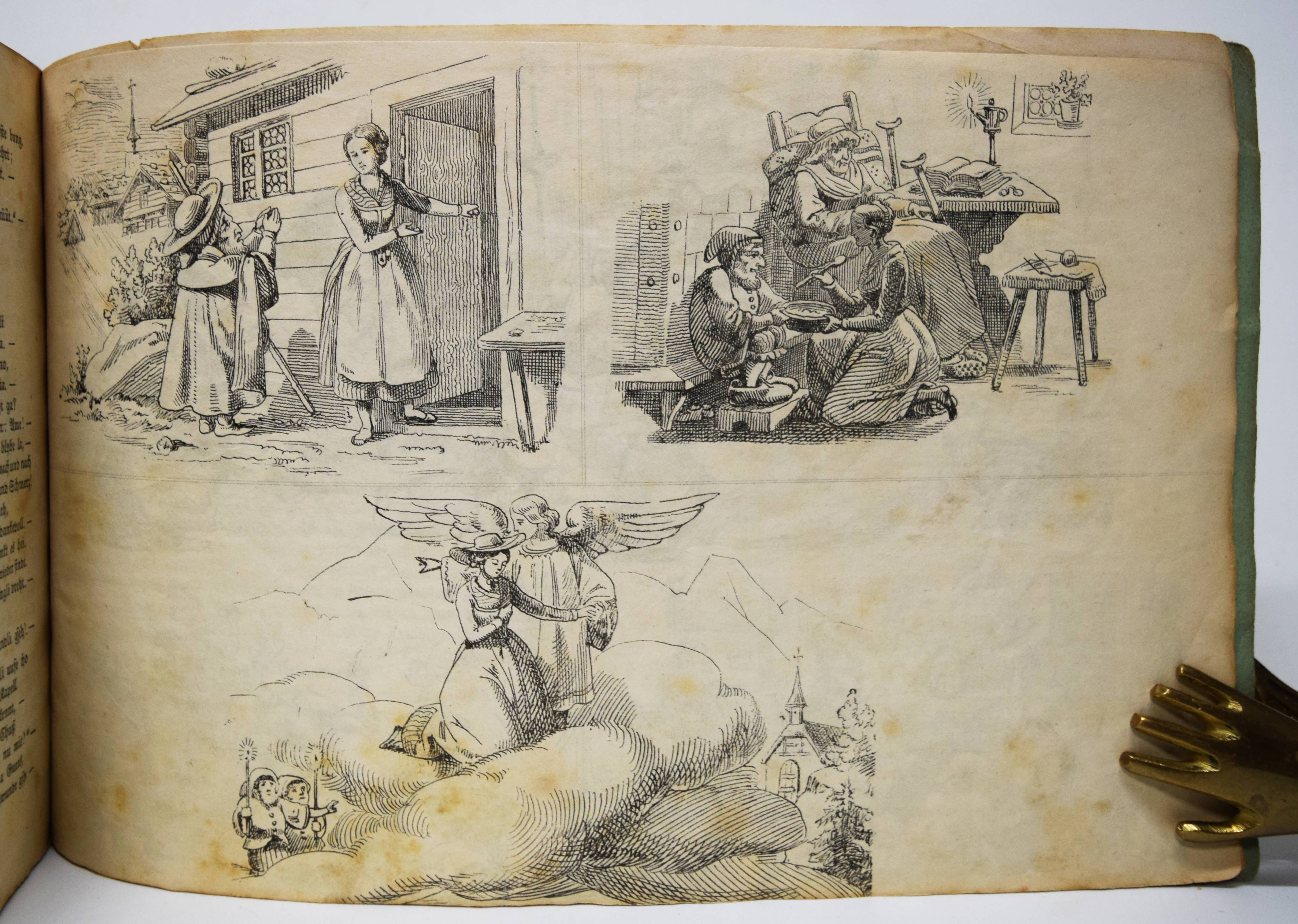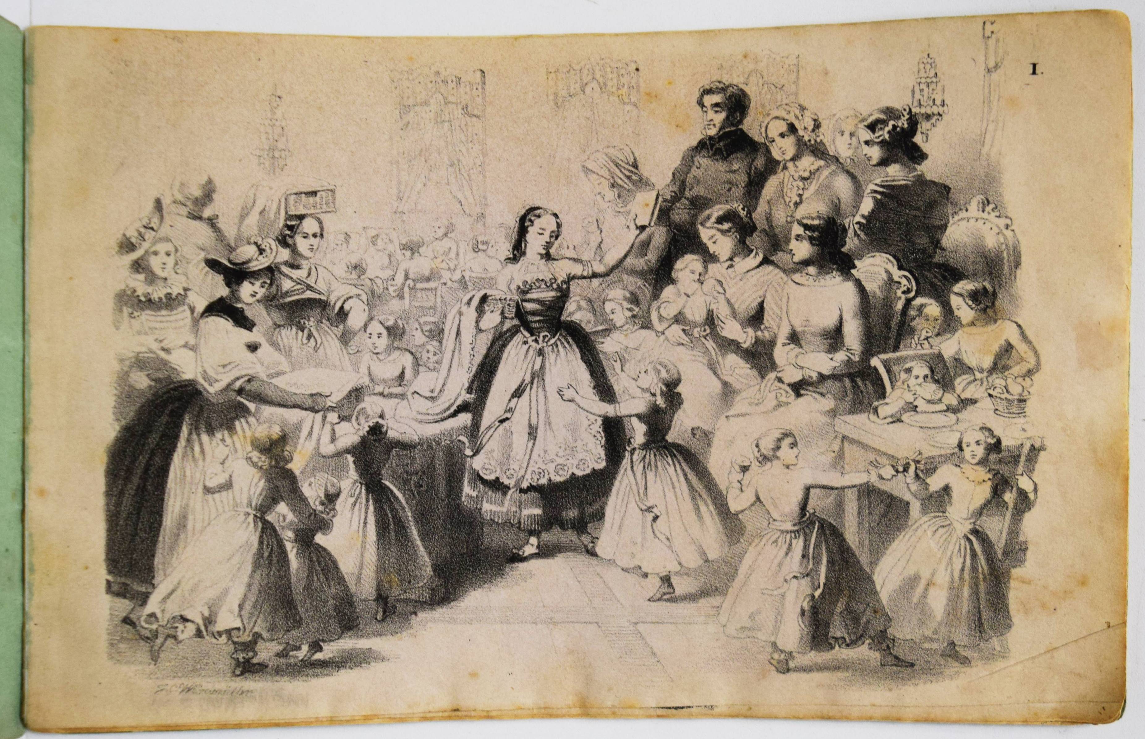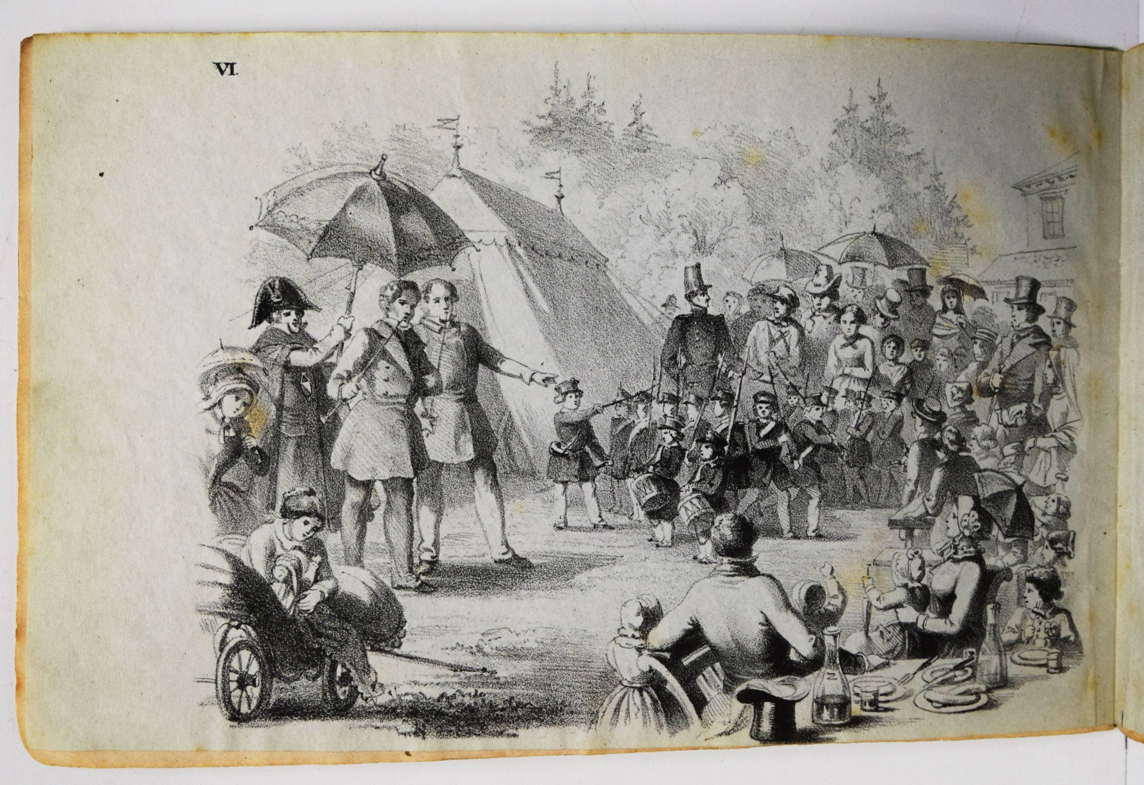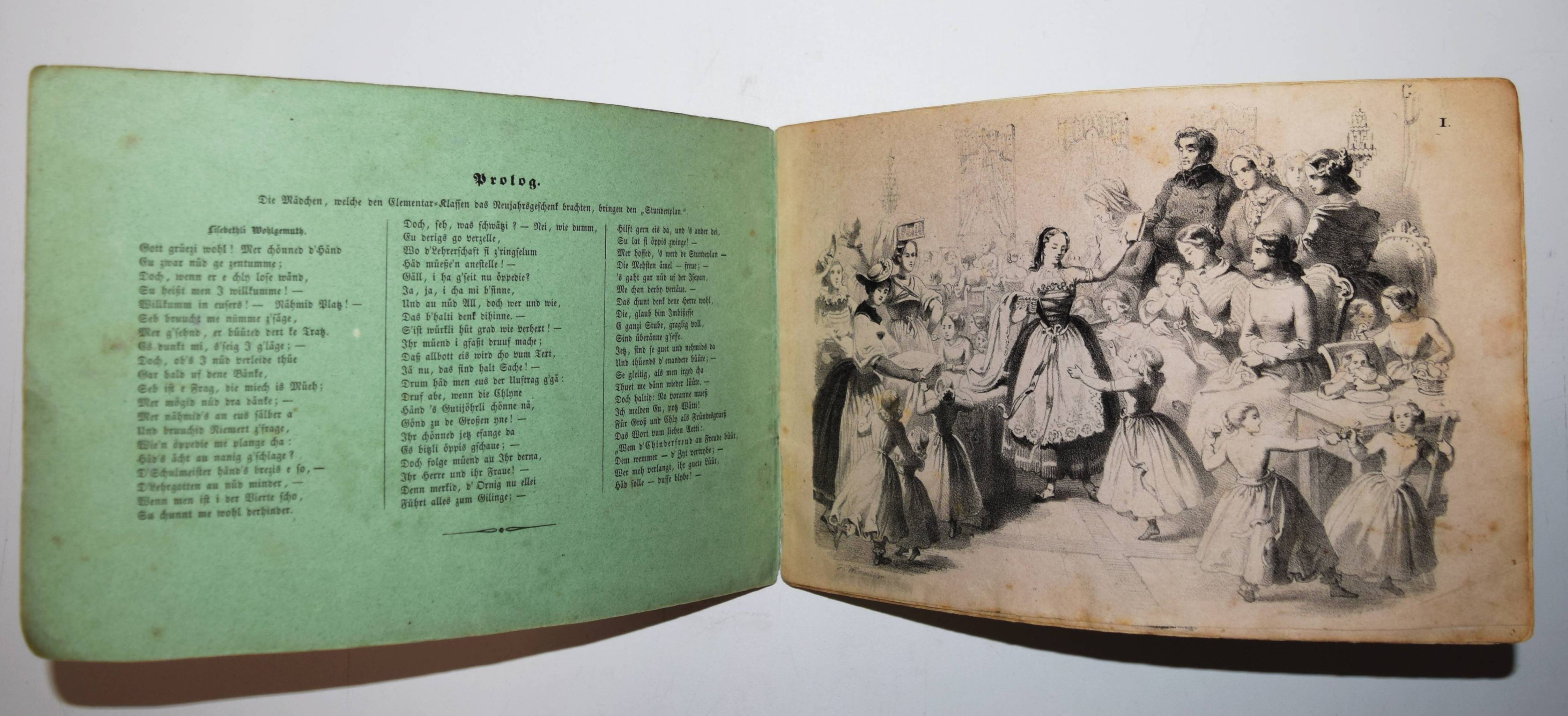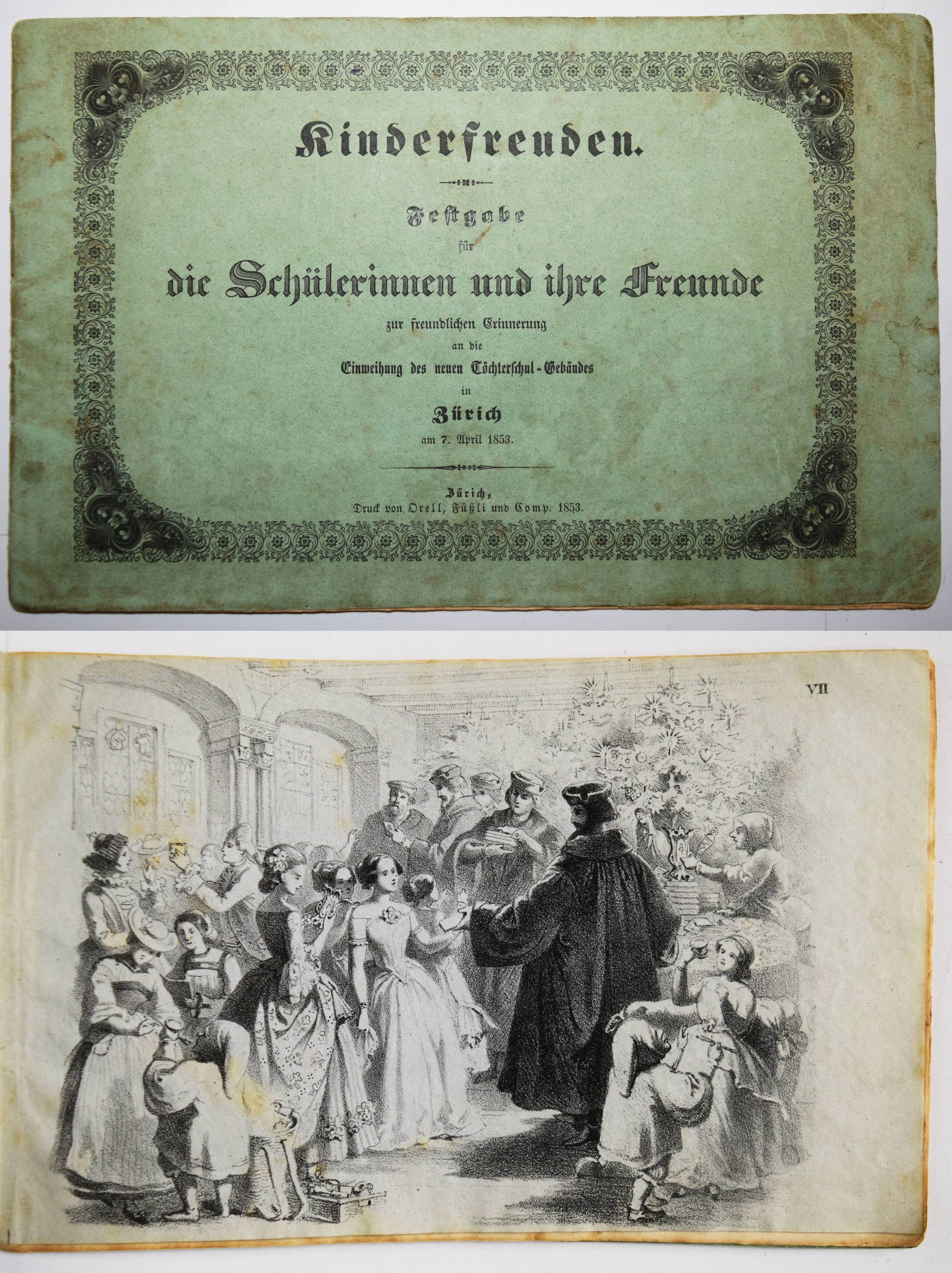 Kinderfreuden. Festgabe für die Schülerinnen und ihre Freunde zur freundlichen Erinnerung an die Einweihung des neuen Töchterschul-Gebäudes in Zürich am 7. April 1853. Zürich, Orell, Füßli und Comp. 1853. Quer-8° (16,5 x 25,5 cm.). VIII S., 15 S. mit Mit 8 ganzseitigen Kreidelithographien von Johann Conrad Werdmüller, 6 Federlithographien auf 2 Blättern und 1 Holzstich-Illustration im Text. Typogr. Orig.-Kartonumschlag. Hauswedell 703. Seebaß I,1033 und II, 1010. Weilenmann 1622. – Erste und wohl einzige Ausgabe. – „Einem Prolog folgen Gedichte, kurze Theaterszenen und Charaden in Versen sowie ein Versmärchen. Ausser einem sind alle Texte in Zürcher Mundart verfasst, wobei jeder Beitrag mit einem ganzseitigen Bild illustriert ist“ (C. Weilenmann). – Umschlag angestaubt und fingerfleckig, Textteil etwas braunfleckig, sonst gut erhalten.