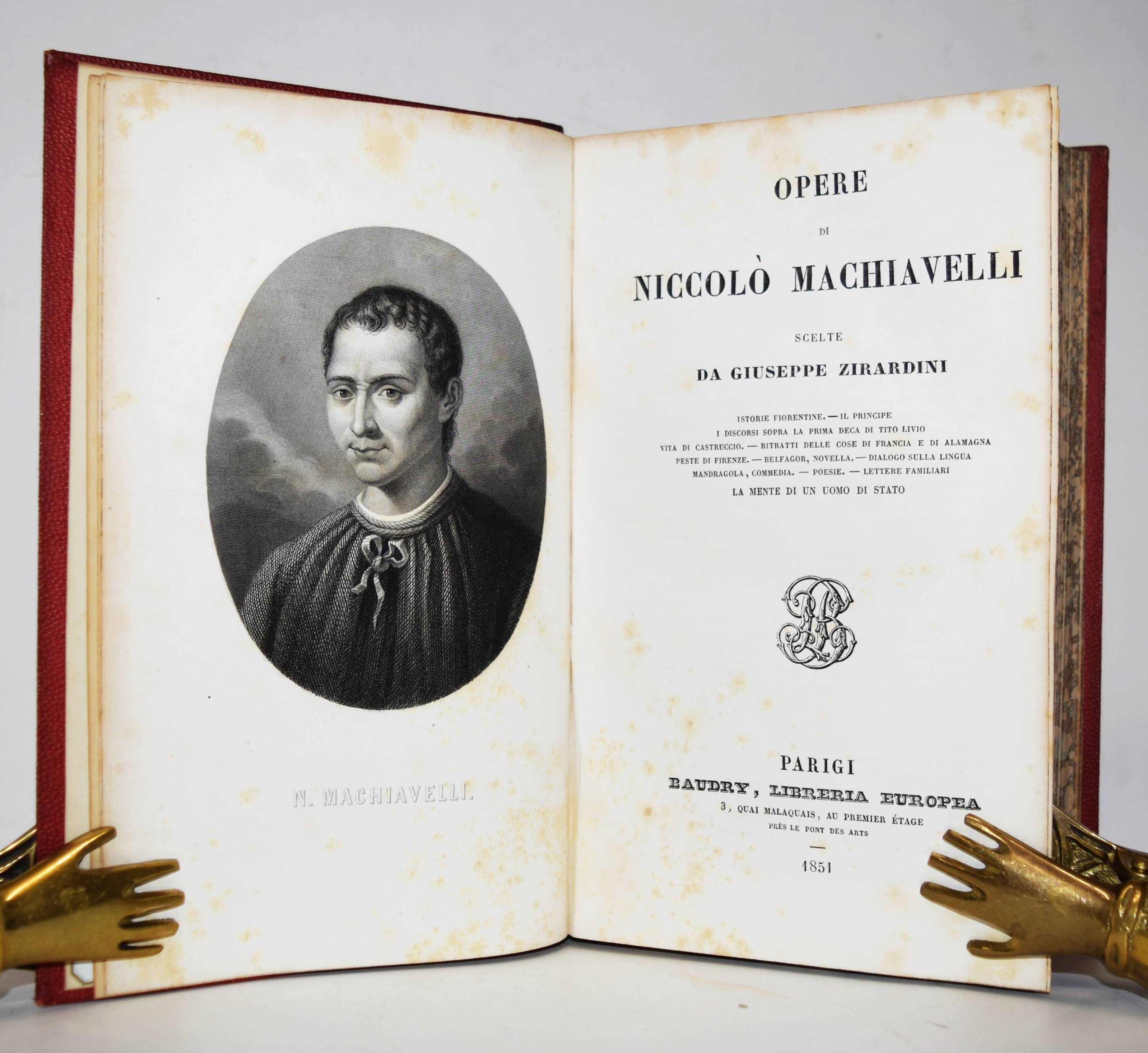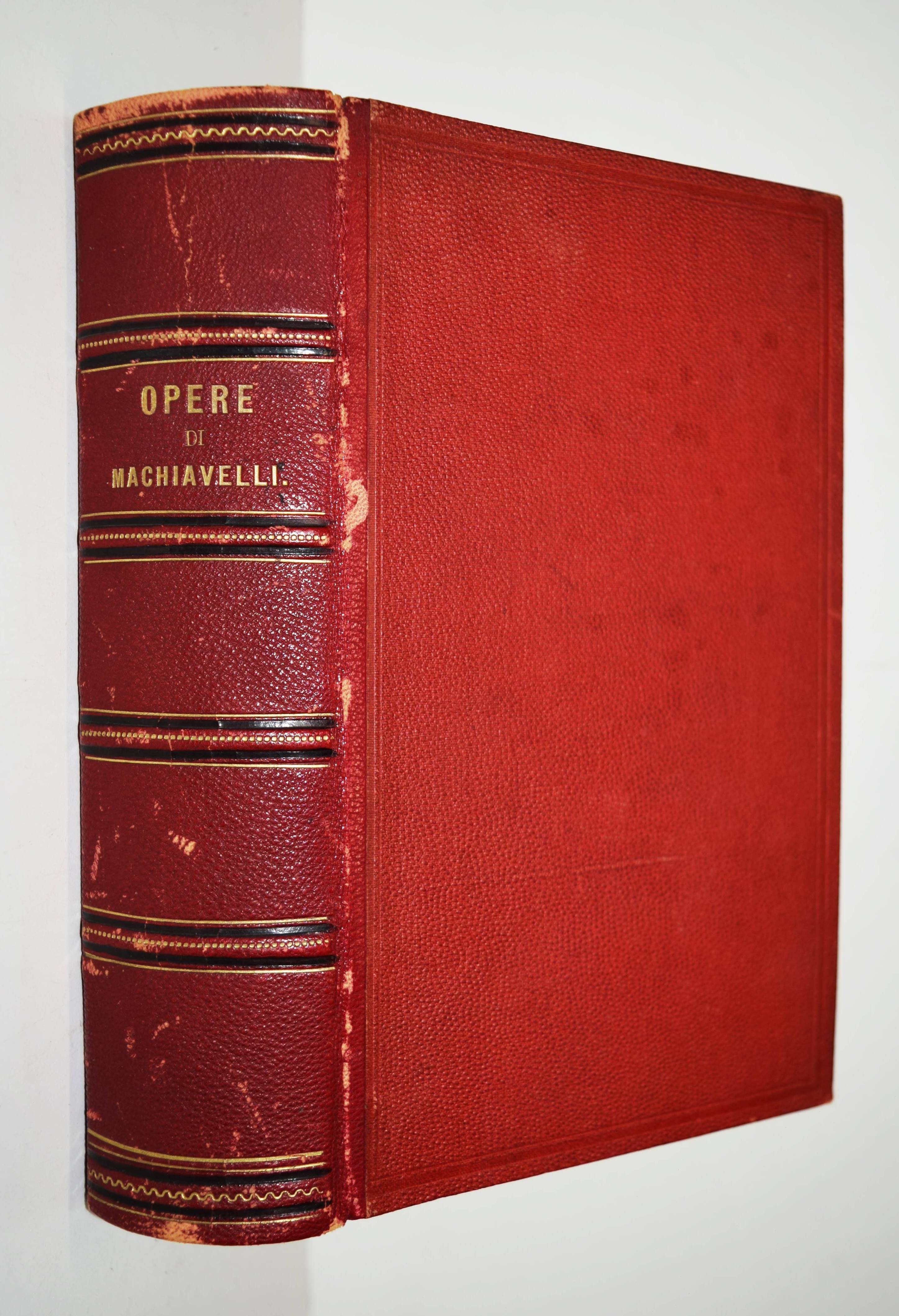 Machiavelli, Niccolò (di Bernardo dei). Opere. Scelte da Giuseppe Zirardini. Paris, Baudry, Libreria Europea 1851. Gr.-8°. IV, 692 S. mit gestoch. Portrait-Frontispiz. Weinroter Halblederband der Zeit mit goldgepr. Rückentitel. Seltene Gesamtausgabe herausgegeben von dem italienischen Litearturhistoriker Giuseppe Zirardini (1813-1871). – N. Machiavelli (1469-1527) gilt vor allem aufgrund seiner beiden Werke Il Principe (Der Fürst) und I Discorsi sopra la prima deca di Tito Livio (Discorsi) als einer der bedeutendsten Staatsphilosophen der Neuzeit. – Gelenke etwas berieben, durchgehend braunfleckig, gutes dekorativ gebundenes Exemplar.