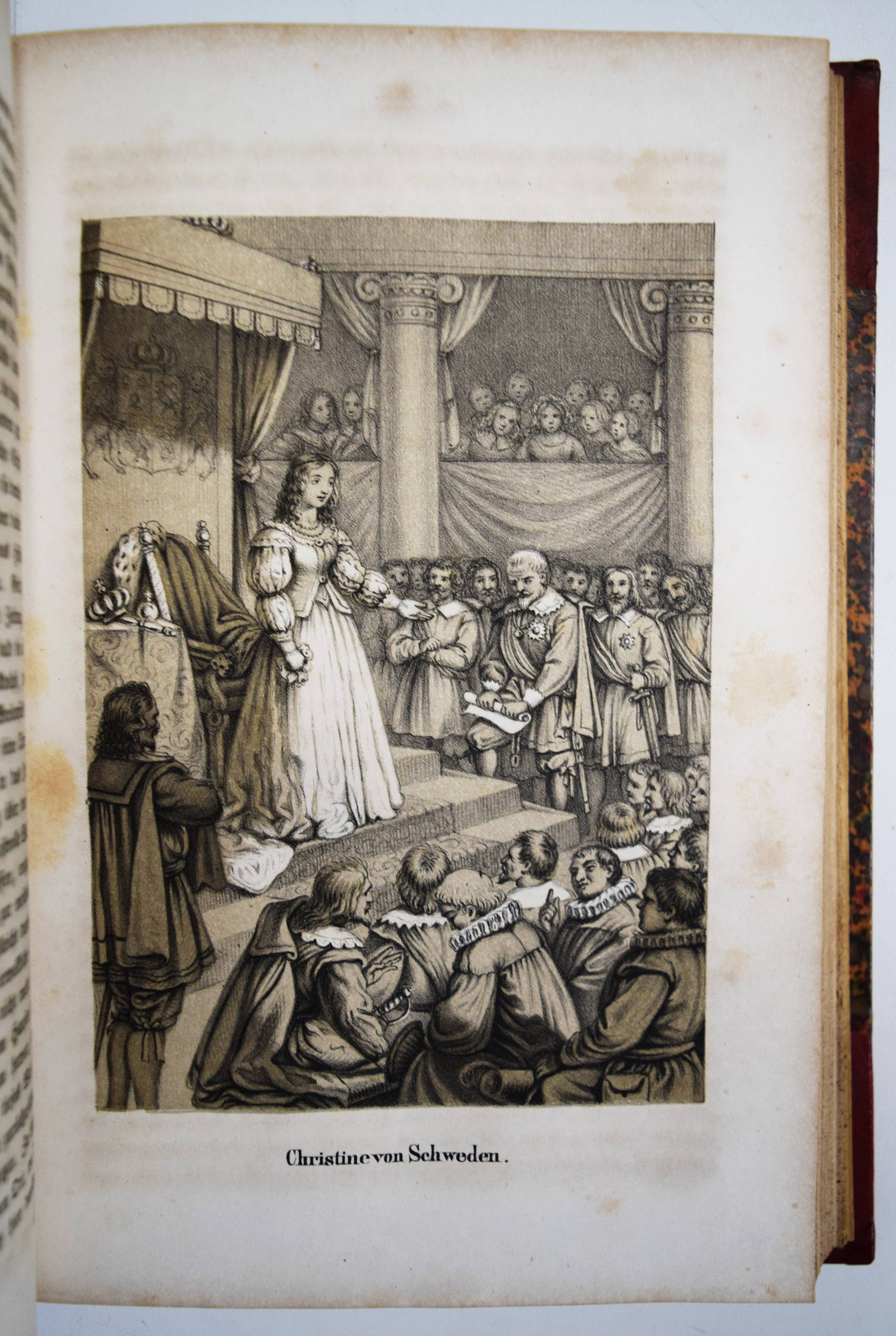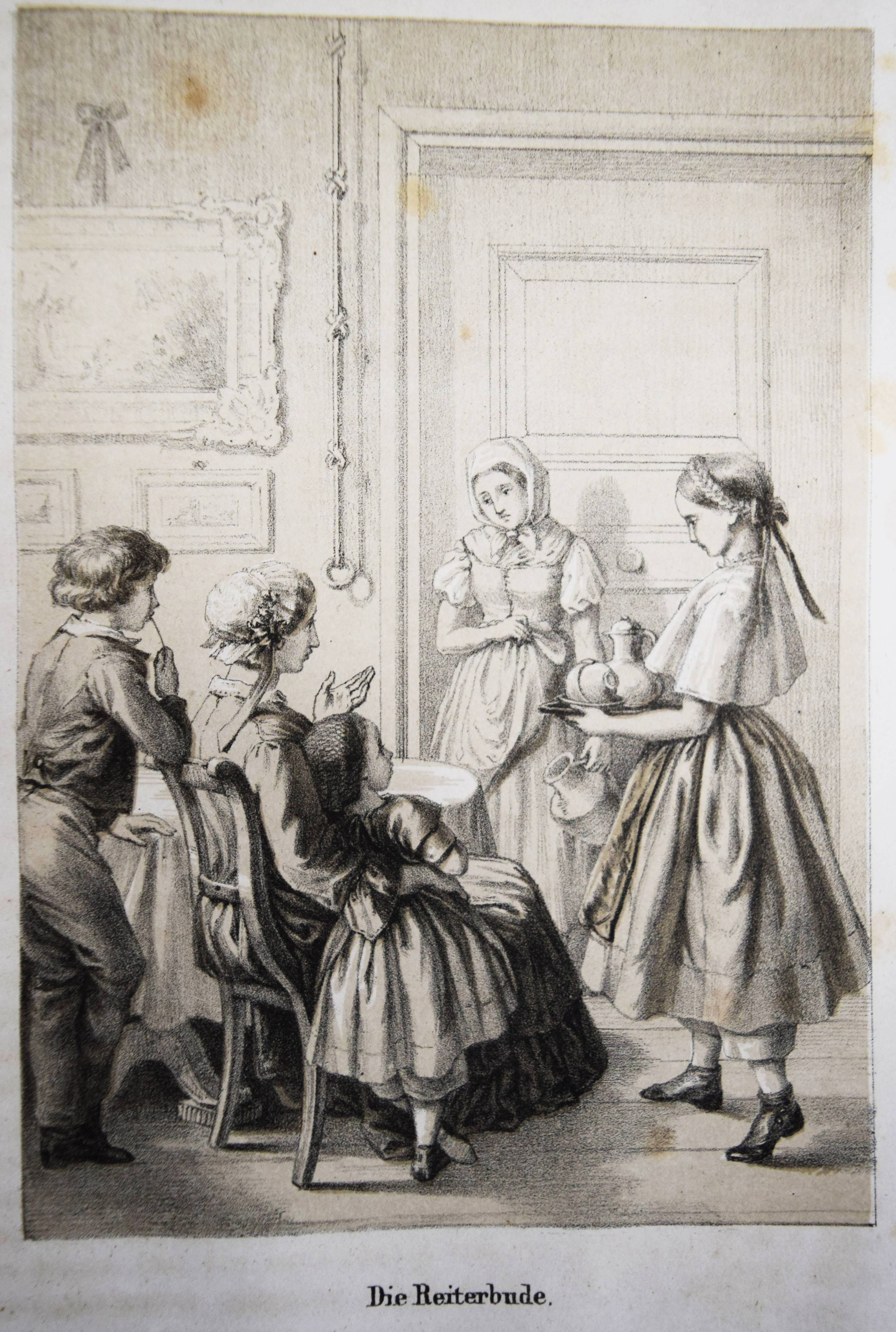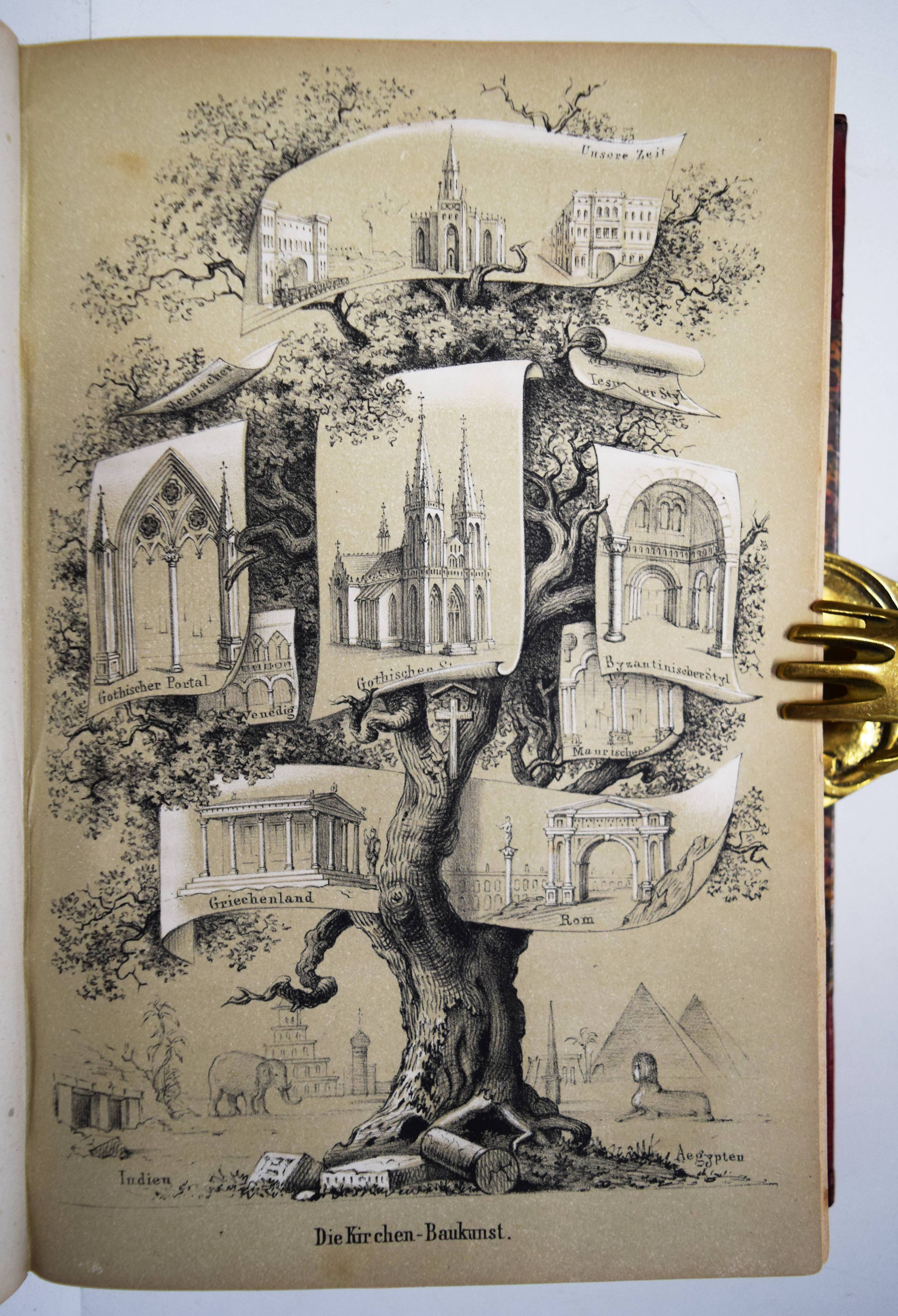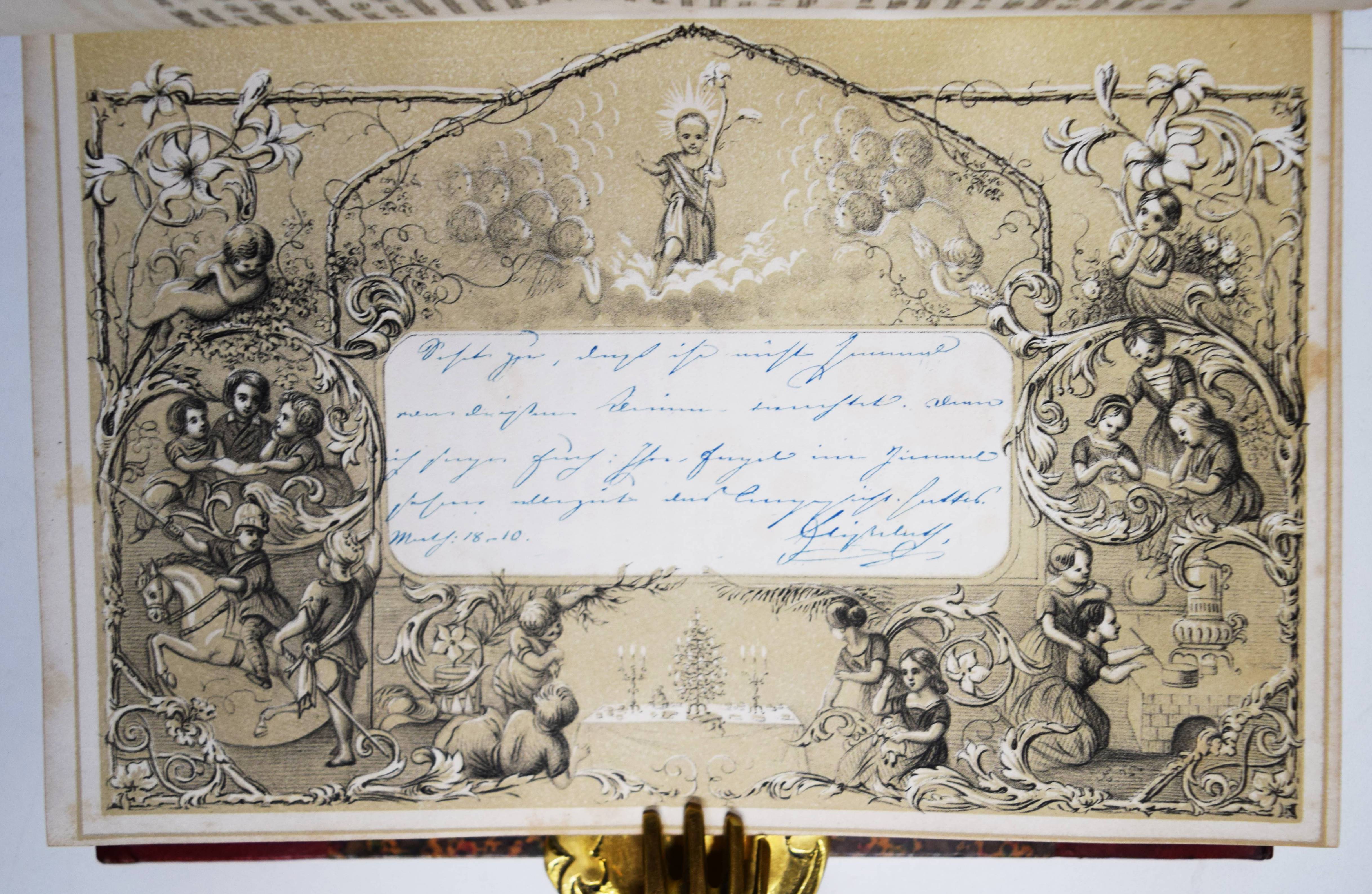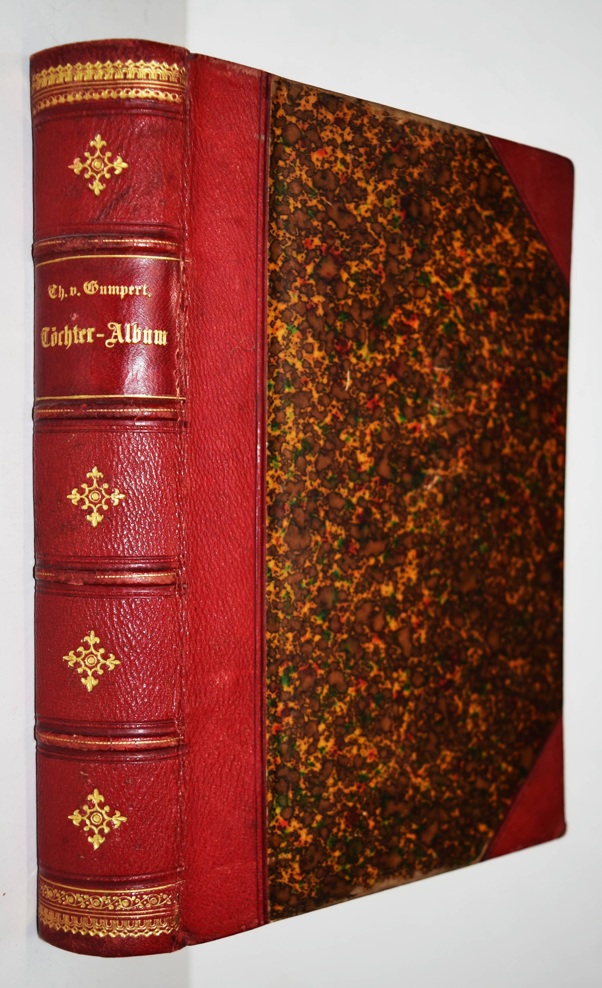 Gumpert, Thekla v. (d. i. Thekla von Schober, Hrsg.). Töchter-Album. Unterhaltungen im häuslichen Kreise zur Bildung des Verstandes und Gemüthes der heranwachsenden weiblichen Jugend. Erster Band. Glogau, Carl Flemming o. J. (1855). Gr.-8°. [3] Bl., 599, (1) S. mit 30 lithogr. Tafeln, davon 14 mit Tonplatte von (Hugo) Bürkner, Alfred Hindorf und H(ermann) Wagner. Weinroter Halblederband der Zeit mit goldgepr. Rückenschild und Rückenvergoldung (illustr. Orig.-Umschlag beigebunden). Bilderwelt 1289. Slg. Brüggemann I, 829. HKJL IV, 910. Hobrecker 129. LKJ I, 512 und III, 544 f. Seebaß II, 2053. Wegehaupt IV, 2737. – Seltener erster Jahrgang des, neben dem „Herzblättchen“ erfolgreichsten Mädchen-Jahrbuchs des 19. Jahrhunderts. – „Erster Band des – ursprünglich als Zeitschrift veröffentlichten Jahrbuchs, das bis 1930 regelmäßig erschien und danach unter dem Titel „Mädeljahr“ noch einige Jahre fortgeführt wurde. Zur Herausgeberin Thekla von Gumpert, zugleich Verfasserin vieler Beiträge, hauptsächlich Erzählungen, vgl. M. Dahrendorf in Lexikon KJL 1, S, 512 f., wo gegenüber ihrem Werk wegen seines Mangels an literarischer Qualität und seiner restaurativen Erziehungsintentionen (so Dahrendorf) ein kritischer Standpunkt eingenommen wird. Die seit Wolgast (1896) vorherrschenden z. T. kraß ablehnenden Stellungnahmen werden in einem weiteren Artikel im Lexikon KJL III, S. 544 f. ausführlicher referiert. Eine eingehende Würdigung dieses im Geschmack seiner Zeit anspruchsvoll ausgestatteten und beim Bürgertum der 2. Hälfte des 19. Jahrhunderts sehr beliebten Jahrbuchs unternimmt Roswitha Budeus-Budde in ihrer Untersuchung: Das „Töchter-Album“ von Thekla von Gumpert. Phil. Diss. Innsbruck 1984“ (T. Brüggemann). – Durchgehend etwas braunfleckig, gutes dekorativ gebundenes Exemplar.