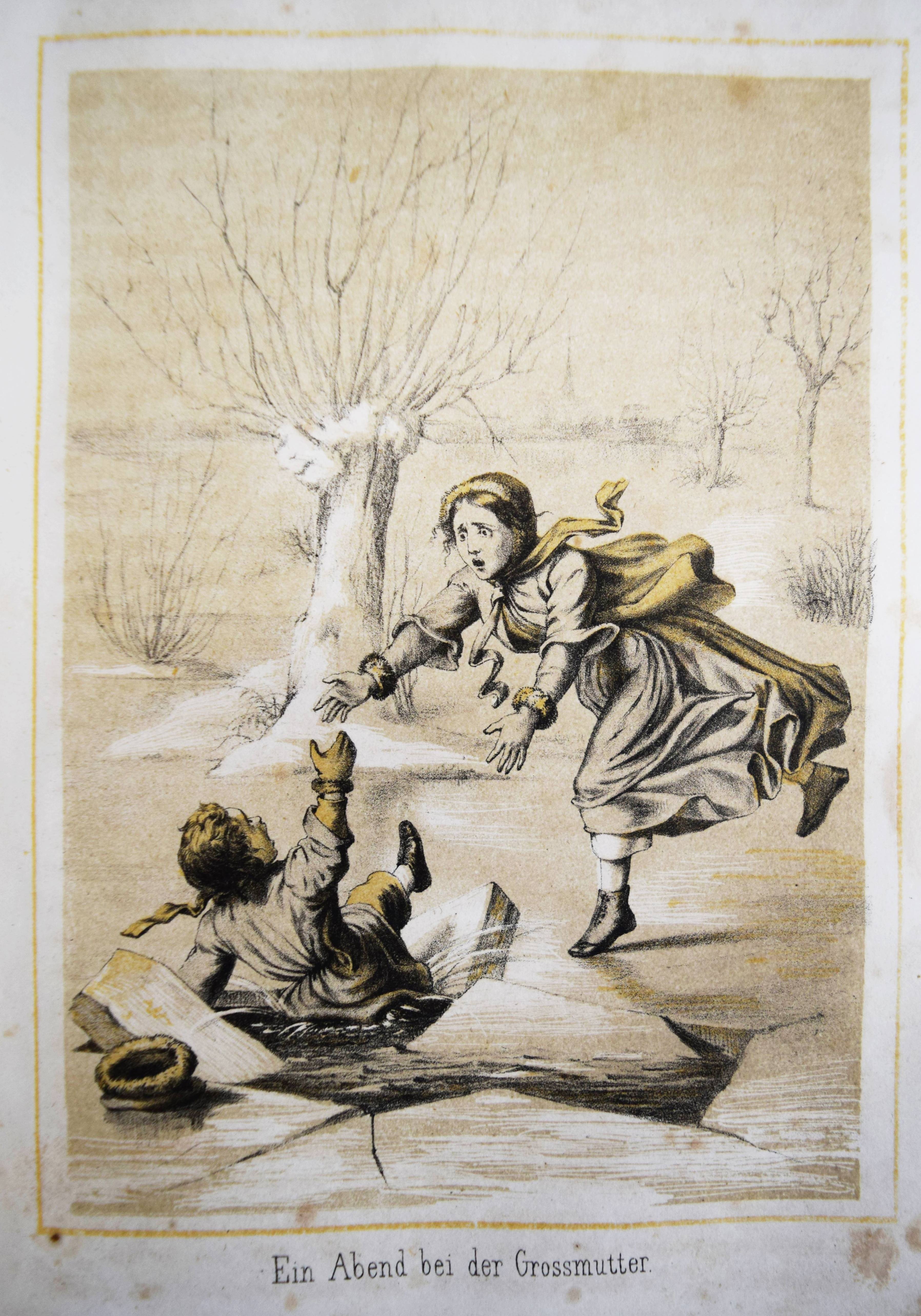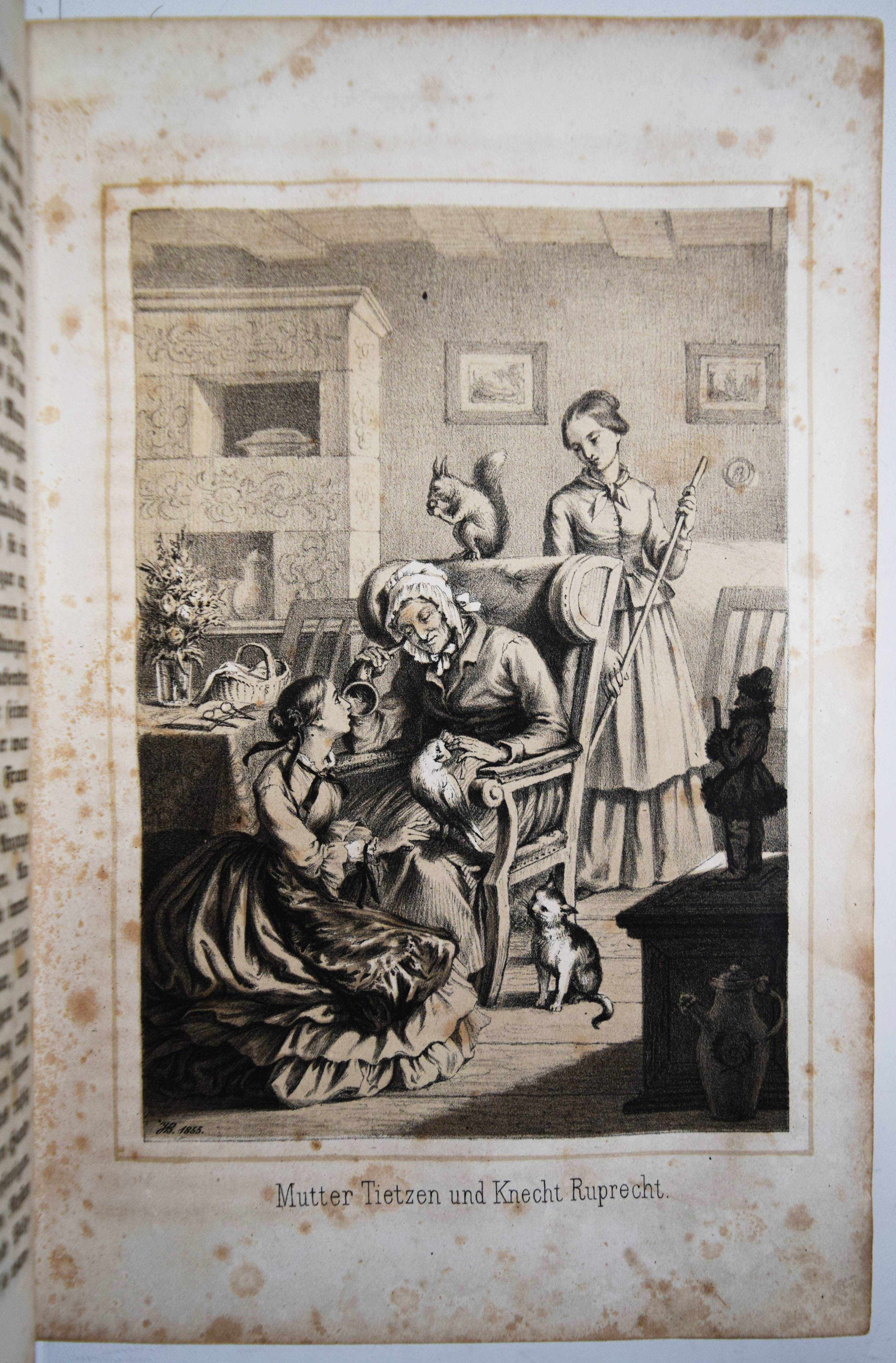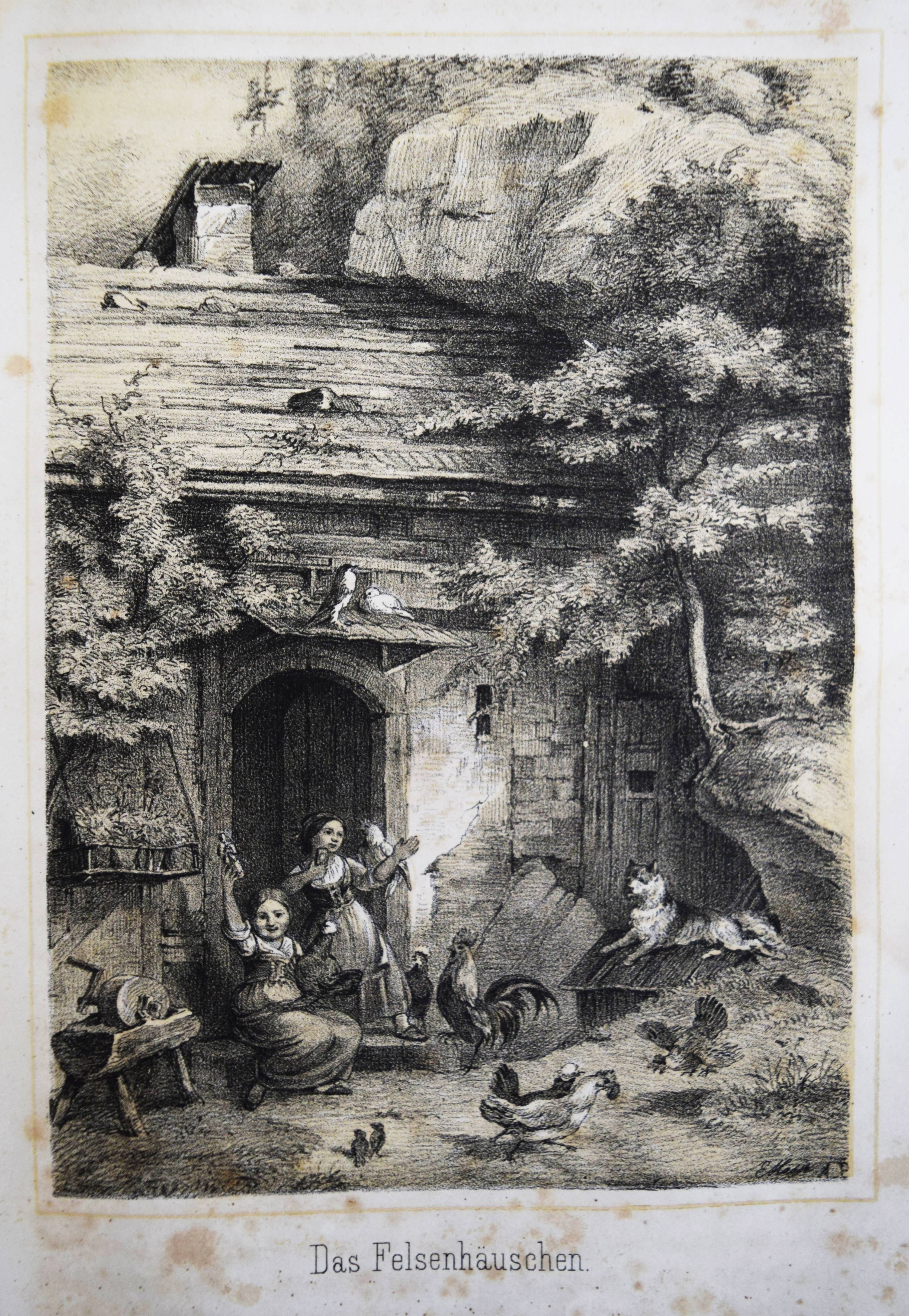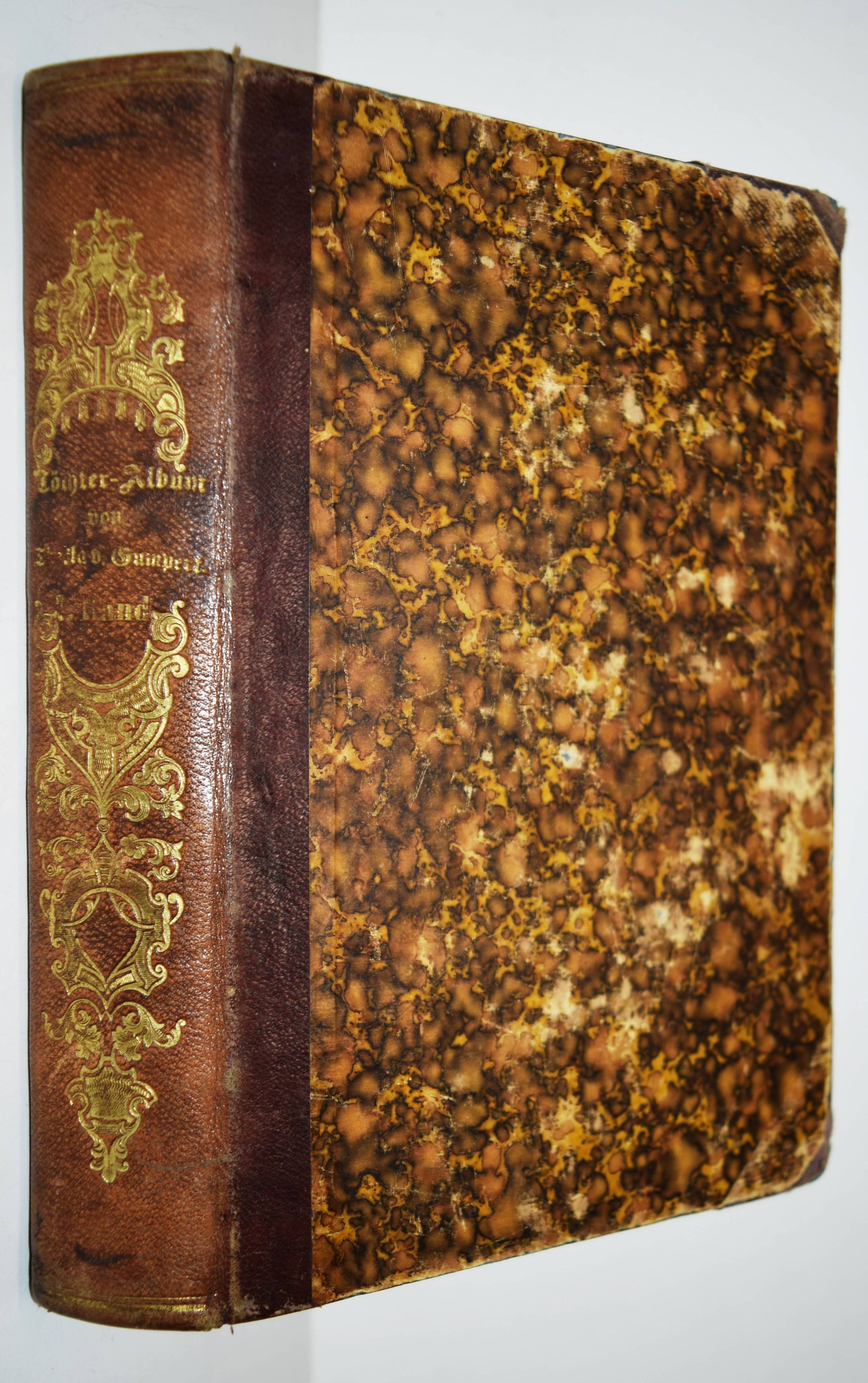 Gumpert, Thekla v. (d. i. Thekla von Schober, Hrsg.). Töchter-Album. Unterhaltungen im häuslichen Kreise zur Bildung des Verstandes und Gemüthes der heranwachsenden weiblichen Jugend. Zweiter Band. Glogau, Carl Flemming o. J. (1856). Gr.-8°. VII, 574 S., [1] Bl. mit lithogr. Portrait-Frontispiz, lithogr. illustr. hellblau lavierter Titel und 29 lithogr. Tafeln von (Hugo) Bürkner und H(ermann) Wagner. Halblederband der Zeit mit goldgepr. Rückentitel und Romantikervergoldung. Bilderwelt 1290. HKJL IV, 910. Hobrecker, Braunschweig 7848. LKJ I, 512 und III, 544 f. Seebaß II, 2053. Wegehaupt IV, 2737. – Seltener zweiter Jahrgang des, neben dem „Herzblättchen“ erfolgreichsten Mädchen-Jahrbuchs des 19. Jahrhunderts. – „Absicht der Herausgeberin und Inhalt lassen sich aus dem Motto ablesen, welches sich auf den hübsch lithographierten Titeln findet: „Willst du erfüllen die Pflichten, zu welchen Dich rufet Dein Dasein, Sei die Maria im Geist, sei in der Thätig keit Martha!“. Der Inhalt setzt sich aus Erzählungen, Biographien, geschichtlichen und kulturgeschichtlichen Schilderungen, naturwissenschaftlichen Artikeln, Anleitungen zu Beschäftigungen usw. zusammen. Die Illustrationen sind oft bemerkenswert“ (A. Seebaß). – Rücken etwas berieben, durchgehend teils stärker braunfleckig, noch gutes Exemplar.