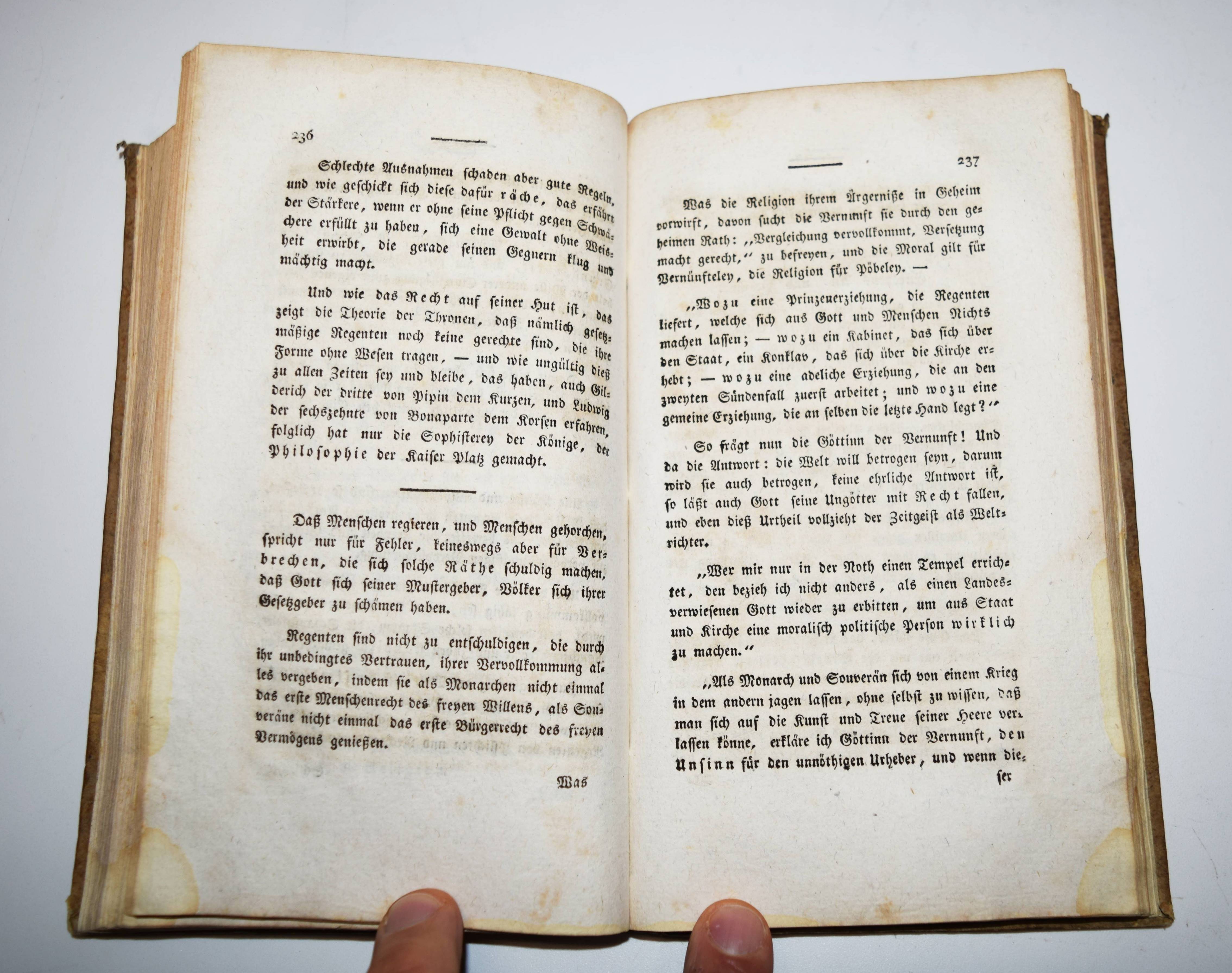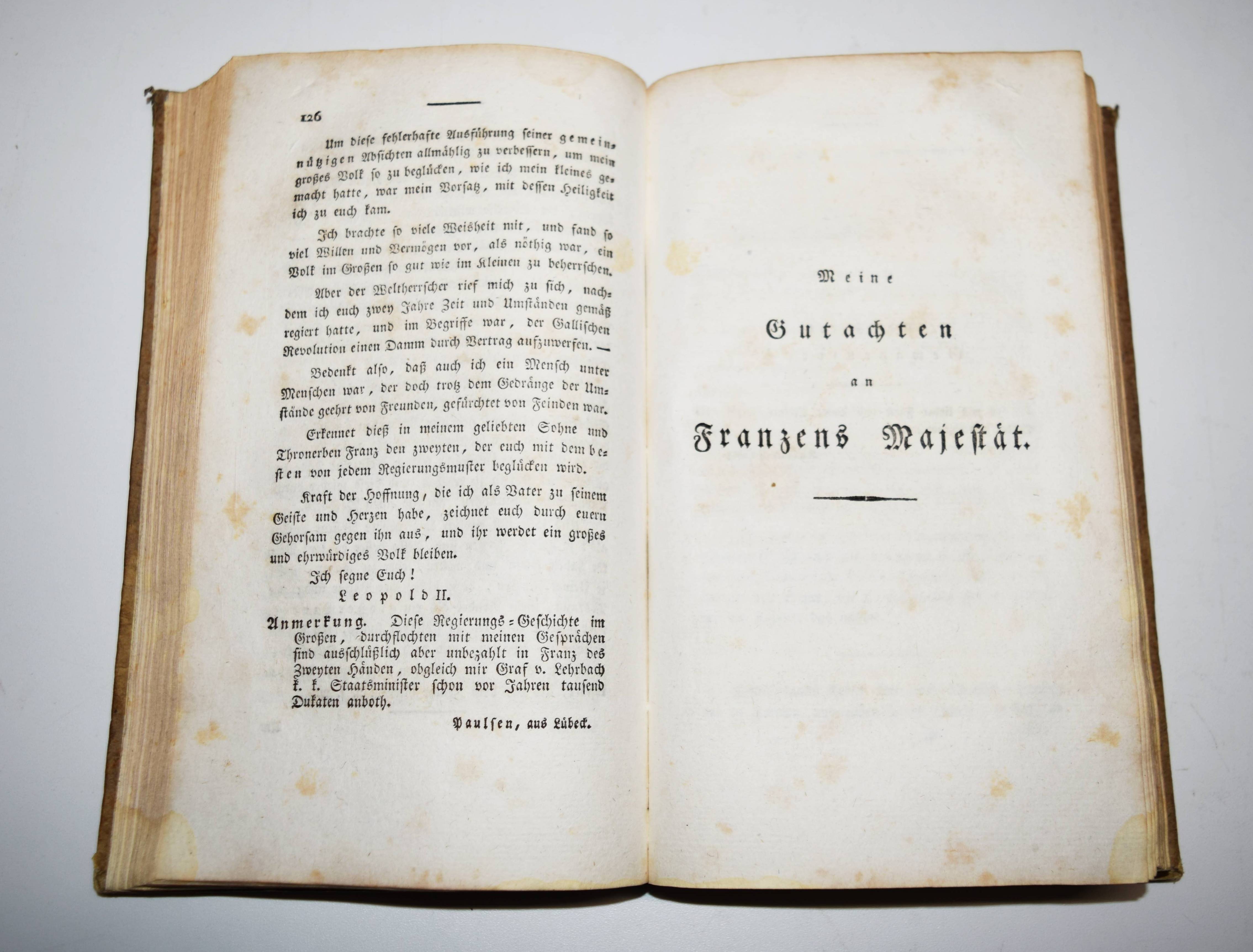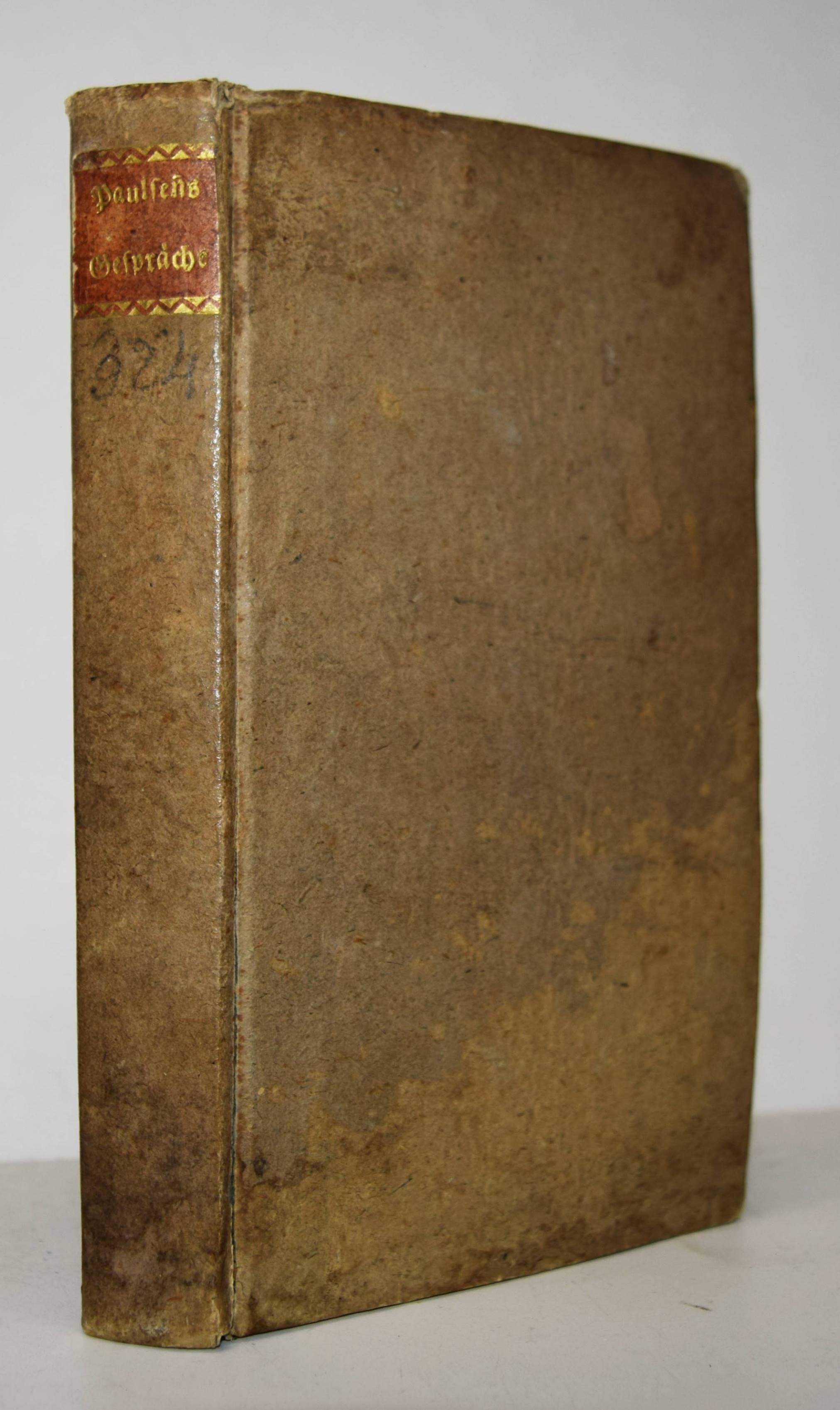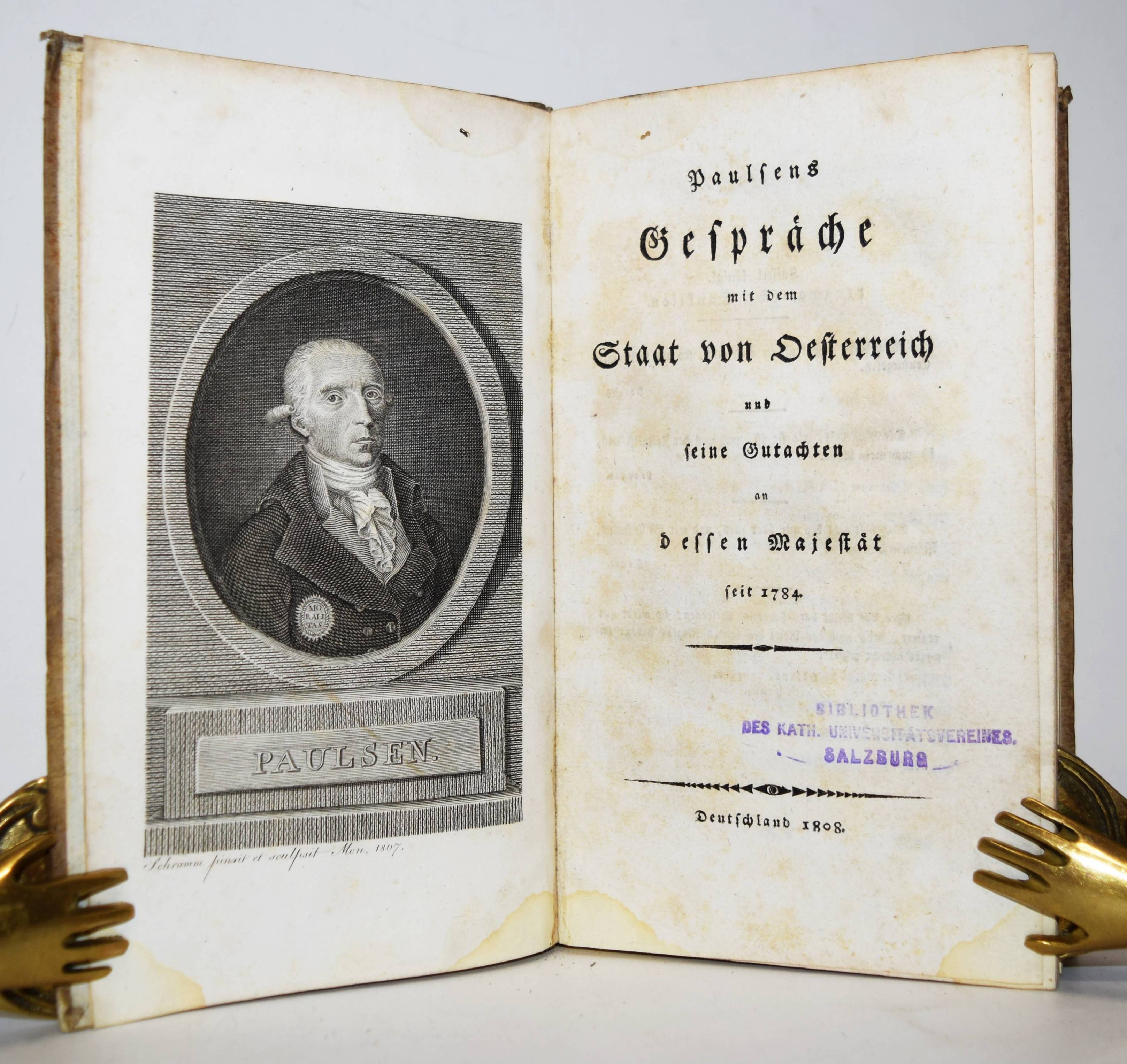 Paulsen, Nikolaus. Gespräche mit dem Staat von Oesterreich und seine Gutachten an dessen Majestät seit 1784. Deutschland (d. i. München, Lindauer) 1808. 8°. XXIV, 372 S. mit gestoch. Portrait-Frontispiz von Schramm. Pappband der Zeit mit goldgepr. Rückenschild. Seltene Arbeit des Lübecker Politikers N. Paulsen (1742-1818), der sich am Ende seiner Einleitung als „Doktor Paulsen aus Lübeck, hanseatischer Bürger des deutschen Bundes mit Frankreich“ bezeichnet. Paulsen erläutert hier bereits die Verhandlungen mit Österreich, die 1815 zur Gründung des Deutschen Bundes führten. – „Der Deutsche Bund war ein Staatenbund, auf den sich im Jahr 1815 die „souveränen Fürsten und freien Städte Deutschlands“ mit Einschluss des Kaisers von Österreich und der Könige von Preußen, Dänemark (hinsichtlich Holsteins) und der Niederlande (hinsichtlich Luxemburgs) geeinigt hatten. Dieser Bund existierte von 1815 bis 1866 und hatte bereits bundesstaatliche Züge, da sich ein Recht des Deutschen Bundes entwickelte, das die Gliedstaaten band. Dennoch besaß der Deutsche Bund keine Staatsgewalt, sondern nur eine „völkerrechtsvertraglich vermittelte Vereinskompetenz“. Laut Präambel der Bundesakte hatten sich die Fürsten zu einem „beständigen Bund“ vereint; sie sind allerdings als Repräsentanten ihrer Staaten anzusehen. Der Bund hatte zur Aufgabe, die innere und äußere Sicherheit der Gliedstaaten zu gewährleisten. Damit war der Bundeszweck deutlich begrenzter als beim Heiligen Römischen Reich, das im Jahr 1806 aufgelöst worden war. Dieser deutsche Bund scheiterte schließlich an den unterschiedlichen Vorstellungen von Staat und Gesellschaft, vor allem aber am politischen Machtkampf zwischen Preußen und Österreich“ (Wikipedia). – Einband angestaubt und leicht fleckig, vorderes Gelenk unten etwas angeplatzt, Stempel auf dem Vorsatz und Titel, stellenweise etwas braunfleckig, gutes Exemplar.