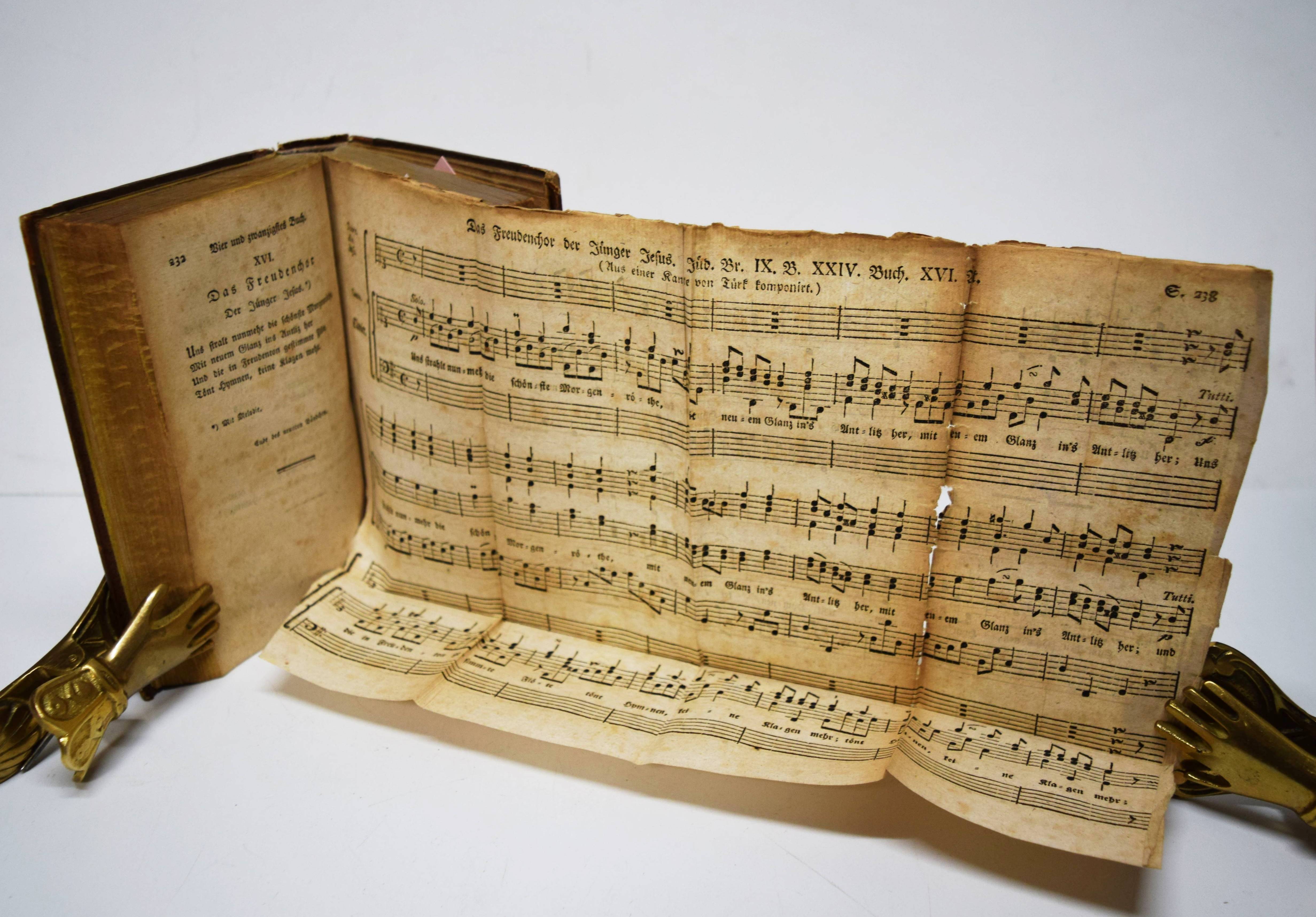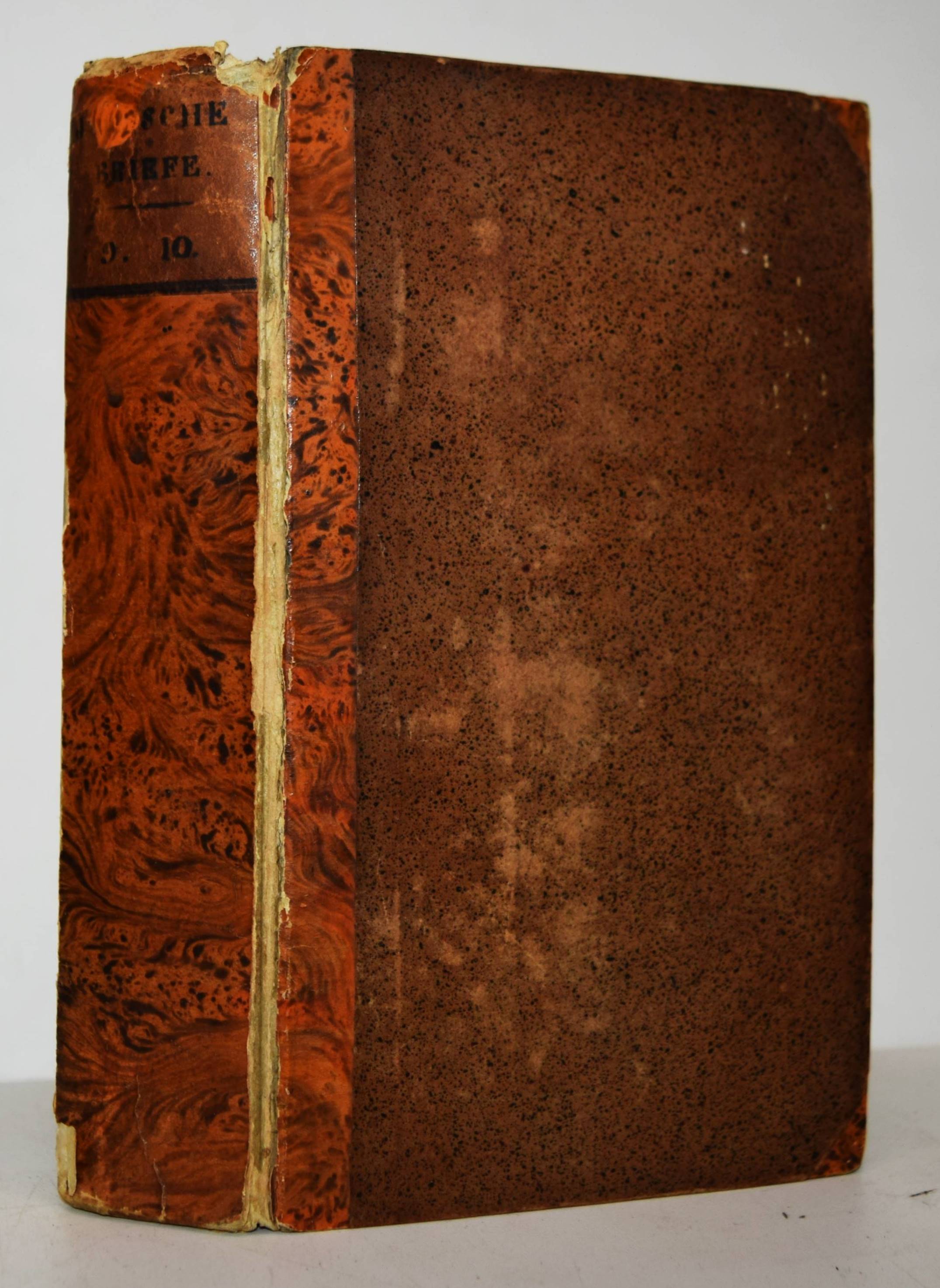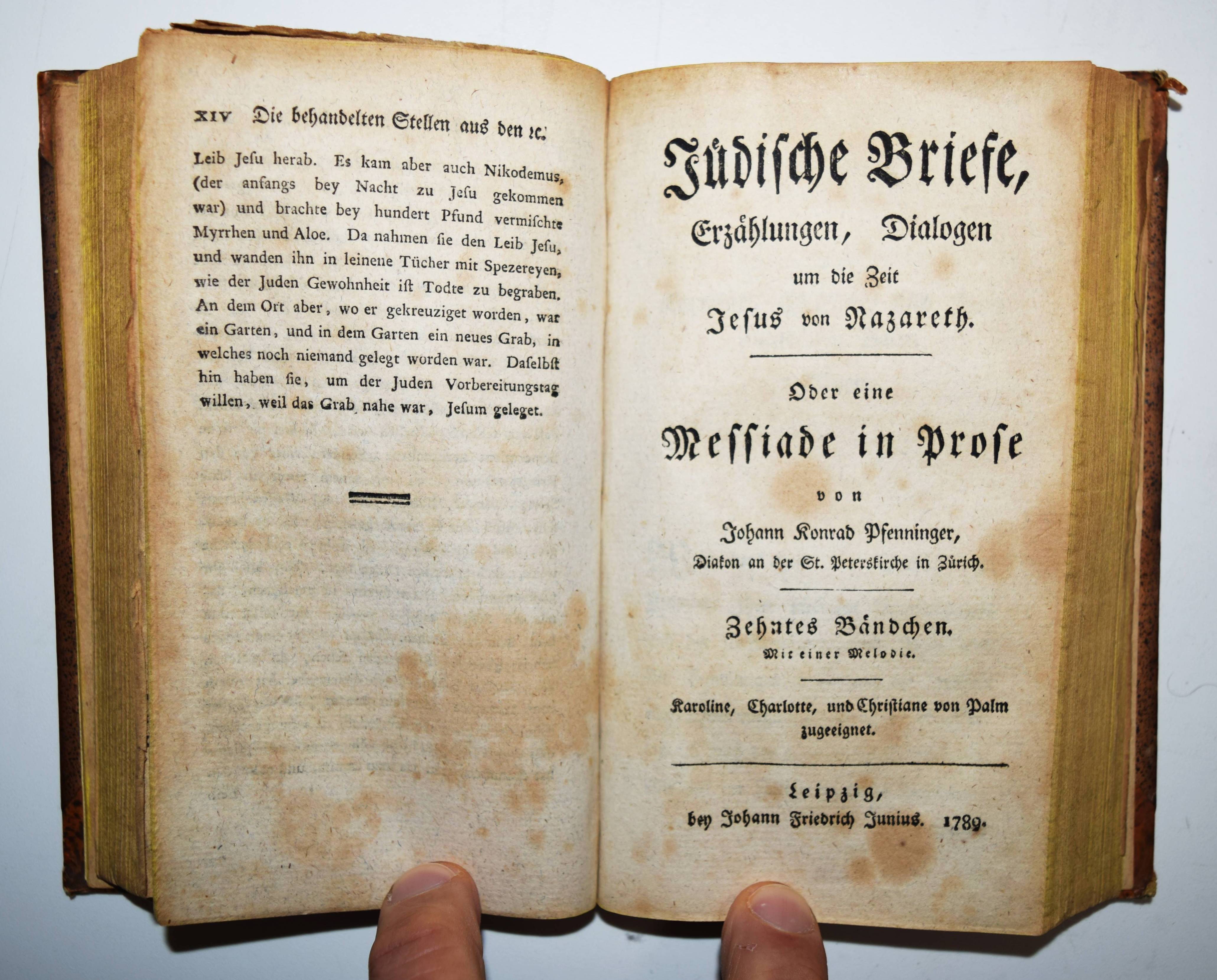 Pfenninger, Johann Konrad. Jüdische Briefe, Erzählungen, Dialogens um die Zeit Jesu, von Nazareth. Oder eine Messiade in Prose. Neuntes Bändchen. Mit einer Melodie. Wizenmann zugeeignet. (Und) zehntes Bändchen. Mit einer Melodie. Karoline, Charlotte, und Christiane von Palm zugeeignet. 2 Teile in 1 Band. Leipzig, Johann Friedrich Junius 1788 und 1789. Kl.-8°. XXIV, 232, XIV S.; XII, 268, XXIV S. mit 2 mehrfach gefalteten Musikbeilagen. Pappband des frühen 19. Jahrhundert mit Rückenschild. Fürst III, 84. Goedeke IV, 1, 286, 6. – Erste Ausgabe des neunten und zehnten Teils. Von 1783 bis 1792 erschienen 12 Teile. – „Das Werk umfaßt in 34 Büchern die Evangelien und die Apostelgeschichte. Es war auf wenigstens 14 Bände geplant und sollte noch die Briefe der Apostel, also das ganze Neue Testament umfassen. Es enthält auch mehrere Gedichte von Lavater“ (Goedeke). – Einband etwas berieben, Gelenke angeplatzt, stellenweise etwas braunfleckig, sonst gut erhalten.