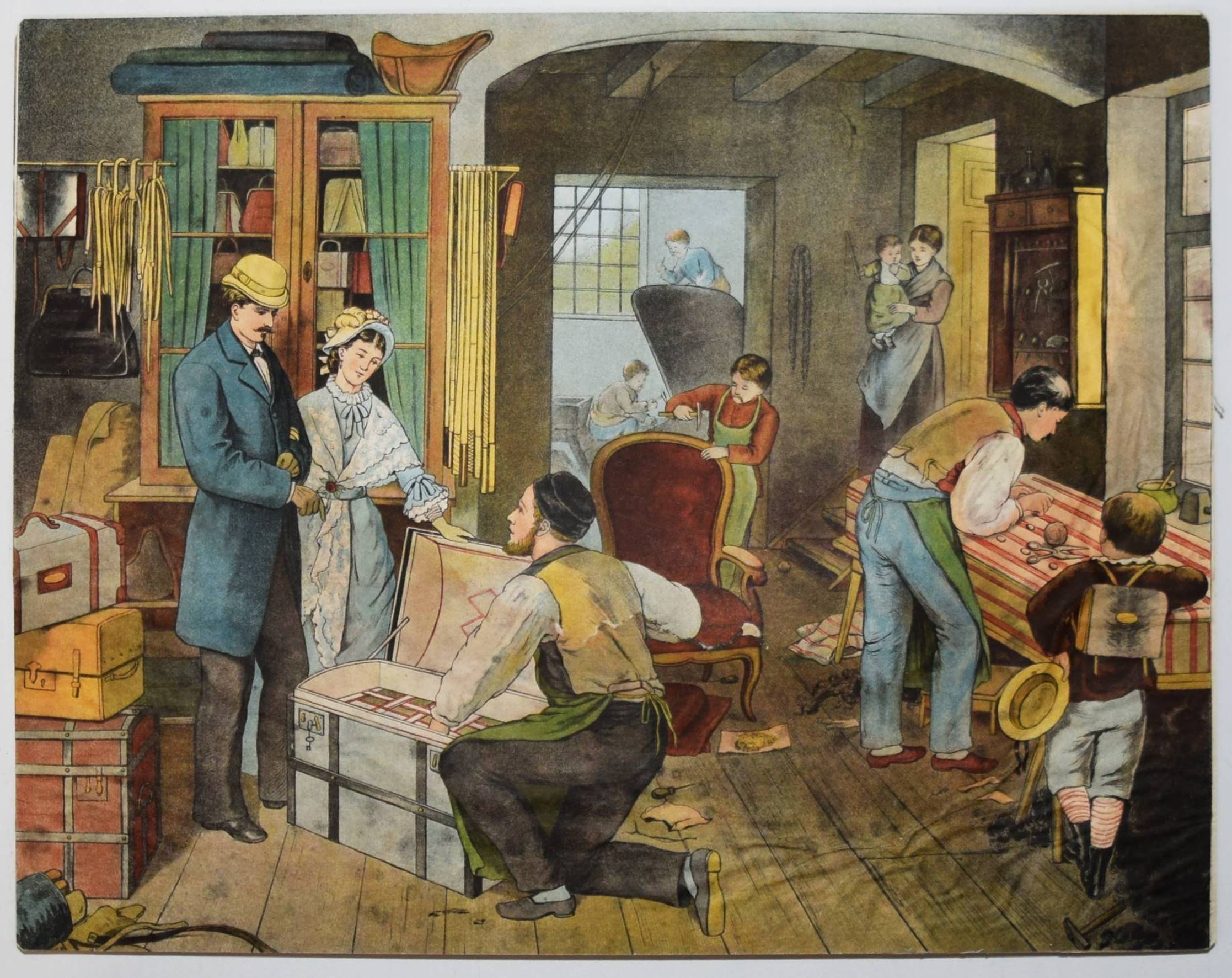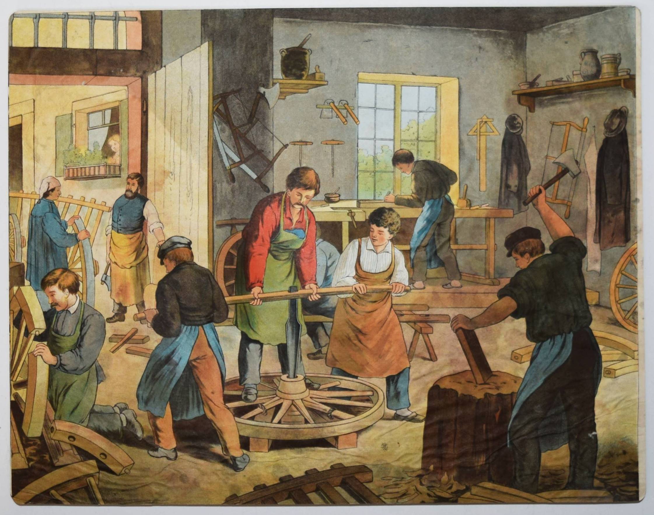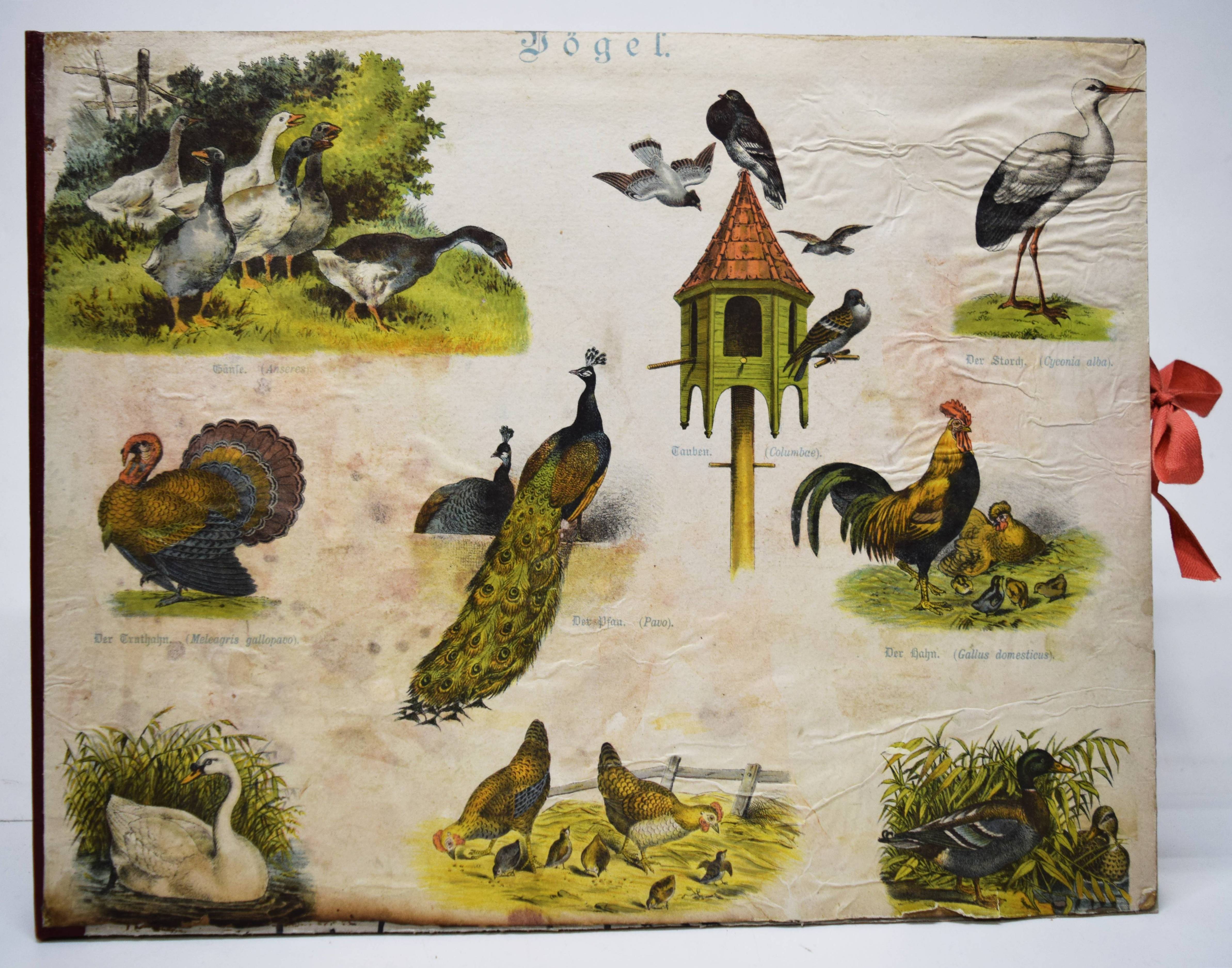 Bilderbogen, Anschauungs-Tafeln. Ohne, Ort, Druck und Jahr (um 1870). Quer-4° (28,5 x 36,5 cm.). 26 farblithographierte Tafeln, beidseitig auf Karton aufgezogen. Moderne Flügelmappe mit farblithgr. Deckelbild (Vögel). Dekorative farbig lithographierte Anschauungs-Bilder mit dreizehn Berufsdarstellungen (Maurer, Zimmermann, Landwirt, HufschmiedSchneider, Tischler etc.) und Kinderszenen (Besuch im Zoo und auf dem Jahrmarkt und Kinder beim Spielen) sowie Tiere. – 6 Tafeln sporfleckig, 1 Tafel (Maultier) am linken Rand mit Abriebstellen, sonst gut erhalten.