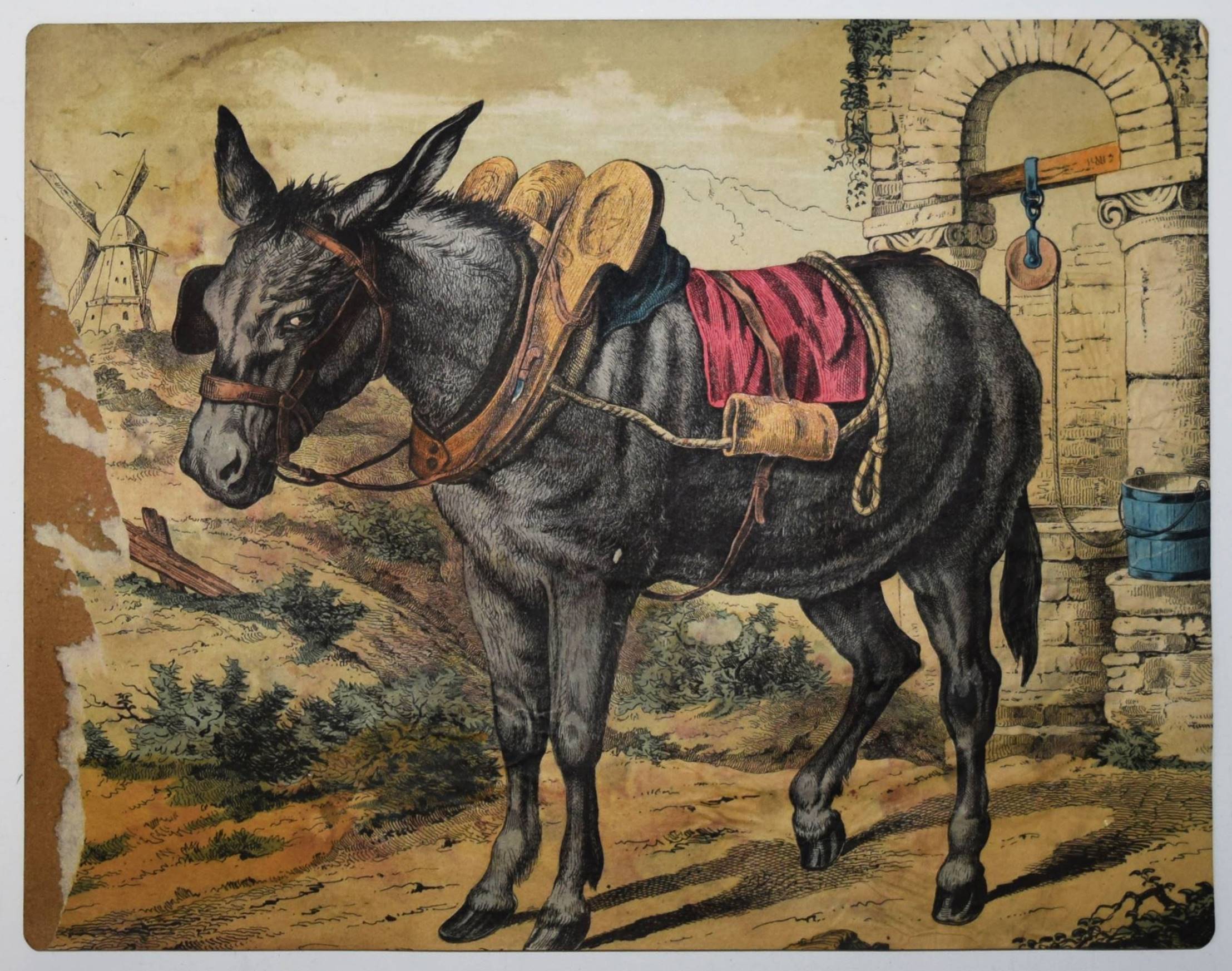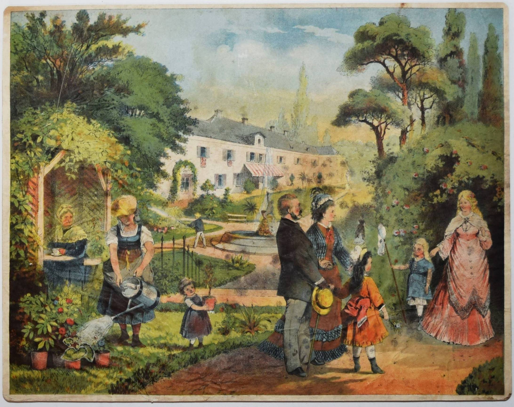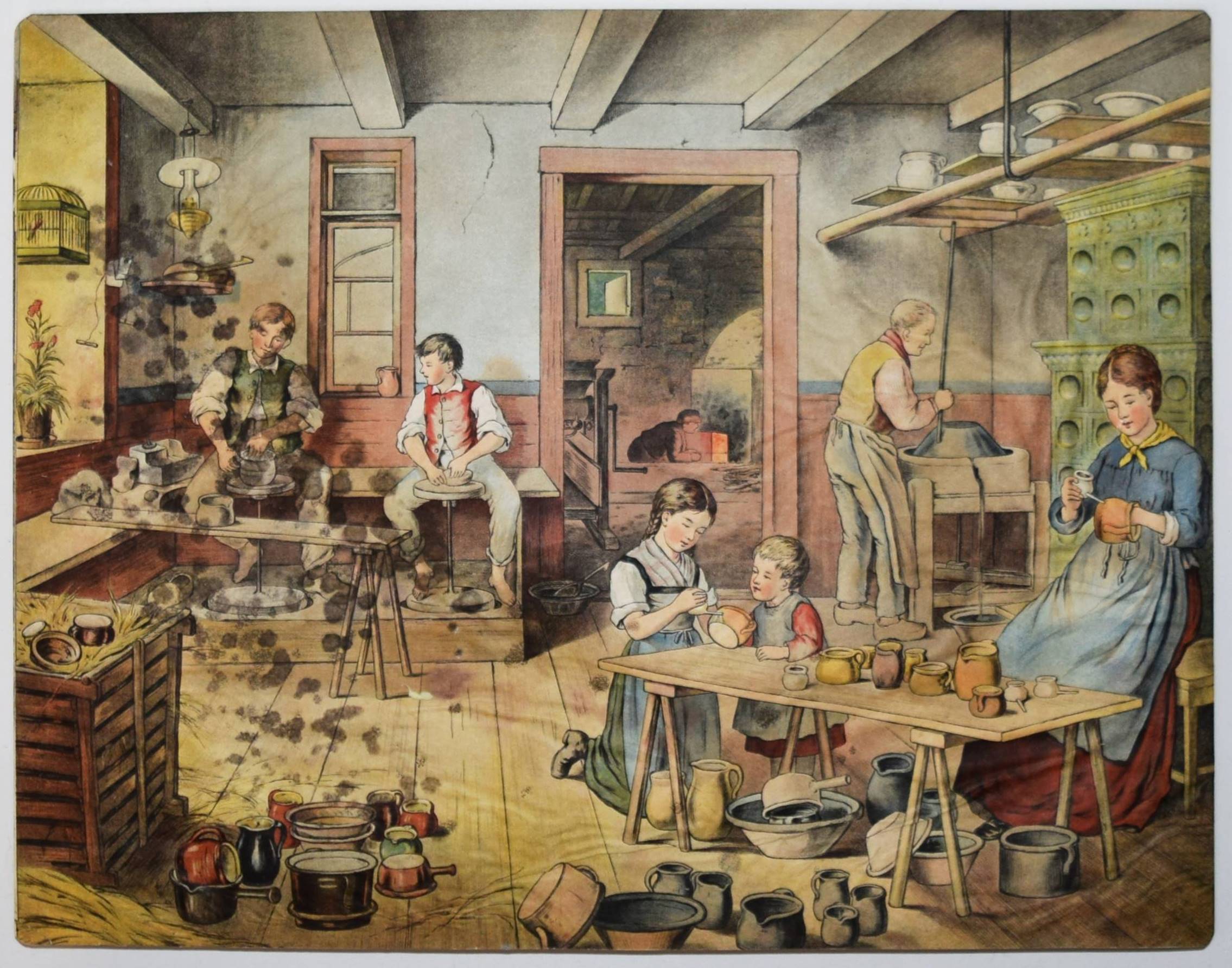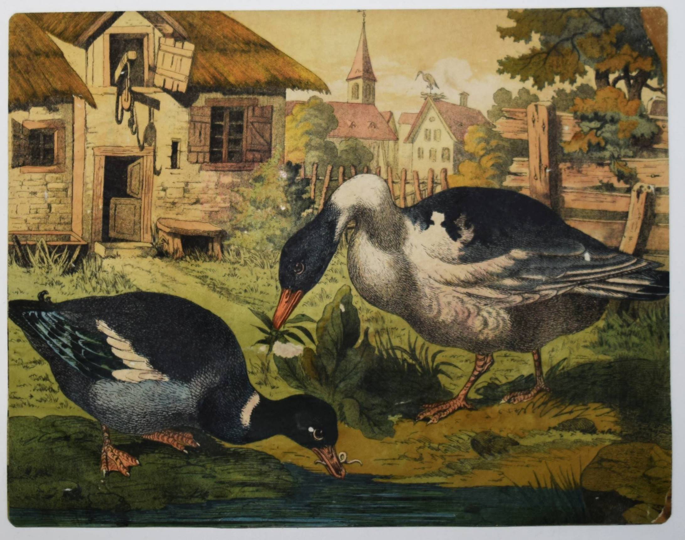 Bilderbogen, Anschauungs-Tafeln. Ohne, Ort, Druck und Jahr (um 1870). Quer-4° (28,5 x 36,5 cm.). 26 farblithographierte Tafeln, beidseitig auf Karton aufgezogen. Moderne Flügelmappe mit farblithgr. Deckelbild (Vögel). Dekorative farbig lithographierte Anschauungs-Bilder mit dreizehn Berufsdarstellungen (Maurer, Zimmermann, Landwirt, HufschmiedSchneider, Tischler etc.) und Kinderszenen (Besuch im Zoo und auf dem Jahrmarkt und Kinder beim Spielen) sowie Tiere. – 6 Tafeln sporfleckig, 1 Tafel (Maultier) am linken Rand mit Abriebstellen, sonst gut erhalten.