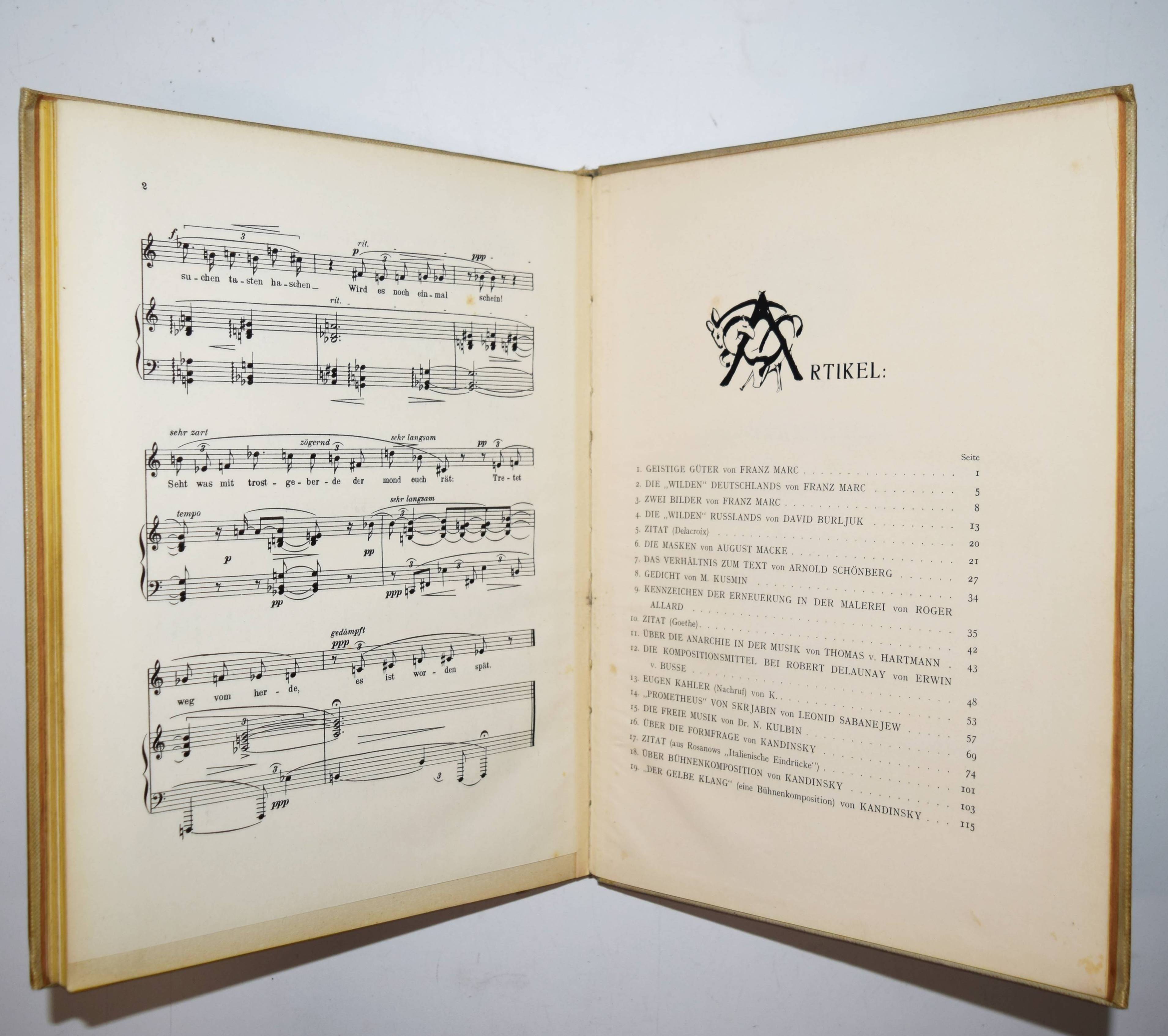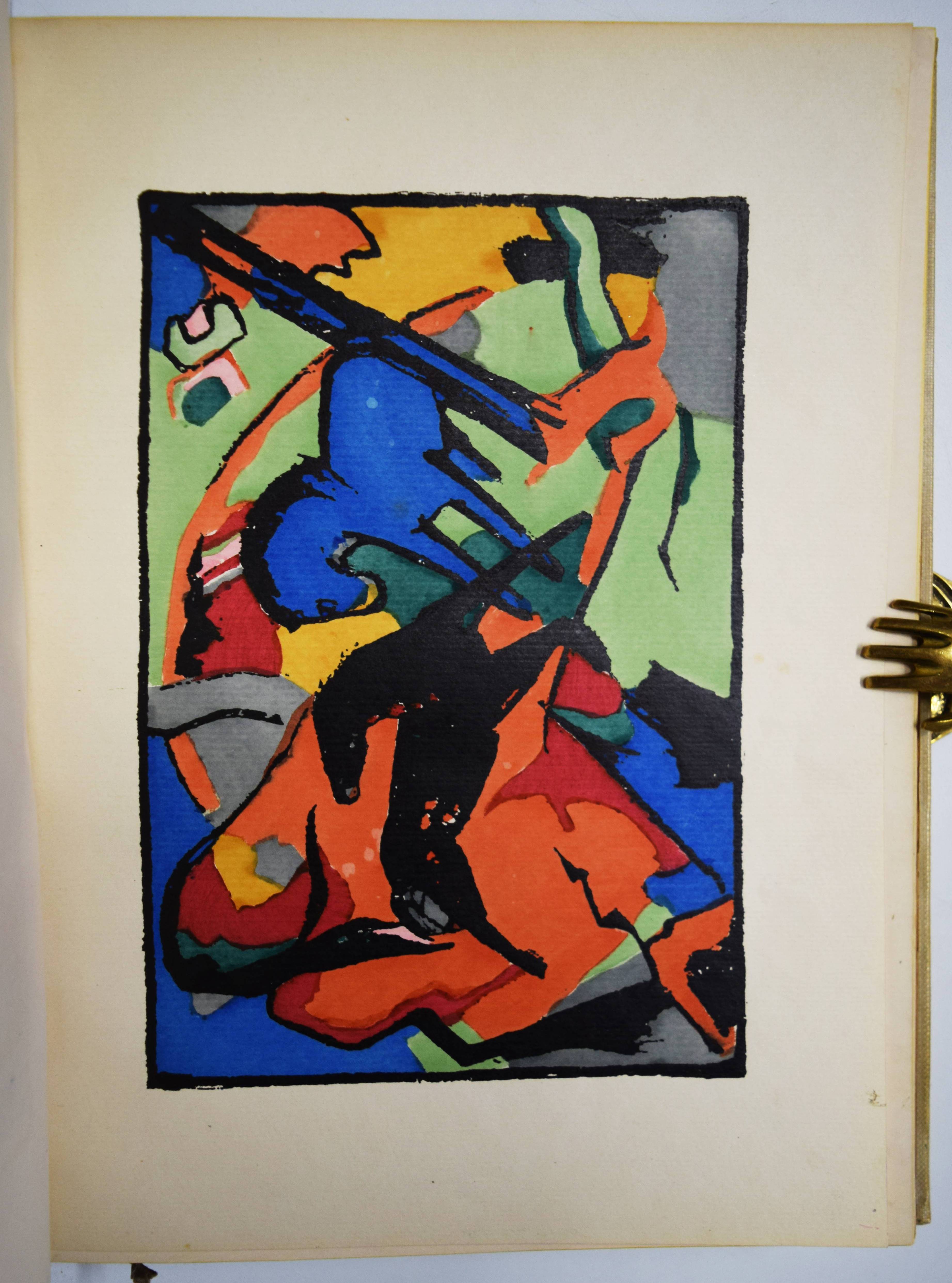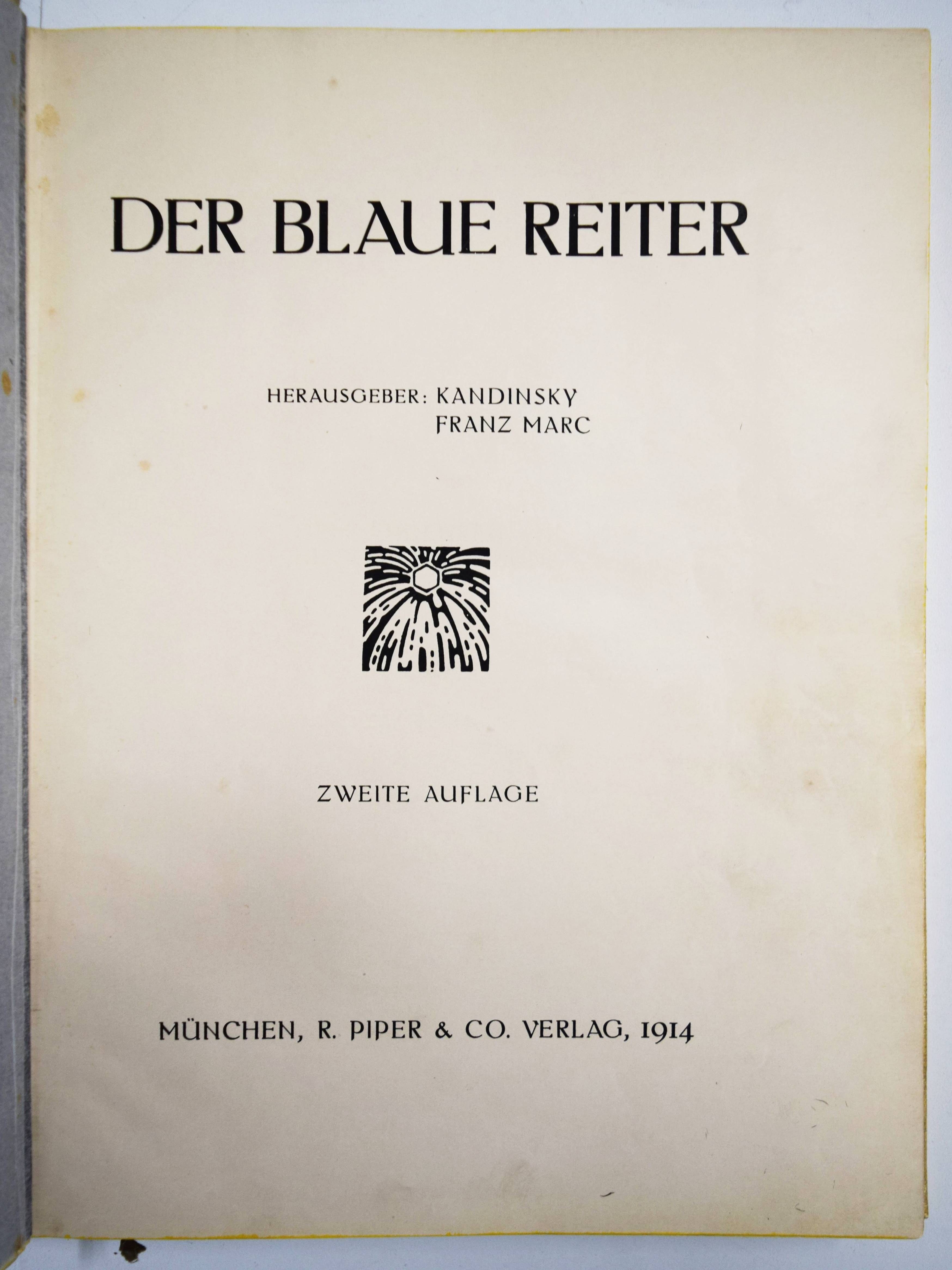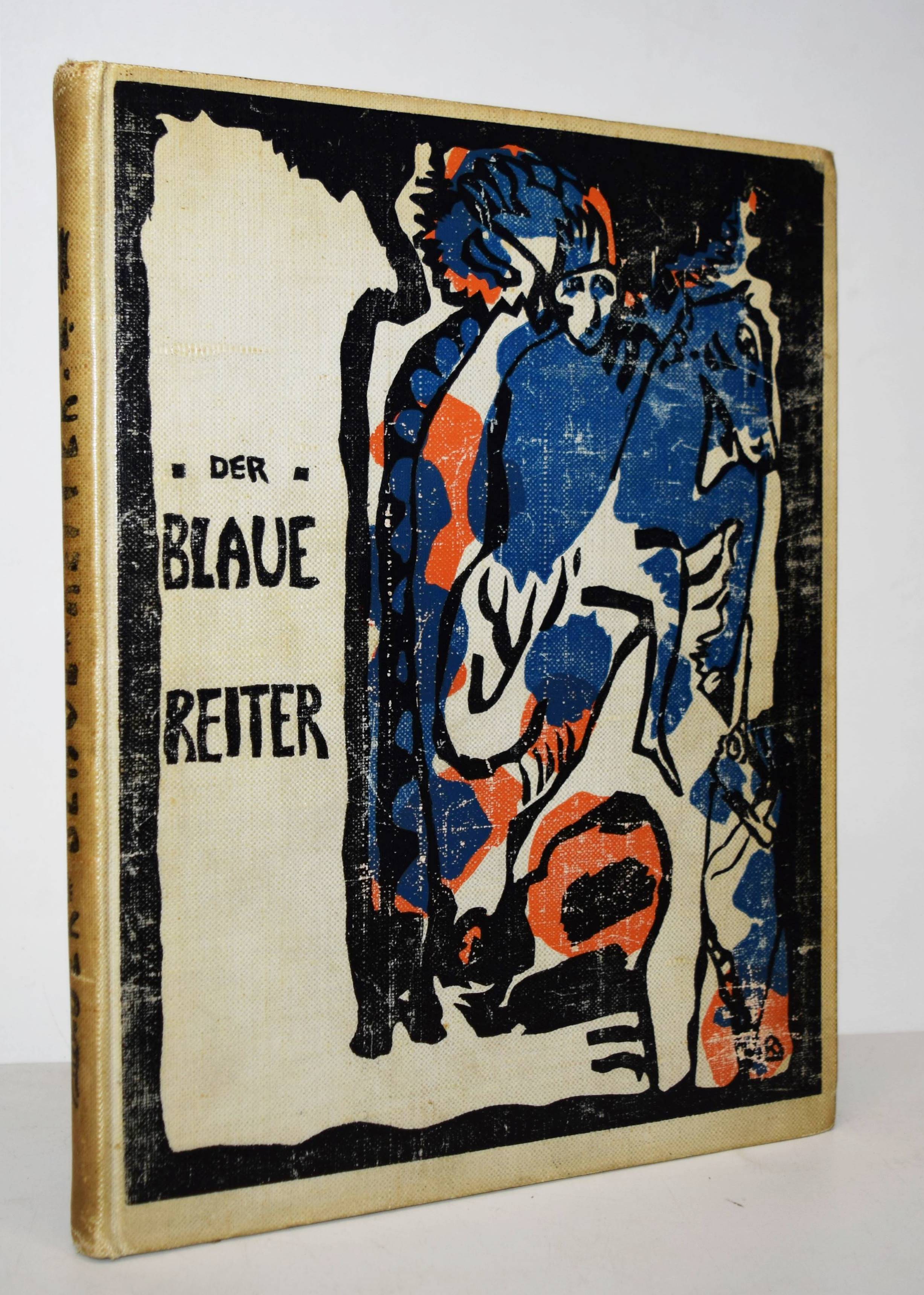 Kandinsky, Wassily und Franz Marc (Hrsg.). Der Blaue Reiter. 2. Auflage. München, R. Piper & Co. 1914. 4° (30 x 23 cm.). [5] Bl., 140 S. mit 4 pochoirkolorierten Tafeln, darunter 2 nach Kandinsky und Marc, 30 Tafeln, 3 (2 gefalt., 1 doppelblattgr.) Musikbeilagen, 8 Initialen und Vignetten sowie zahlr. Abbildungen im Text. Hellgrauer farbig illustr. Orig.-Leinenband mit Galvano nach einem Farbholzschnitt von Kandinsky in den Farben Schwarz, Blau und Rot sowie einer Vignette Kandinskys auf dem Hinterdeckel. Dokumentations-Bibliothek VI, 553. Jentsch 5. Lankheit, Der Blaue Reiter, Dokumentarische Neuausgabe, München 1965, S. 280. Lang S. 147. Reed 160. Roethel 141 und S. 450, 10, 3. The Artist and the Book 139 (die vorl. zweite Auflage). Vom Jugendstil zum Bauhaus Nr. 83. – Eines von 1200 Exemplaren. Mit neuem Vorwort von W. Kandinsky und F. Marc. – Der Almanach „Der blaue Reiter“ gilt als „die bedeutendste Programmschrift der Kunst des 20. Jahrhunderts“ (Hans Bolliger). – „Die Herausgeber Marc und Kandinsky verstanden den Almanach als das Sprachrohr der ‚Epoche des Großen Geistigen‘ wie es im Vorwort von 1911 hieß. Gegen die Zeit der materiellen Kunst des 19. Jahrhunderts wollte man die Kunst des Geistigen setzen.“ (J. Lammers, im Katalog Vom Jugendstil zum Bauhaus). – Kandinsky schrieb am 11. Juni 1911 an seinen Freund F. Marc über seine Idee, mit ihm einen Almanach mit zahlr. Beiträgen anderer Künstler herauszugeben: „In dem Buch muß sich das ganze Jahr spiegeln, und eine Kette zur Vergangenheit und ein Strahl in die Zukunft müssen diesem Spiegel das volle Leben geben“ (vgl. Roethel S. 450). – „The philosophy behind this almanac is one of the most important concepts of the twentieth century art scene“ (Reed). – Mit Illustrationen von Kandinsky, Marc, Kirchner, Arp, Nolde, Klee, Pechstein, Kubin u. v. a., sowie Textbeiträgen von Marc, Kandinsky, Macke, Schönberg u. a. Die Musikbeilagen mit Partituren von Arnold Schönberg, Alband Berg und Anton v. Webern und Texten von M. Maeterlink, Alfred Mombert und Stefan George. – Einband etwas berieben und leicht angestaubt, Seidenhemdchen der ersten Farbtafel (Frontispiz) mit Knickspuren und Eckabriss, sonst sehr gut erhalten.