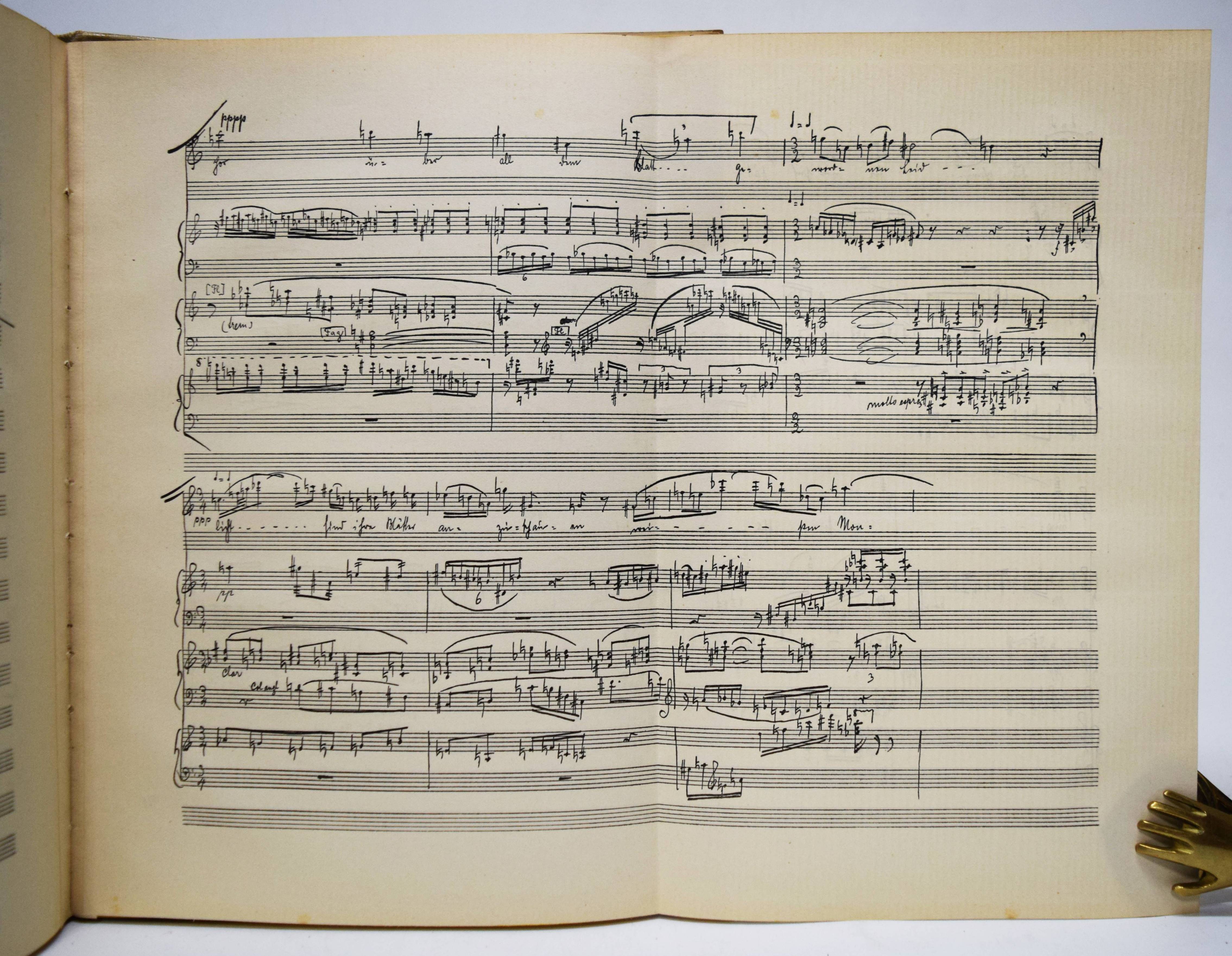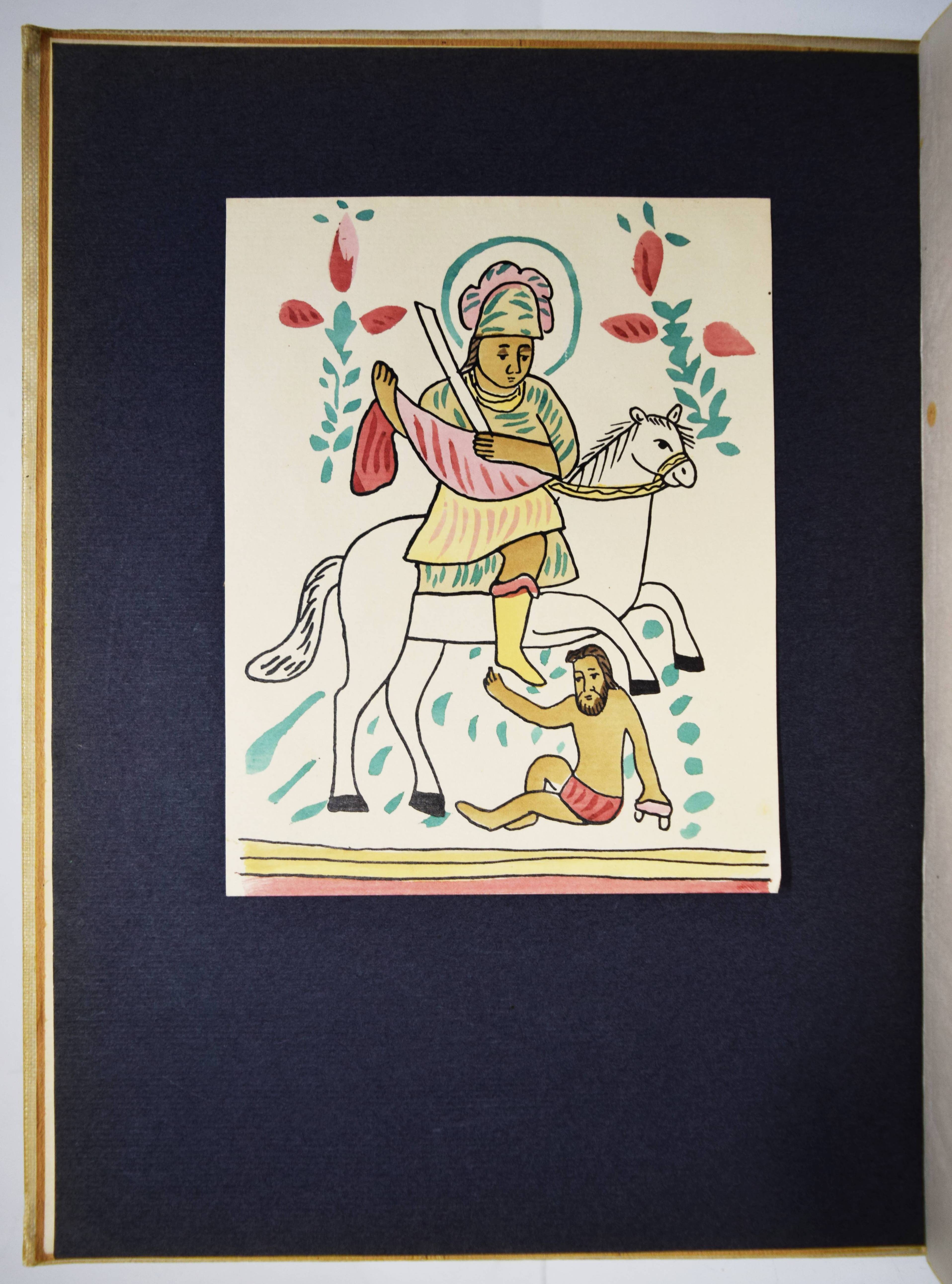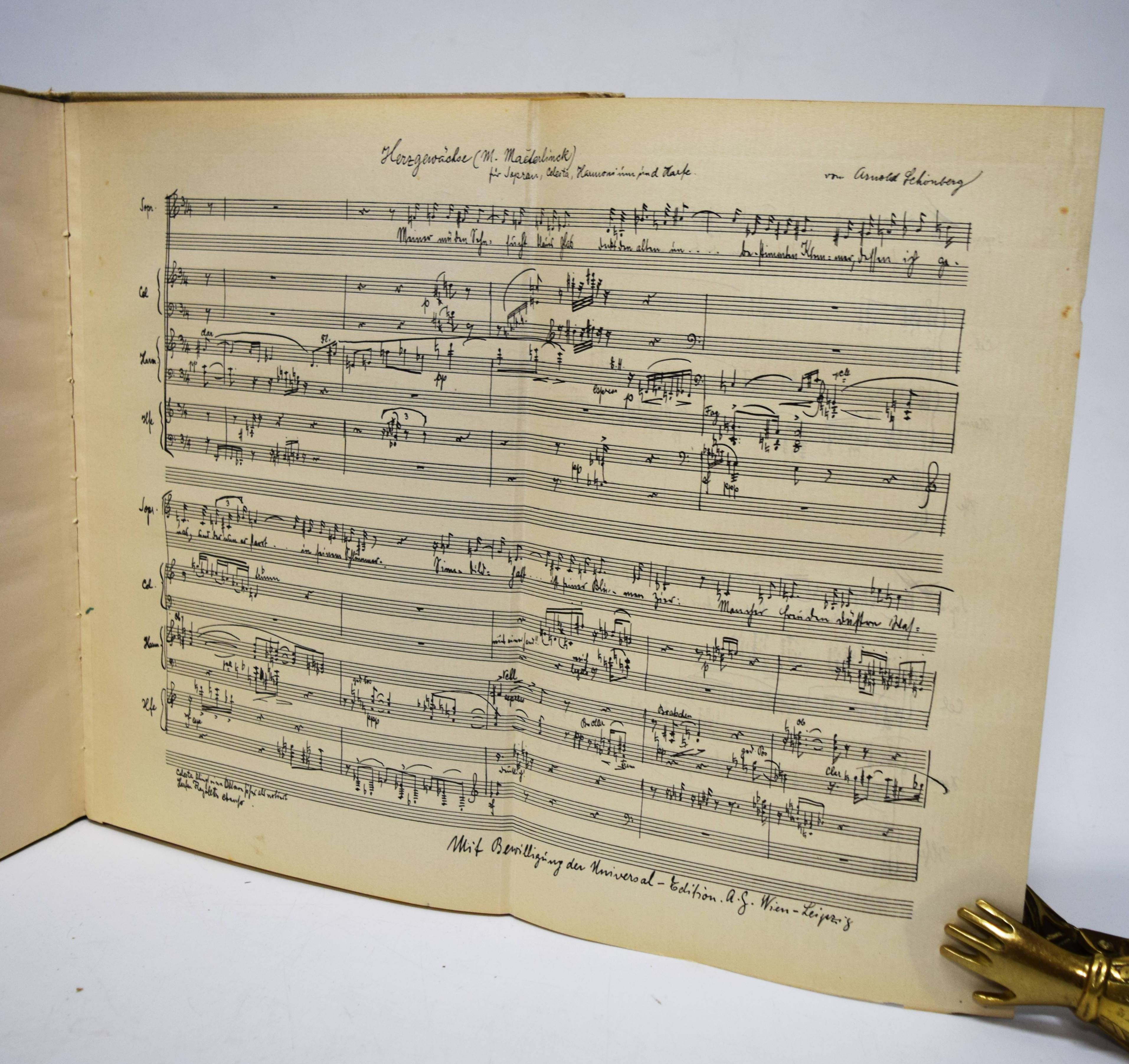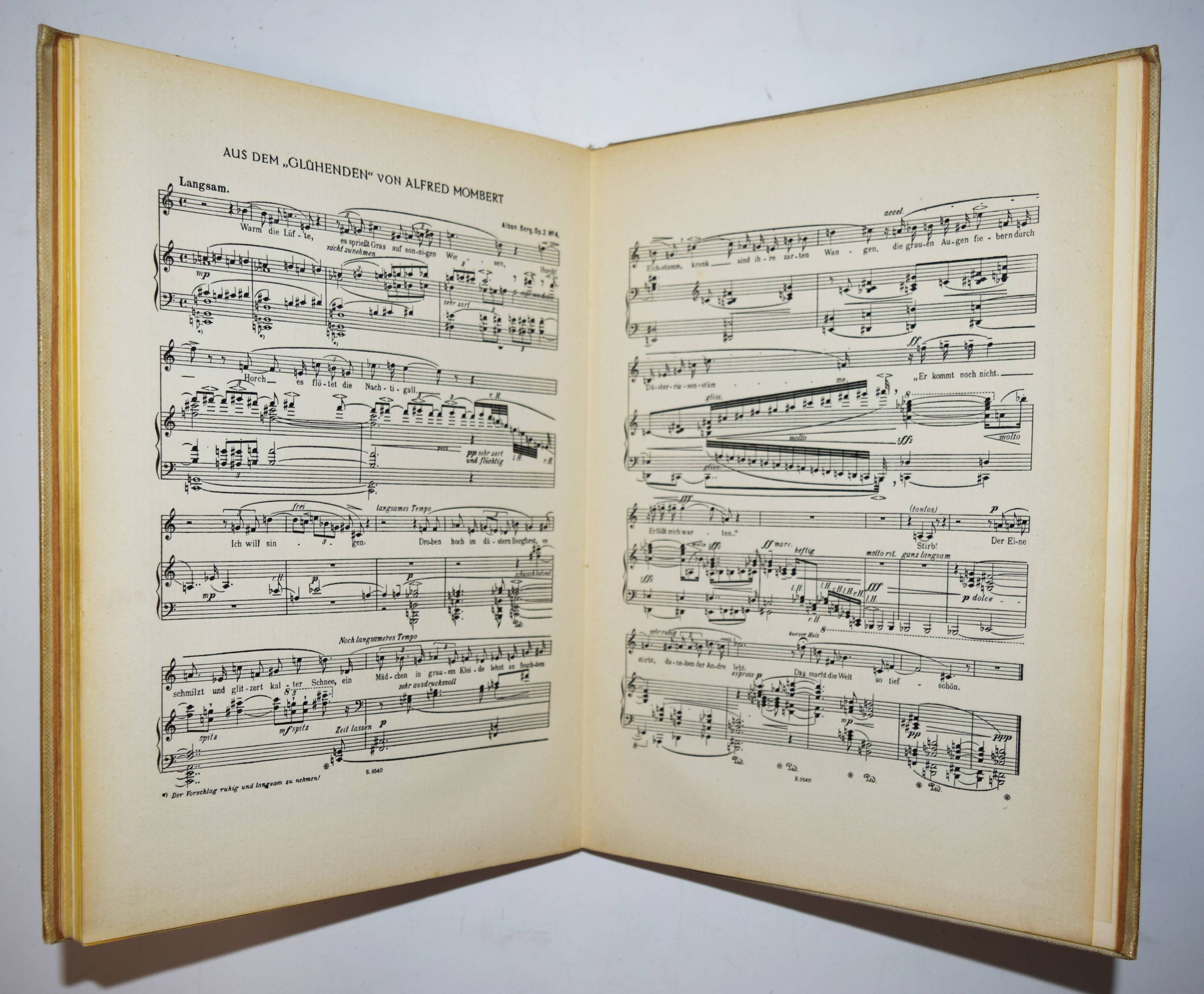 Kandinsky, Wassily und Franz Marc (Hrsg.). Der Blaue Reiter. 2. Auflage. München, R. Piper & Co. 1914. 4° (30 x 23 cm.). [5] Bl., 140 S. mit 4 pochoirkolorierten Tafeln, darunter 2 nach Kandinsky und Marc, 30 Tafeln, 3 (2 gefalt., 1 doppelblattgr.) Musikbeilagen, 8 Initialen und Vignetten sowie zahlr. Abbildungen im Text. Hellgrauer farbig illustr. Orig.-Leinenband mit Galvano nach einem Farbholzschnitt von Kandinsky in den Farben Schwarz, Blau und Rot sowie einer Vignette Kandinskys auf dem Hinterdeckel. Dokumentations-Bibliothek VI, 553. Jentsch 5. Lankheit, Der Blaue Reiter, Dokumentarische Neuausgabe, München 1965, S. 280. Lang S. 147. Reed 160. Roethel 141 und S. 450, 10, 3. The Artist and the Book 139 (die vorl. zweite Auflage). Vom Jugendstil zum Bauhaus Nr. 83. – Eines von 1200 Exemplaren. Mit neuem Vorwort von W. Kandinsky und F. Marc. – Der Almanach „Der blaue Reiter“ gilt als „die bedeutendste Programmschrift der Kunst des 20. Jahrhunderts“ (Hans Bolliger). – „Die Herausgeber Marc und Kandinsky verstanden den Almanach als das Sprachrohr der ‚Epoche des Großen Geistigen‘ wie es im Vorwort von 1911 hieß. Gegen die Zeit der materiellen Kunst des 19. Jahrhunderts wollte man die Kunst des Geistigen setzen.“ (J. Lammers, im Katalog Vom Jugendstil zum Bauhaus). – Kandinsky schrieb am 11. Juni 1911 an seinen Freund F. Marc über seine Idee, mit ihm einen Almanach mit zahlr. Beiträgen anderer Künstler herauszugeben: „In dem Buch muß sich das ganze Jahr spiegeln, und eine Kette zur Vergangenheit und ein Strahl in die Zukunft müssen diesem Spiegel das volle Leben geben“ (vgl. Roethel S. 450). – „The philosophy behind this almanac is one of the most important concepts of the twentieth century art scene“ (Reed). – Mit Illustrationen von Kandinsky, Marc, Kirchner, Arp, Nolde, Klee, Pechstein, Kubin u. v. a., sowie Textbeiträgen von Marc, Kandinsky, Macke, Schönberg u. a. Die Musikbeilagen mit Partituren von Arnold Schönberg, Alband Berg und Anton v. Webern und Texten von M. Maeterlink, Alfred Mombert und Stefan George. – Einband etwas berieben und leicht angestaubt, Seidenhemdchen der ersten Farbtafel (Frontispiz) mit Knickspuren und Eckabriss, sonst sehr gut erhalten.