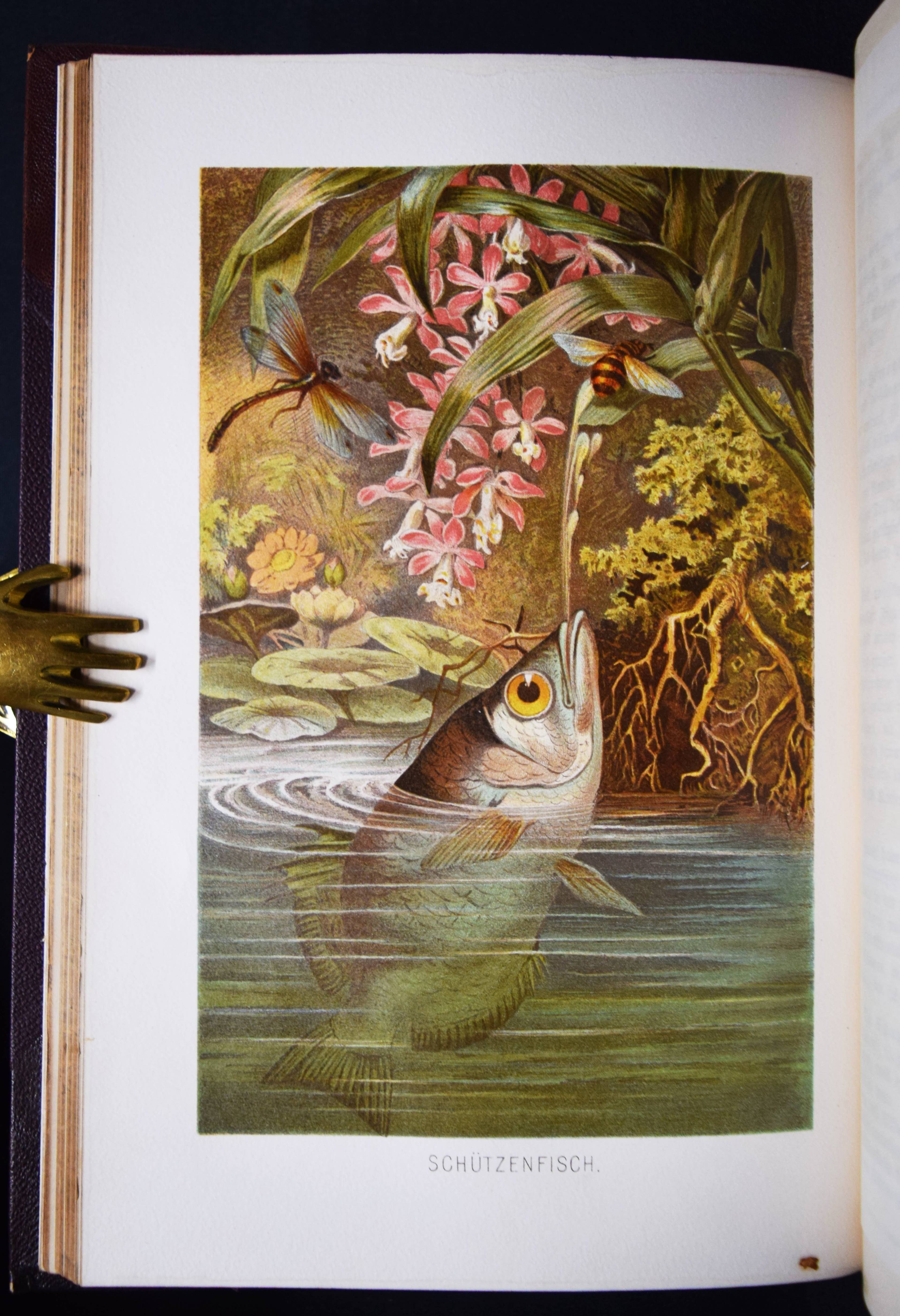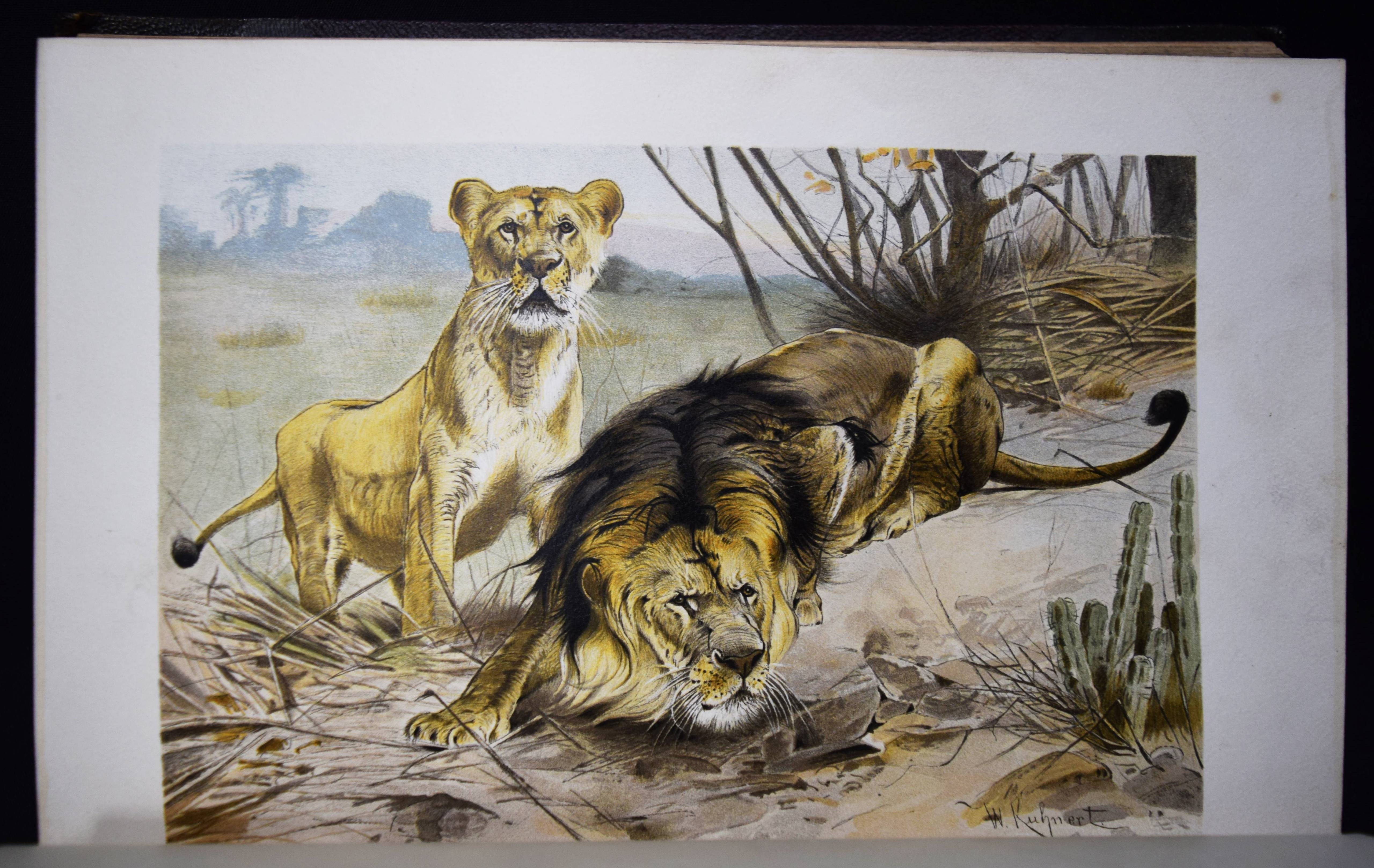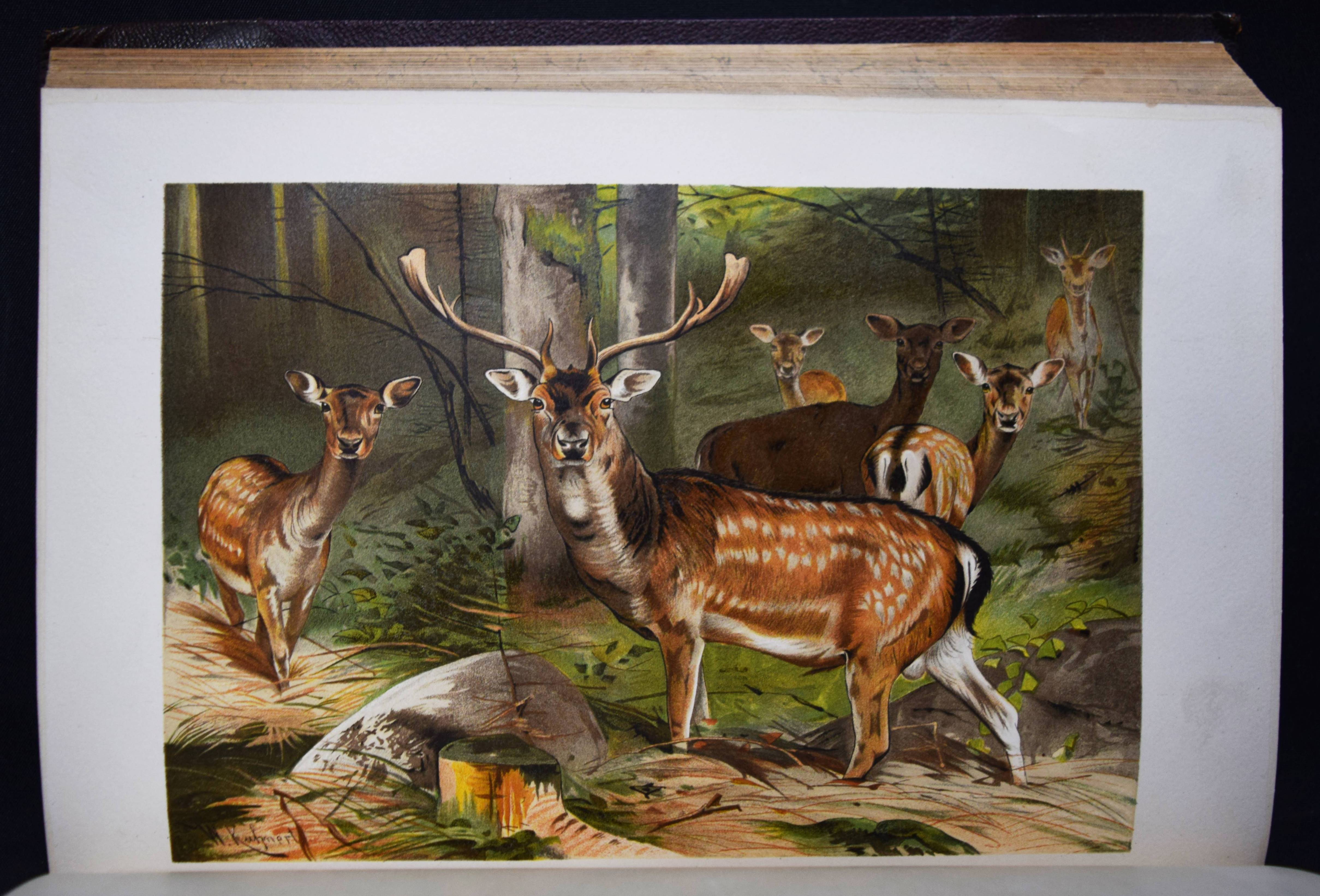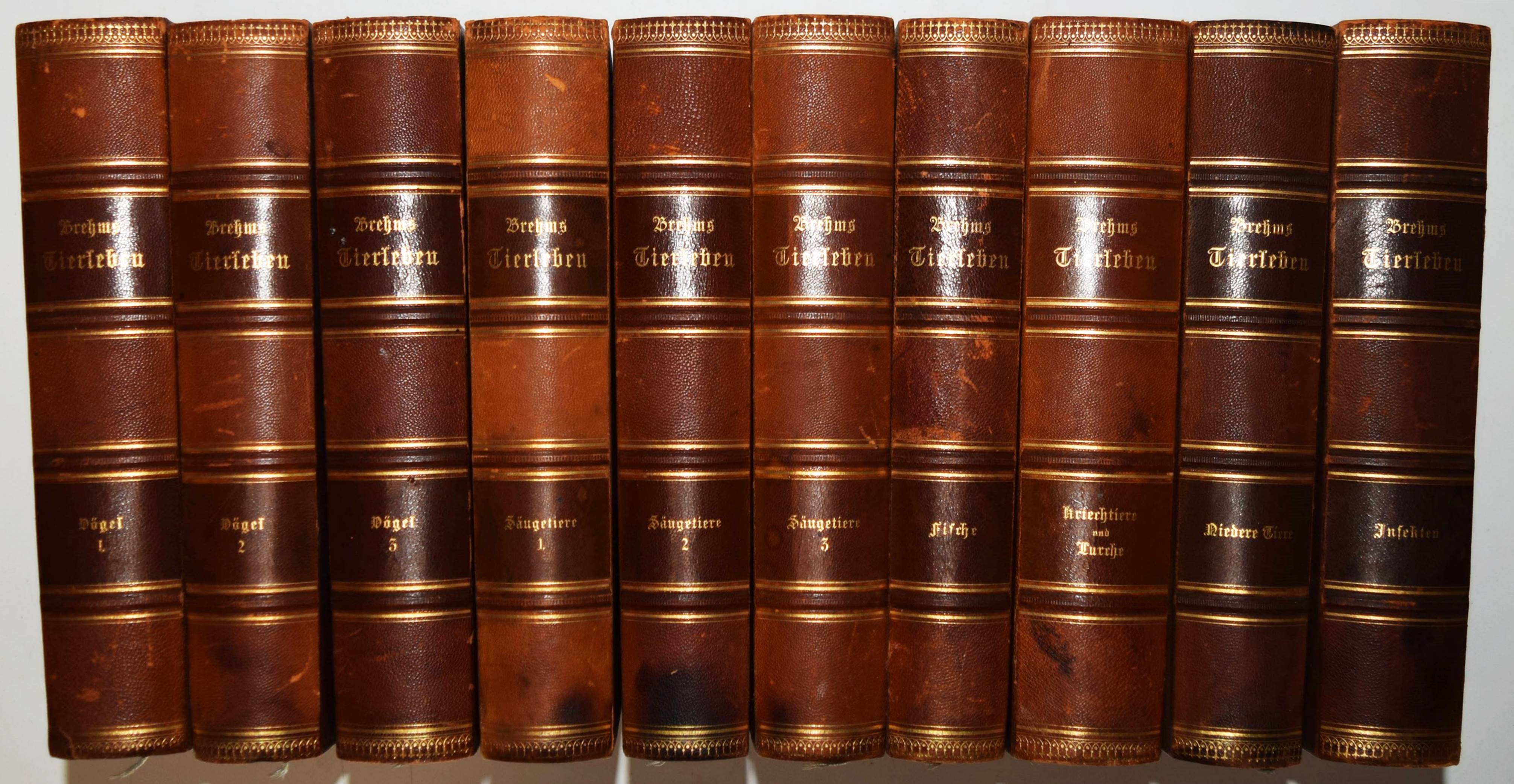 Brehm, (Alfred Edmund). Brehms Tierleben. Allgemeine Kunde des Tierreichs. 3. gänzlich neubearb. Auflage von (Eduard) Pechel-Loesche. 10 Bände. Leipzig, Wien, Bibliographische Institut 1890-1893. Gr.-8° (25,5 x 18 cm.). Mit 180 Tafeln in Chromolithographie und Holzschnitt, 11 Karten und 1910 Textabb. Orig.-Halbledereinbände mit goldgepr. Rückentiteln und Rückenvergoldung. KNLL III, 117. Nissen, IVB 138. – Beste Ausgabe mit den schönen chromolithographierten Tafeln. – I. bis III. Säugetiere. – IV. bis VI. Vögel. – VII. Kriechtiere und Lurche. – VIII. Fische. – IX. Insekten. – X. Niedere Tiere. – „Der besondere Reiz und damit wohl auch ein wichtiges Element des literarischen Werks von Brehms Tierschilderungen liegt in seiner von genialer Intuition geleiteten Deutung der Tierseele…“ (KNLL). – Der Geograph und Afrikaforscher E. Pechel-Loesche (1840-1913) war seit 1895 Professor an der Universität Erlangen. – Rücken teils etwas berieben, Vorderdeckel von Band IX fleckig, gutes Exemplar.