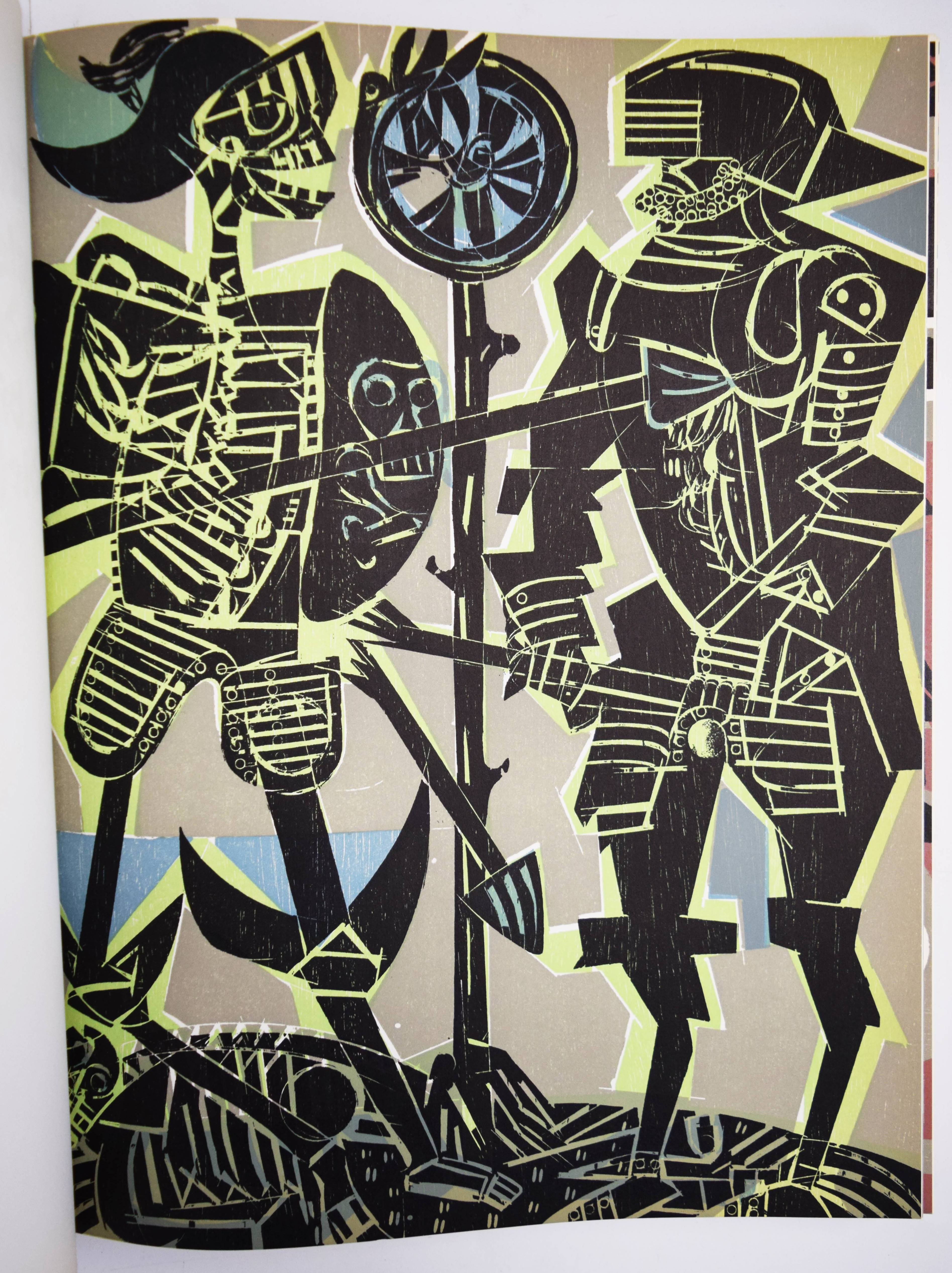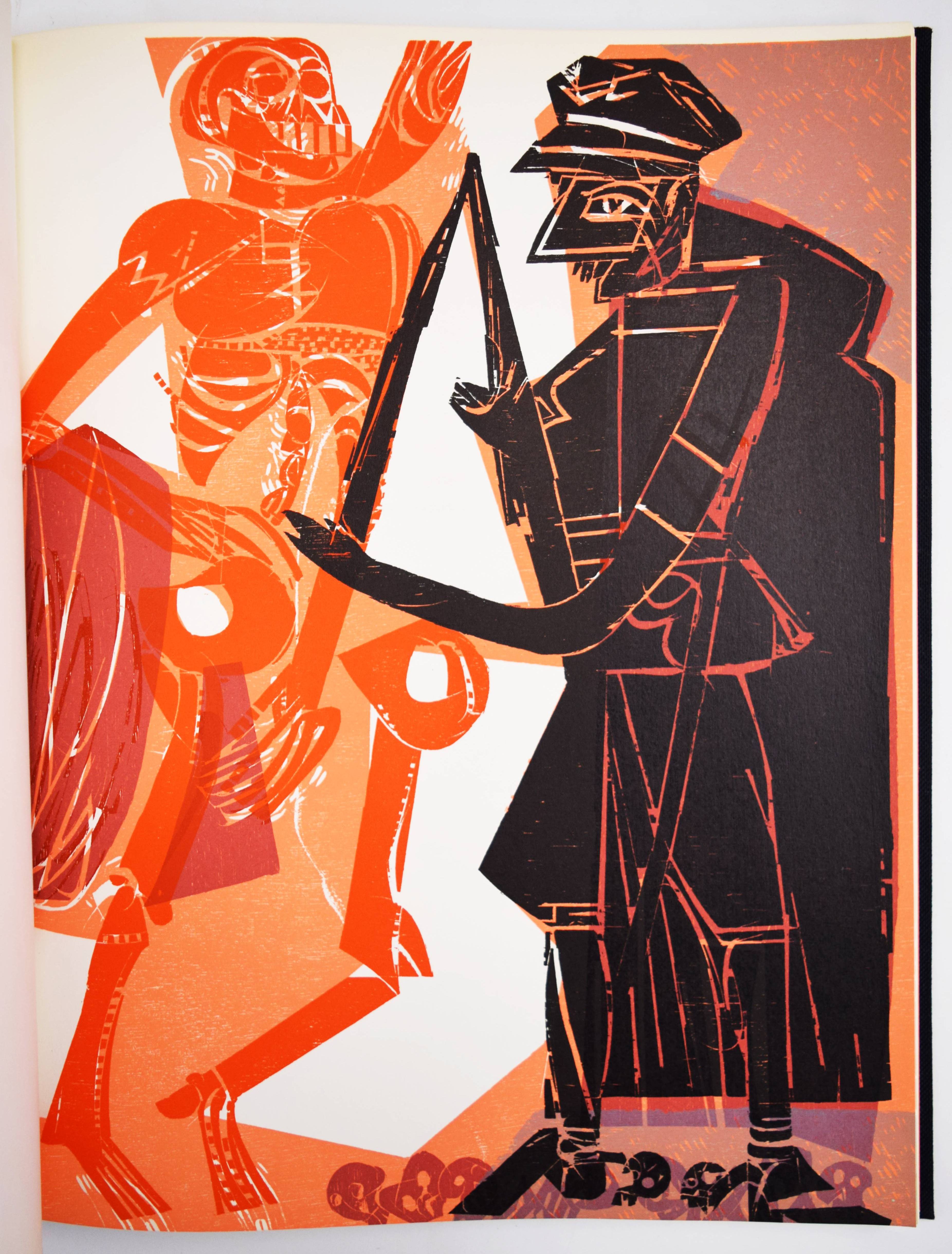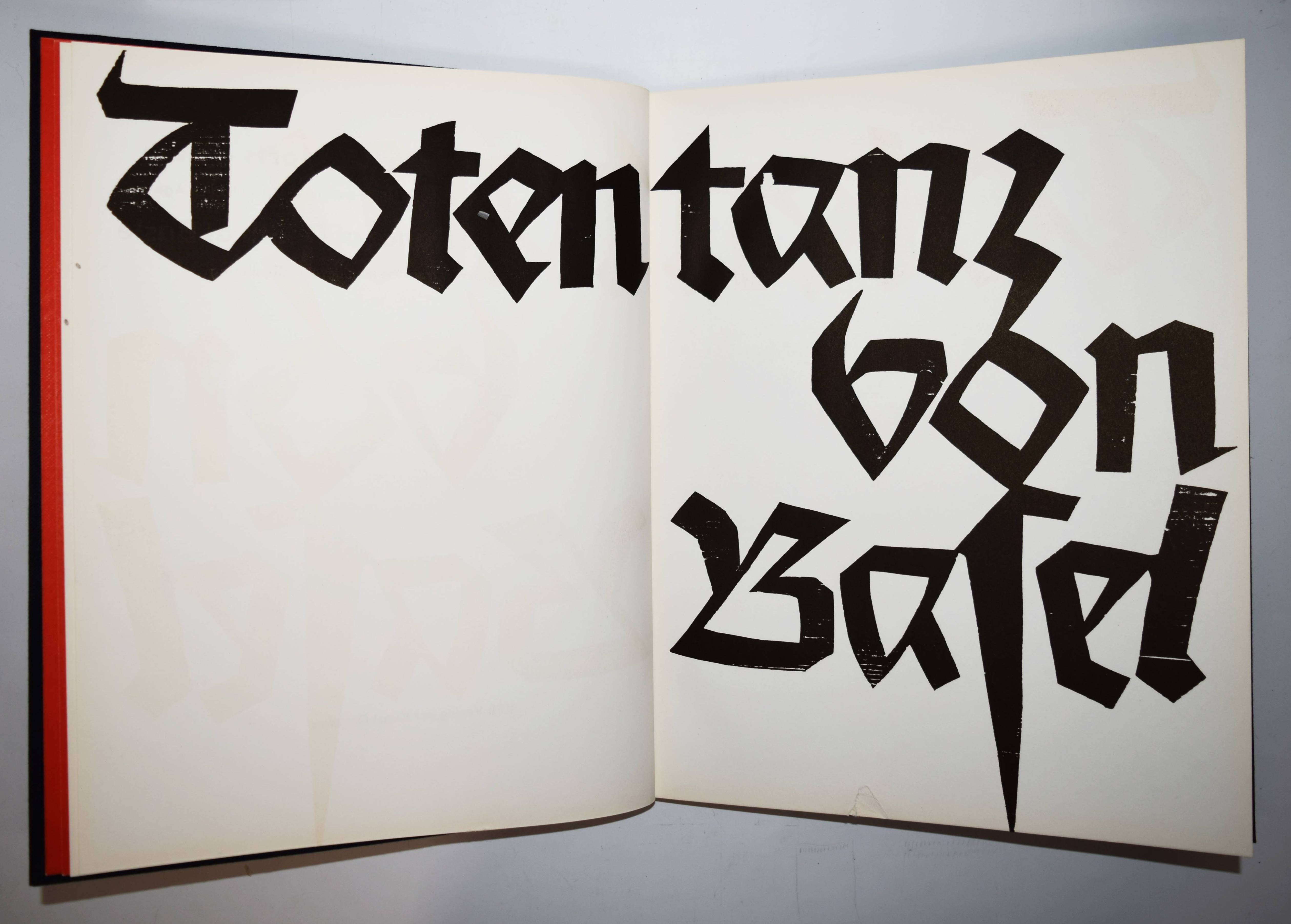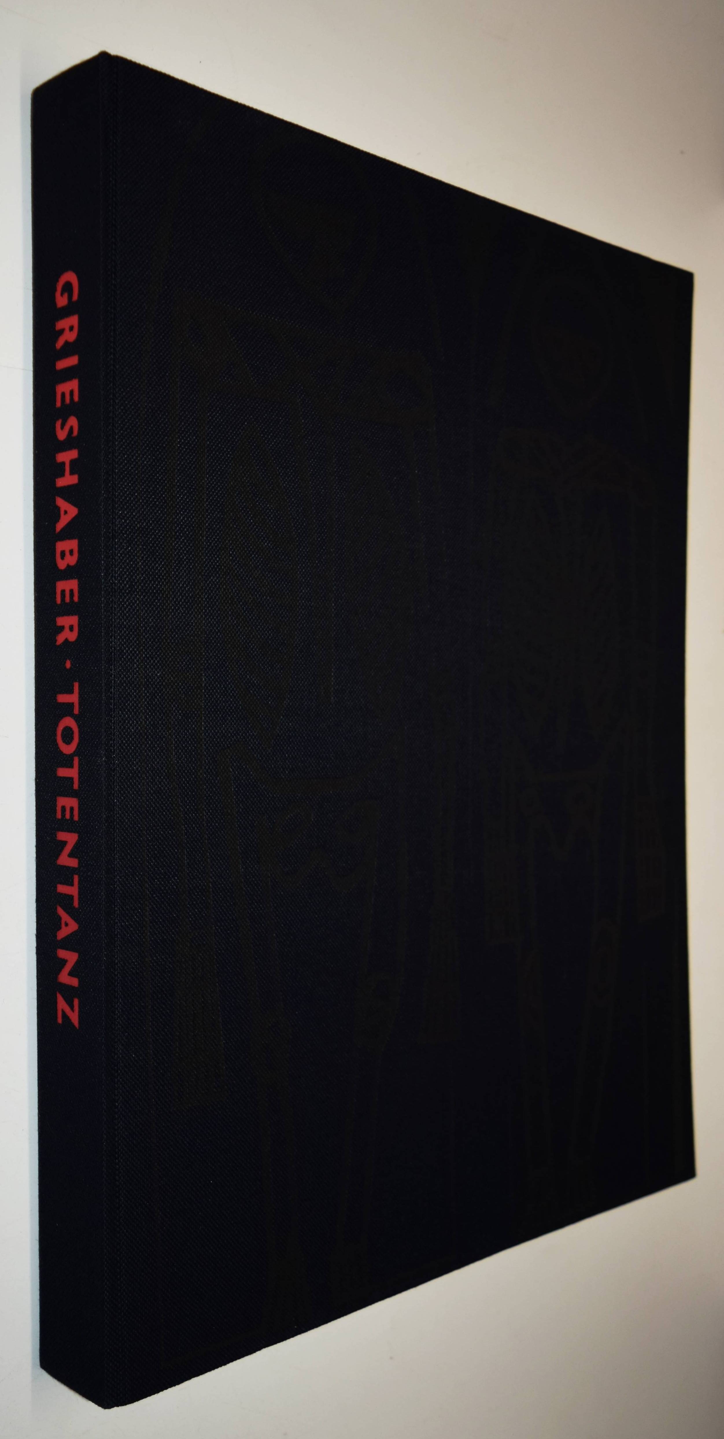 Grieshaber, HAP. Totentanz von Basel. Mit den Dialogen des mittelalterlichen Wandbildes. – The dance of death at Basle. – La danse des morts à Bâle. – (Mit einem Nachwort von Rudolf Meyer). Dresden, Verlag der Kunst 1966. Folio. 40 Bl., 2 Bl., VII S. mit 40 Orig.-Farbholzschnitten. Orig.-Leinenband mit goldgepr. Deckelillustration und Schutzumschlag. (4. Druck der Leipziger Presse). Fichtner 55. Fürst 66/1-40. „Ihr müßt alle nach meiner Pfeife tanzen“. Ausst.-Kat. Herzog August Bibliothek und Bibliothek Otto Schäfer 2000/2001, S. 241 ff. Spindler 65, 4. Tiessen III, 9. „Zum Sterben schön“. Ausst.-Kat. Schnütgen Museum Köln 2006, No. 106. – Erste Ausgabe. – Dreisprachiger Text. Die Schriften für die deutschen Texte entwarf Albert Kapr, sie wurden in Holz geschnitten. Sämtliche Holzschnitte wurden von den Originalstöcken in den Werkstätten der Leipziger Hochschule für Grafik und Buchkunst gedruckt. – „Ein Totentanz von vierzig Paaren, mit handwerklicher Beharrlichkeit in Holz geschnitten vom 24. Dezember 1965 bis zum 13. Juni 1966 … der Knochenmann als Schnitter, Totengräber oder Spielmann“ (Nachwort). – „Das Buch erregte 1966 auf der Buchmesse in Frankfurt a. M. großes Aufsehen und ebenso die zahlreichen Ausstellungen (die ersten im Juli 1966 in Leipzig und gleichzeitig in Essen). Obwohl Grieshaber die mittelalterlichen Stände sowie die Ständeordnung gänzlich übernahm, sind seine Bilder nicht nur originell, sondern oft von einer eindringlichen Aktualität. Mittels seiner sehr persönlichen, von jeder Stilrichtung unabhängigen Bildersprache ist es ihm gelungen, aus vielen der alten Motiv Symbole unserer Zeit zu schaffen.“ (Schuster, Mensch und Tod. Graphiksammlung der Univ. Düsseldorf. Bestandskat. Nrn. 262-302 (mit ausführl. Beschreibung aller Holzschnitte). – Schutzumschlag mit kleinen Randläsuren und leicht angestaubt, sonst sehr gut erhalten.