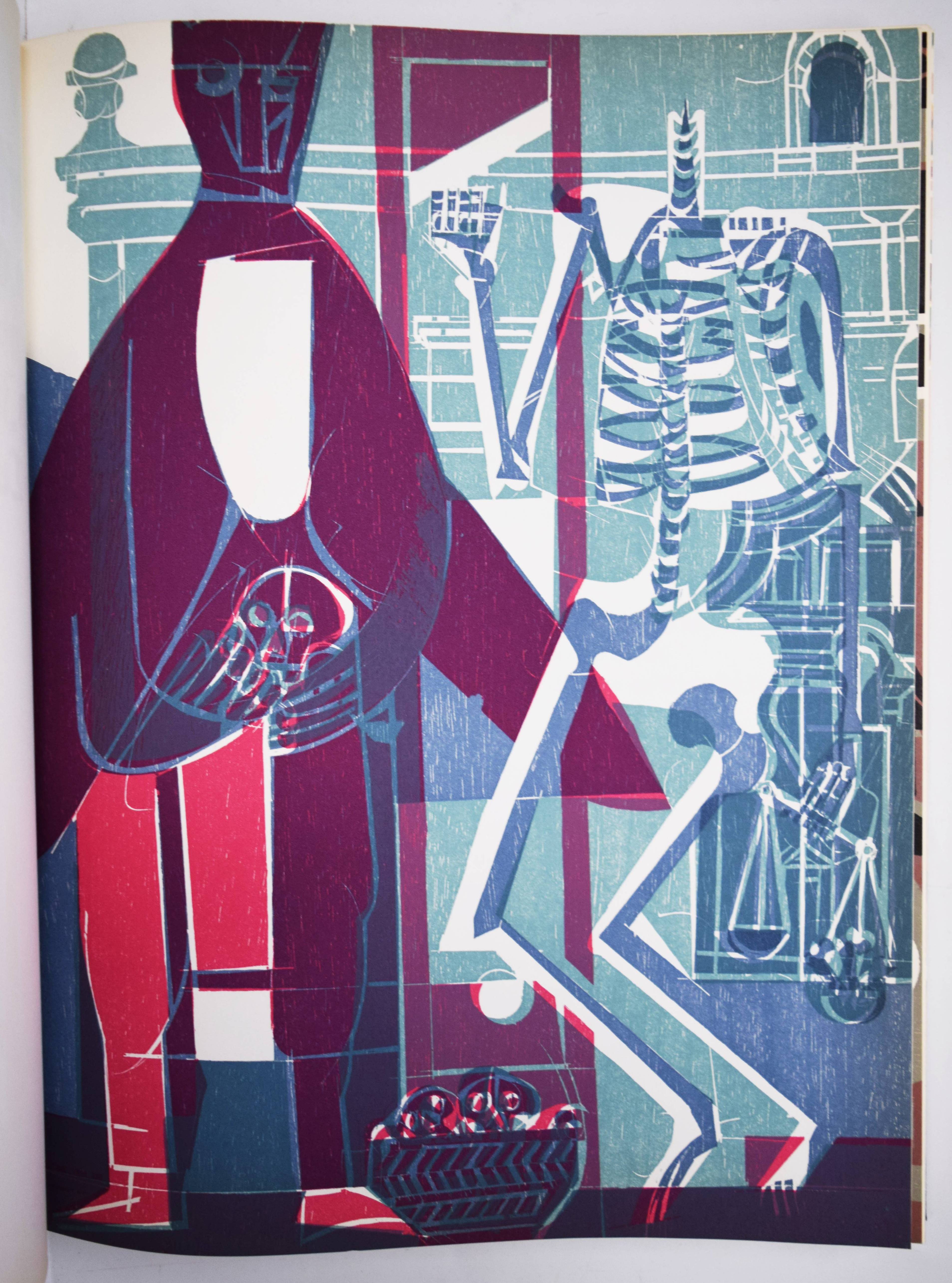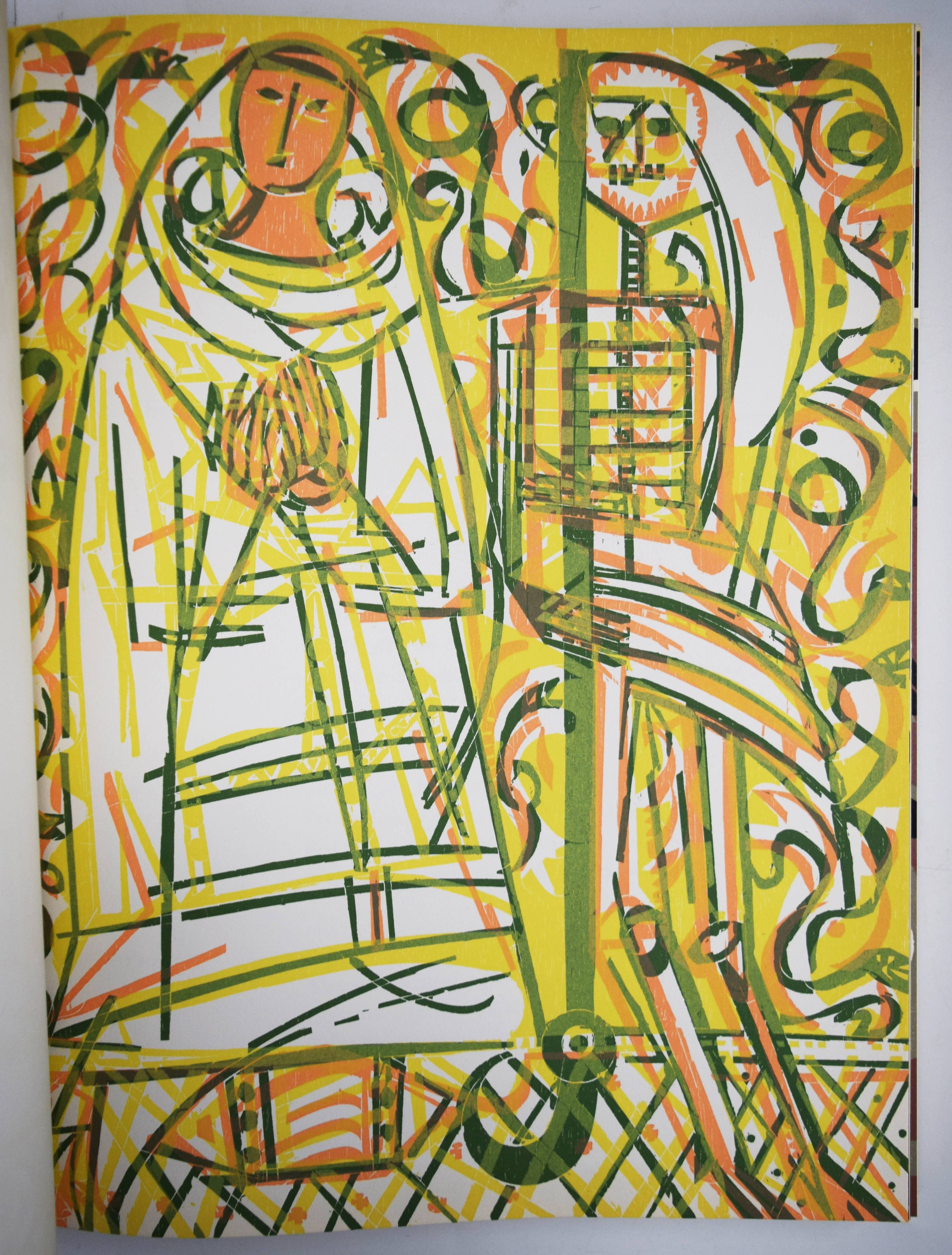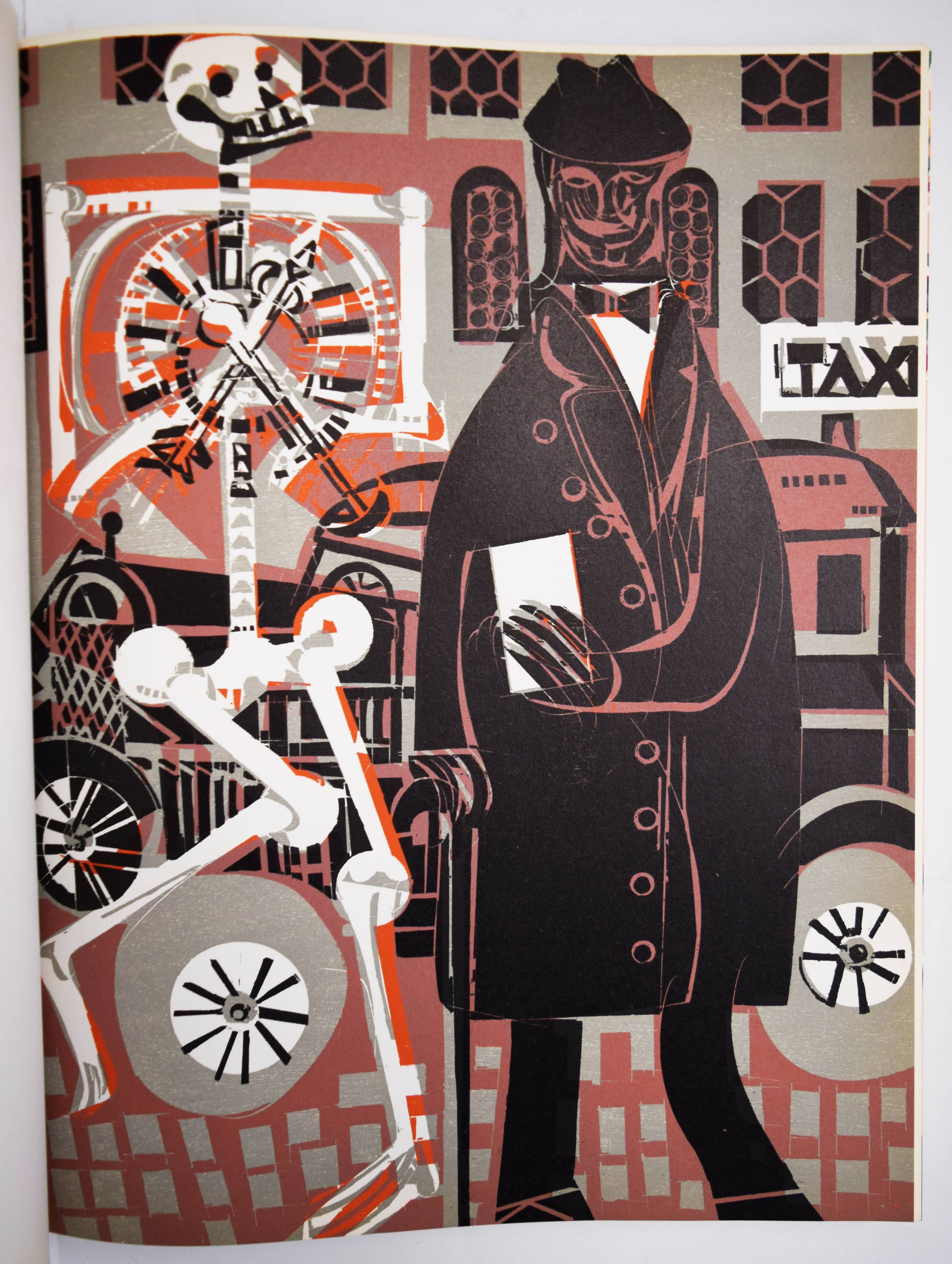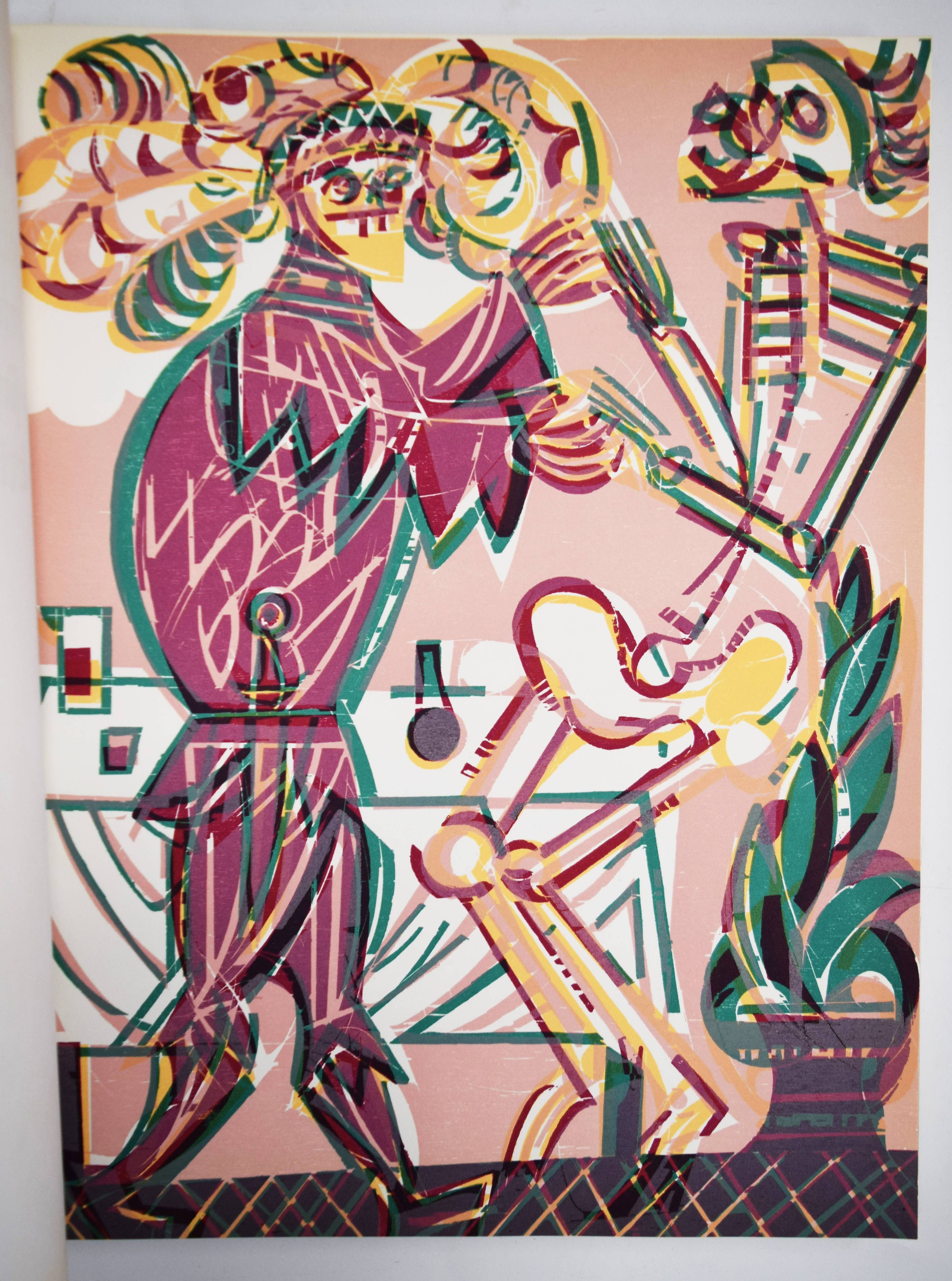 Grieshaber, HAP. Totentanz von Basel. Mit den Dialogen des mittelalterlichen Wandbildes. – The dance of death at Basle. – La danse des morts à Bâle. – (Mit einem Nachwort von Rudolf Meyer). Dresden, Verlag der Kunst 1966. Folio. 40 Bl., 2 Bl., VII S. mit 40 Orig.-Farbholzschnitten. Orig.-Leinenband mit goldgepr. Deckelillustration und Schutzumschlag. (4. Druck der Leipziger Presse). Fichtner 55. Fürst 66/1-40. „Ihr müßt alle nach meiner Pfeife tanzen“. Ausst.-Kat. Herzog August Bibliothek und Bibliothek Otto Schäfer 2000/2001, S. 241 ff. Spindler 65, 4. Tiessen III, 9. „Zum Sterben schön“. Ausst.-Kat. Schnütgen Museum Köln 2006, No. 106. – Erste Ausgabe. – Dreisprachiger Text. Die Schriften für die deutschen Texte entwarf Albert Kapr, sie wurden in Holz geschnitten. Sämtliche Holzschnitte wurden von den Originalstöcken in den Werkstätten der Leipziger Hochschule für Grafik und Buchkunst gedruckt. – „Ein Totentanz von vierzig Paaren, mit handwerklicher Beharrlichkeit in Holz geschnitten vom 24. Dezember 1965 bis zum 13. Juni 1966 … der Knochenmann als Schnitter, Totengräber oder Spielmann“ (Nachwort). – „Das Buch erregte 1966 auf der Buchmesse in Frankfurt a. M. großes Aufsehen und ebenso die zahlreichen Ausstellungen (die ersten im Juli 1966 in Leipzig und gleichzeitig in Essen). Obwohl Grieshaber die mittelalterlichen Stände sowie die Ständeordnung gänzlich übernahm, sind seine Bilder nicht nur originell, sondern oft von einer eindringlichen Aktualität. Mittels seiner sehr persönlichen, von jeder Stilrichtung unabhängigen Bildersprache ist es ihm gelungen, aus vielen der alten Motiv Symbole unserer Zeit zu schaffen.“ (Schuster, Mensch und Tod. Graphiksammlung der Univ. Düsseldorf. Bestandskat. Nrn. 262-302 (mit ausführl. Beschreibung aller Holzschnitte). – Schutzumschlag mit kleinen Randläsuren und leicht angestaubt, sonst sehr gut erhalten.
