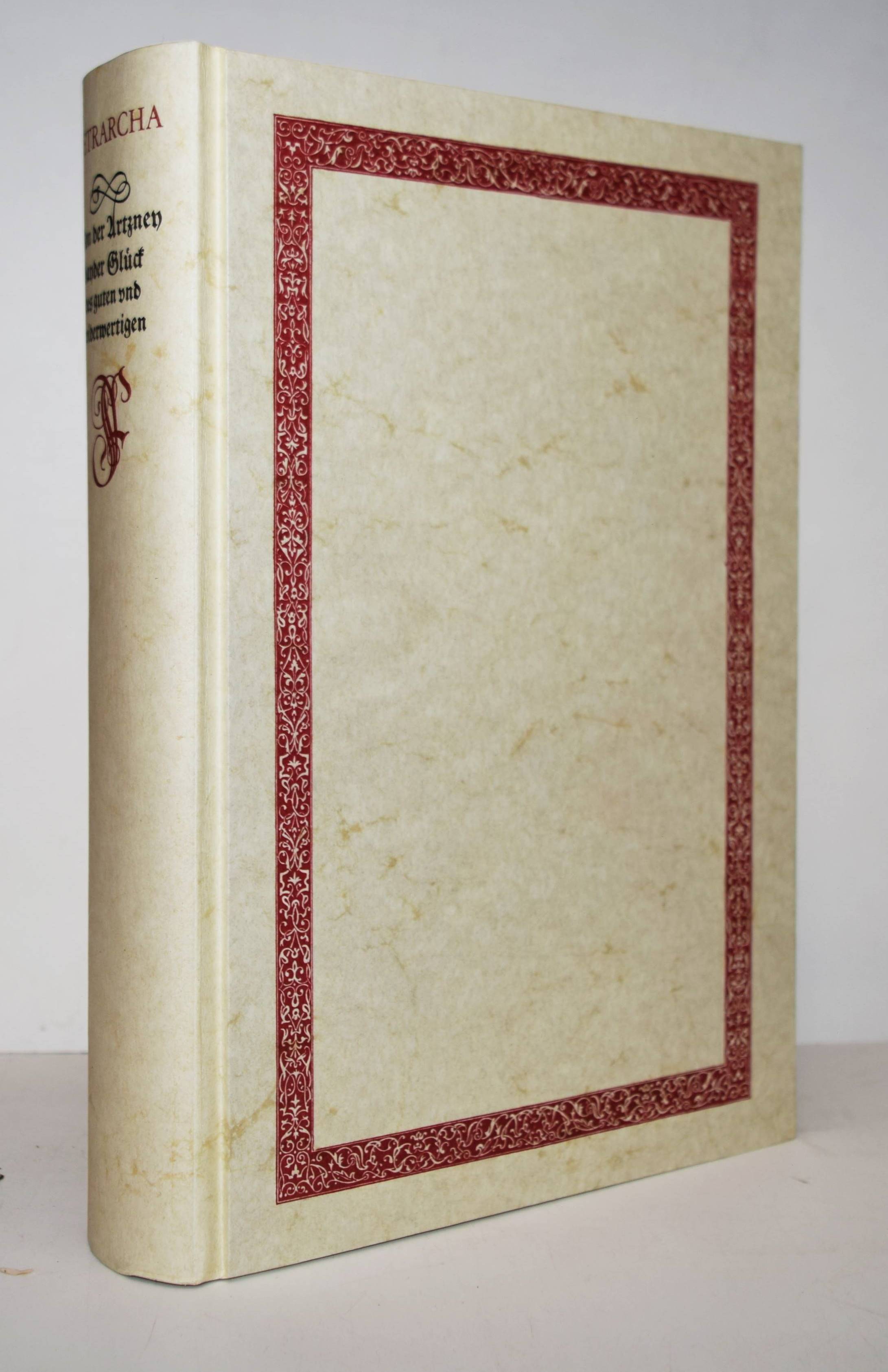 Petrarcha (Petrarca), Francesco. Von der Artzney bayder Glück, des guten vnd widerwertigen. Unnd wes sich ain yeder inn Gelück und unglück halten sol. Aus dem Lateinischen indas Teutsch gezogen. Mit künstlichen fyguren durchaus/ ganz lustig und schön gezyeret. (Reprint der Ausgabe: Augsburg, Heynrich Steyner, 1532. Herausgegeben und kommentiert von Manfred Lemmer). (Hamburg), Friedrich Wittig (1983). 4°. [24], 209 S. mit zahlr. Abbildungen nach Holzschnitten. Orig.-Pappband mit illustr. Pappschuber. Gutes Exemplar.