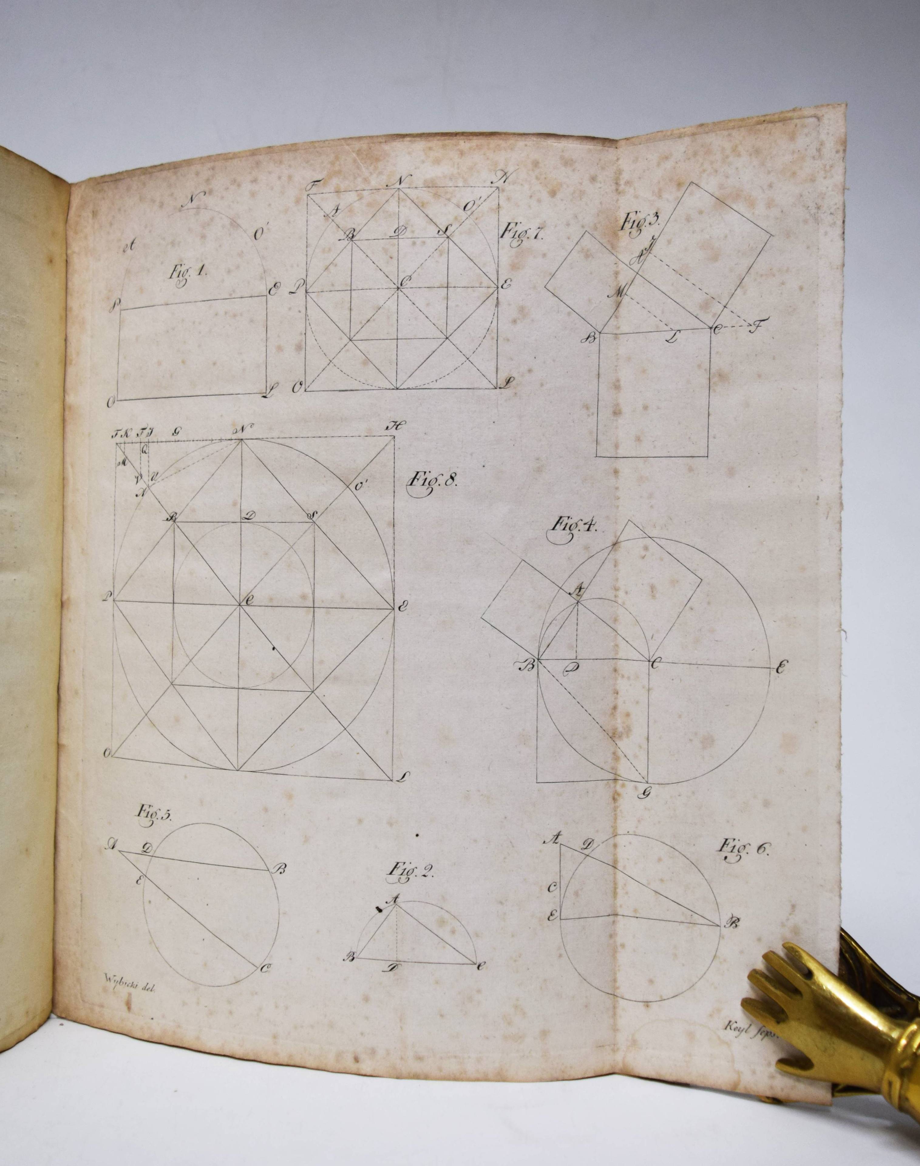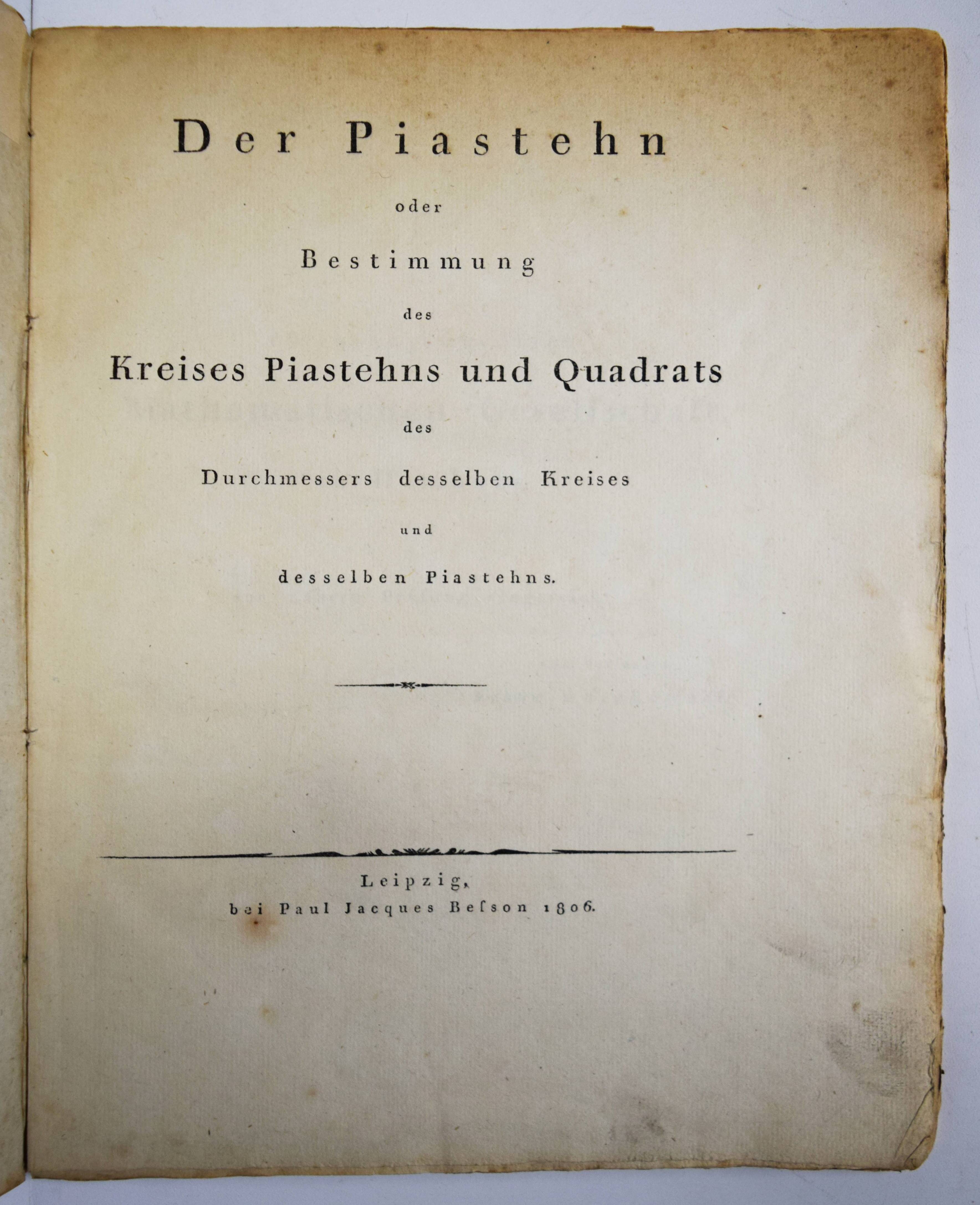 (Gorzkowski, Franciszek). Der Piastehn oder Bestimmung des Kreises Piasthens und Quadrats des Durchmessers desselben Kreises und desselben Piasthens. Leipzig, Paul Jacques Besson 1806. 4° (25,5 x 20 cm.). 62 S., [1] Bl. mit 1 gefalteten Kupfertafel. Interims-Umschlag der Zeit in moderner Pappkassette mit Deckelschild. Äußerst seltene Abhandlung zur Quadratur des Kreises des polnischen Landvermessers und Jacobiners F. Gorzkowsk (1760-1830). „Der verehrungswürdigen Mathematischen Gesellschaft in Hamburg zur näheren Prüfung eingereicht …“ – „Die Quadratur des Kreises ist ein klassisches Problem der Geometrie. Die Aufgabe besteht darin, aus einem gegebenen Kreis mit Zirkel und Lineal in endlich vielen Schritten ein Quadrat gleichen Flächeninhalts zu konstruieren, sprich die Konstruktion eines Quadrats mit der Seitenlänge p {displaystyle {sqrt {pi }}}. Sie ist äquivalent zur sogenannten Rektifikation des Kreises, also der Konstruktion einer geraden Strecke, die dem Kreisumfang entspricht. Das wiederum entspricht der Konstruktion der Kreiszahl p {displaystyle pi } (halber Kreisumfang) aus der Strecke, deren Länge gleich 1 {displaystyle 1} Längenmaßeinheit ist. Beschränkt man die Konstruktionsmittel auf Zirkel und Lineal, so ist die Aufgabe aufgrund der Transzendenz von p {displaystyle pi } unlösbar. Erst im Jahre 1882 konnte dies von dem deutschen Mathematiker Ferdinand von Lindemann bewiesen werden. Die Quadratur des Kreises gehört zu den populärsten Problemen der Mathematik. Jahrhundertelang suchten neben Mathematikern auch immer wieder Laien vergeblich nach einer Lösung. Der Begriff Quadratur des Kreises ist in vielen Sprachen zu einer Metapher für eine unlösbare Aufgabe geworden“ (Wikipedia). – Gorzkowski war „Teilnehmer des Kosciuszko-Aufstands, Mitglied des Jakobinerclubs, Verfechter der Verbindung des bewaffneten Kampfes für die polnische Unabhängigkeit mit der Beseitigung sozialer Ungleichheiten, der Abschaffung der Leibeigenschaft und der Pacht. Er wurde um 1760 in Ermland in eine Adelsfamilie geboren. Als Landvermesser unterstützte er die Verfassung vom 3. Mai und die Abschaffung der Leibeigenschaft . Er gehörte dem Polnischen Jakobinerklub an. Er beteiligte sich an der Planung und Vorbereitung des Kosciuszko – Aufstands , in dessen Verlauf er in Warschau kämpfte. Nach dem Scheitern des Aufstands gelangte er in das podlasische Dorf Cisie, wo er Anführer einer Verschwörung wurde. Diese war organisatorisch auf einem Pfarrnetzwerk aufgebaut und hatte einen bewaffneten Kampf für die Unabhängigkeit und, nach der Zerschlagung des „Wolfsclans“ – jener, die die Bauern ausbeuteten und zu denen Gorzkowski auch Priester zählte – die Einführung eines republikanischen Systems zum Ziel. Er betrachtete die Bauernschaft als wichtige politische Kraft. Im Rahmen seiner Aktivitäten verteilte er unter den ungebildeten Bauern Flugblätter mit Zeichnungen. Nachdem Gorzkowskis Agitation aufgedeckt worden war, wurde er 1797 zusammen mit seinen Mitstreitern verhaftet und von den österreichischen Behörden in Krakau inhaftiert. Nach langwierigen Ermittlungen wurde er 1802 zum Tode verurteilt. Kaiser Franz II. von Habsburg wandelte das Todesurteil in eine Verbannung um. Nach seiner Emigration 1807 ließ er sich in Warschau nieder und entwickelte ein Projekt zur Emanzipation der Bauern“ (Wikipedia aus dem Polnischen übersetzt). – Rücken etwas beschädigt, Umschlag fleckig und angestaubt, im Blattrand und die Kupfertafeln etwas braunfleckig, sonst gut erhalten.