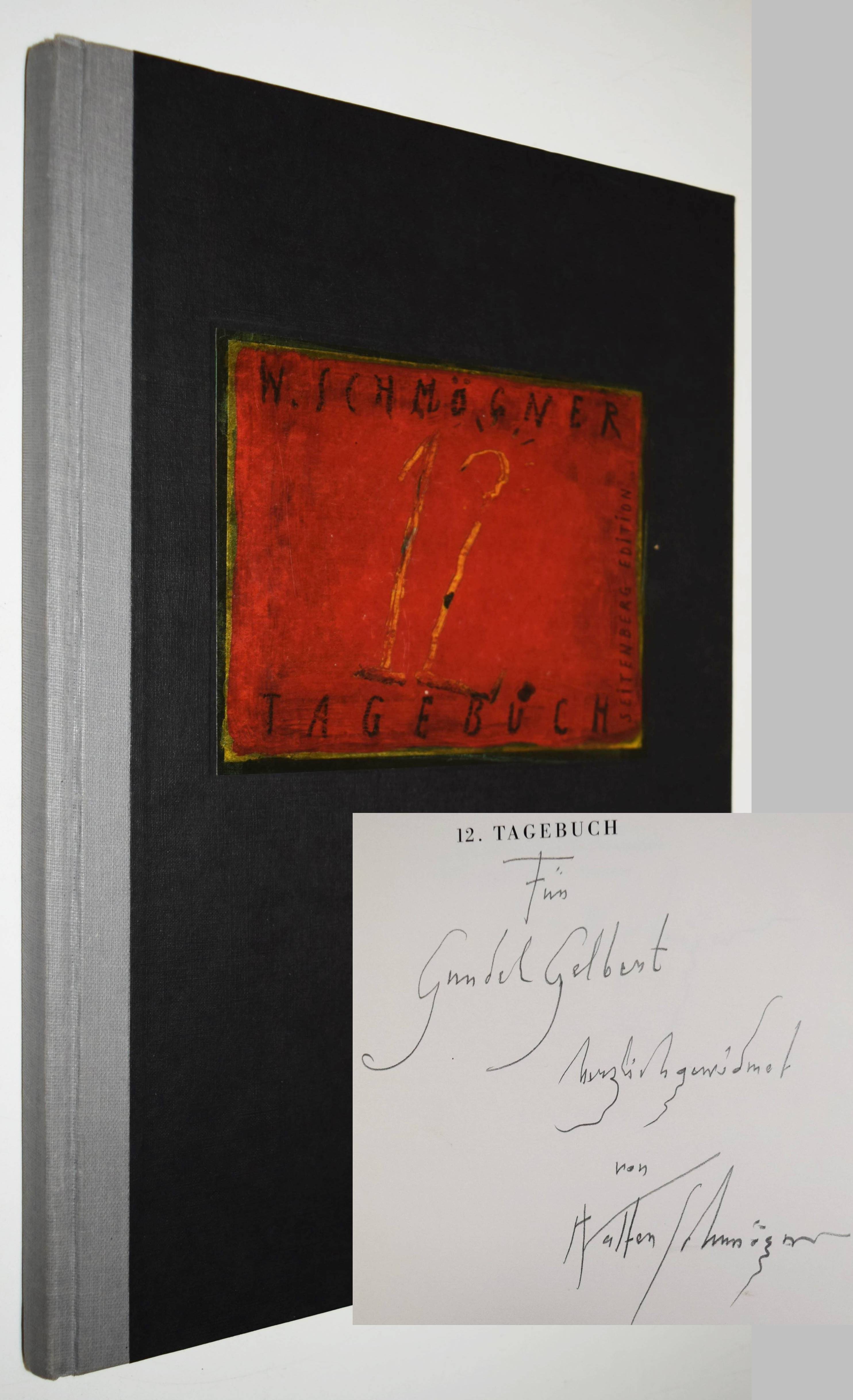 Schmögner, Walter. 12. Tagebuch. 8.3.1988 – 15.8.1988. 95 Bleistiftzeichnungen. Mit einem Text von Joachim Riedl. Wien, Seitenberg Edition (1989). 4°. [204] S. mit 95 Tafeln. Orig.-Halbleinenband mit farbigem Deckelschild. Eines von 1000 num. Exemplaren; im Druckvermerk von W. Schmögner signiert und mit eigenhändiger Widmung für die Kölner Antiquarin Gundel Gelbert. – Sehr gutes Exemplar.