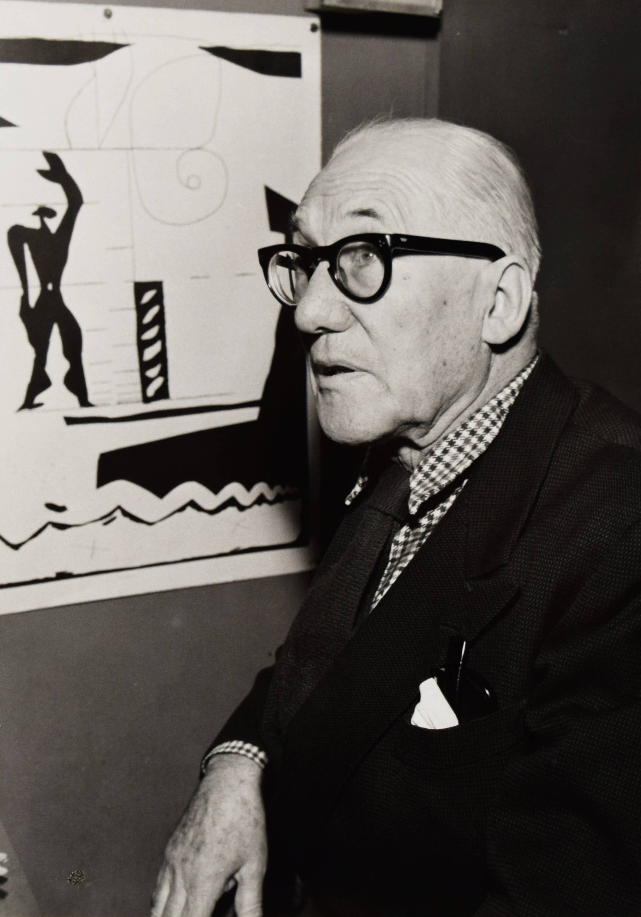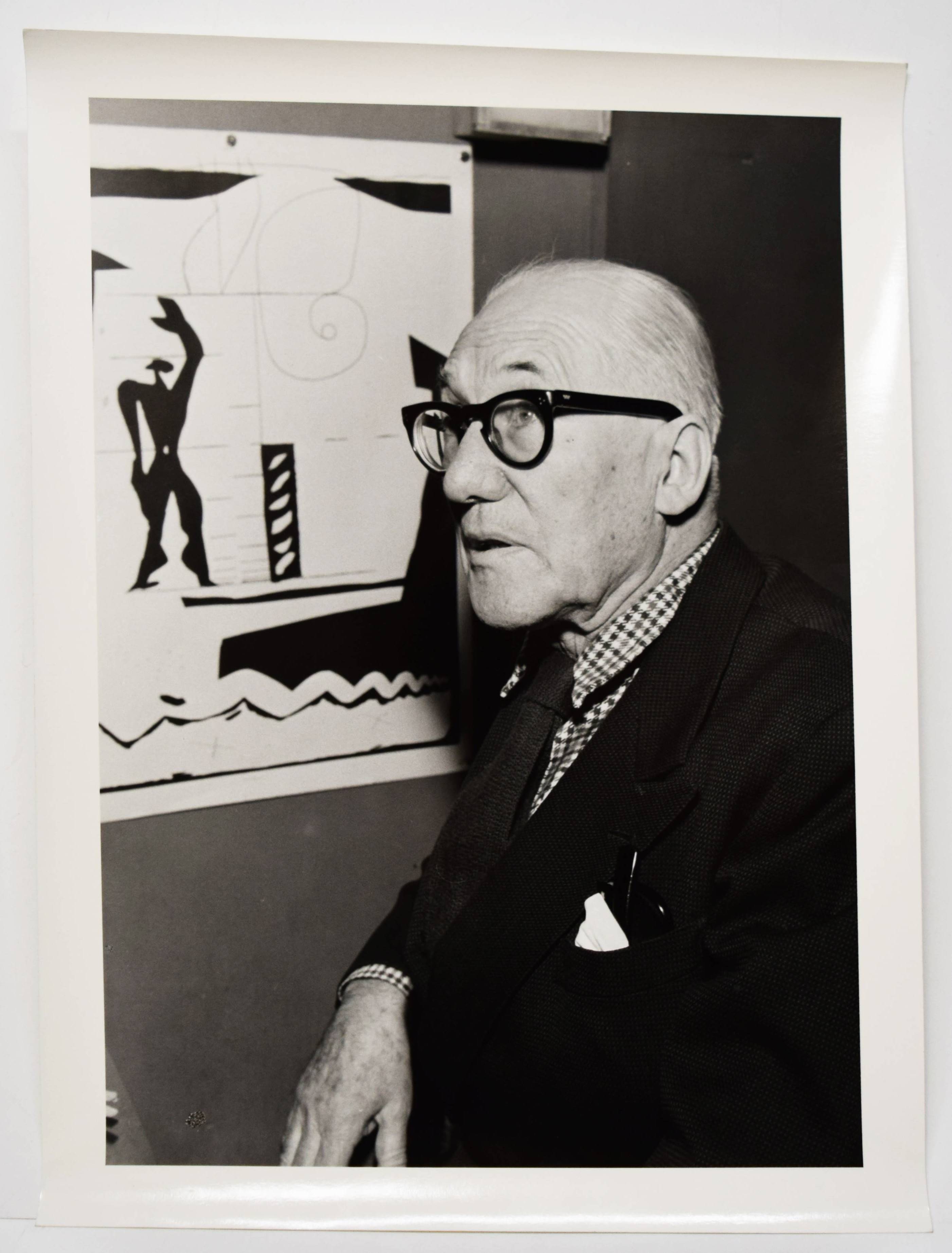Le Corbusier (eig. Charles-Édouard Jeanneret-Gris, 1887-1965, schweizerisch-französischer Architekt und Maler). Orig.-Photographie (Silbergelatine-Abzug) von Aldo Durazzi (1925-1990). Paris Februar 1963. Format: 40 x 30 cm. Schönes Portrait des bedeutenden Architekten in seinem Pariser Atelier. Im Hintergrund ist eine Zeichnung seines berühmten Modulor Man zu sehen. – Rückseitig mit Stempel einer ital. Foto-Agentur.