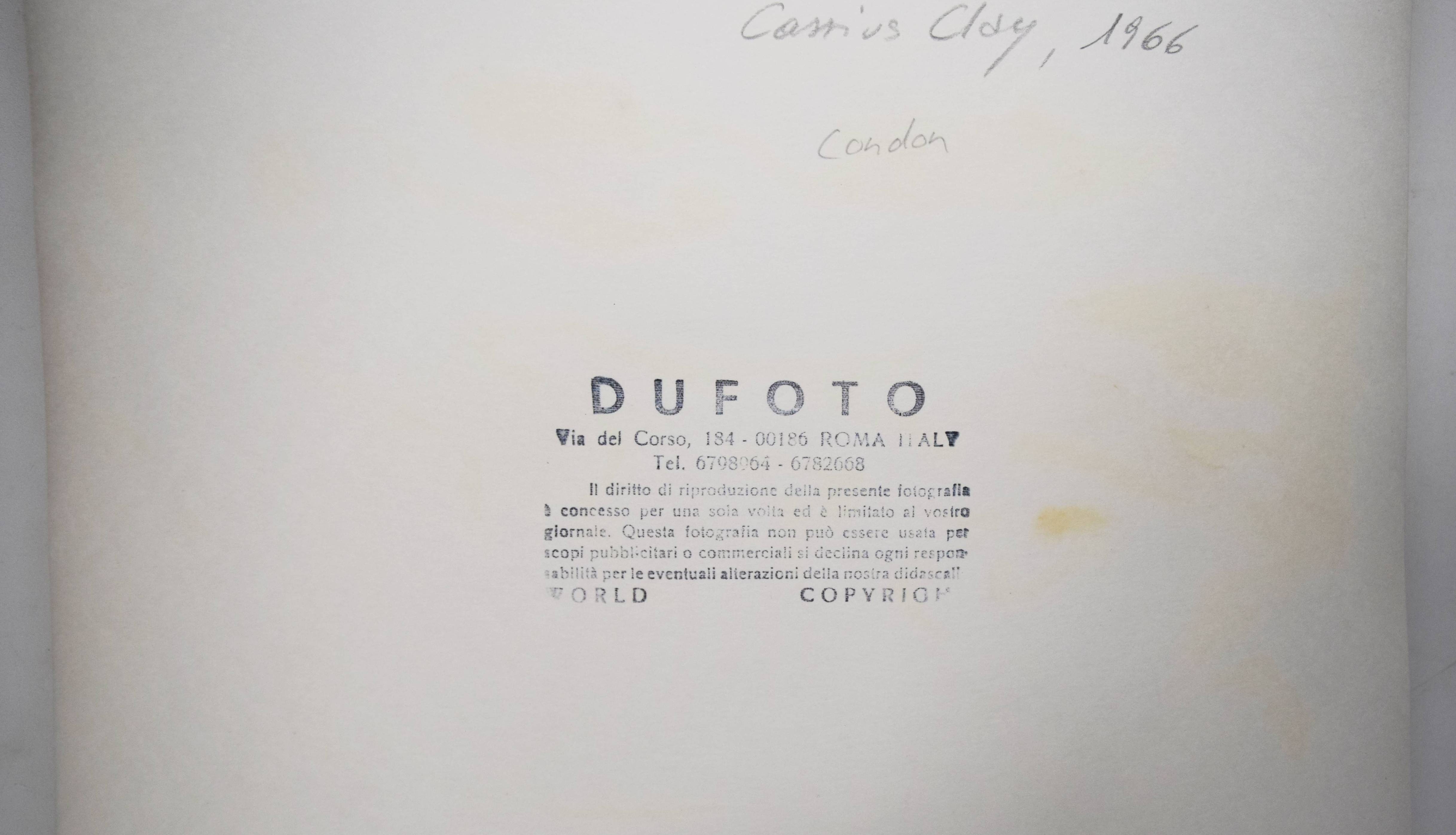 Ali, Muhammad (eig. Cassius Marcellus Clay, 1942-2016, US-amerikanischer Boxer). Orig.-Porträtphotographie (Silbergelatine-Abzug). London 8. August 1966. Format: 40 x 30 cm. Ausdrucksstarkes Porträt des wohl berühmtesten Sportlers aller Zeiten. – Es zeigt den schweißbedeckten Boxweltmeister nach seinem legendären Kampf gegen Brian London in der Earls Court Arena, London. – Rückseitig mit Stempel einer italienischen Foto-Agentur, vintage.