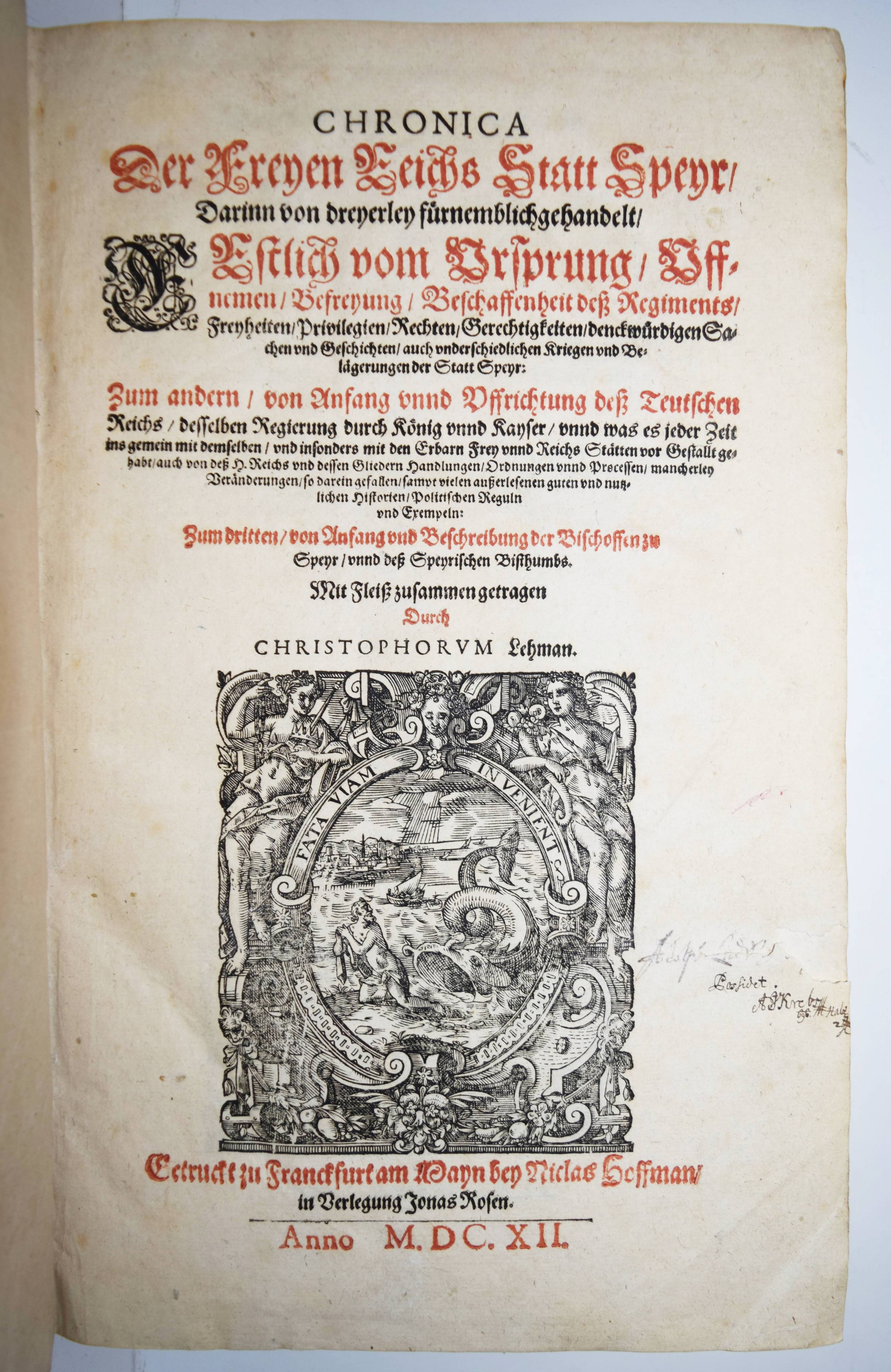Speyer – Lehmann, Christoph. Chronica der freyen Reichs-Statt Speyr. Darinn von dreyerley fürnemblich gehandelt, Erstlich vom Ursprung, Uffnemen, Befreyung, Beschaffenheit deß Regiments, Freyheiten, Privilegien …, Zum andern, von Anfang unnd Uffrichtung deß Teutschen Reichs, desselben Regierung …, Zum dritten, von Anfang und Beschreibung der Bischoffen zu Speyr, unnd deß Speyrischen Bisthumbs. 7 Teile in 1 Band. Frankfurt am Main, N. Hoffmann für J. Rose 1612. Folio (35,5 x 24 cm.). [6] Bl., 1024 S., [49] Bl. mit Titelblatt in Rot und Schwarz und 8 wdh. großen Holzschnitt-Druckermarken. Pergamentband der Zeit, Rücken alt mit marmoriertem Papier überklebt und handschr. Rückenschild. ADB XVIII, 136. Dahlmann-Weitz 1556. Graesse IV, 151. VD17 23:231115A. – Erste Ausgabe des Hauptwerks des sächsischen Historikers C. Lehmann (1570-1638). Lehmann war seit 1594 Lehrer an der Gelehrten- und Rathsschule (schola senatoria) in Speyer und wurde 1595 zum Conrector befördert. Seit 1604 war er der erste Stadtschreiber. – Seinen litterarischen Ruf verdankt L. zwei Werken, der „Chronica der Freyen Reichs Stadt Speyr …“ und seiner Sprichwörtersammlung „Florilegium Politicum“. Ganz besonders aber ist es die erstere, zugleich sein frühestes Werk, durch welches er sich nicht nur in Speyer einen Namen begründet hatte, um dessen willen man ihn als den „berühmten L.“, ja den „deutschen Livius“ mit bereitwilligster Hingebung anerkannte, sondern das auch weit über Speyer hinaus (soll doch der Minister Colbert befohlen haben, eine französische Uebersetzung der Chronik anzufertigen) im Gebiete deutscher Städtegeschichte einen bewährten Ruf bis auf den heutigen Tag sich erhalten hat. Bei der Abfassung dieser seiner Chronik beobachtete er gewissenhaft das „nonum prematur in annum“, denn erst nach zehnjähriger Arbeit übergab er das Manuscript vorschriftsmäßig dem Rathe der Reichsstadt zur amtlichen Censur, worauf der Druck, auch äußerlich ein stattliches Opus, in Großfolio zu Frankfurt 1612 in Verlegung Jonas Rosen erschien. Die dreifache Aufgabe, die sich L. setzte und in extenso schon auf dem Titel präcisirte, führt er in sieben Büchern von den ältesten Zeiten bis auf den Regierungsantritt Kaiser Maximilians I. durch. … L. schrieb seine Chronik in deutscher Sprache und zwar ist sein Deutsch für jene Zeit, wo man bereits begonnen hatte, unsere Muttersprache mit allerlei ausländischen Lappen zu verunstalten, von anerkennenswerther Reinheit, seine Darstellung ist durchgängig frisch und nicht selten wird er wahrhaft beredt, bei aller Breite zeigen seine Erzählungen eine ergötzliche Natürlichkeit und sicher ist, daß er an Sprache und Darstellungsgabe seinem Fortseher und Erweiterer Melchior Fuchs, der fast hundert Jahre, sowie seinem Biographen Baur, der 150 Jahre später schrieb, weit voransteht. Einen bedeutenden Werth aber gewinnt sein Werk besonders dadurch, daß er überall die wesentlichen Belegstellen für seine Angaben ausführlich mittheilt und auf solche Weise den Leser in den Stand setzt, die Resultate, die er gewinnt oder gewonnen zu haben glaubt, mit den Quellen selbst zu vergleichen. L. hat, wie er selbst in einem Schreiben an Landgraf Moritz von Hessen sagt (Baur a. a. O., S. 177), vier Bibliotheken benützt und in der That eine Menge von Schriftstellern gelesen, um sich die Zustände und Einrichtungen des Deutschen Reiches in geschichtlichem Zusammenhange klar zu machen. Für die Speyerer Angelegenheiten stand ihm das damals (Vaur, S. 48) bereits von seinem Vorgänger im Stadtschreiberamte, Hermann Schießer trefflich geordnete reichsstädtische Archiv (die gegenwärtige schöne Ordnung dieses Archivs verdankt man dem sehr verdienten, am 18. August 1836 verstorbenen K. Kreisarchivar Peter Bernh. Geyer) zu Gebote, wie für allgemeinere Städteangelegenheiten das seiner Aufsicht anvertraute bereits erwähnte Archiv der Städte rheinischer Bank. Von den Urkunden, welche er benützte und seiner Chronik einverleibte, sind zunächst unstreitig die Kaiserurkunden die wichtigsten; übrigens hat er kaum die Hälfte dieser aus dem Zeitraum, welchen sein Werk behandelt, im Speyerer Archive vorhandenen Urkunden veröffentlicht, wie die Vergleichung mit den Geyer’schen Repertorien ergiebt. Außerdem enthält die Chronik noch einige päpstliche und mehrere bischöfliche Urkunden, sowie eine Menge Rathserlasse, Verträge mit benachbarten Fürsten und Städten, Vergleichshandlungen und, was zu dem Interessantesten des mitgetheilten urkundlichen Materials gehört, die alten Richterordnungen der Reichsstadt. Unter den letzteren hat er übrigens die sogen. Vierrichterordnung nicht nach dem ältesten Original von 1314, sondern in der etwas abgeänderten Redaction von 1328, enthalten im Cod. 6 (Geyer; bei Zeuß, Die freie Reichsstadt Speier, 1843, S. 2. Cod. C.) abdrucken lassen“ (J. Franck in ADB). – Rücken etwas berieben, Titelblatt mit zeitgenöss. Besitzvermerk, sehr gutes sauberes Exemplar.