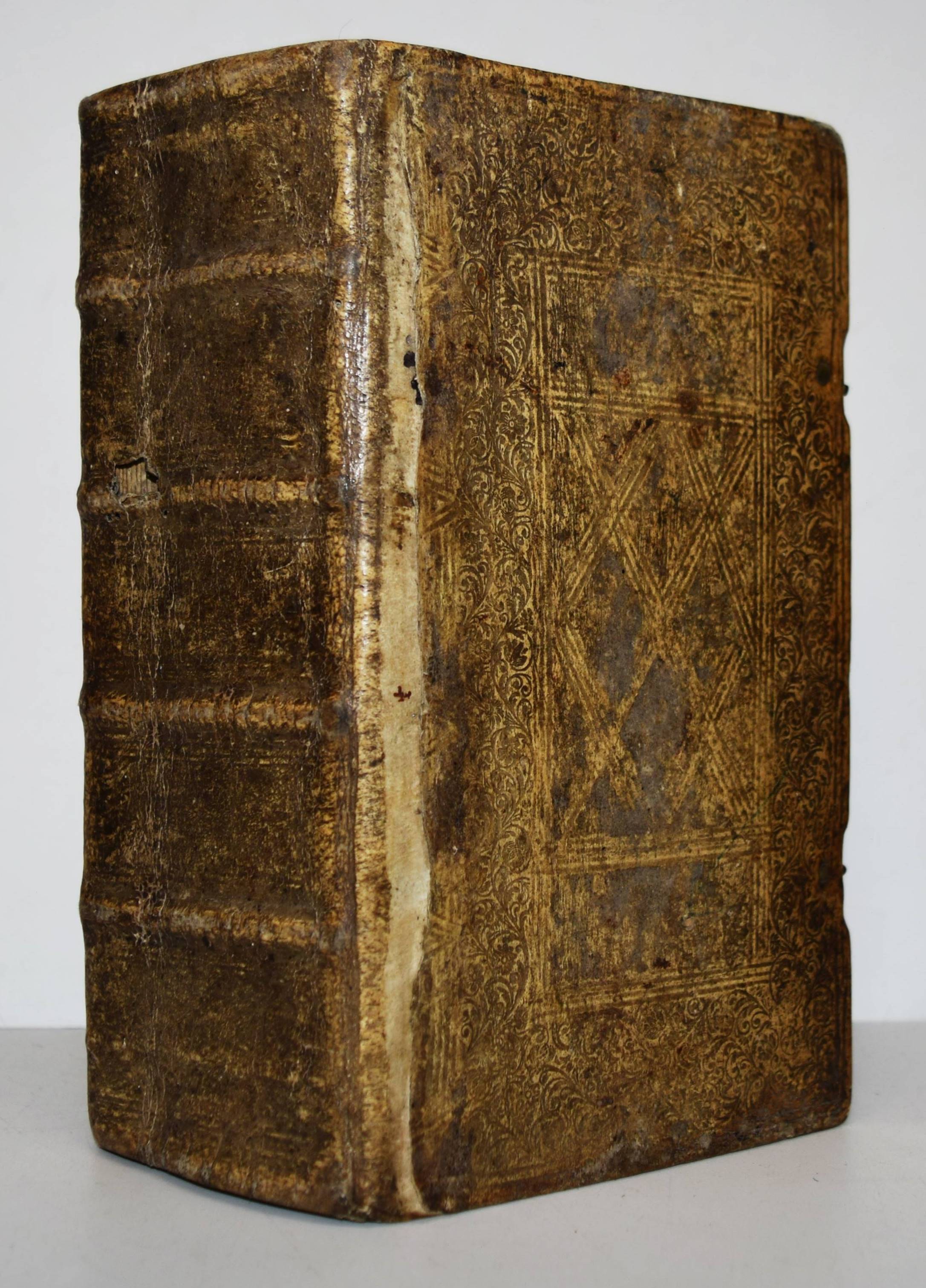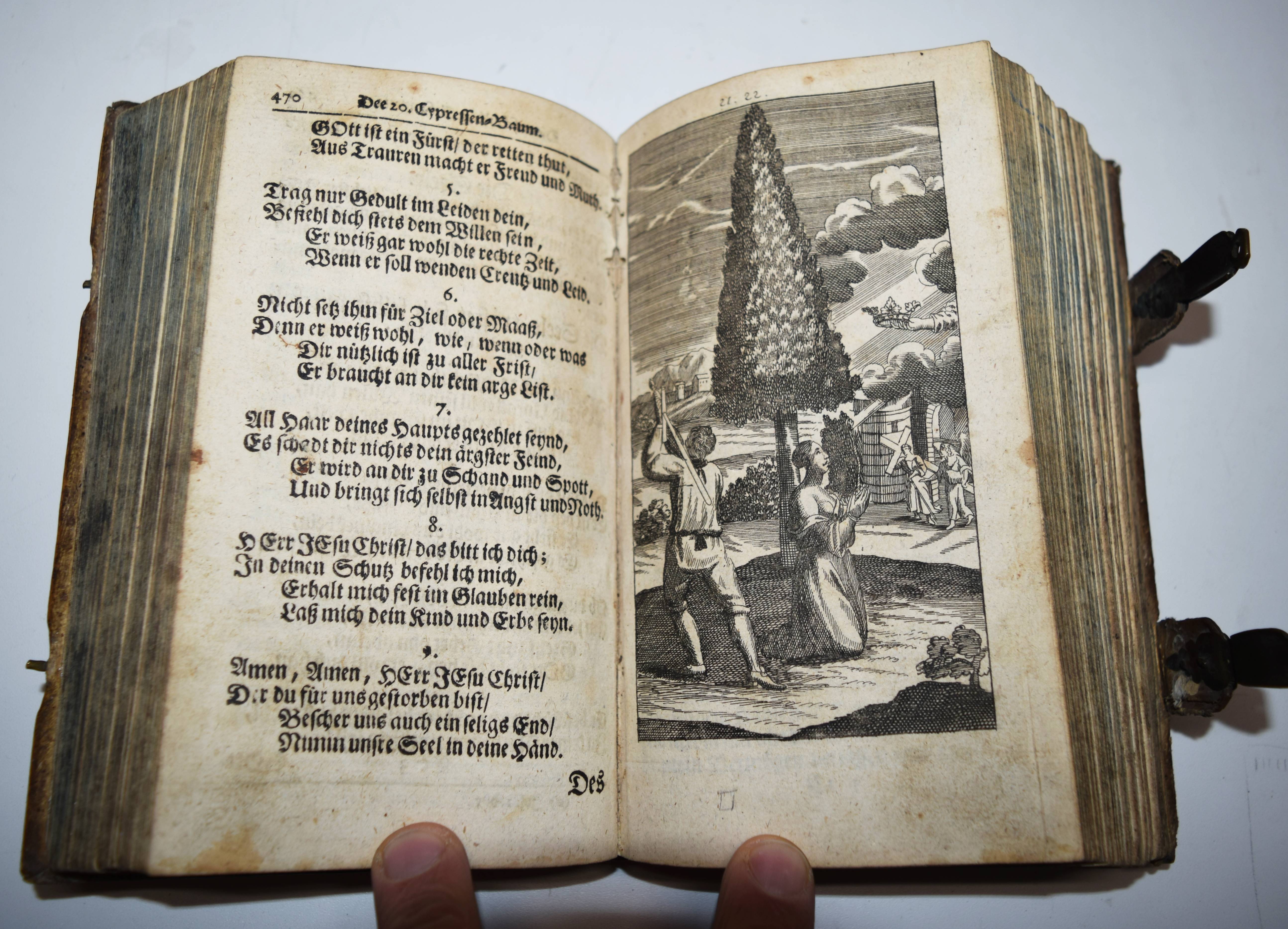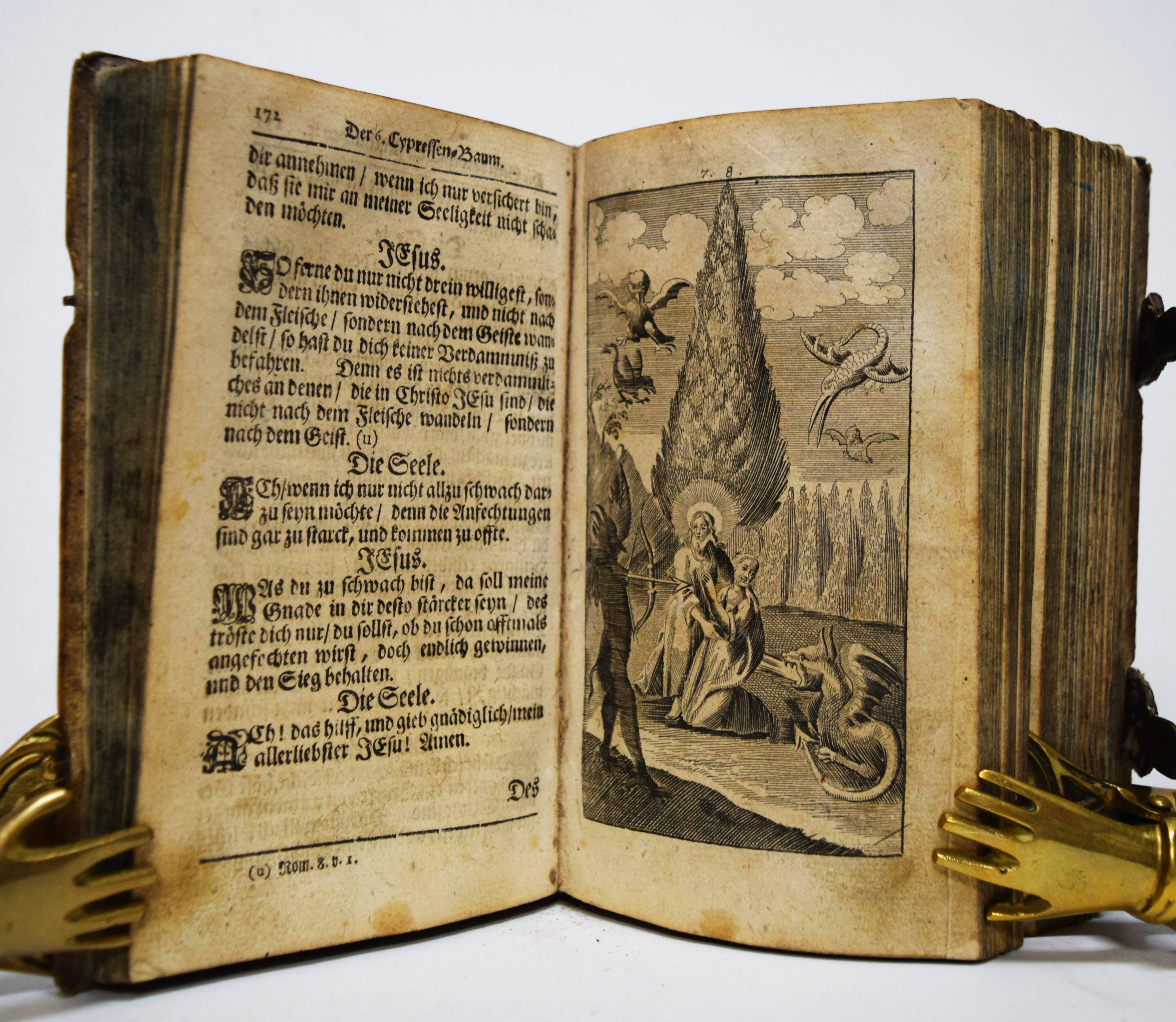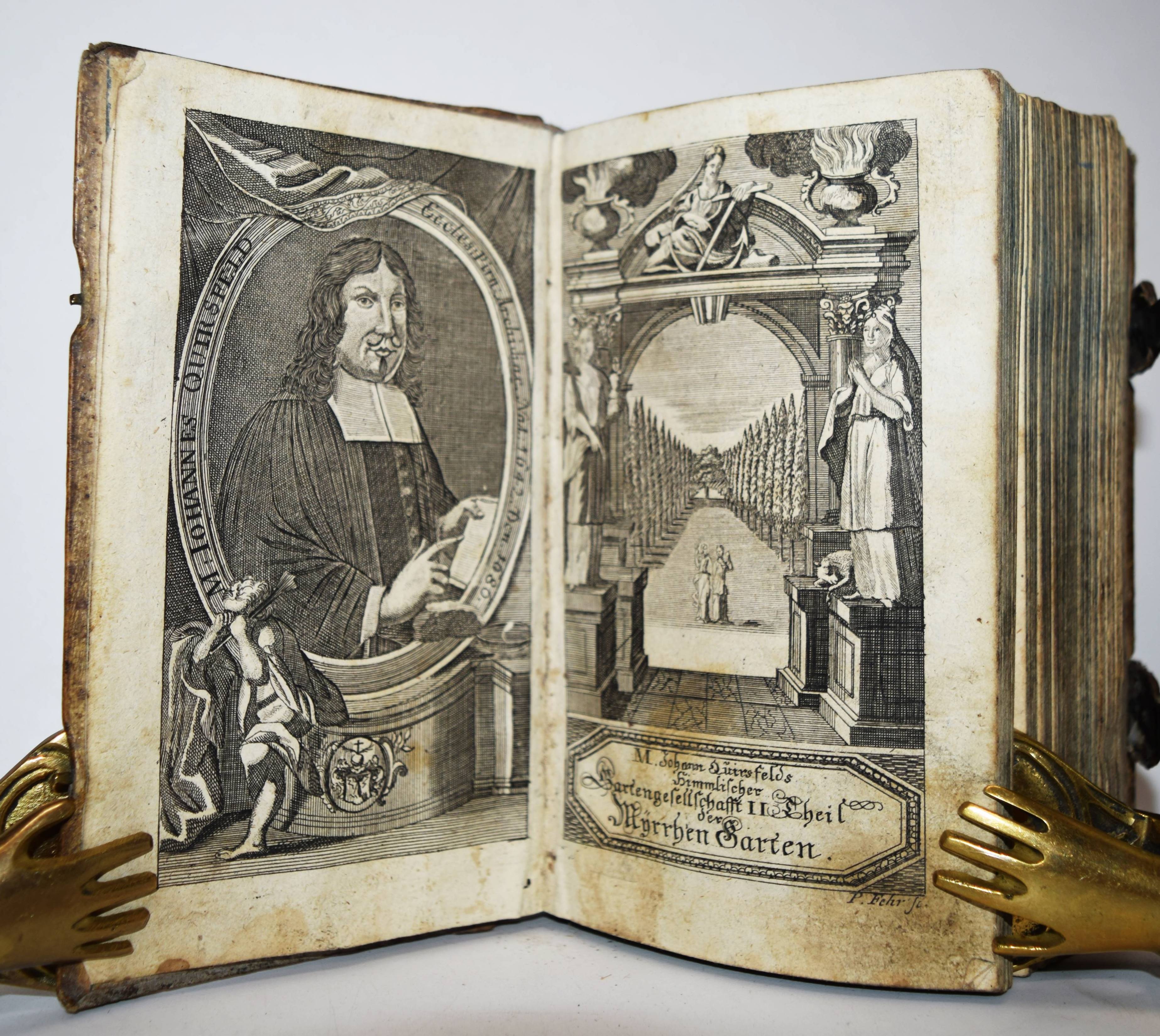 Quirsfeld, Johann. Geistlicher Myrrhen-Garten. Andrer Theil der Himmlischen Garten-Gesellschafft, versetzet mit Funfftzig traurigen Cypressen, worunter die geängstete Seele in allerhand Creutz und Widerwärtigkeit mit Christo ihr tröstlich Gespräch hält. Nebenst einem kurtzen Gebet-Buche. 2 Teile in 1 Band. Frankfurt am Main, Johann Leonhard Buchner 1740 und 1739. 8°. [6] Bl., 974 S., [5] Bl.; 84 (recte 94) S., [1] Bl. mit Titelblatt in Rot und Schwarz, gestoch. Portrait, gestoch. Frontispiz und 31 Kupfertafeln. Blindgepr. Schweinslederband mit 2 Messing-Schließen. ADB XXVII, 48. VD18 14168553. Vgl. Goed. III, 188, 153, 3 (Ausgabe Leipzig 1696) und Seebaß/Edelmann II, 777 (Ausgabe Leipzig 1708). Nicht bei Praz (″obwohl die Kupfer emblematisch-allegorischen Charakters sind“ A. Seebaß). – Erfolgreiches reich illustriertes posthum erschienes Werk des Dresdner Theologen J. Quirsfeld (1642-1686). Letzte um einige Kupfertafeln vermehrte Ausgabe. – „Je eine Illustration bezieht sich auf je zwei (in einem Fall drei) Gespräche zwischen Christus und der Seele, die in der Art sich an Hugos Pia desidera und andere mystische Tradition anlehnen. Dabei betreffen sie durchaus praktische Probleme, wie „Die Seele beklagt ihre Amts-Beschwerliligkeit, Die von Feinden Belägerte, Die Seele beweinet den ungerathenen Ehegatten, Die Seele klaget über allzuviel Kinder, Die gefährliche (=gefährdete) Schwangere, Das beschwerliche Alterthum“ (= Alter) usw. Viele schöne, kirchenliedartige Gedichte des Verfassers sind beigegeben, es finden sich aber auch ältere Choräle von Luther, Paulus Gerhard u. a. – Quirsfeld, … machte sich als Kirchenlieddichter einen Namen und gab einige, originelle Erbauungsbücher heraus. Das vorliegende ist eine ganz selbständige und separat erschienene Art Fortsetzung zu seiner „Himmlischen Gartengesellschaft“ (vgl. Maltzahn II, 1043)“ (A. Seebaß). – Einband berieben, Bezug am vorderen Gelenk etwas angeplatzt, Innengelenke etwas angeplatzt, drei Kupfertafeln mit Blaustift-Kritzeleien, durchgehend im Blattrand etwas fingerfleckig, sonst gut erhalten.