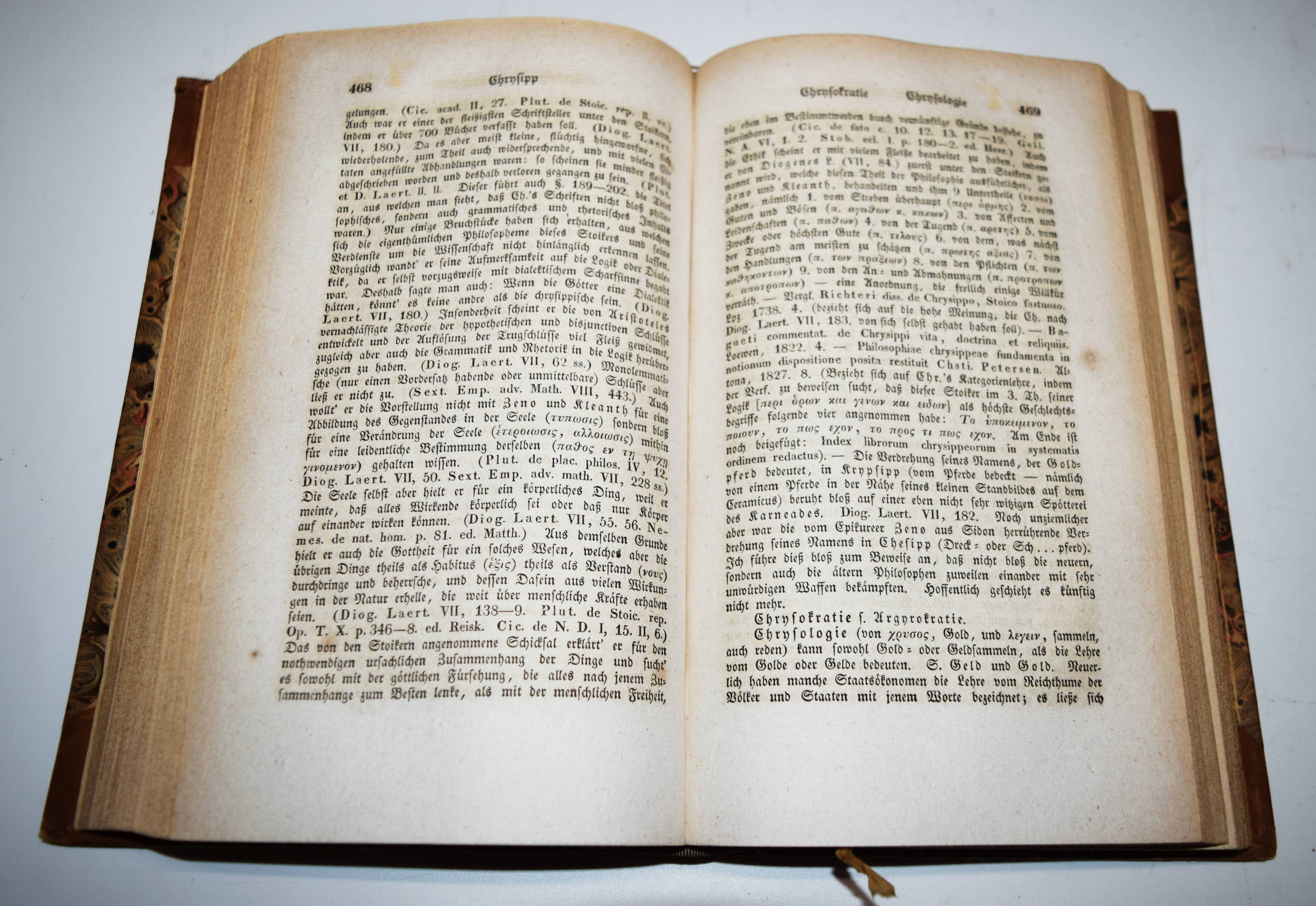 Krug, Wilhelm Traugott. Allgemeines Handwörterbuch der philosophischen Wissenschaften, nebst ihrer Literatur und Geschichte. Nach dem heutigen Standpunkte der Wissenschaft bearbeitet und herausgegeben. 2., verbesserte und vermehrte, Auflage (und 1. Auflage, Band V). 5 Bände. Leipzig, F. A. Brockhaus 1829-1832. 8°. Halblederbände der Zeit mit goldgepr. Rückentiteln und dezenter Rückenvergoldung Kosch, Ergänzungsband V, 550. NDB XIII, 114 f. Ziegenfuss I, 691. Zischka S. 40. – Maßgebliche Ausgabe. – „Die Bedeutung K.s liegt weniger in seiner Philosophie als vielmehr darin, daß er es dank einer verständlichen Sprache verstand, in der breiten Öffentlichkeit das Interesse für die Philosophie zu wecken und liberales Denken in Staat und Kirche zu fördern. Er war der Meinung, die Philosophie bedürfe keiner eigenen Terminologie, da die Priorität dem Denken und nicht der Sprache zukomme (Über das Verhältnis der Philosophie zum gesunden Menschenverstände, 1837)“ (F. Holz in NDB). – W. T. Krug (1770-1842), „Anhänger der Kantischen Philosophie. K. selbst vertrat einen „transzendalen Synthetismus“: es findet in unserem Bewußtsein eine ursprüngliche transzendentale Synthesis zwischen Idealem und Realem, Wissen und Sein, Subjektivem und Objektiven statt; weder kann das Denken aus dem Sein, noch das Sein aus dem Denken abgeleitet werden. Diese in unserem Bewußtsein in die Erscheinung tretende Synthesis ist die Grundlage aller Philosophie. Sie kann nicht weiter erklärt werden, da jede Erklärung beim Denken oder beim Sein anfangen müßte und dadurch gerade die Synthesis, welche erst eine Erkenntnis möglich macht, zerstören würde. Die allgemeinste Tatsache des Bewußtseins ist in der Erkenntnis, daß ich tätig bin, bezeichnet, das oberste Formalprinzip in dem Streben nach absoluter Harmonie in aller meiner Tätigkeit“ (Werner Ziegenfuss). – Rücken etwas berieben, stellenweise leicht braunfleckig, gutes dekorativ gebundenes Exemplar.