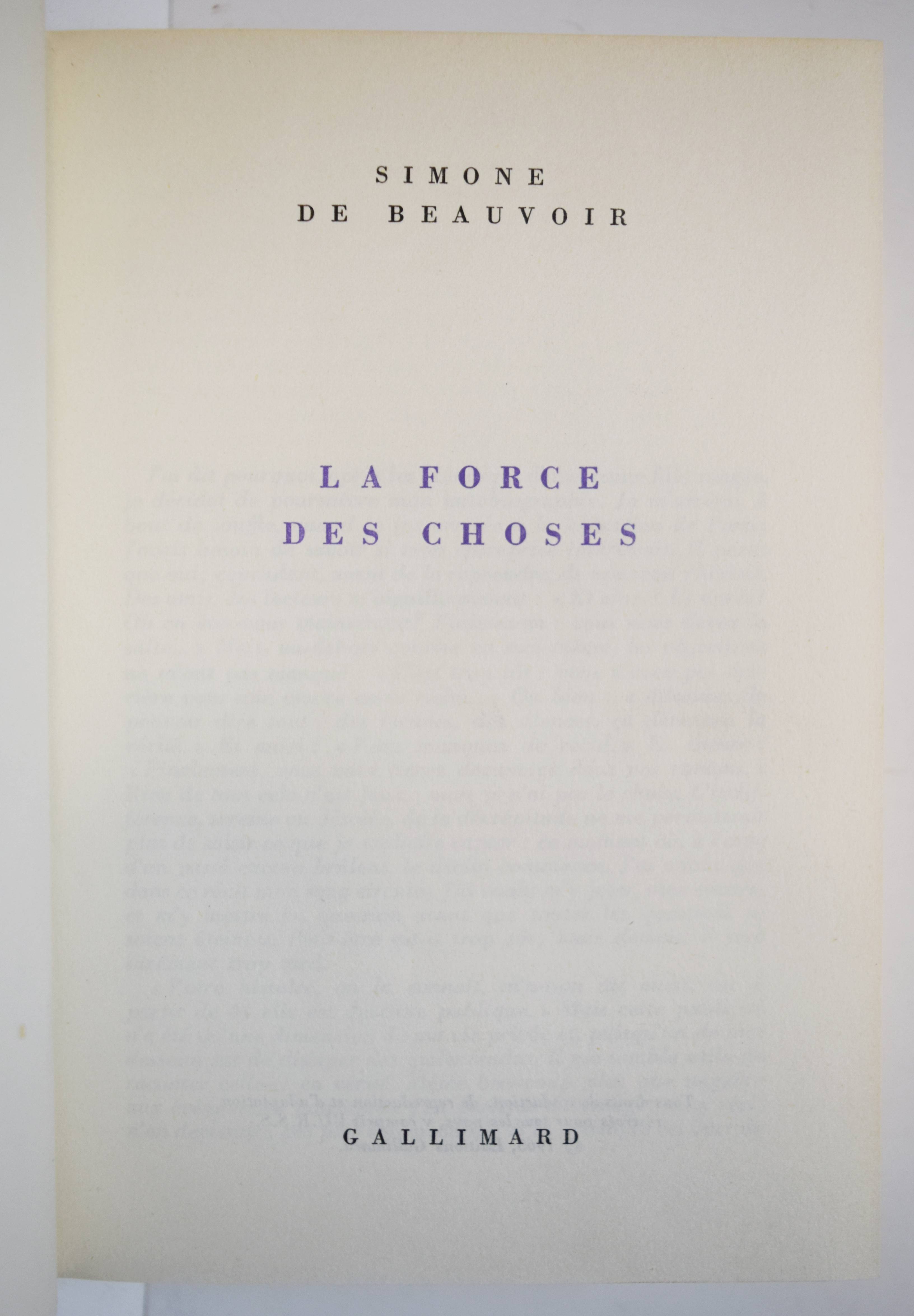 Beauvoir, Simone de. La Force des choses. Paris, Gallimard (1963). 8°. 686 S., [1] Bl. Orig.-Leinenband mit goldgepr. Rücken- und Deckeltitel und Klarsicht-Schutzumschlag. Erste Ausgabe. – Eines von 5100 num. Exemplaren. – Sehr gutes Exemplar.