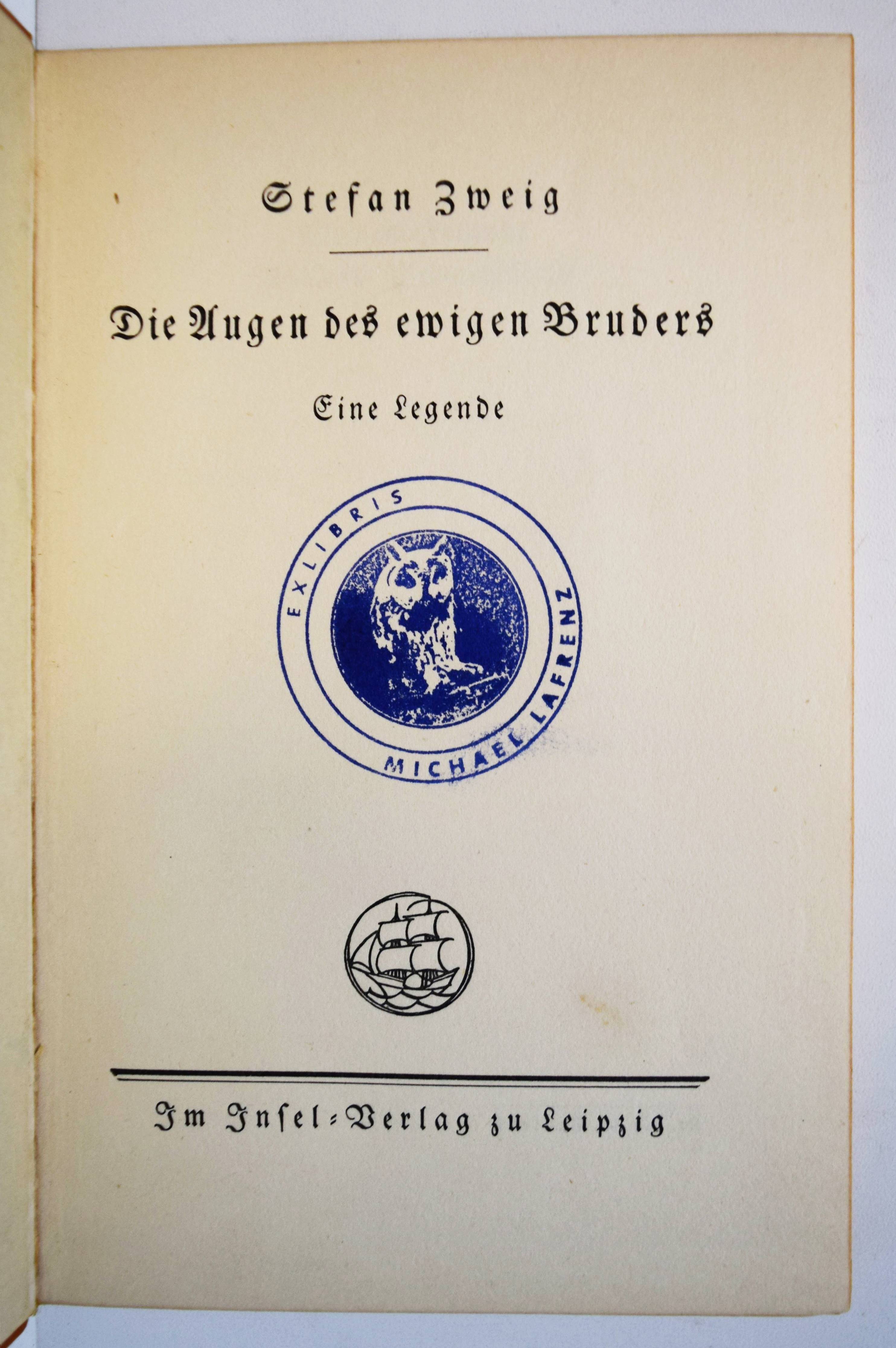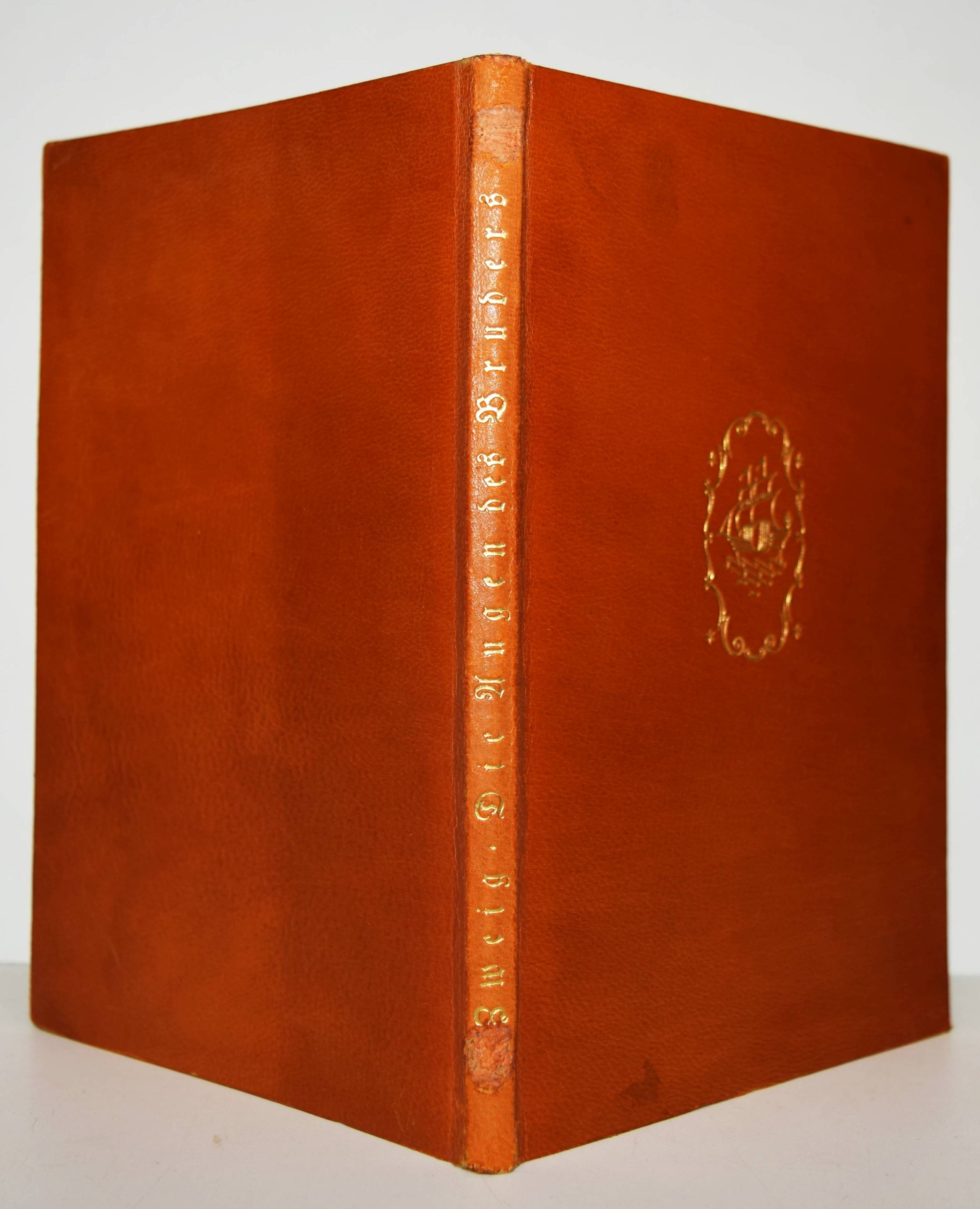 Zweig, Stefan. Die Augen des ewigen Bruders. Eine Legende. 21. – 30. Tsd. Leipzig, Insel-Verlag (1924). 8°. 63, (1) S. Hellbrauner Orig.-Lederband mit goldgepr. Rückentitel, Deckelvignette und Kopfgoldschnitt. (Insel-Bücherei, Band 349). Jenne II, 135. – Rücken mit zwei kleinen Abriebstellen außerhalb des Rückentitels, Exlibris-Stempel auf dem Titelblatt, sonst gutes Exemplar der seltenen Vorzugsausgabe.