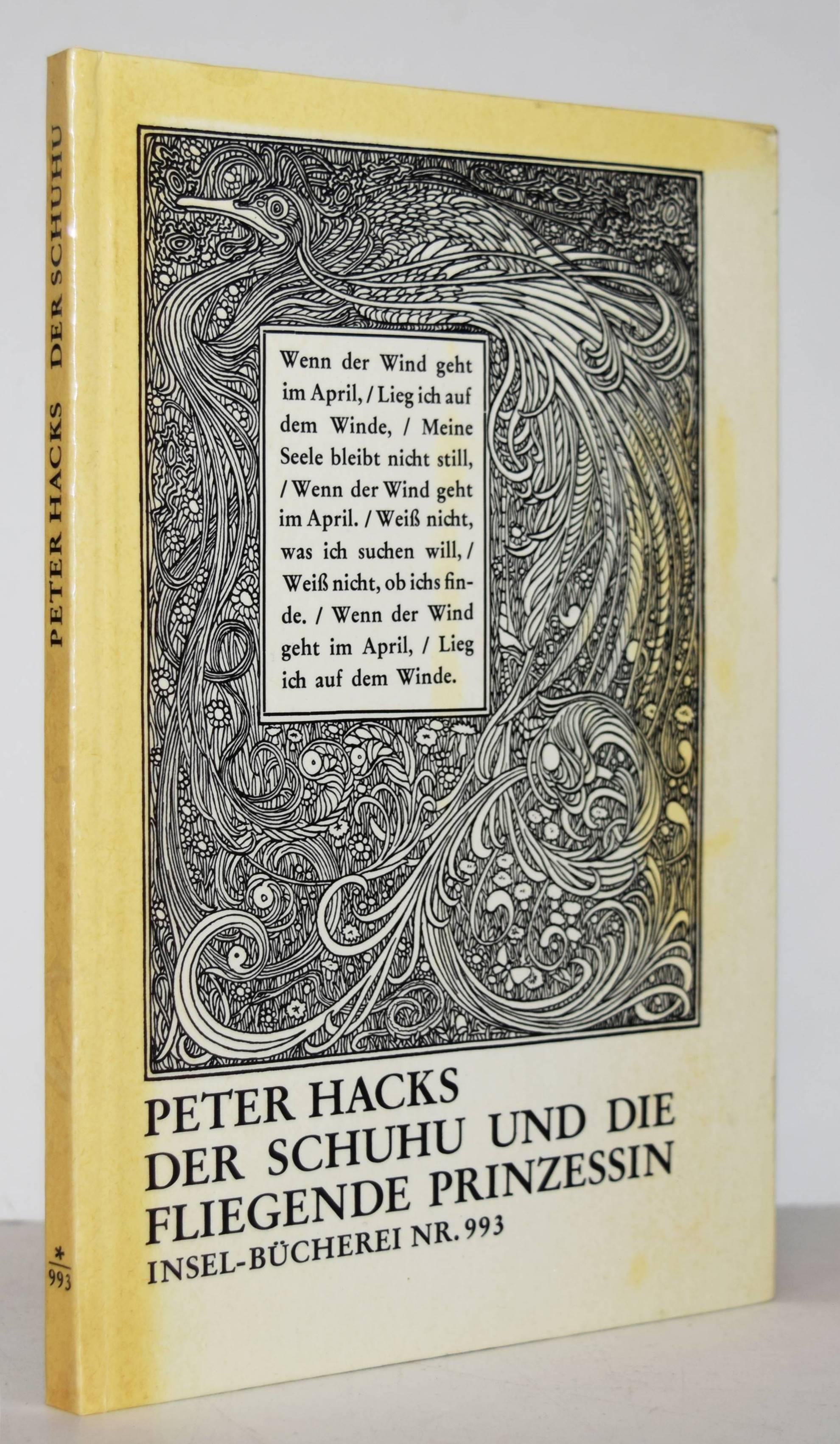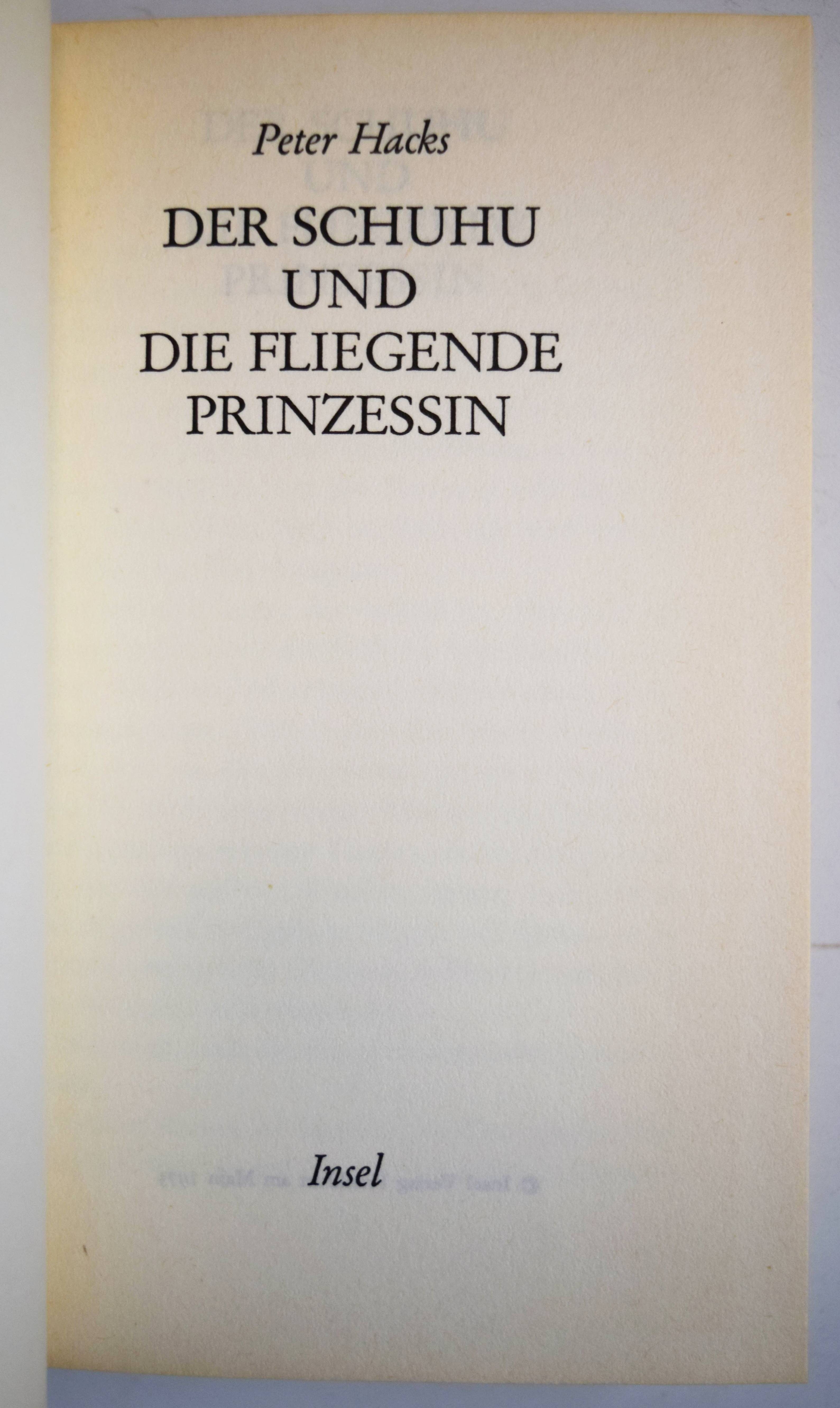 Hacks, Peter. Der Schuhu und die fliegende Prinzessin. 1. Aufl., [1. – 3. Tsd.]. Frankfurt am Main, Insel-Verlag (1973). 8°. 67, (2) S. Illustr. Orig.-Pappband. (Insel-Bücherei, Band 993). Jenne 531 (Bildeinband). – Rücken leicht gebräunt, sehr gutes Exemplar.