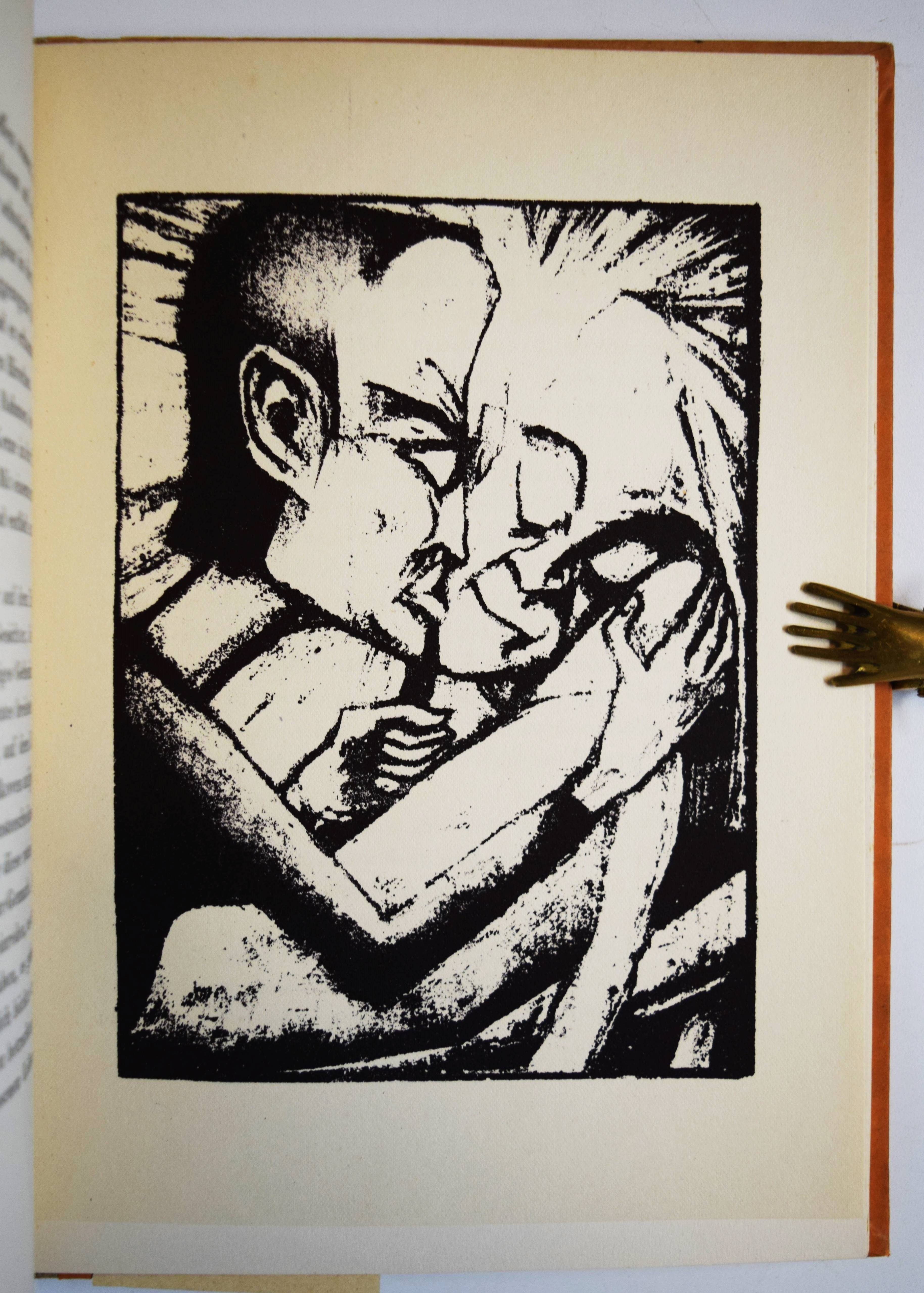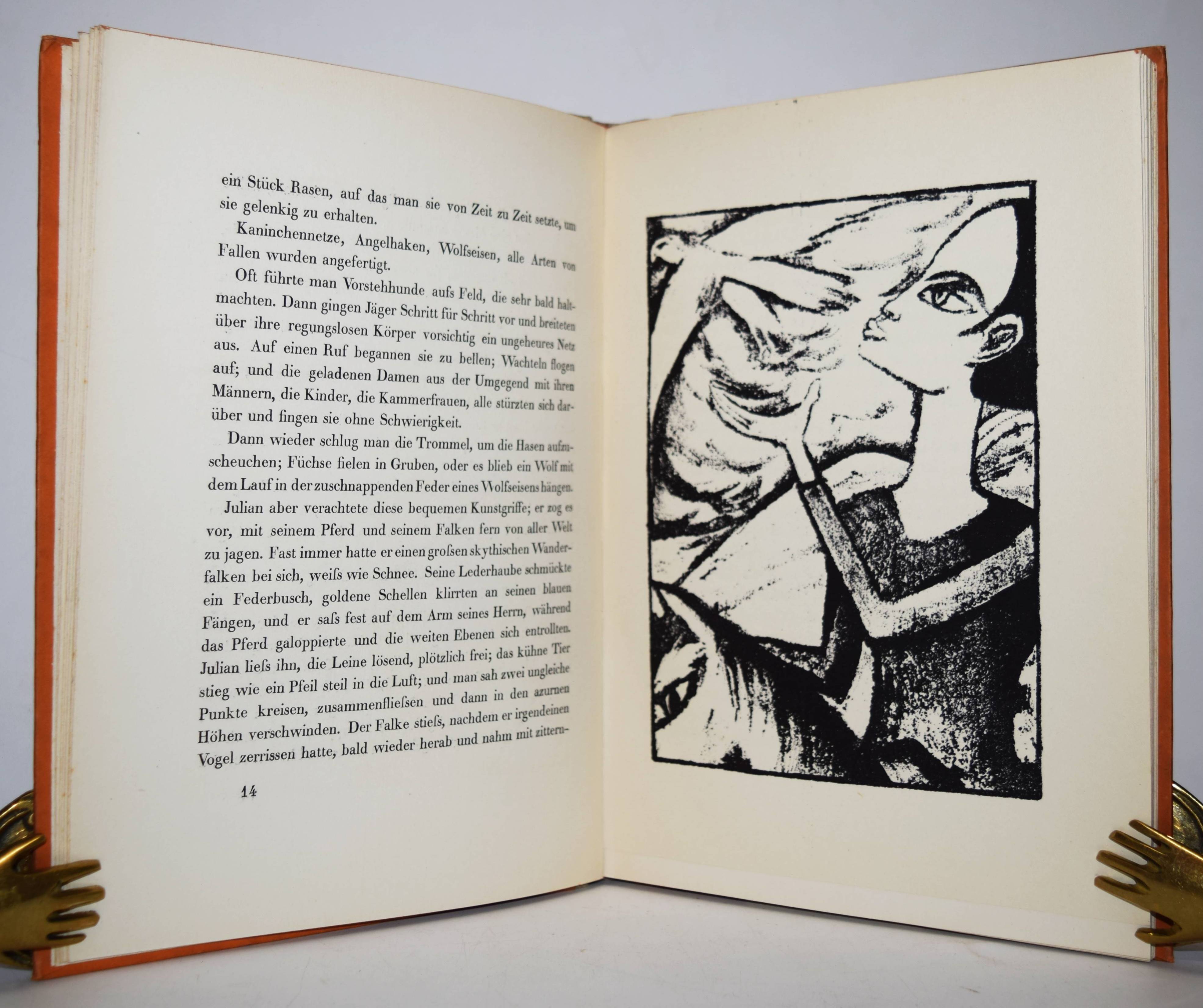 Flaubert, Gustave. Die Sage von Sankt Julian dem Gastfreien. (Deutsch von Else v. Hollander). Weimar, Gustav Kiepenheuer 1918. Gr.-8°. 46 S. mit Titelvignette und 12 ganzs. Orig.-Lithographien von Max Kaus. Illustr. Orig.-Halbleinenband. (Graphische Bücher, I. Band). Jentsch 49. Lang, Express. Buchillustration 165. Fromm III, 9315. – Erste Ausgabe. – Max Kaus (1891-1977) studierte u.a. bei Heckel und Kirchner und war Mitglied der Berliner Sezession und den Münchner Expressionistischen Werkstätten. – Deckelränder etwas angestaubt, sonst gutes sauberes Exemplar.