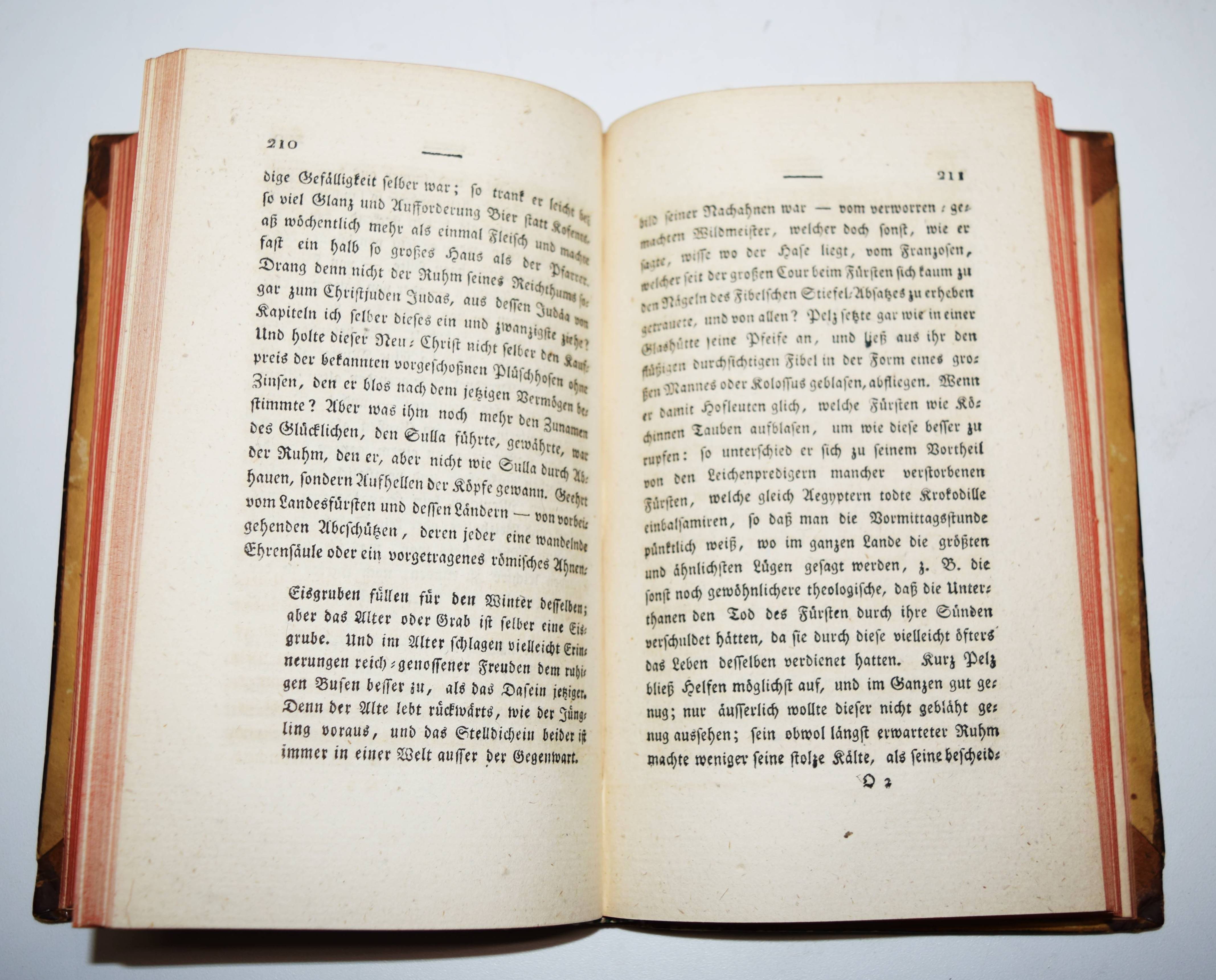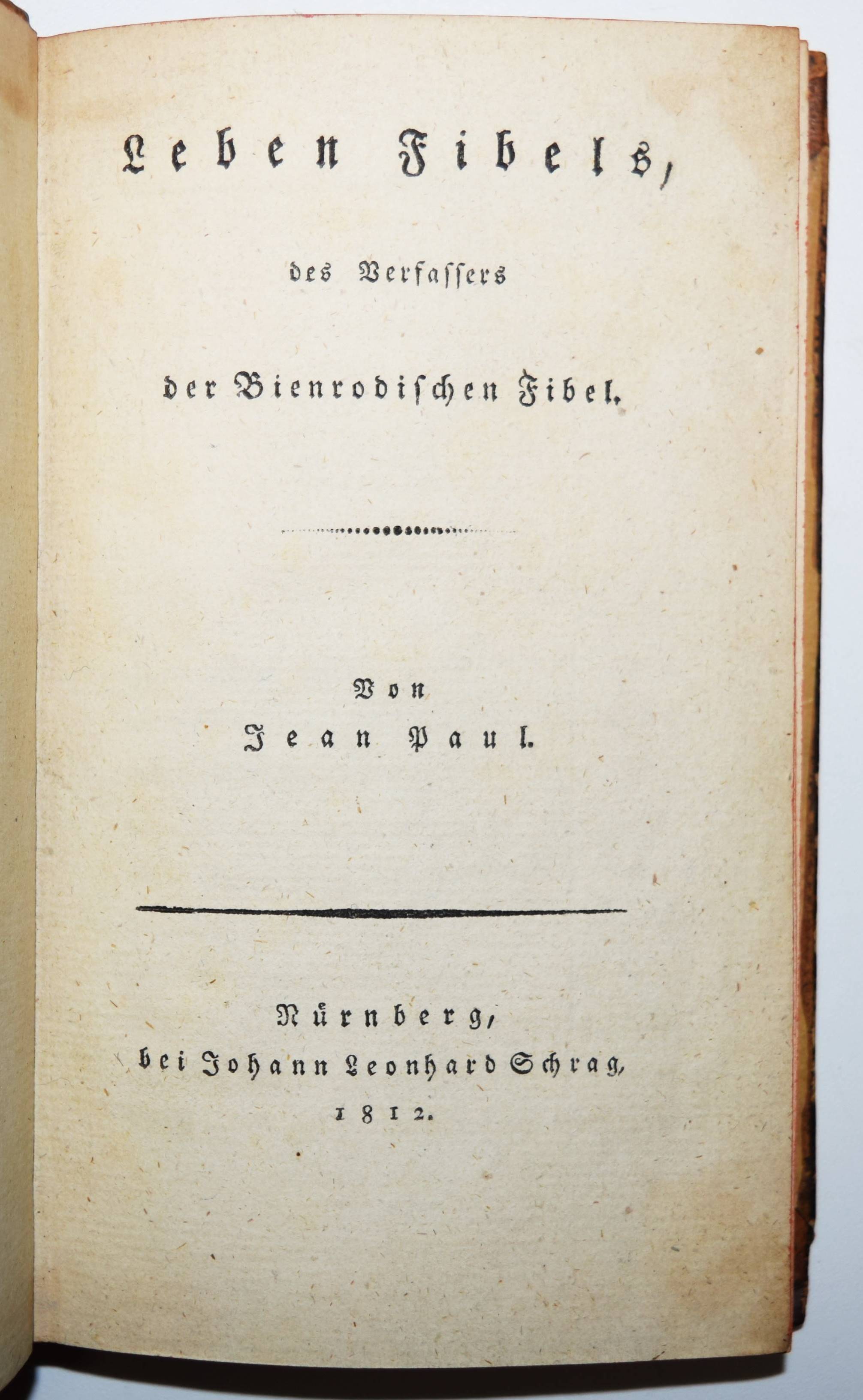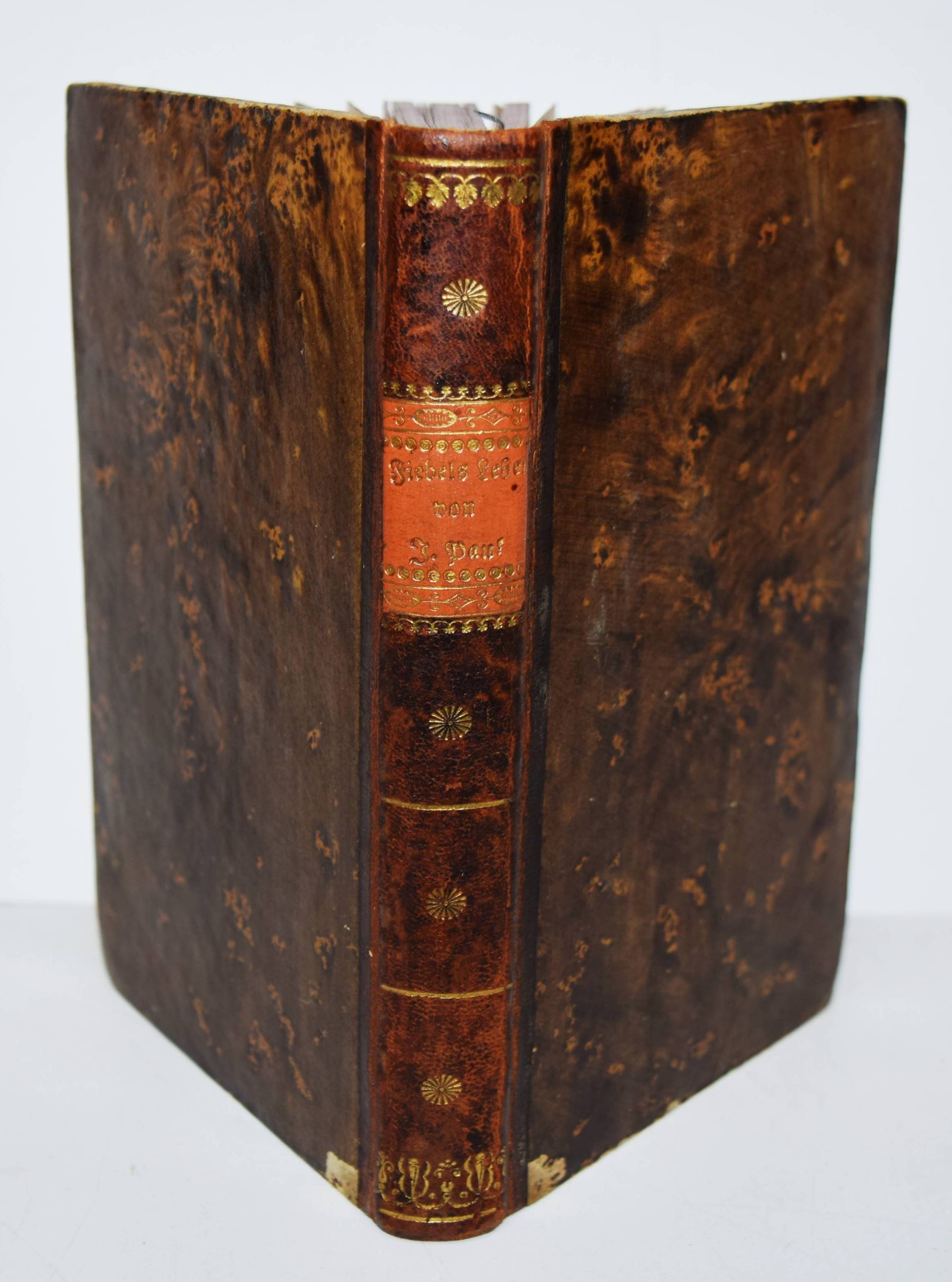 Jean Paul (d. i. Johann Paul Friedrich Richter). Leben Fibels, des Verfassers der Bienrodischen Fibel. Nürnberg, Schrag 1812. Kl.-8° (17 x 10,5 cm.). VIII, 348 S., [1] Bl. Halblederband der Zeit mit goldgepr. Rückenschild und Rückenvergoldung. Berend/Krogoll 27. Slg. Borst 1157. Goed. V, 465, 29. – Erste Ausgabe. – „Mit dem späten ‚Fibel‘… knüpft Jean Paul deutlich wieder an die satirische Jugendidylle ‚Schulmeisterlein Wuz‘ (1793) an“ (KLL IV, 1087). – Im Anhang die berühmte Bienrodische Fibel und das Alphabet mit Zweizeilern. – Einband etwas berieben, Vorsätze in den Ecken braunfleckig, sonst sauberes und dekorativ gebundenes Exemplar.