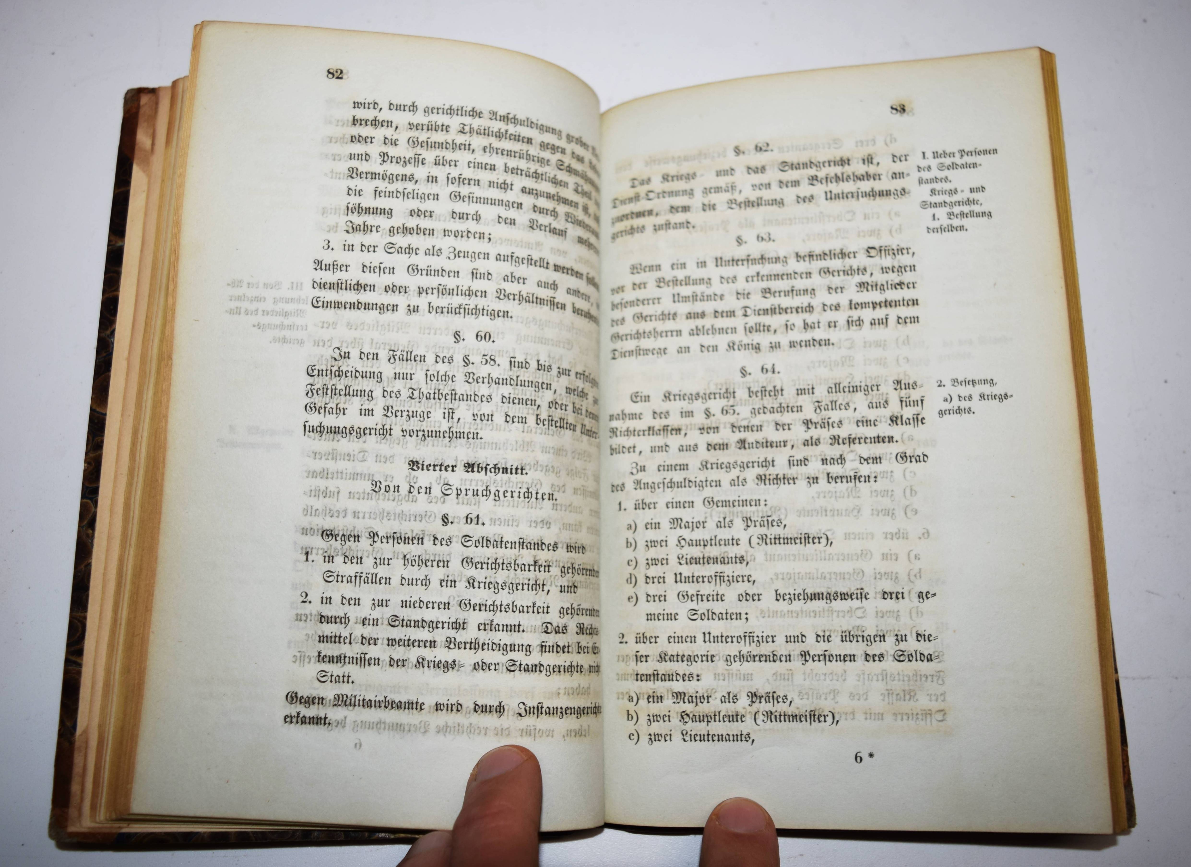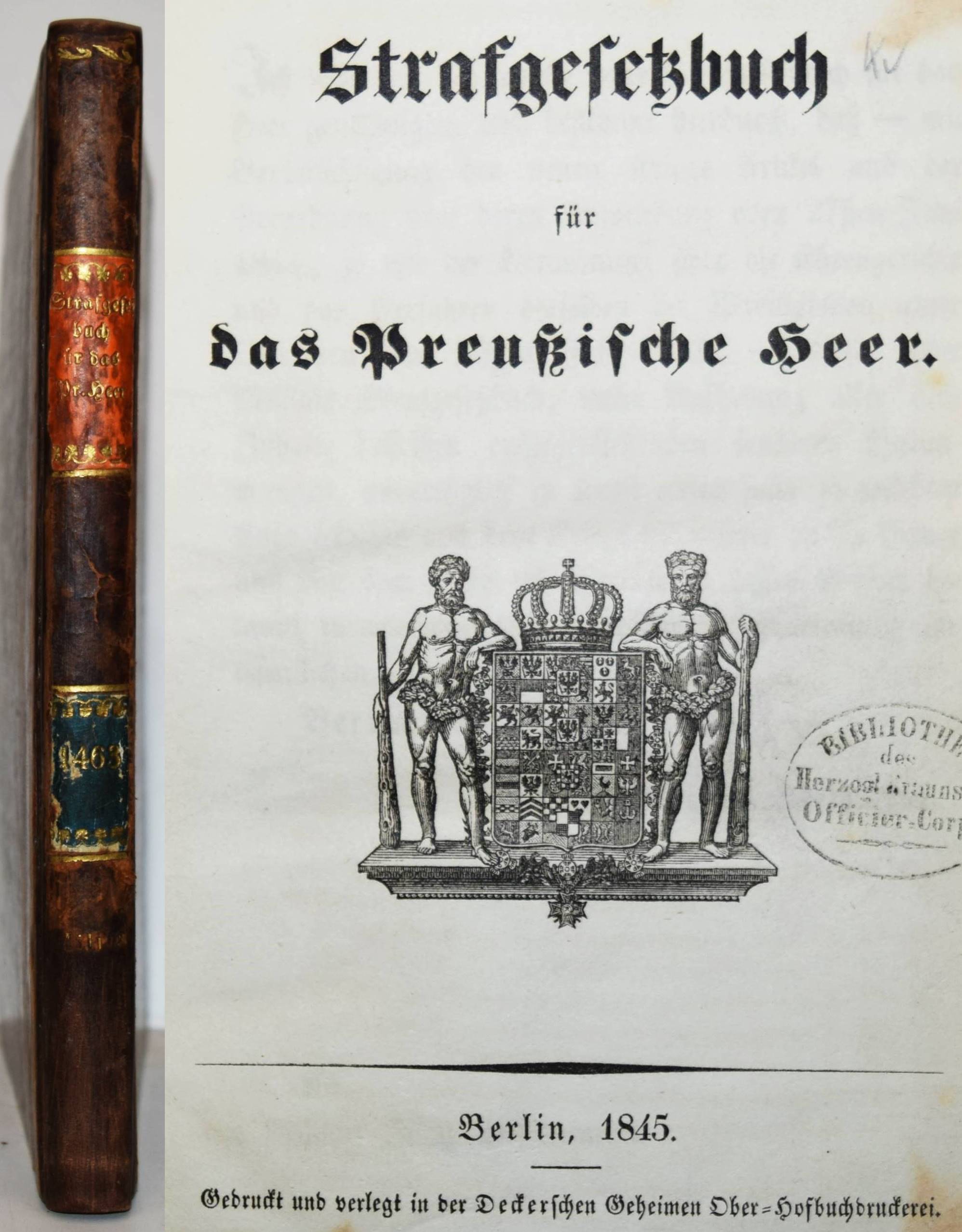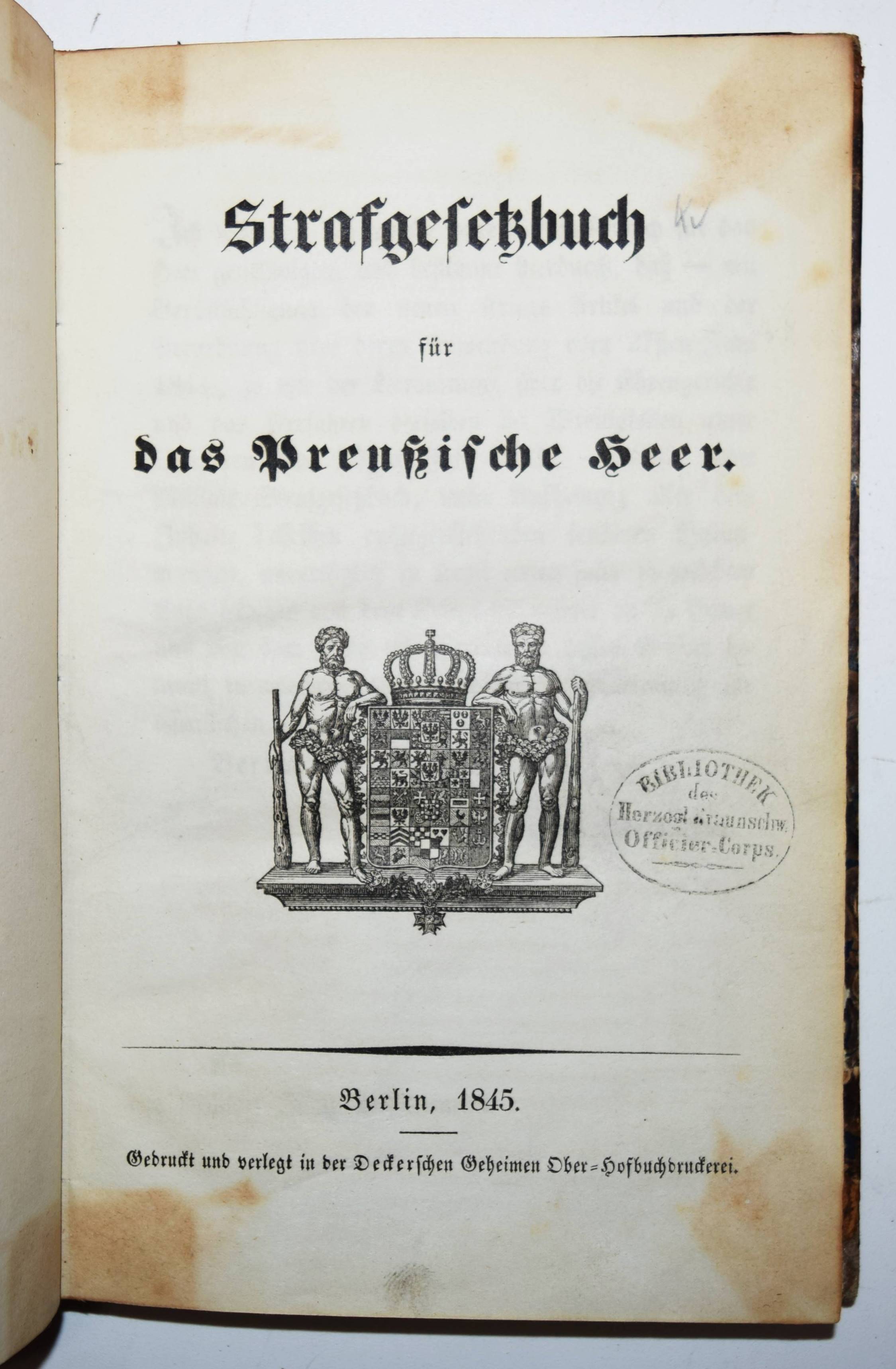 Strafgesetzbuch für das Preußische Heer. Berlin, Decker 1845. 8°. XVI, 164 S. Halblederband der Zeit mit 2 goldgepr. Rückenschildern. Erste Ausgabe. – Das Strafgesetzbuch für das Preußische Heer (oft auch als Militär-Strafgesetzbuch bezeichnet) wurde am 3. April 1845 durch eine Allerhöchste Kabinettsorder Friedrich Wilhelms IV. erlassen und am 24. Juni 1845 amtlich publiziert. Das Gesetz regelte spezifische militärische Delikte wie Fahnenflucht, Ungehorsam oder Dienstvergehen und legte die entsprechenden Strafen fest. Mit der Gründung des Deutschen Reiches wurde es durch das Militär-Strafgesetzbuch für das Deutsche Reich vom 20. Juni 1872 abgelöst, welches sich stark an den preußischen Vorbildern orientierte. – Einband etwas berieben, alter Stempel des „Herzogl. Braunschw. Officier Corps“ auf dem Titelblatt, stellenweise etwas braunfleckig, sonst gut erhalten.
