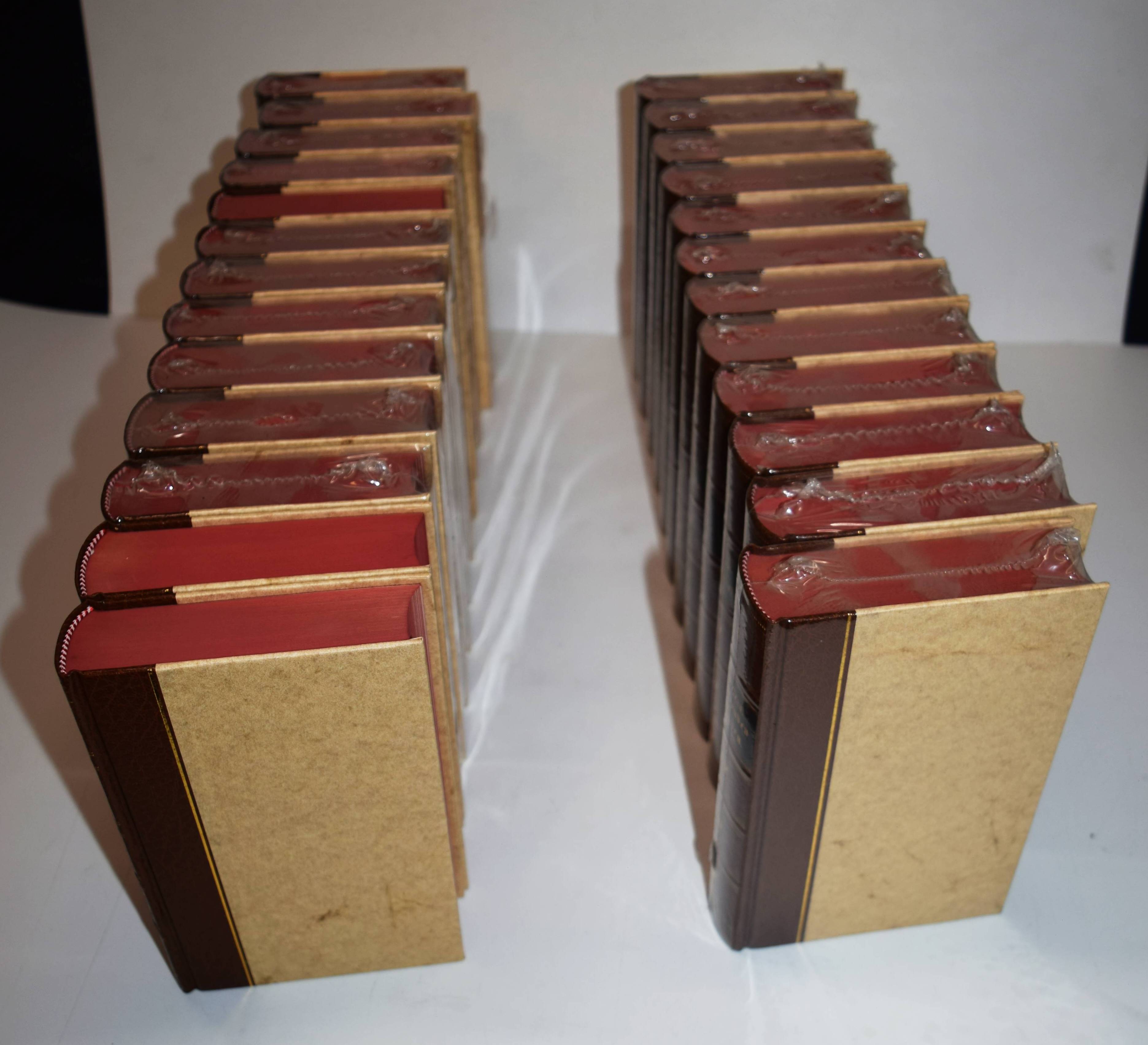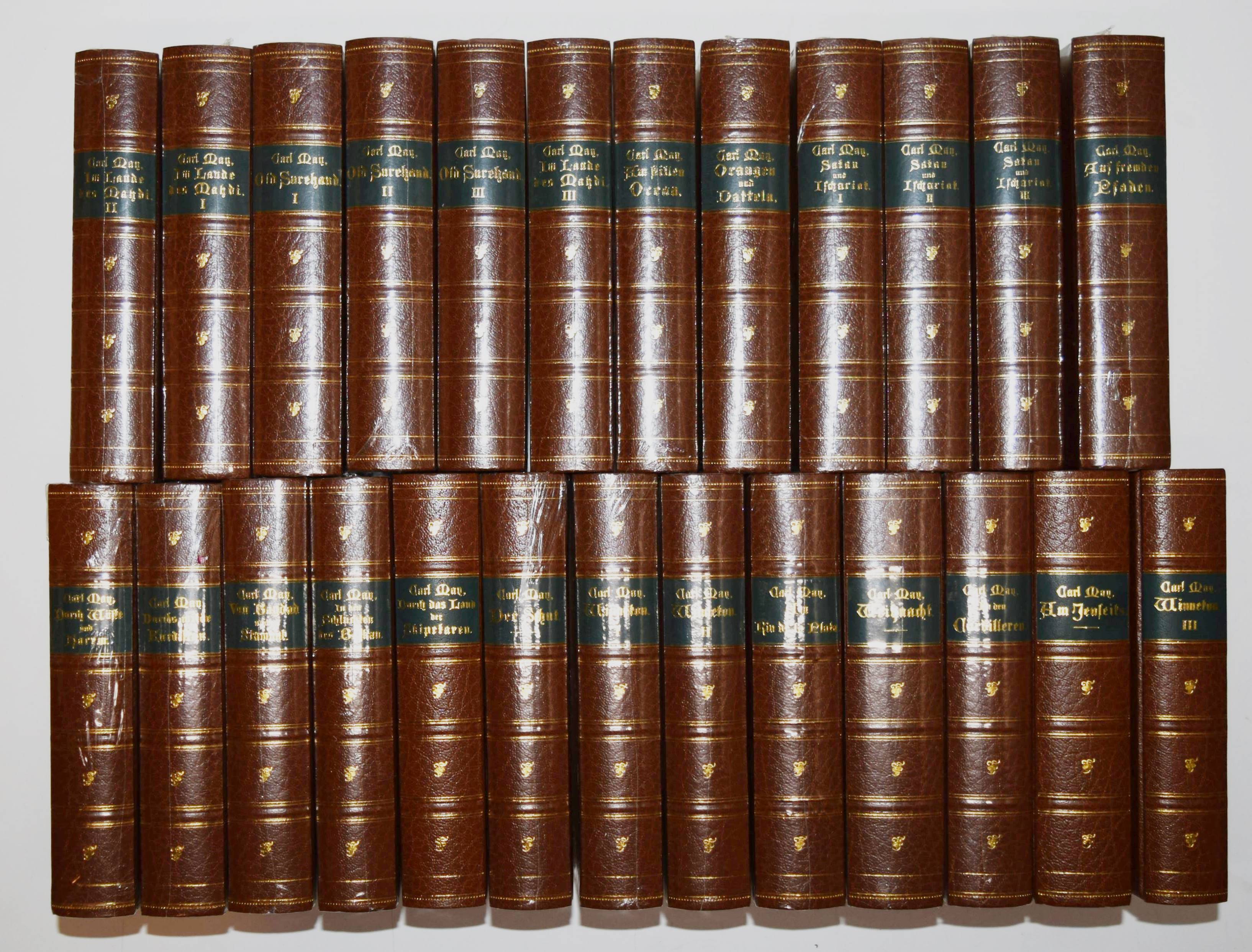 May, Karl. Gesammelte Reiseerzählungen. (Reprint der ersten Buchausgaben. Freiburger Erstausgaben. Herausgegeben von Roland Schmid). Bände I-XXV (von 33). Bamberg, Karl-May-Verlag 1982-1984. 8°. Orig.-Halbledereinbände (Kunstleder Skivertex) mit dunkelgrünen goldgepr. Rückenschildern und Rückenvergoldung sowie Rotschnitt. Mit wichtigem Ergänzungsmaterial als Anhang oder in Form von Nachworten. – Vorhanden: I. Durch Wüste und Harem (1892) – II. Durchs wilde Kurdistan (1892) – III. Von Bagdad nach Stambul (1892). – IV. In den Schluchten des Balkan (1892). – V. Durch das Land der Skipetaren (1892). – VI. Der Schut (1892) – VII.-IX. Winnetou I bis III (1893). – X. Orangen und Datteln (1893/1894). – XI. Am Stillen Ocean (1893/1894). – XII. Am Rio de la Plata (1894). – XIII. In den Cordilleren (1894). – XIV.-XV. Old Surehand I und II (1894/1895). – XVI.-XVIII. Im Lande des Mahdi I bis III (1896). – XIX. Old Surehand III (1896). – XX.-XXII. Satan und Ischariot I bis III(1896/1897). – XXIII. Auf fremden Pfaden (1897) – XXIV. „Weihnacht!“ – XXV. Am Jenseits (1899). – Ohne die Bände: XXVI-XXXIII (Im Reiche des silbernen Löwen I-IV, Und Friede auf Erden!, Ardistan und Dschinnistan I-II und Winnetou IV). – Alle Bände in neuwertigem Zustand, bis auf zwei noch in Folie eingeschweißt.